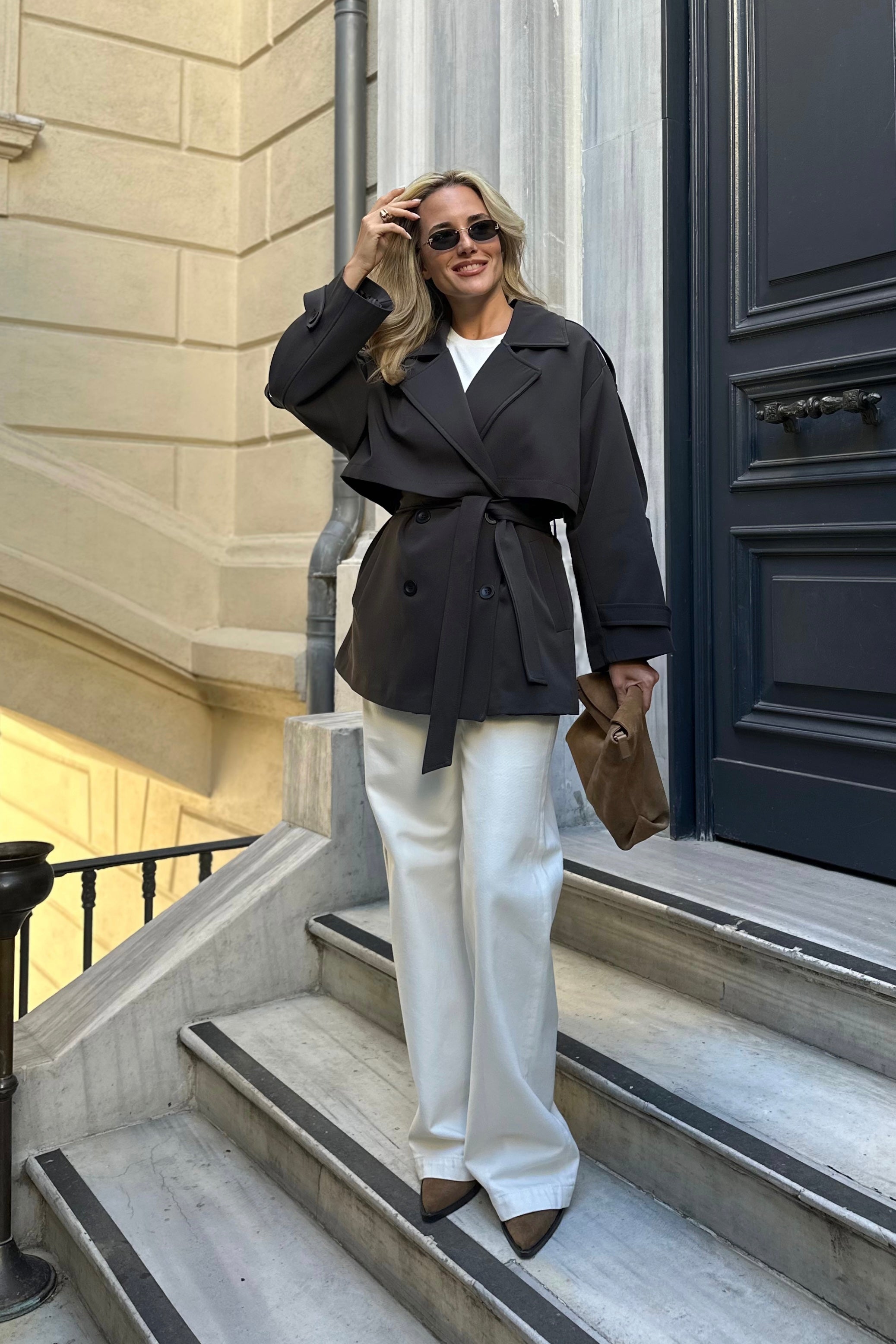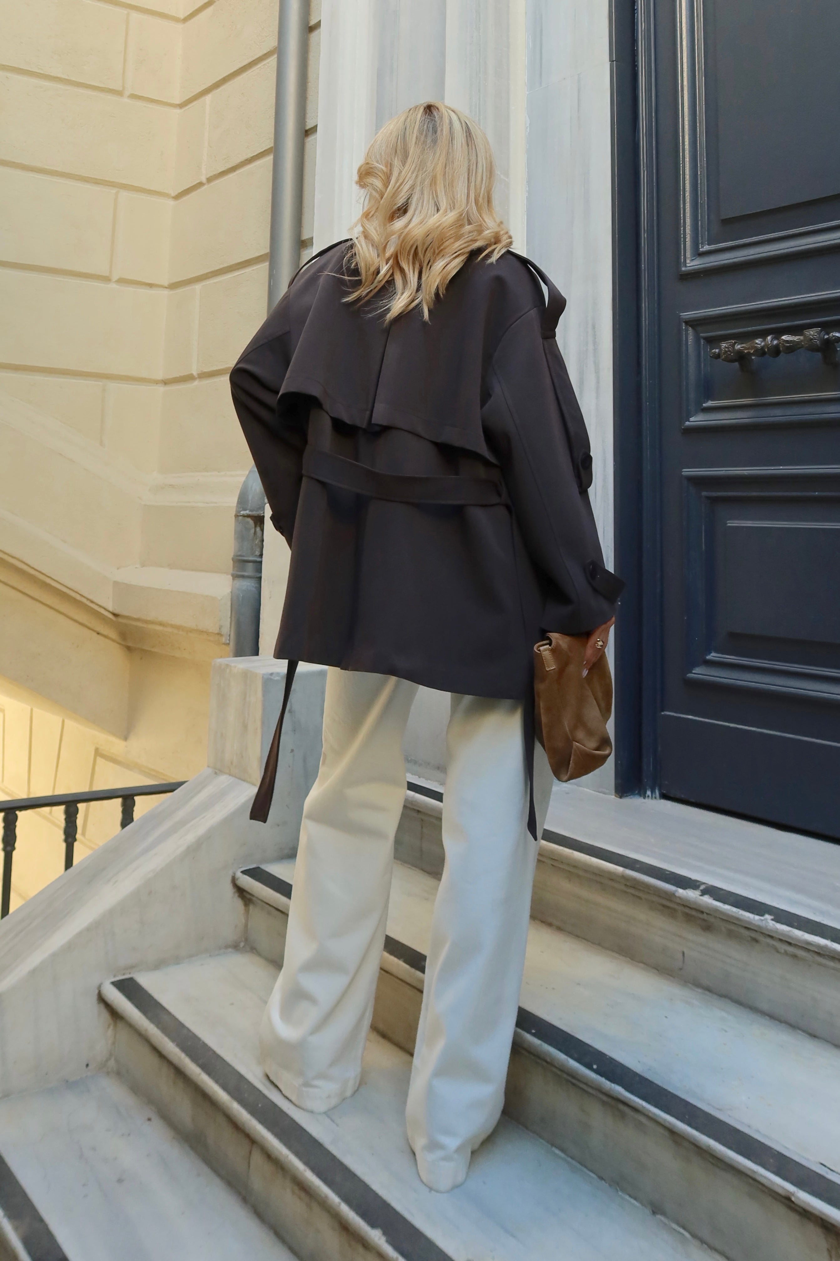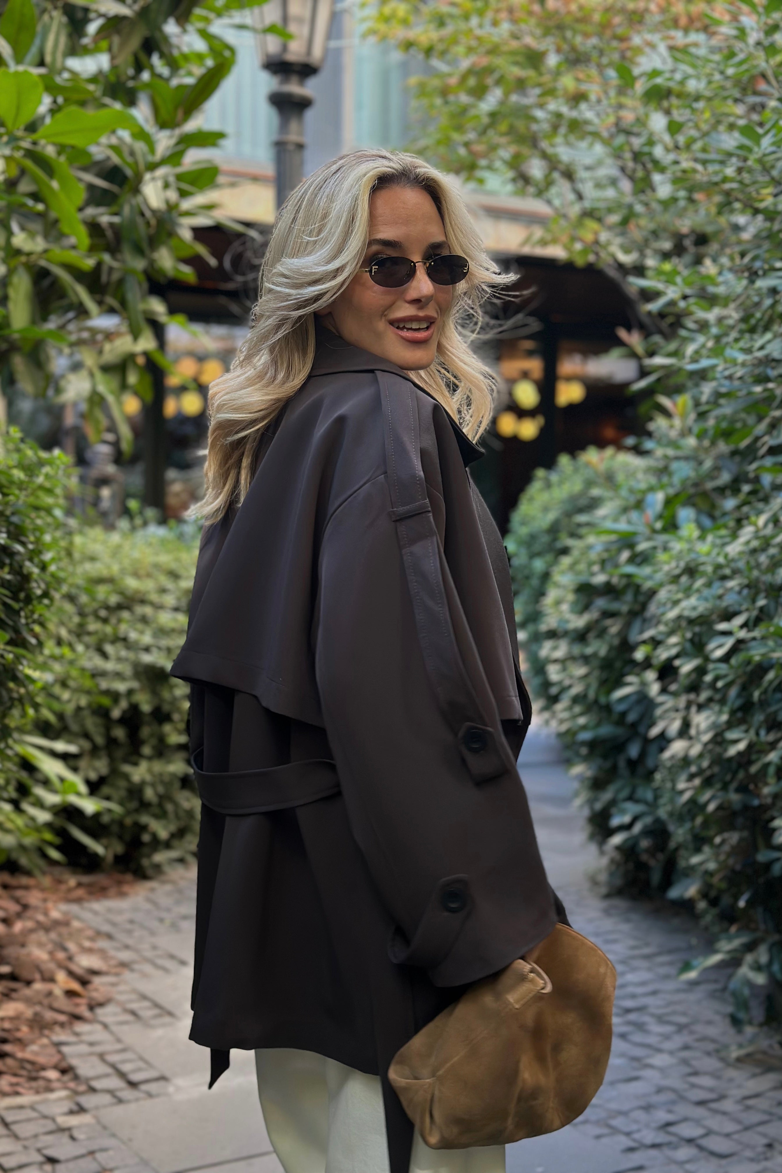 - Acı Kahve Oversize Düşük Omuz Kısa Trenç - 9580