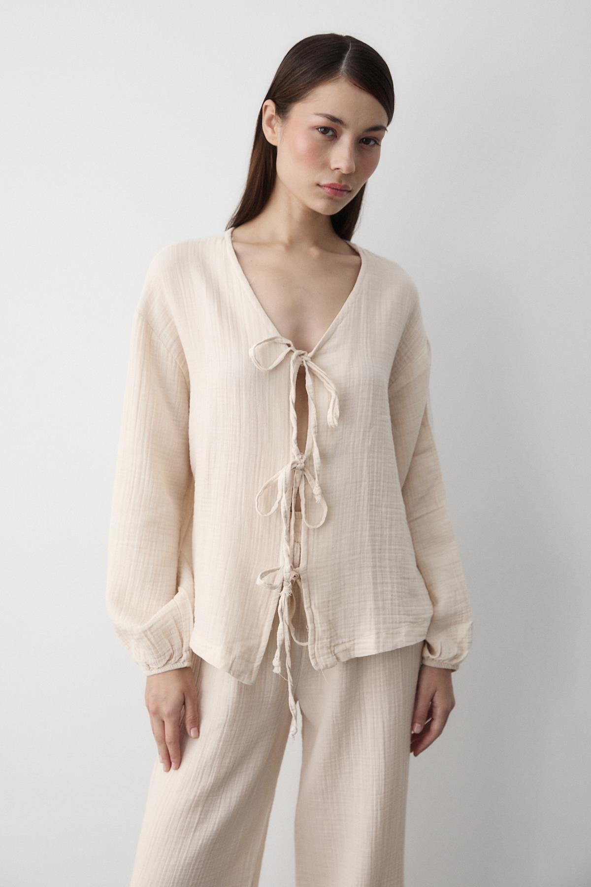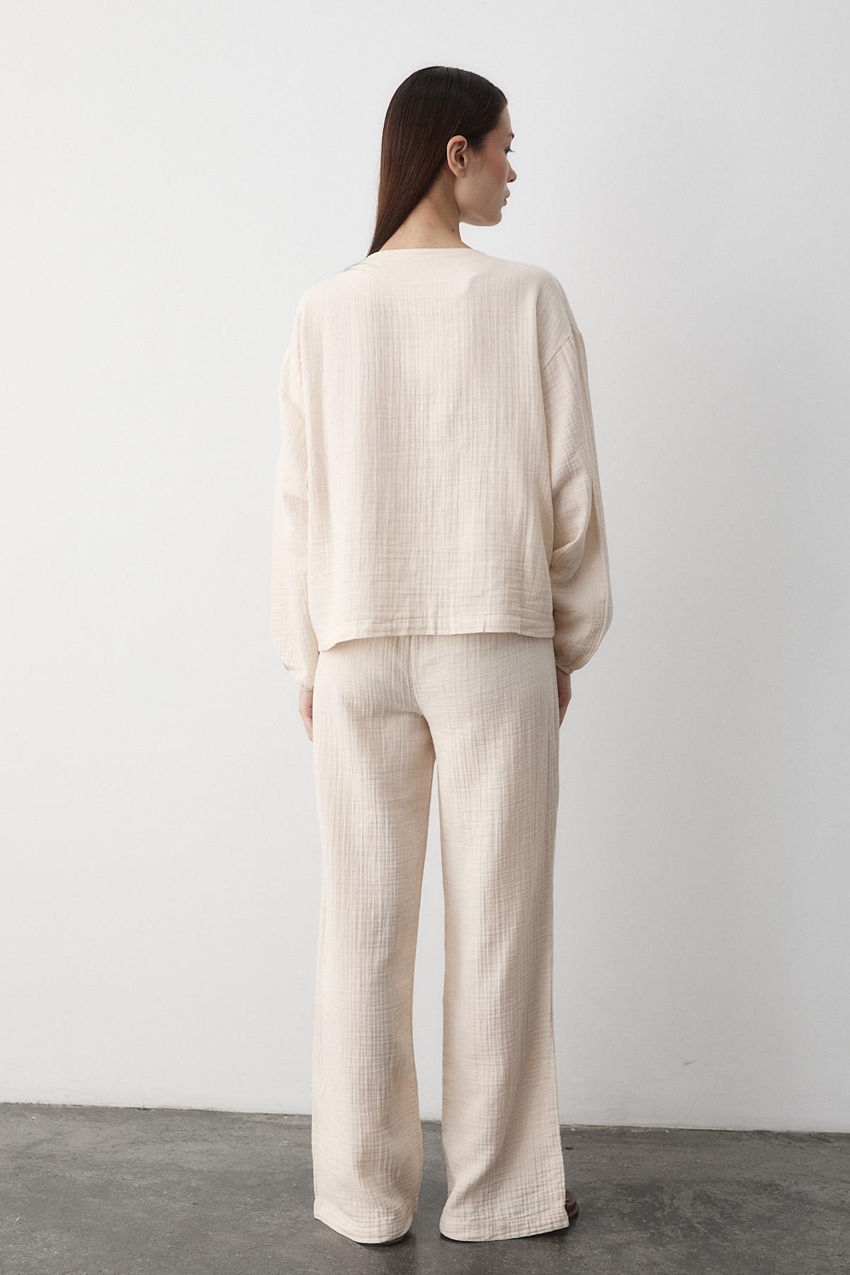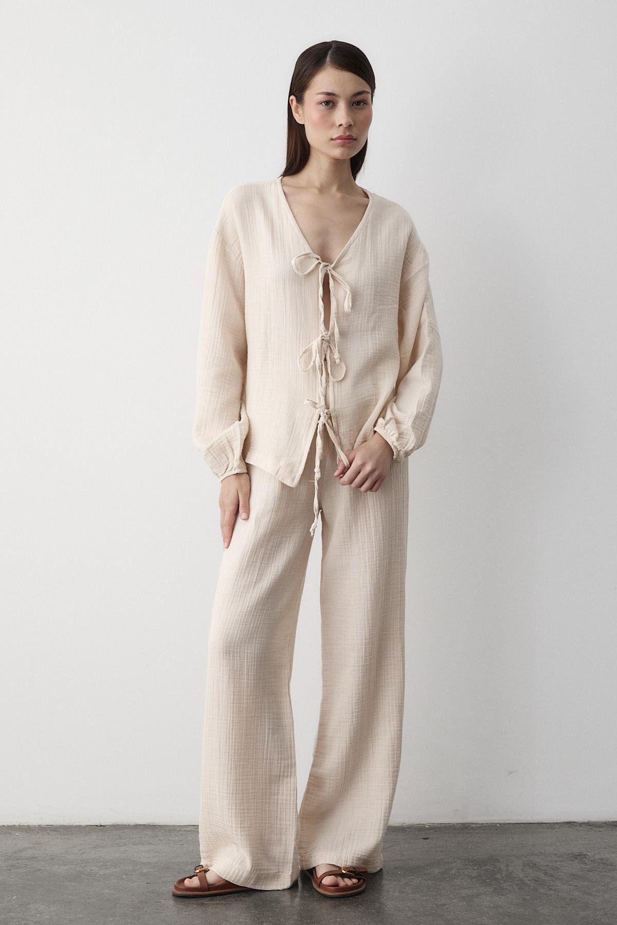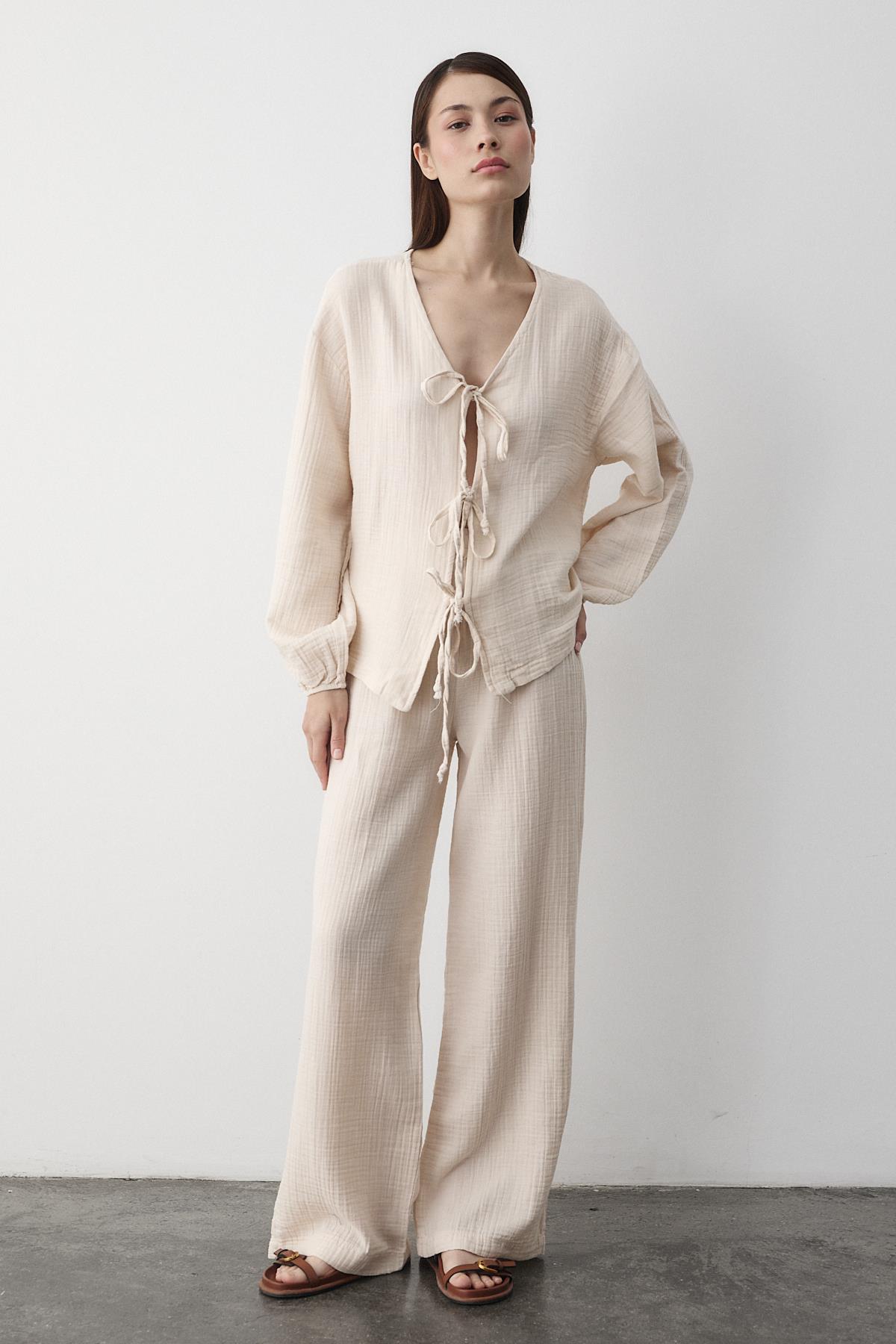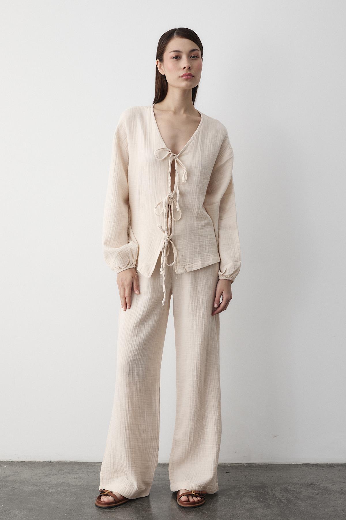 - Bej %100 Pamuk Bağlamalı Bluz Pantolon Takım