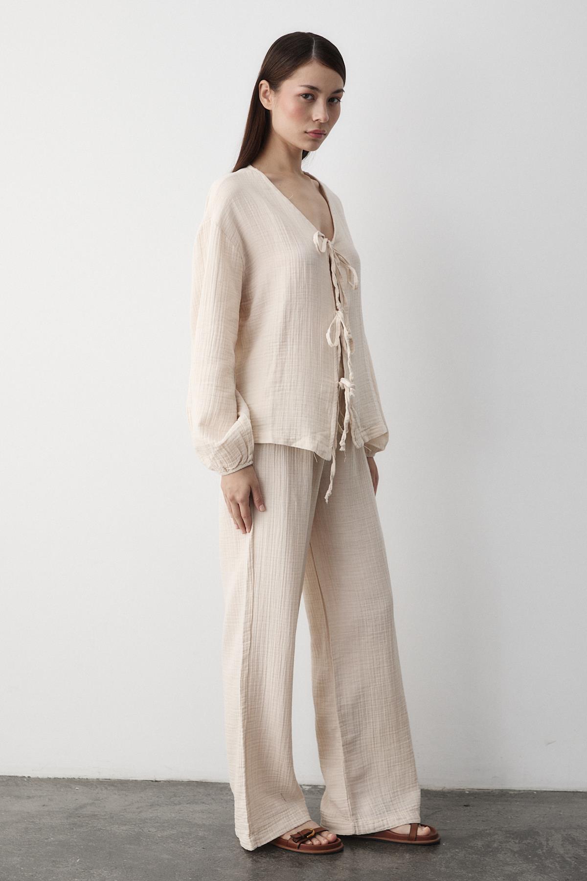 Bej %100 Pamuk Bağlamalı Bluz Pantolon Takım