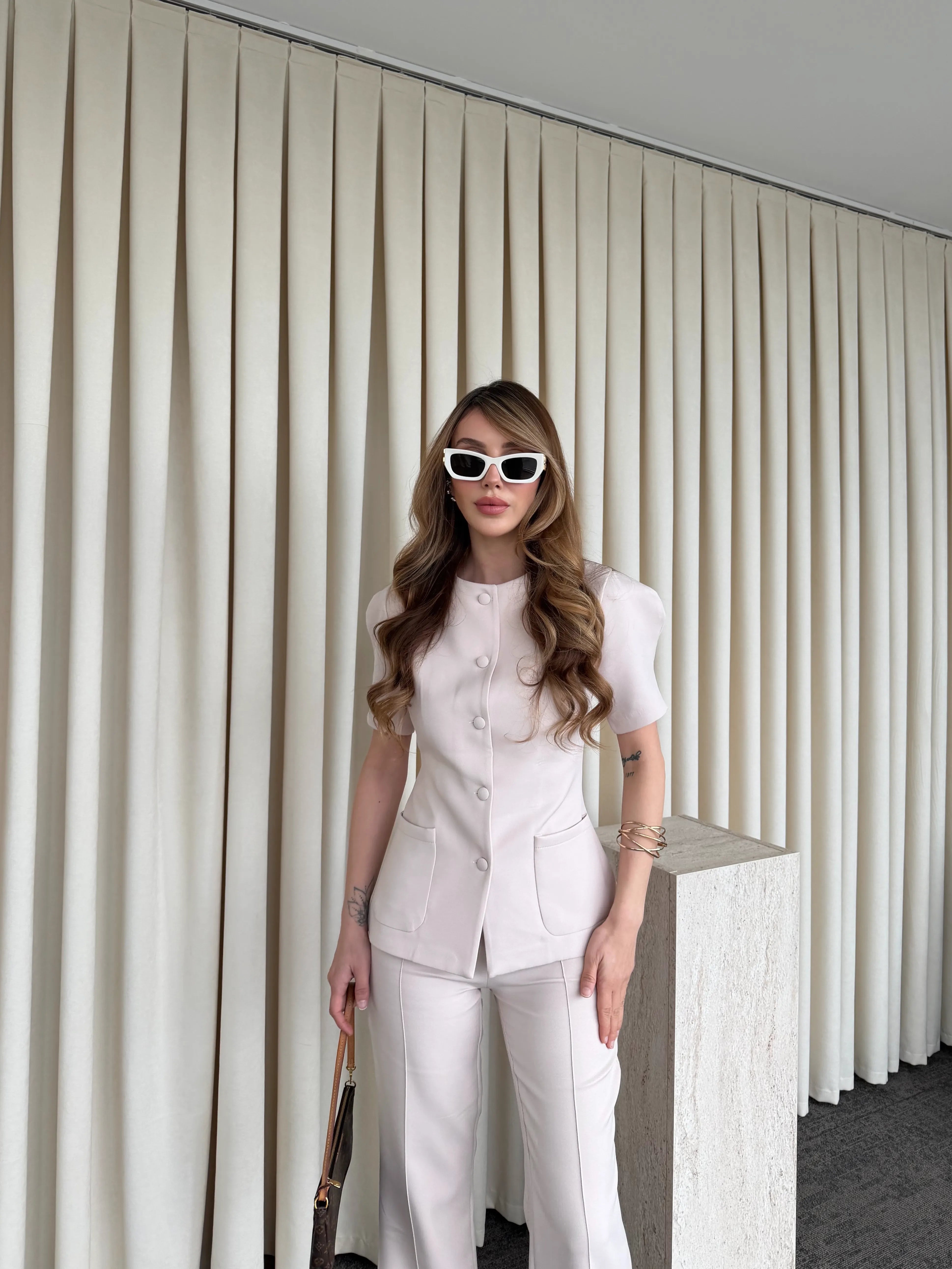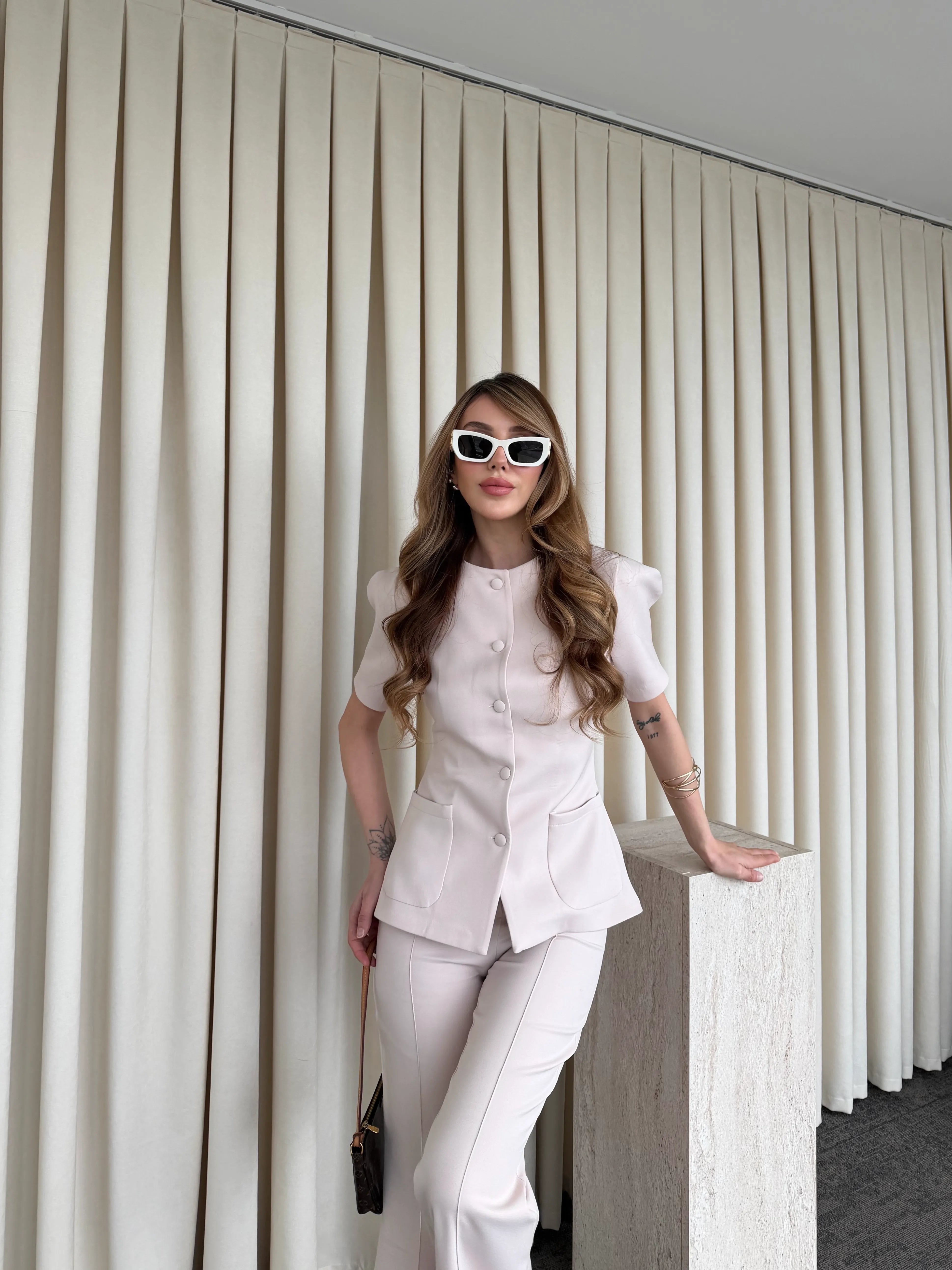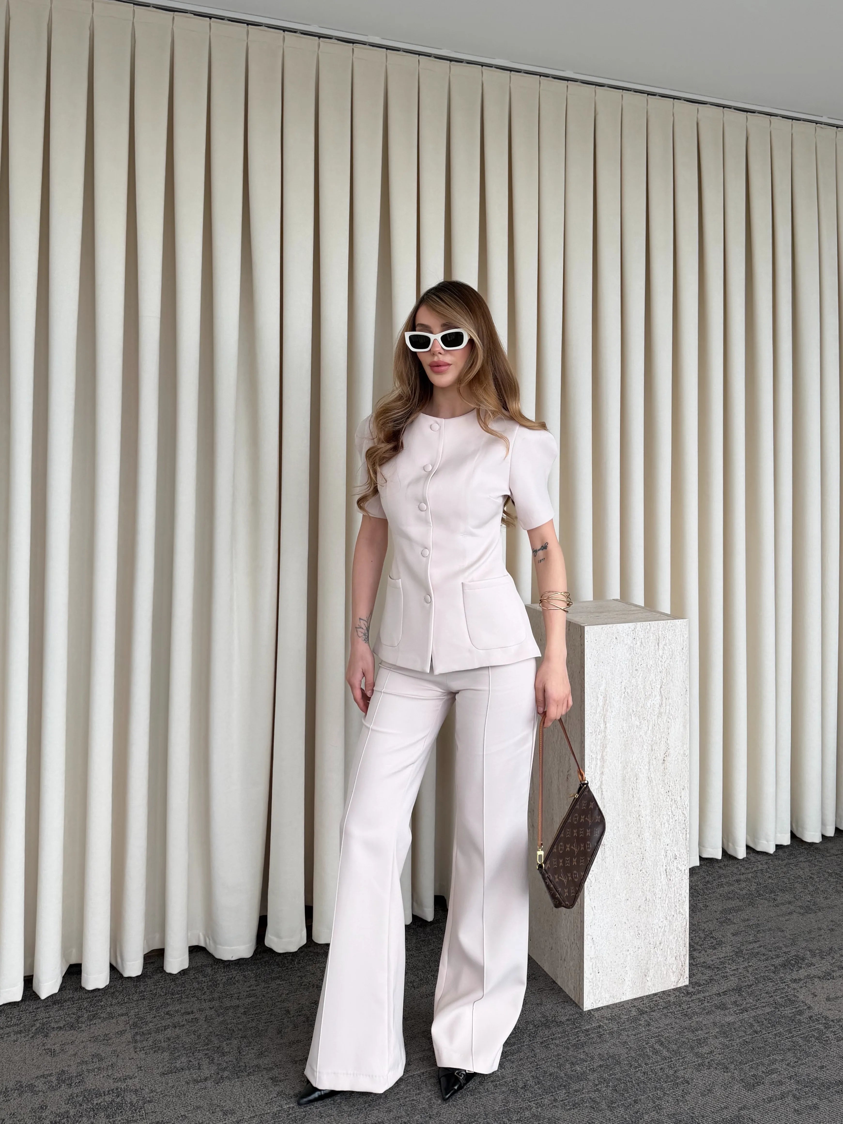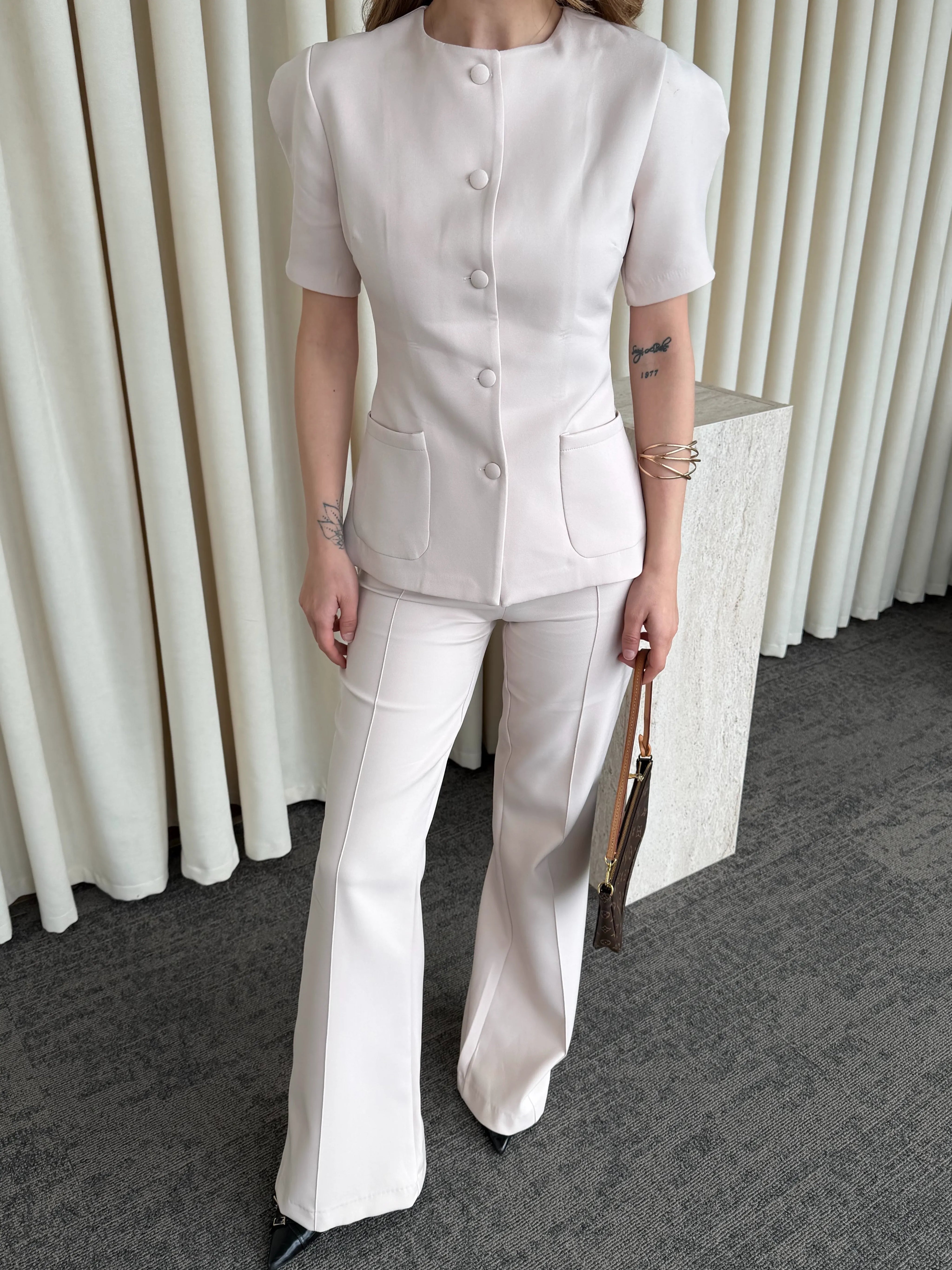 Üst parçadaki cep detayları ve bele oturan kalıp silueti dengelerken, yüksek bel ve geniş paça pantolon akıcı bir hareket kazandırır. Vücut formunu zarifçe toparlayan yapısı sayesinde hem konforlu hem de iddialı bir stil sunar.