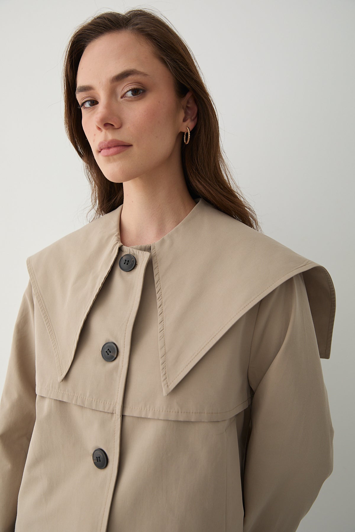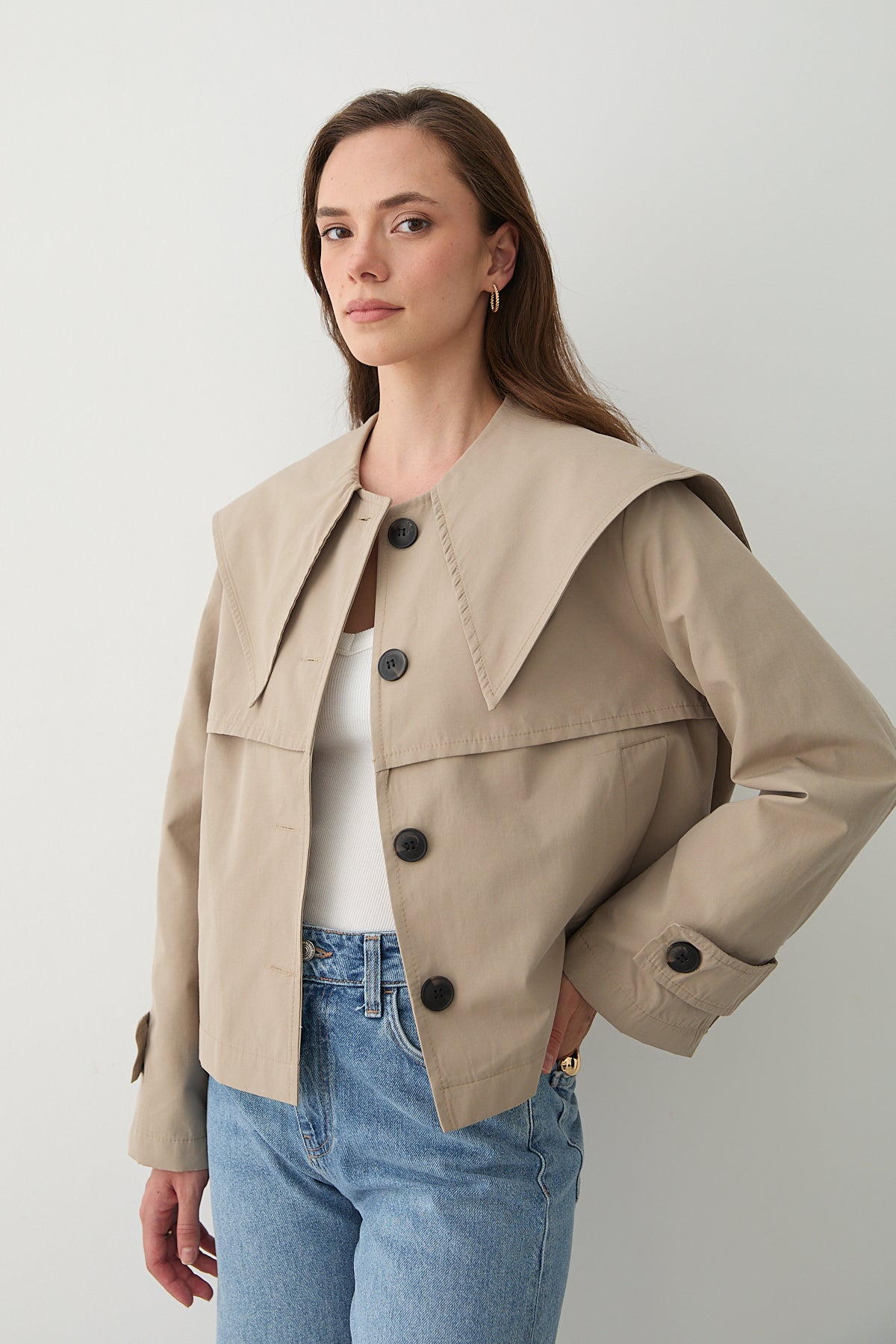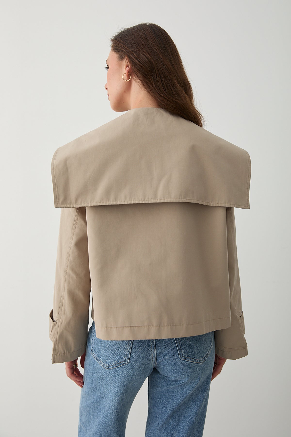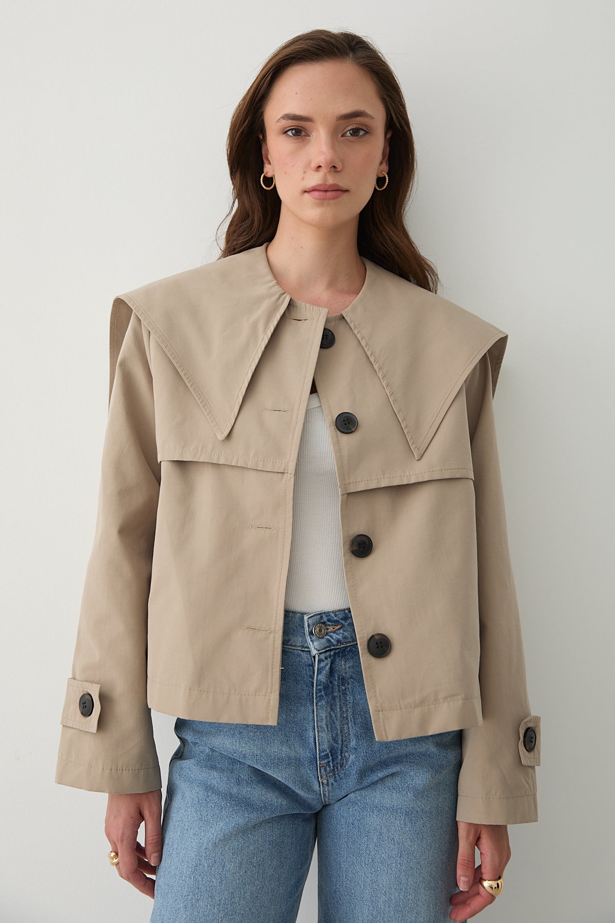 Bej Sakura Geniş Yaka Kısa Trençkot - 7530