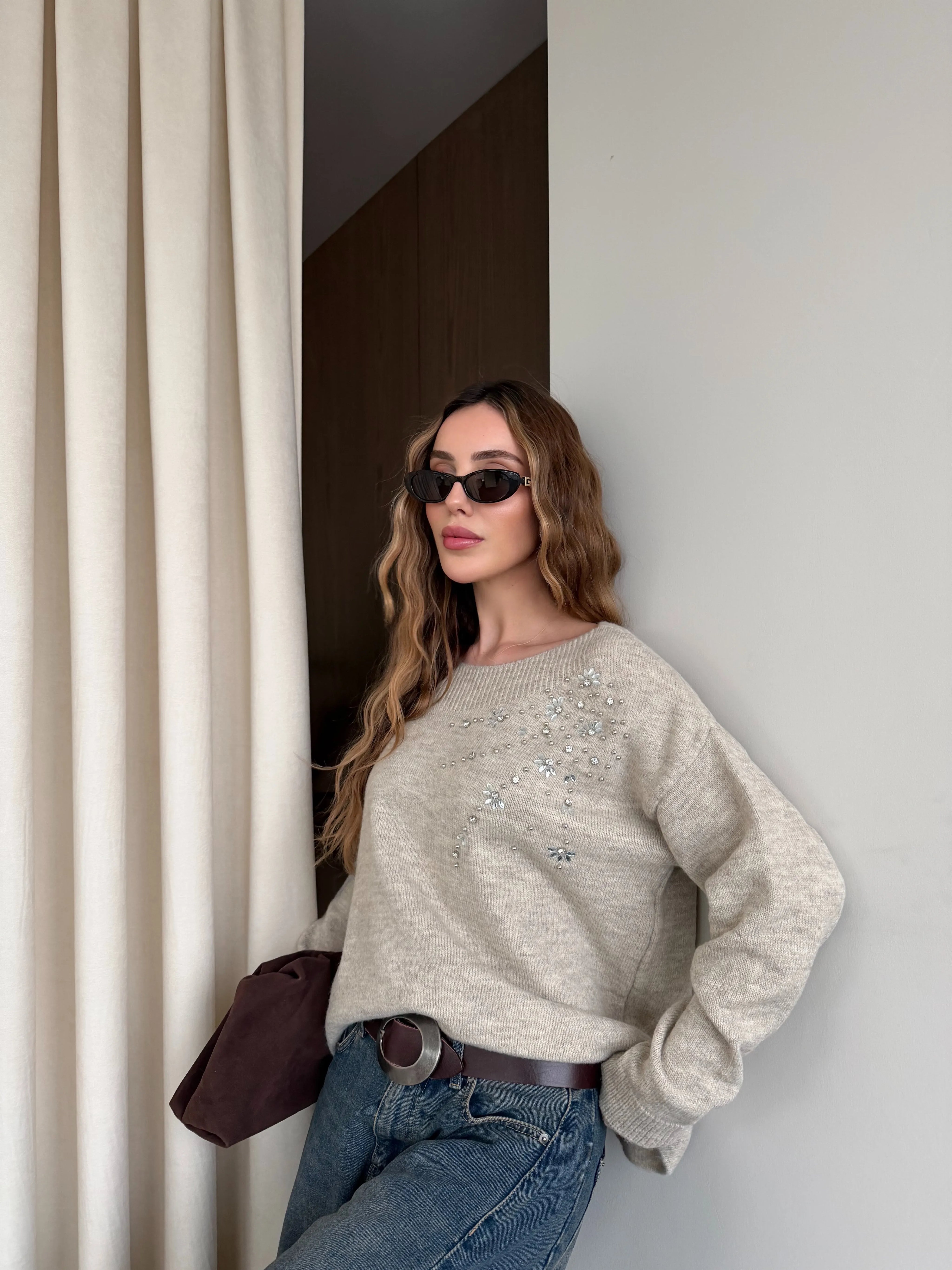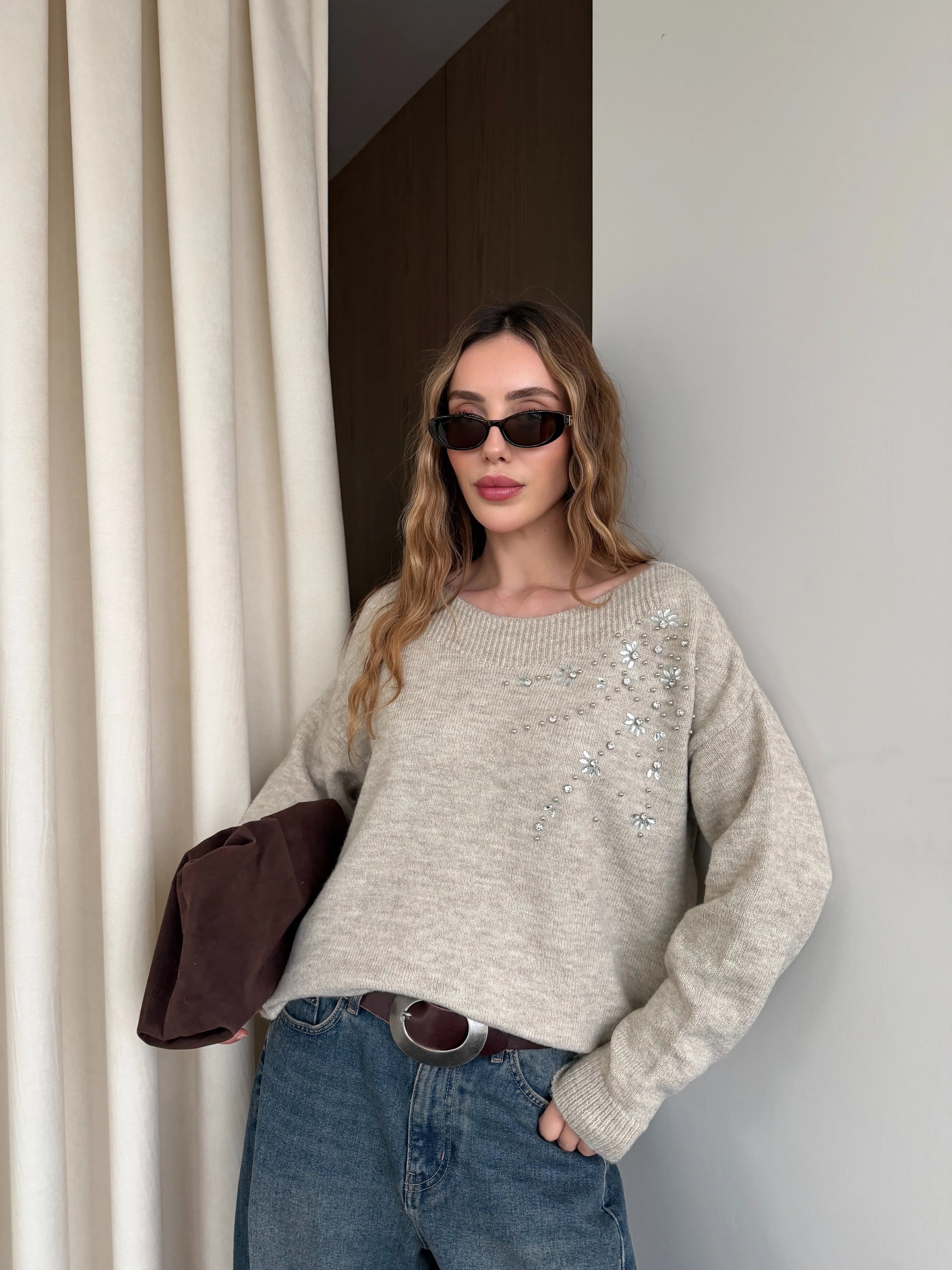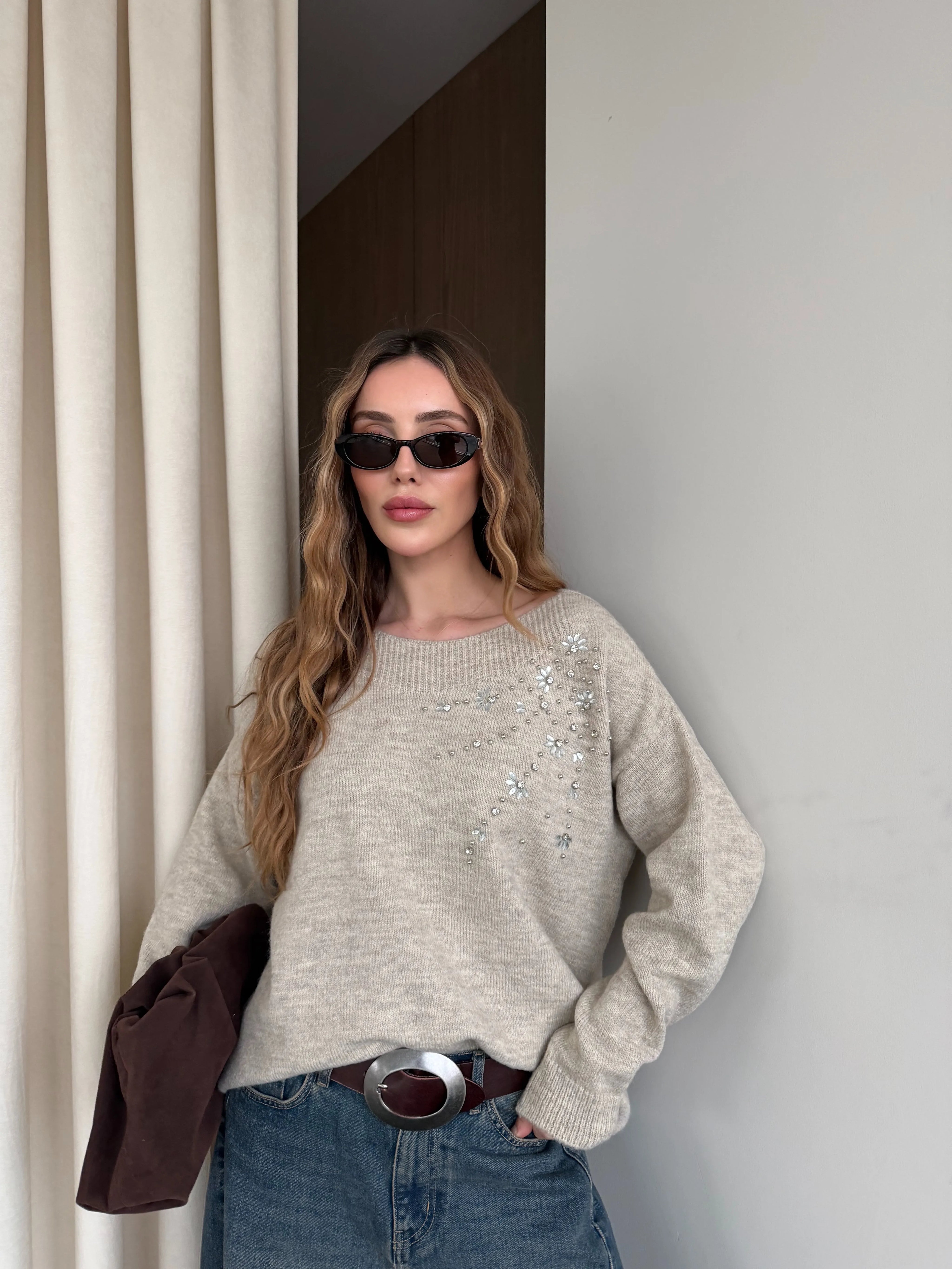 • Bej Taş İşlemeli Kayık Yaka Kazak - 251189