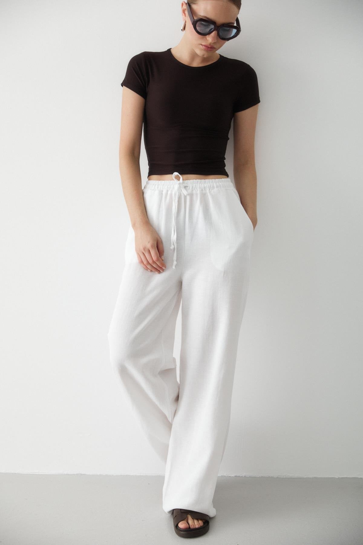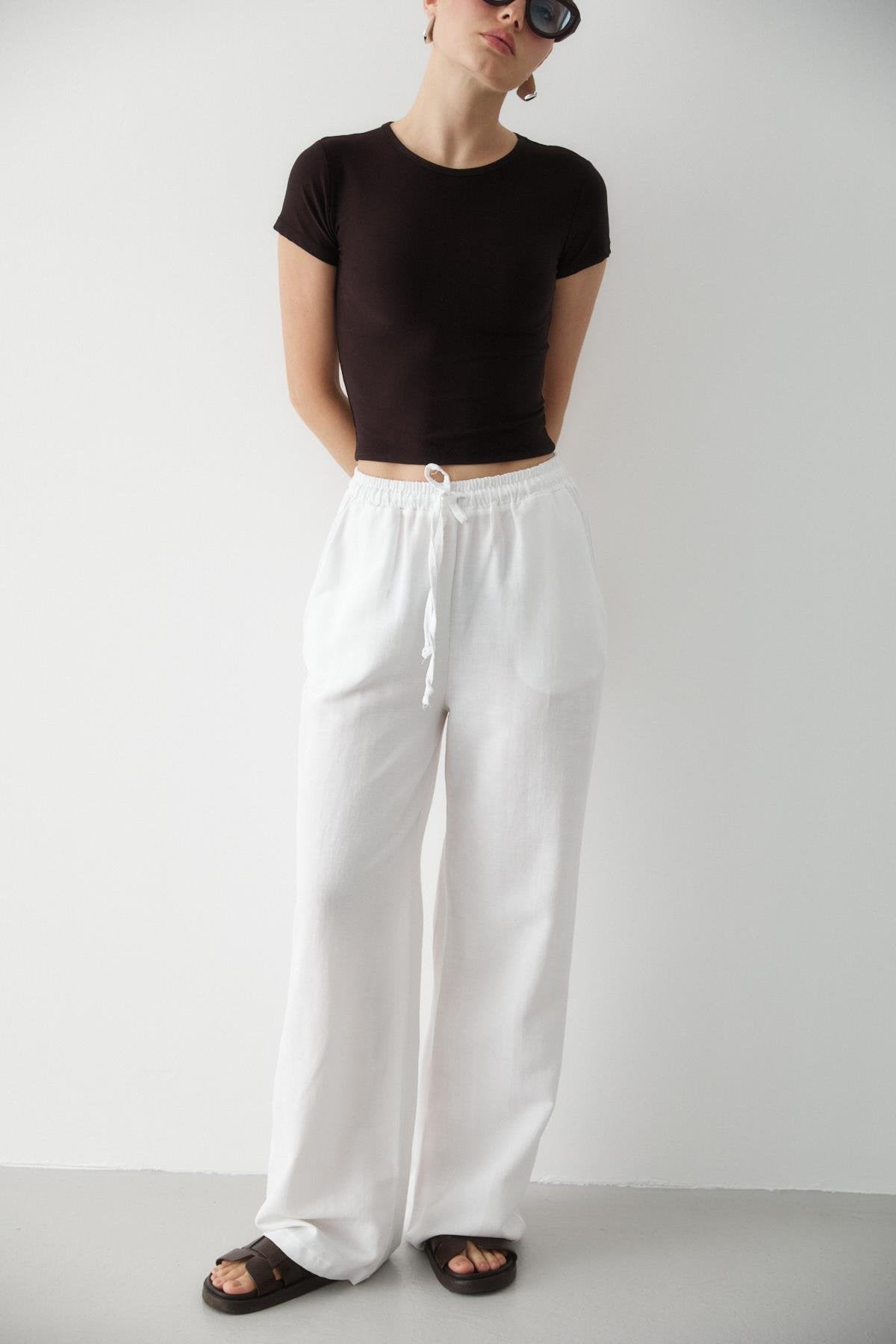 - Beyaz Beli Lastikli Pamuklu Keten Pantolon
