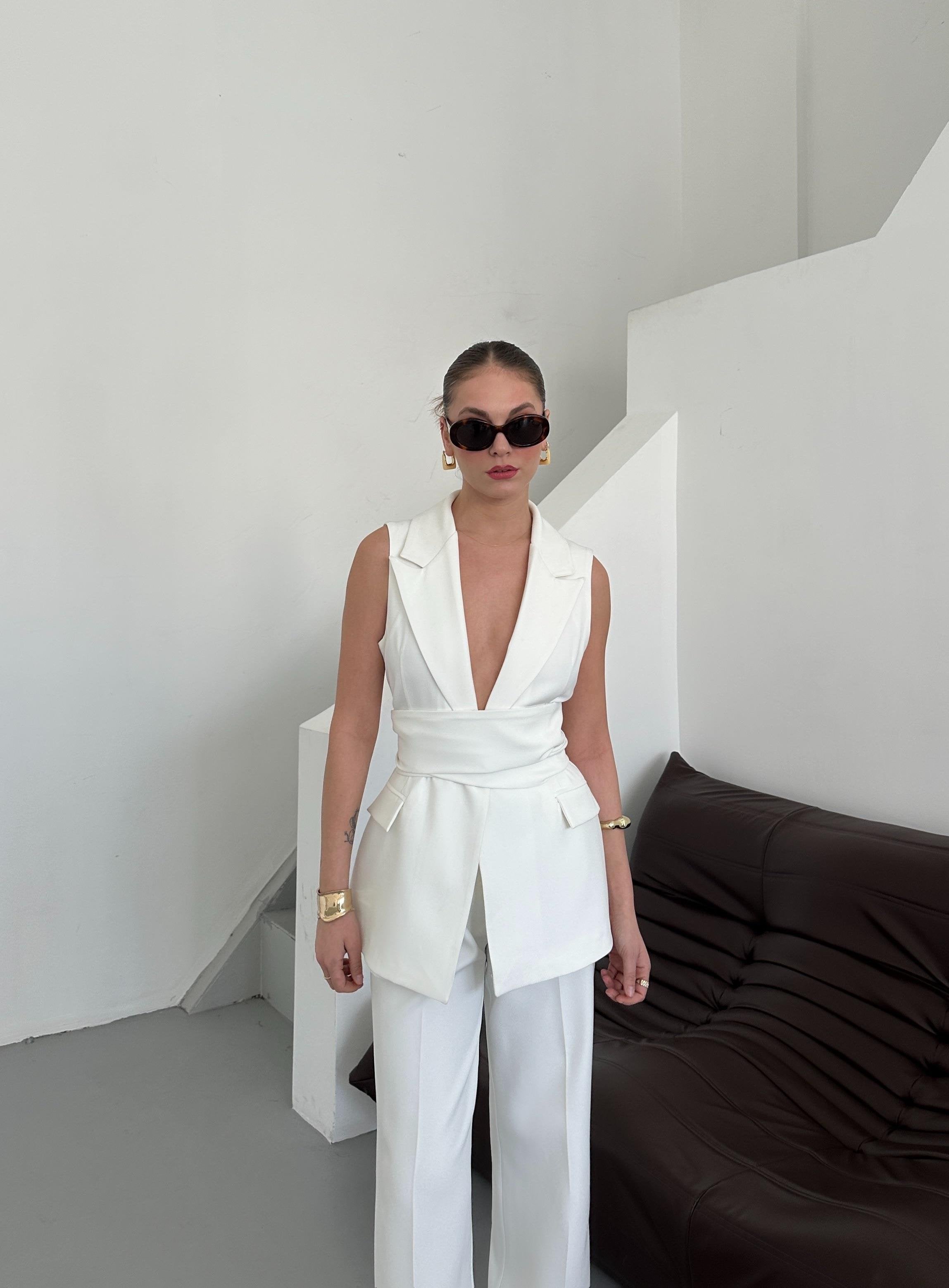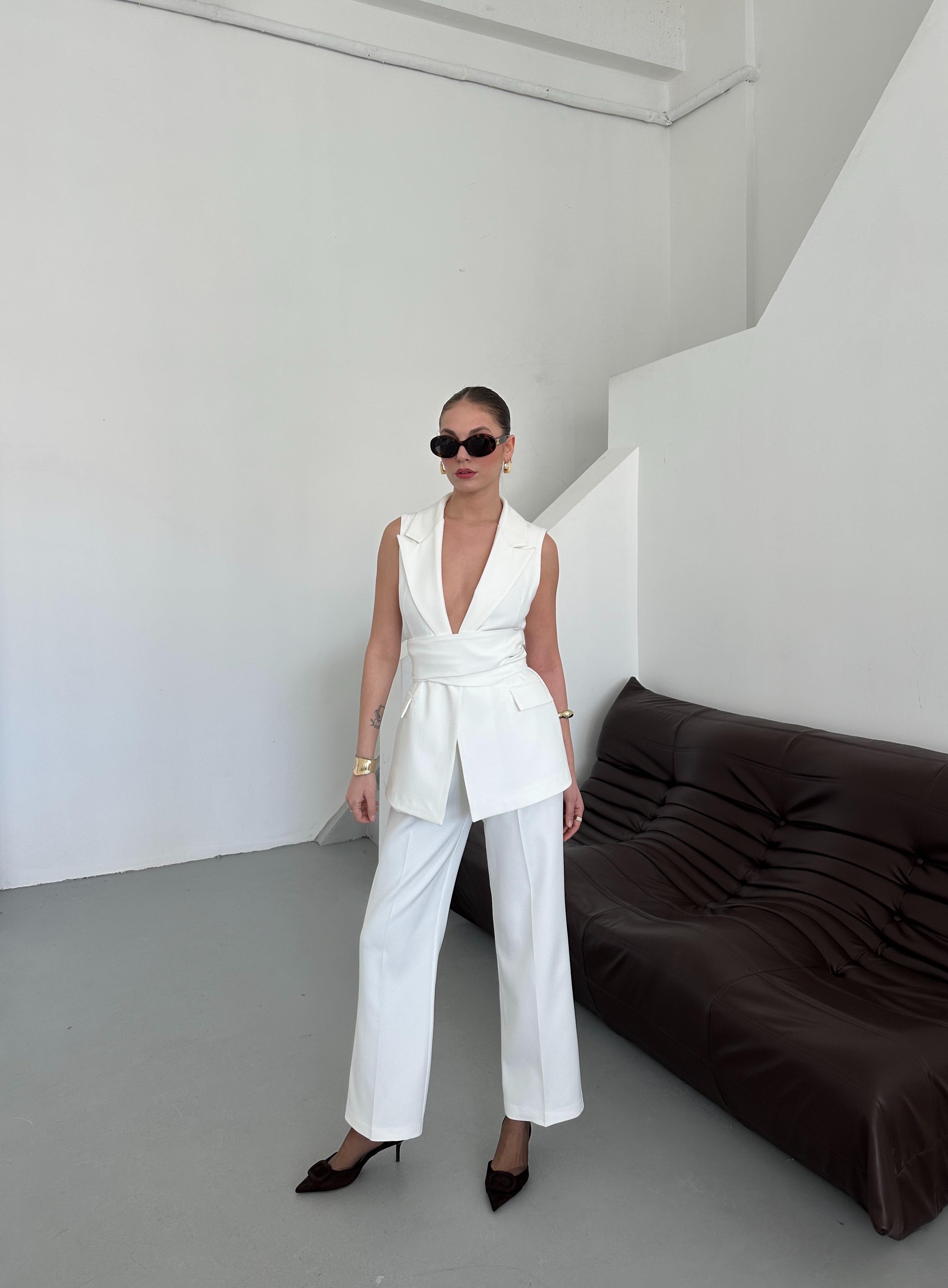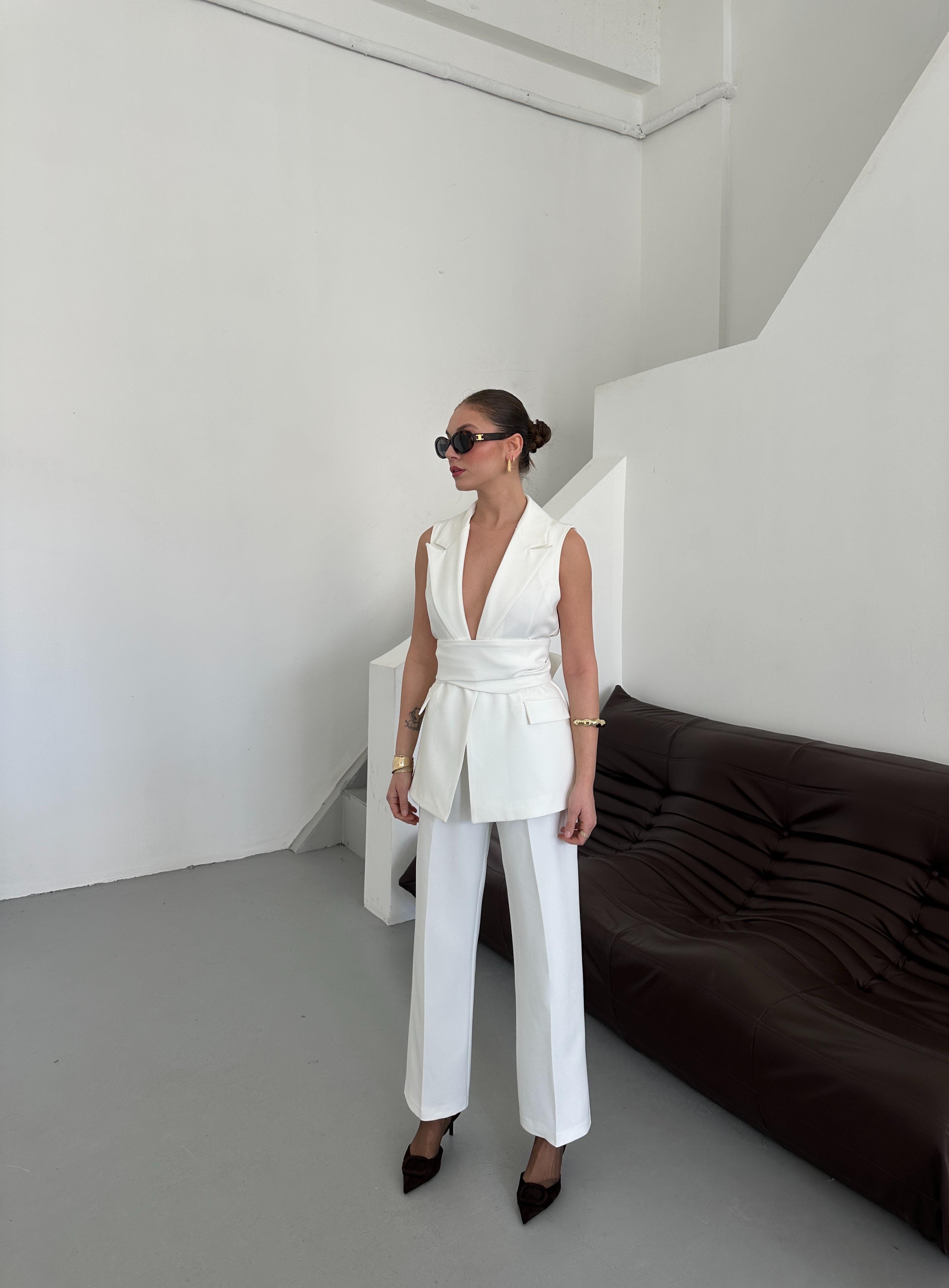 - Beyaz Eliana Kuşaklı Yelek Pantolon Takım