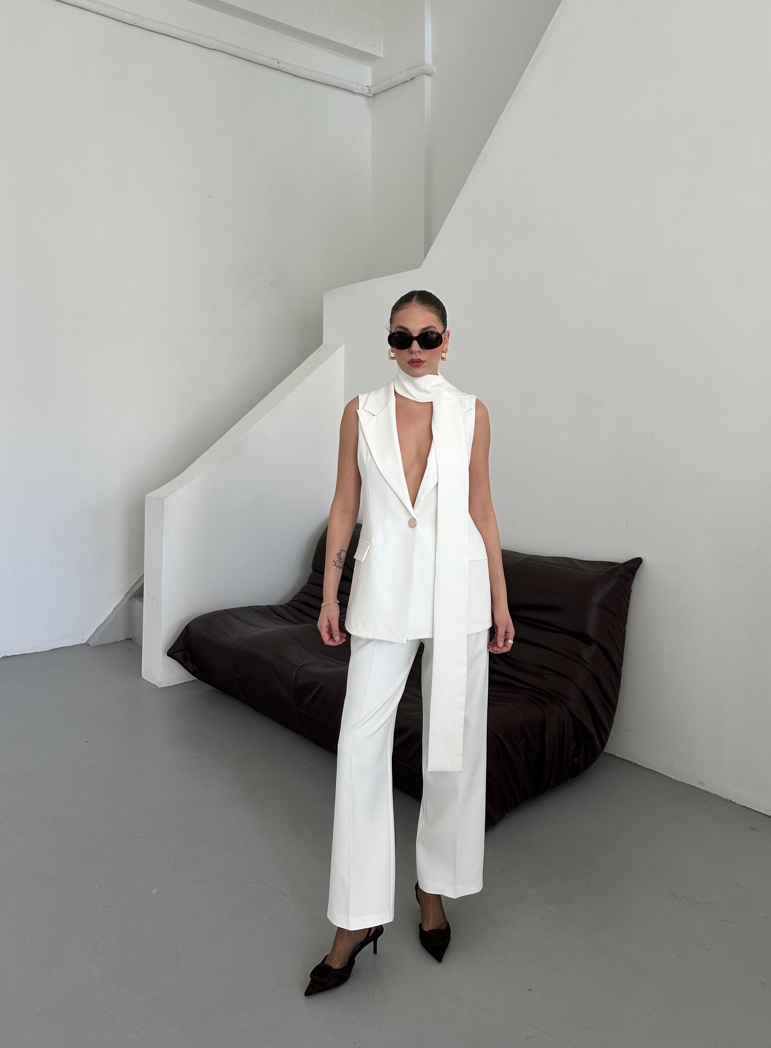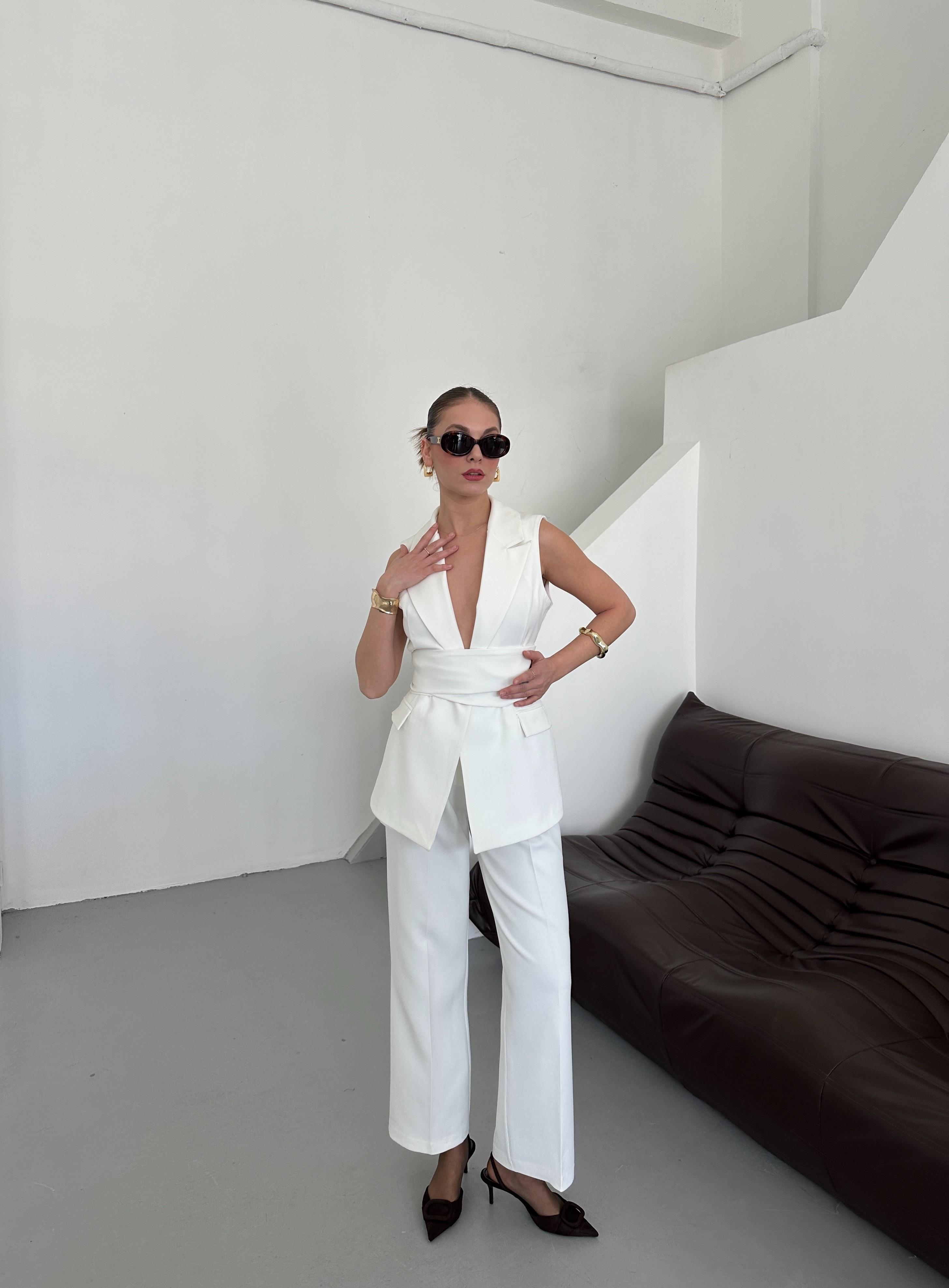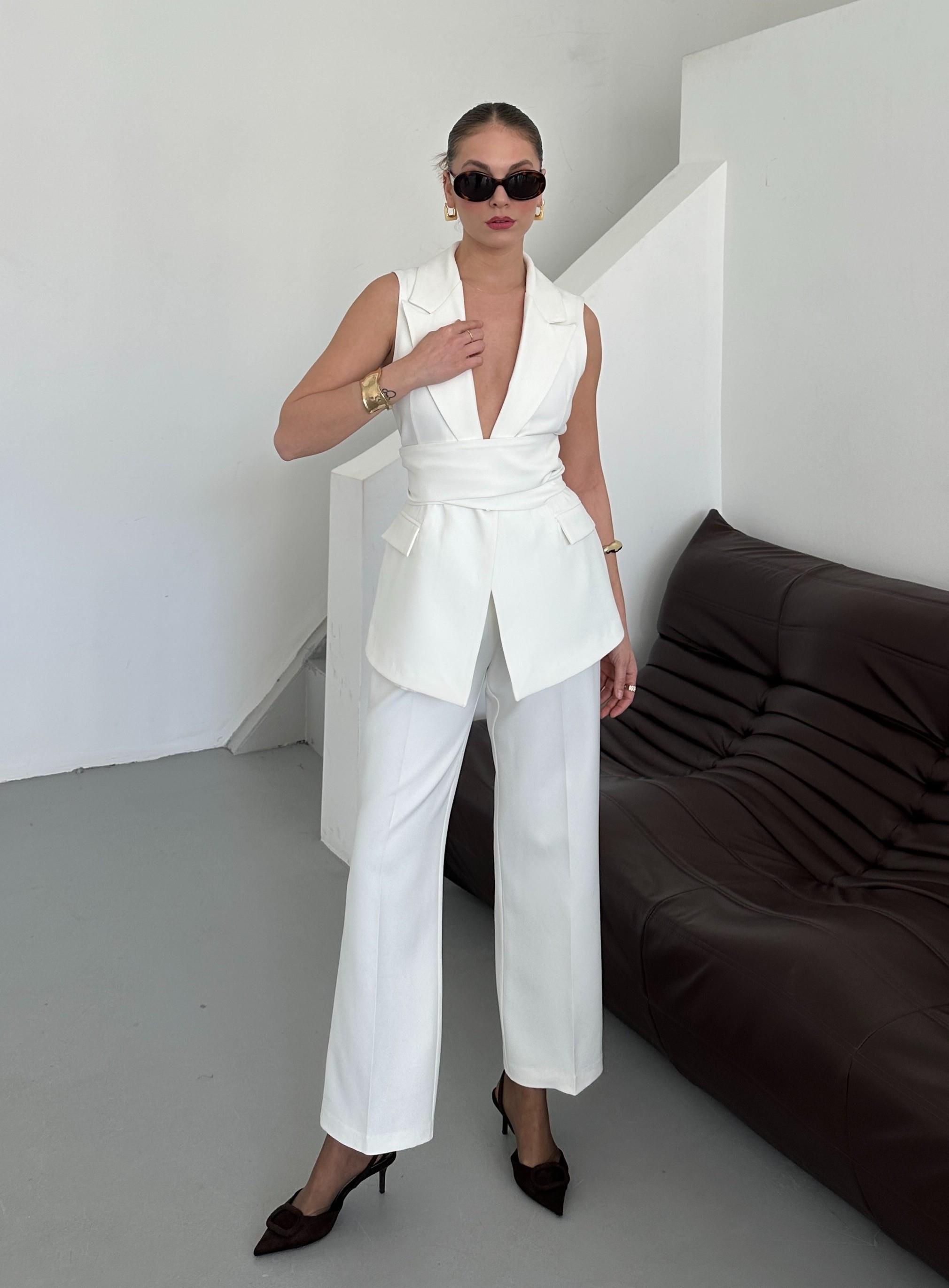 - Beyaz Eliana Kuşaklı Yelek Pantolon Takım