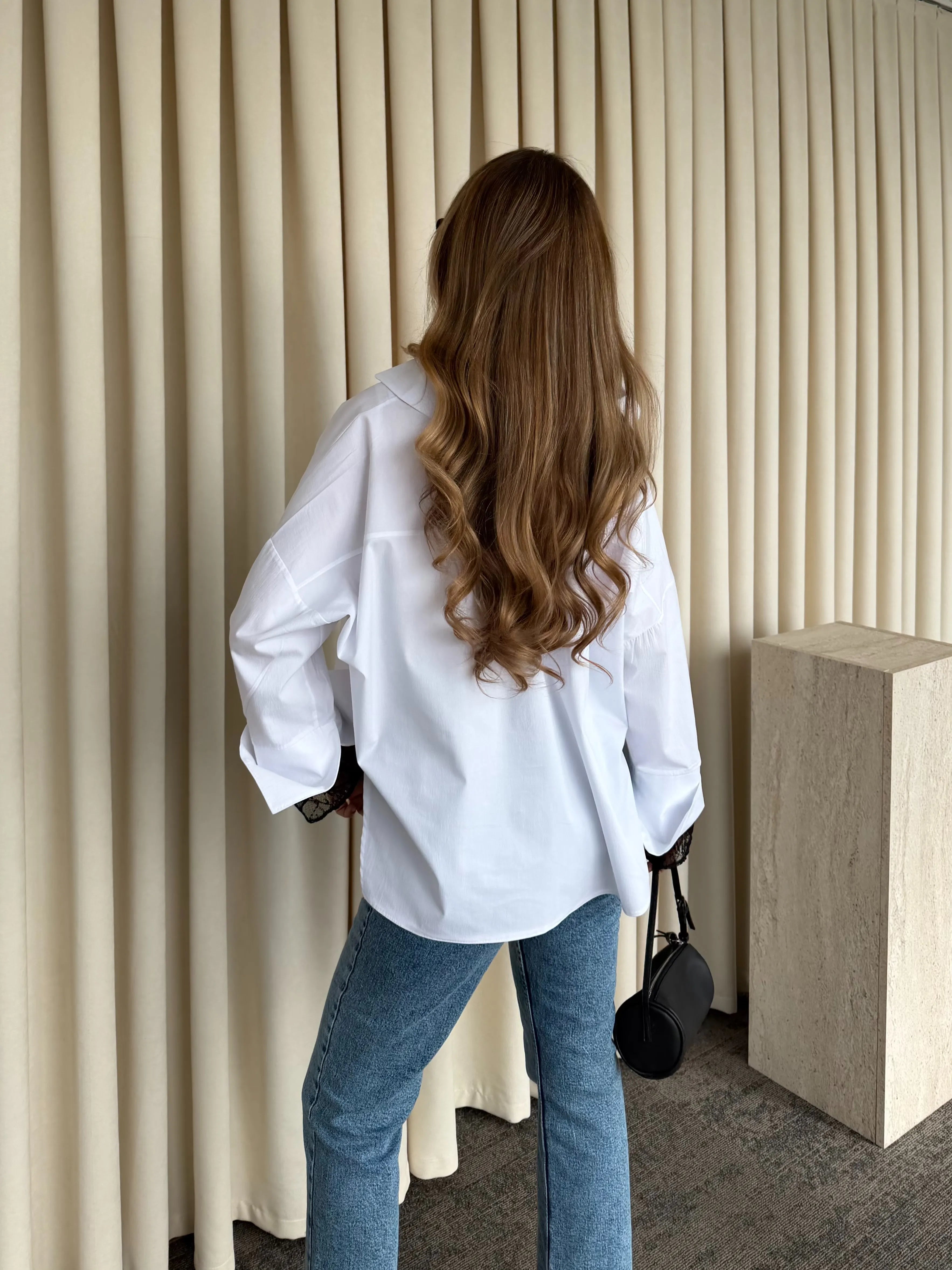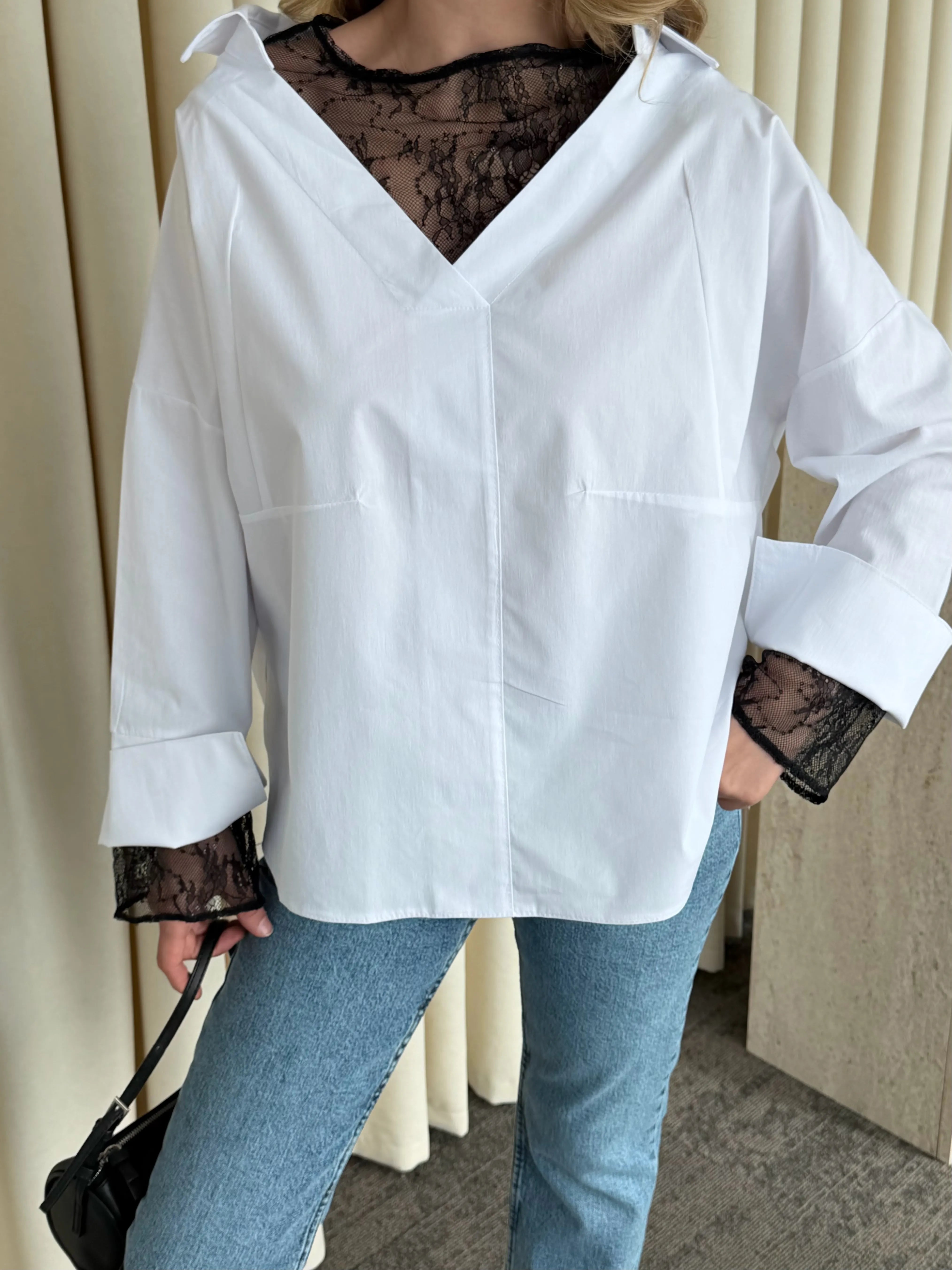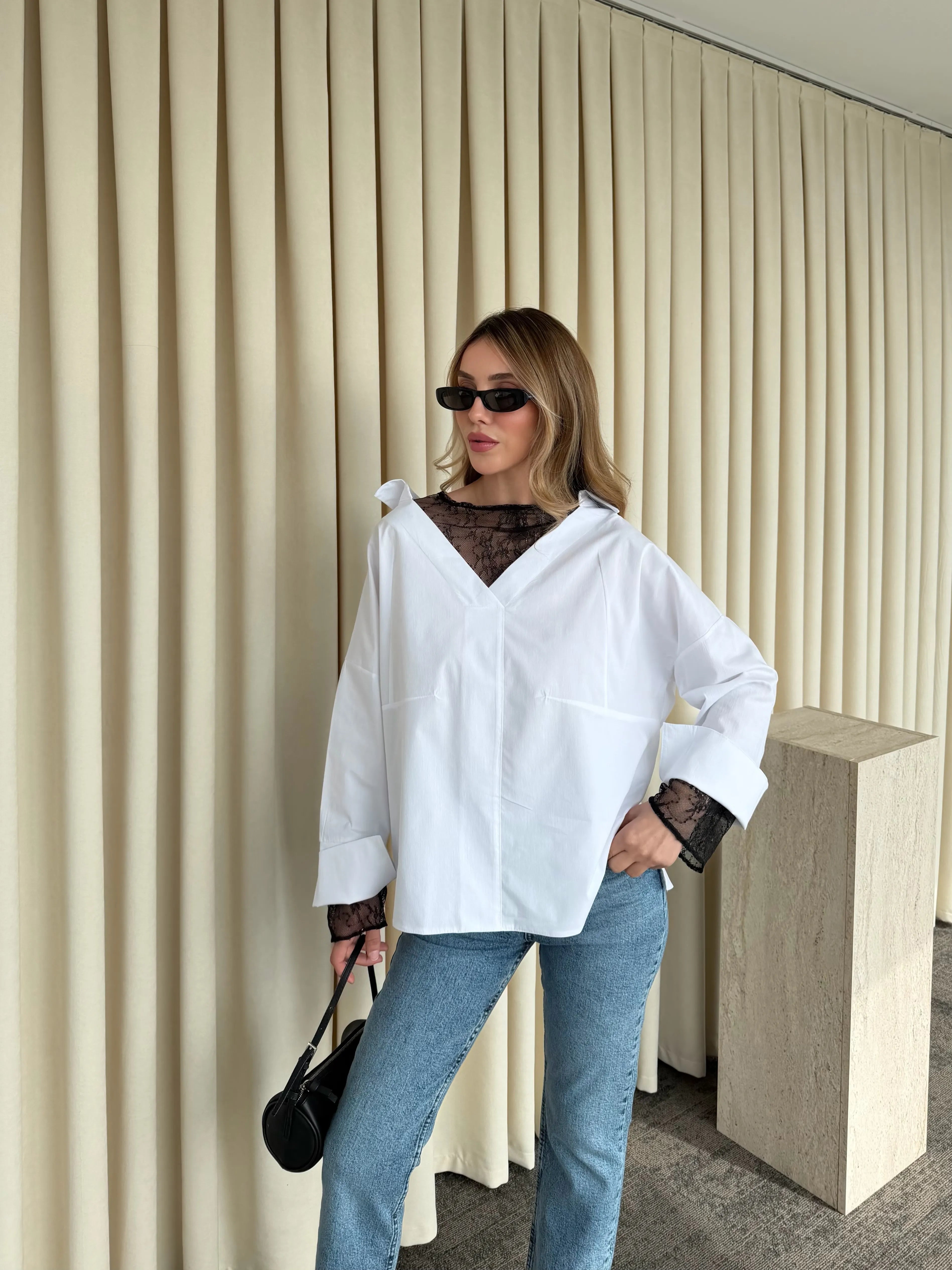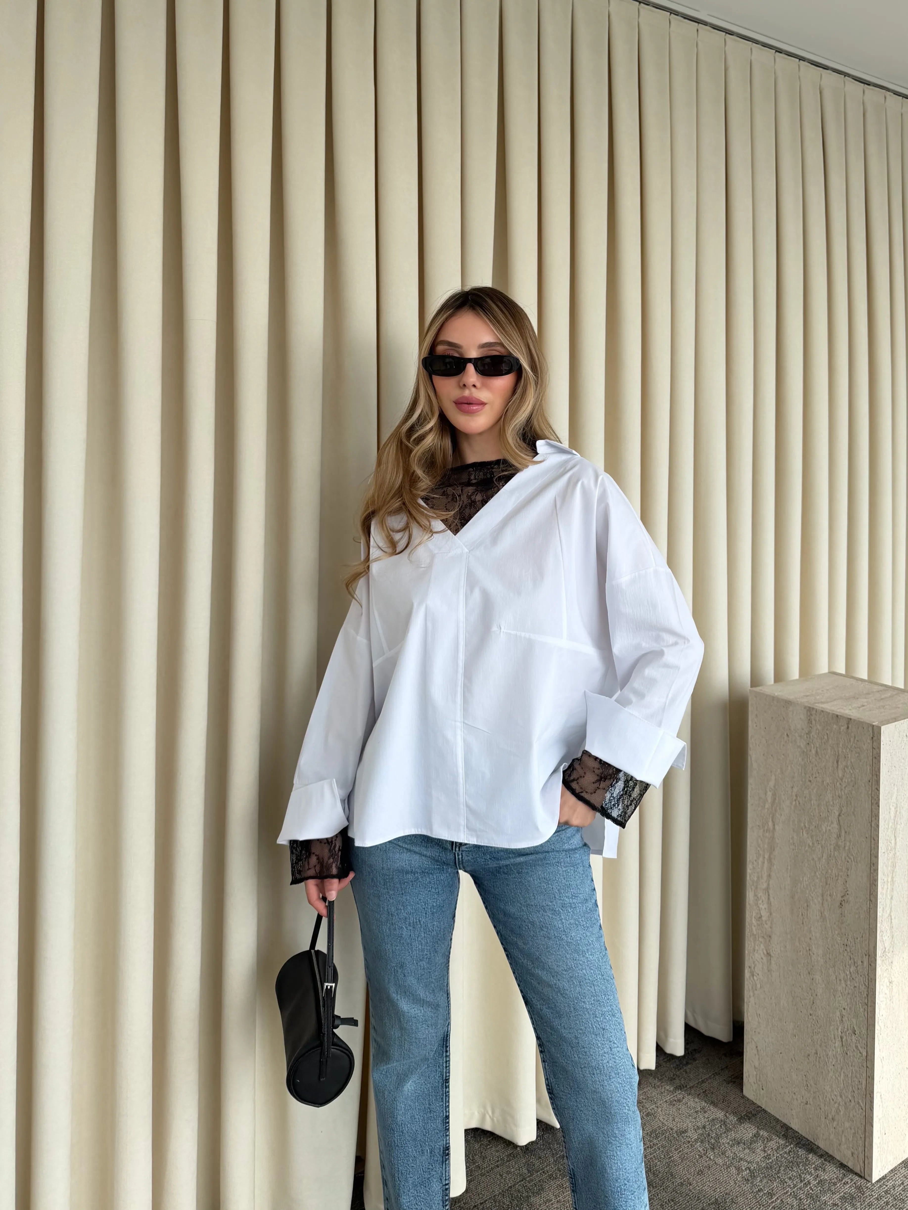 Klasik gömlek formunu cesur bir estetikle yeniden yorumlayan bu tasarım, "smart-casual" stiline yüksek moda bir soluk getiriyor. Keskin hatların içten gelen zarif dantel dokusuyla birleşimi, çok katmanlı ve sofistike bir görünüm arayanlar için tasarlandı.