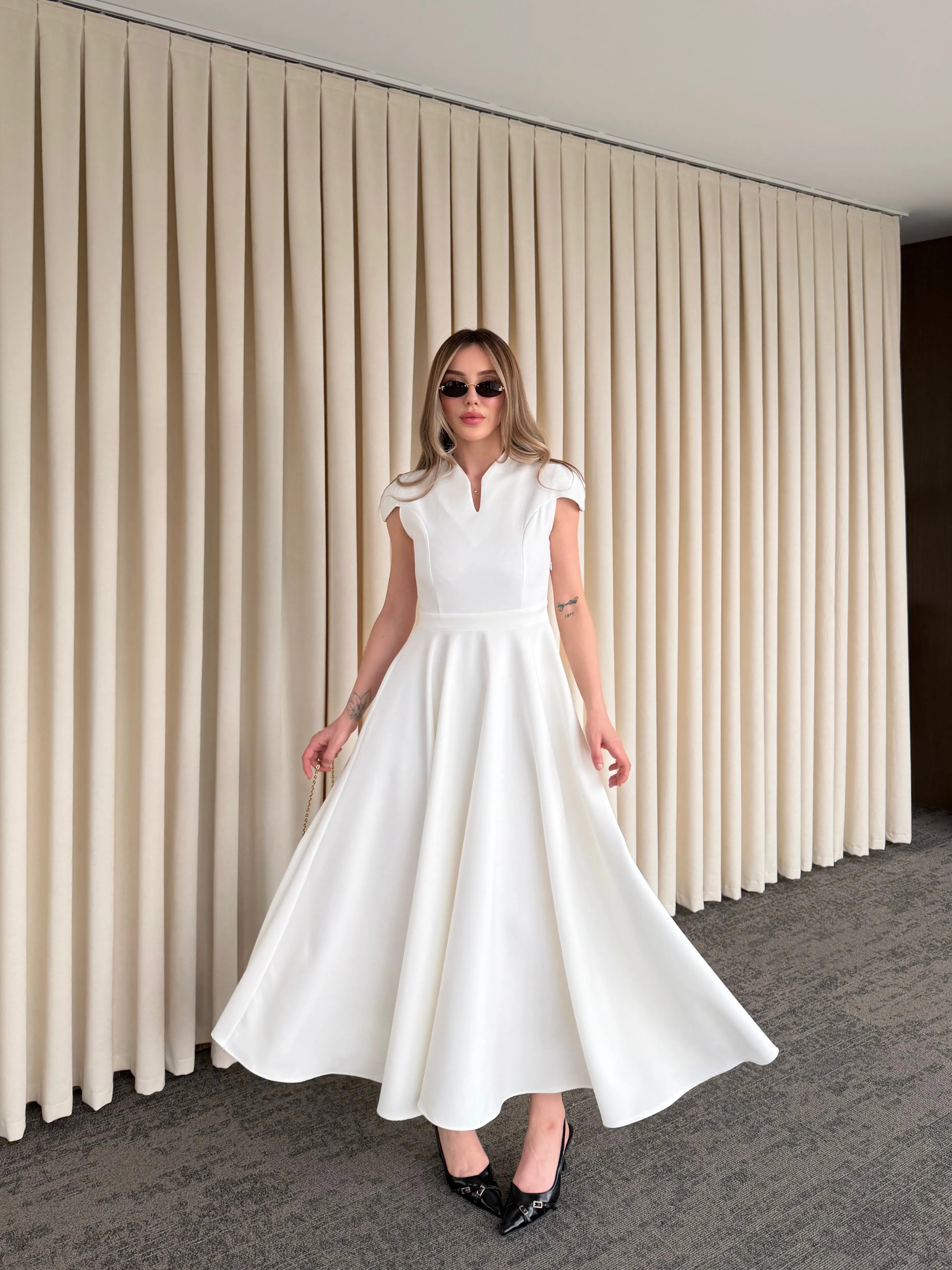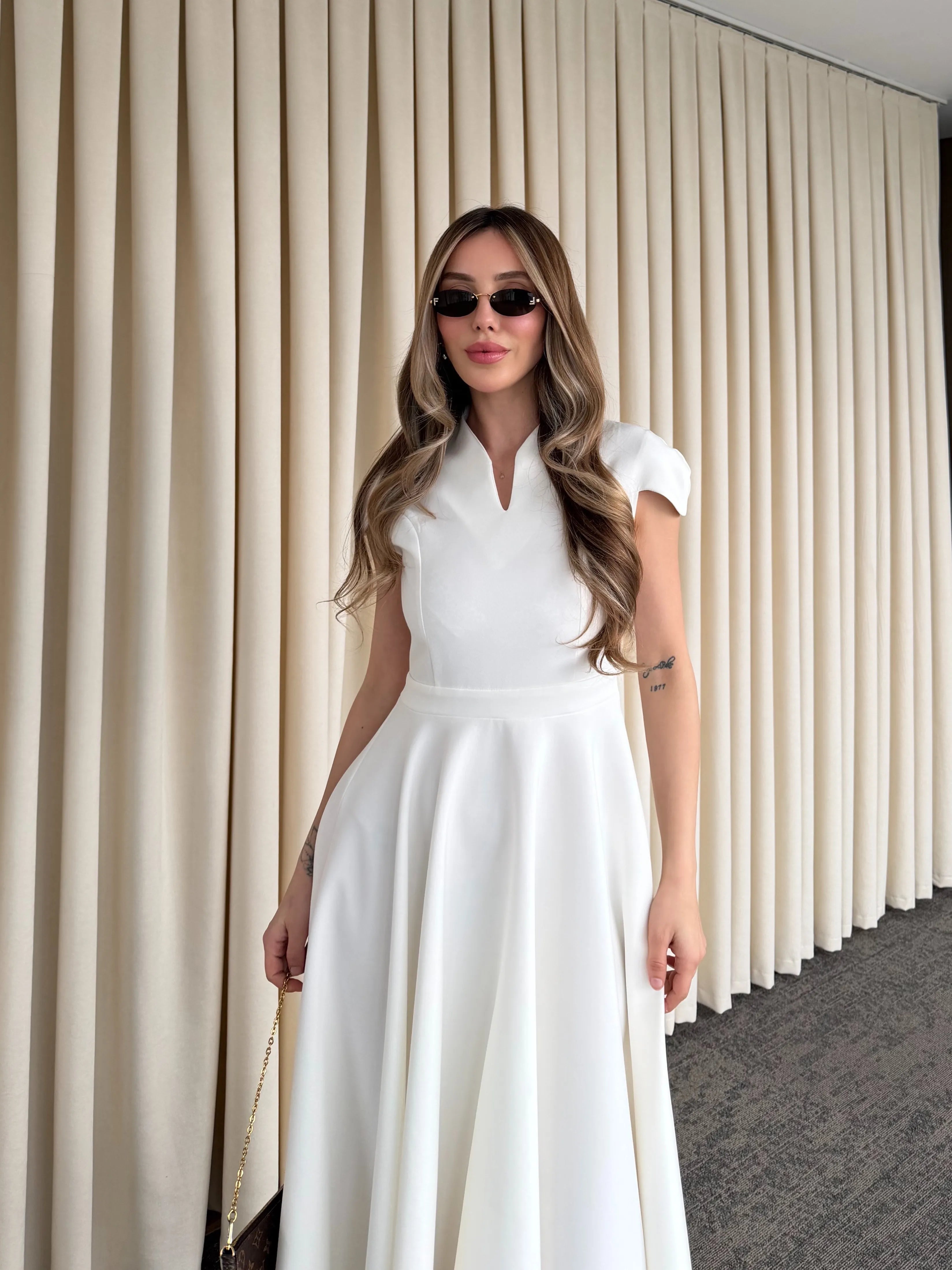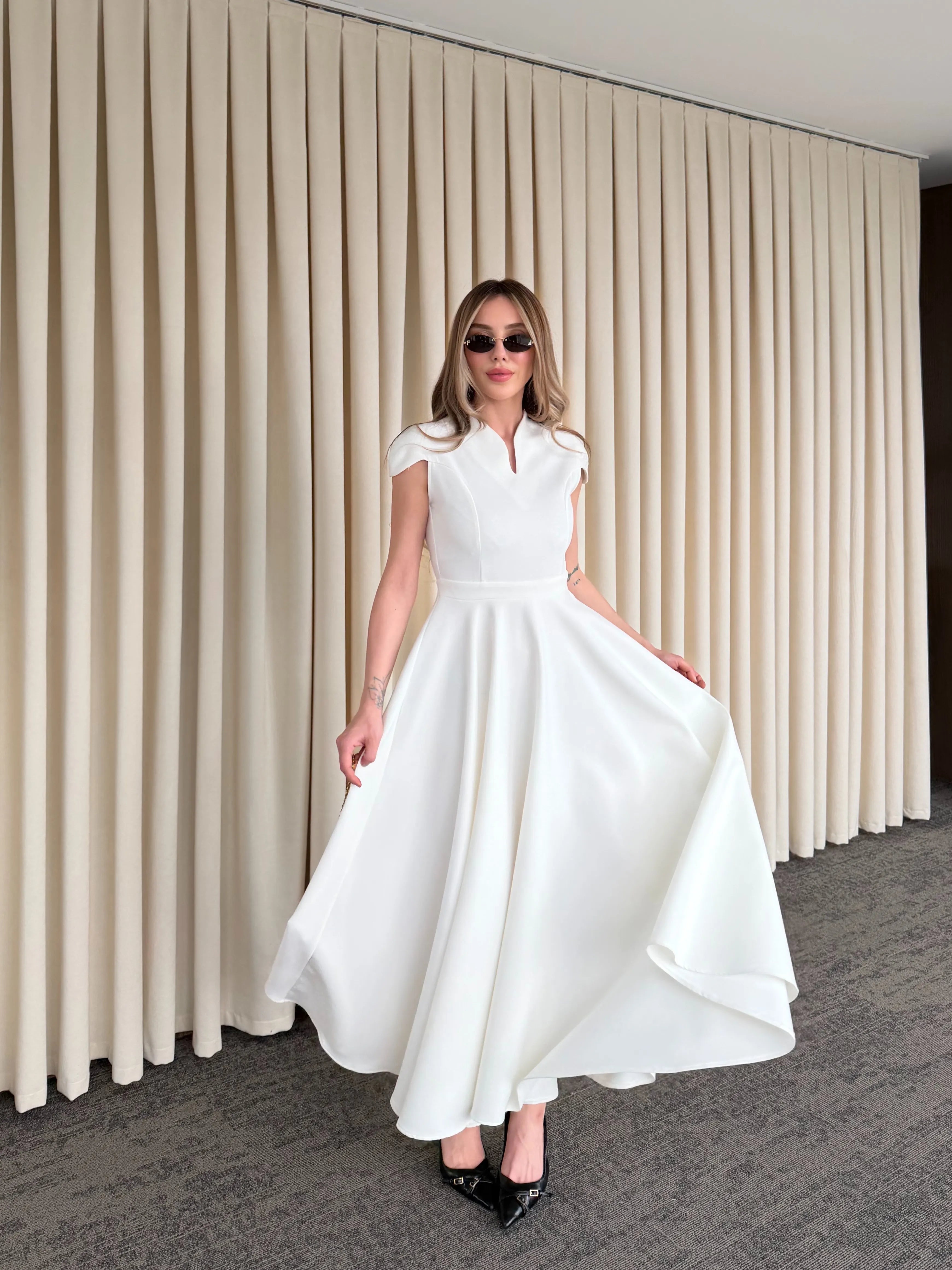 Yüksek terzilik işçiliğiyle hazırlanan bu parça, modern kadının gardırobundaki "kilit parça" olma özelliğini taşır. Gövdeye tam oturan üst kalıp ile hacimli etek yapısı arasındaki kusursuz denge, zamansız bir estetik anlayışını yansıtır.