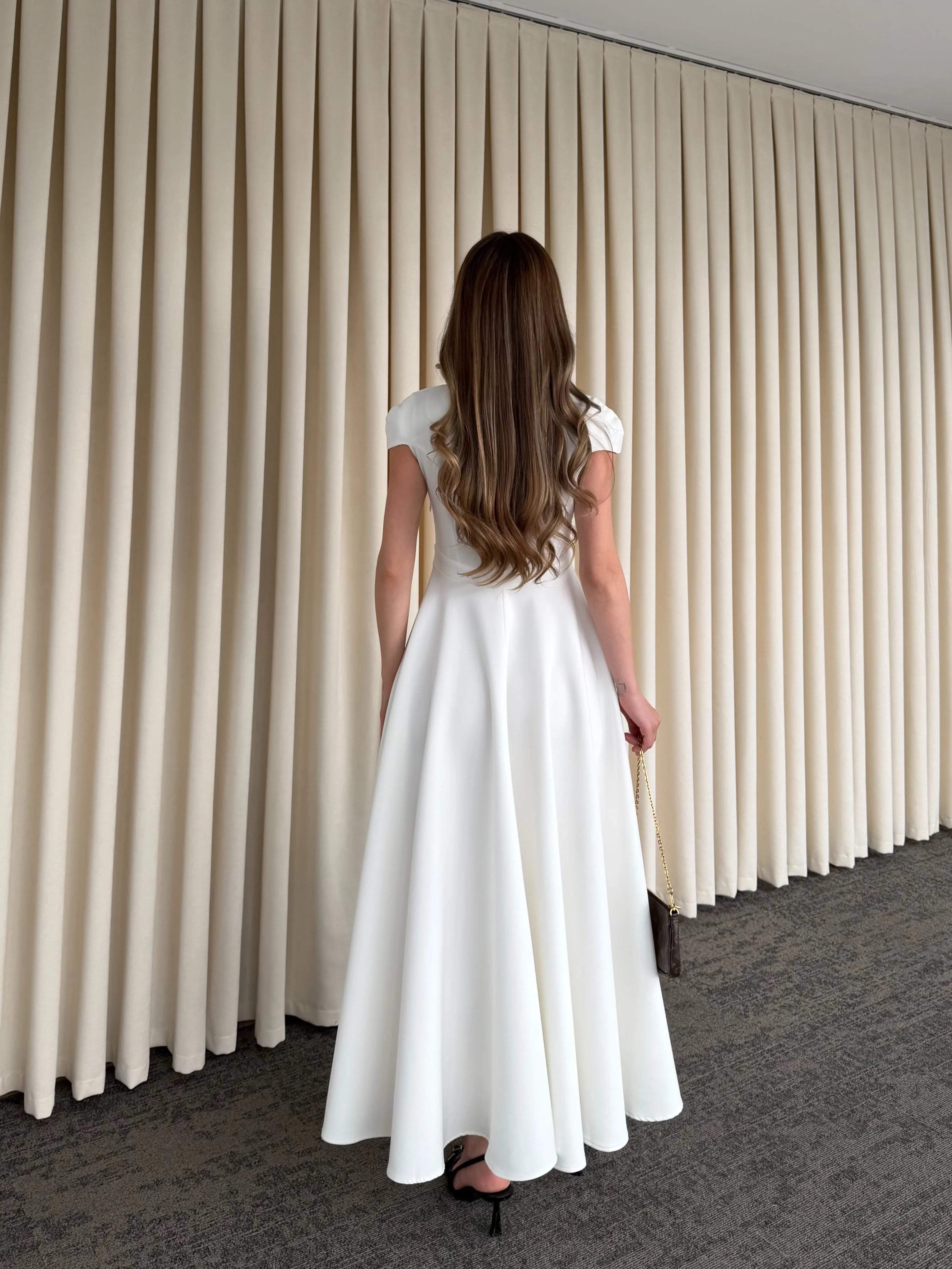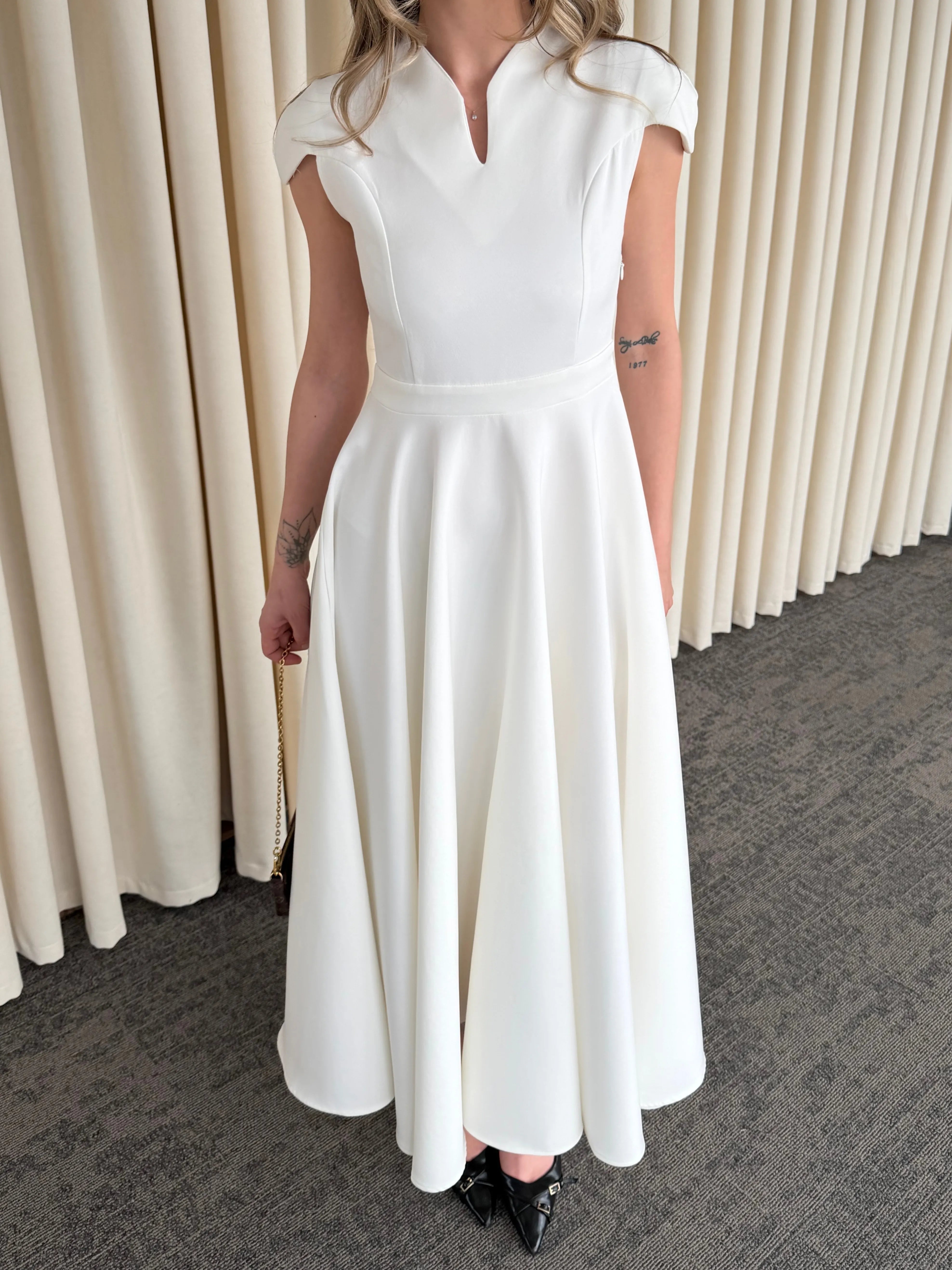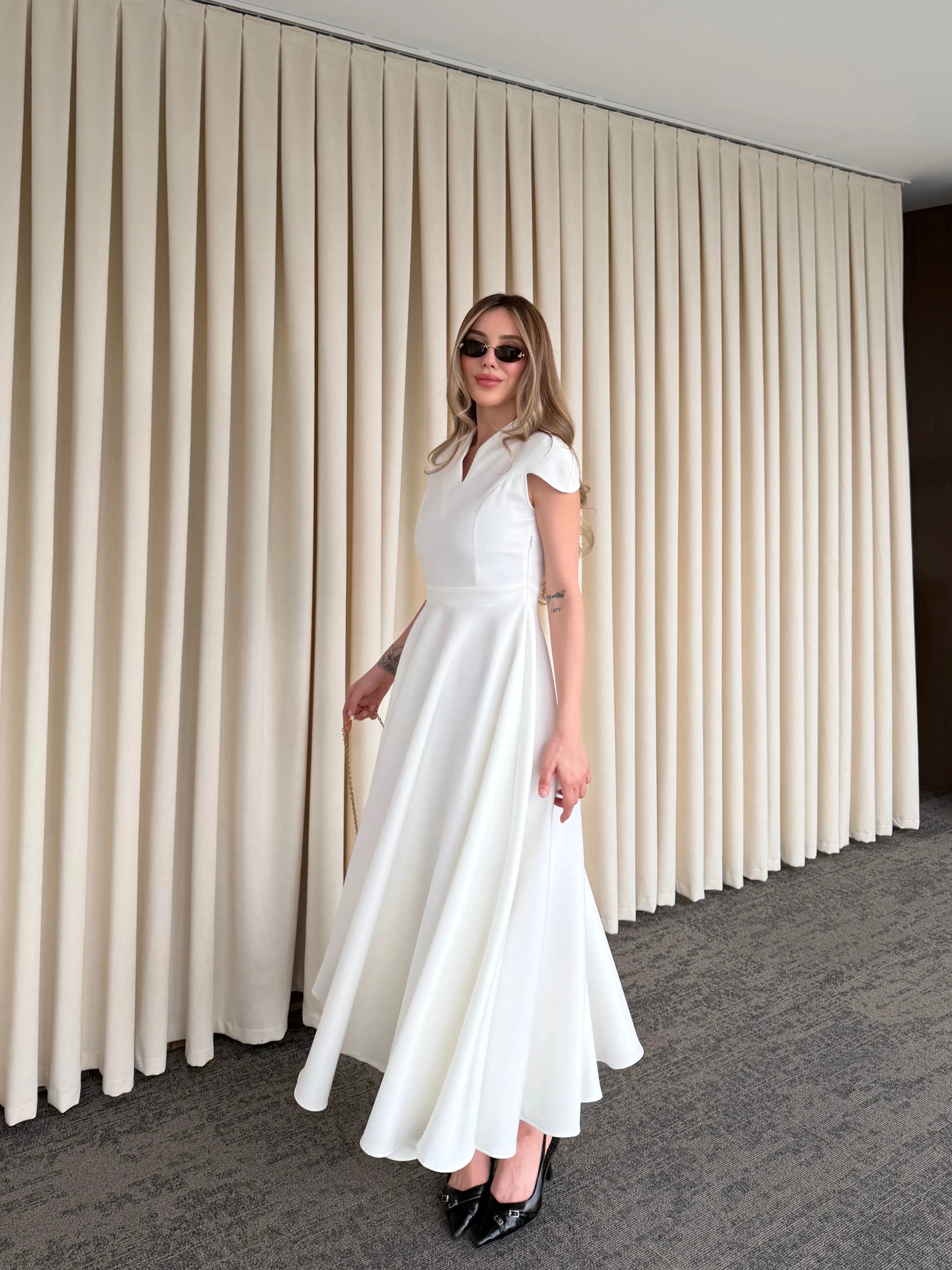 Yüksek terzilik işçiliğiyle hazırlanan bu parça, modern kadının gardırobundaki "kilit parça" olma özelliğini taşır. Gövdeye tam oturan üst kalıp ile hacimli etek yapısı arasındaki kusursuz denge, zamansız bir estetik anlayışını yansıtır.