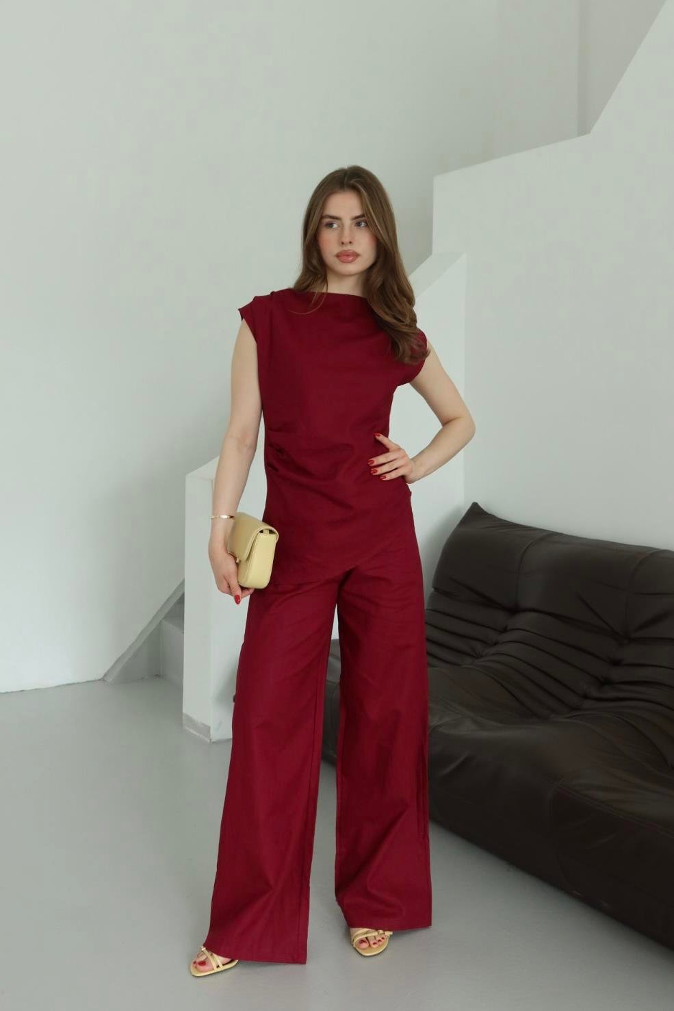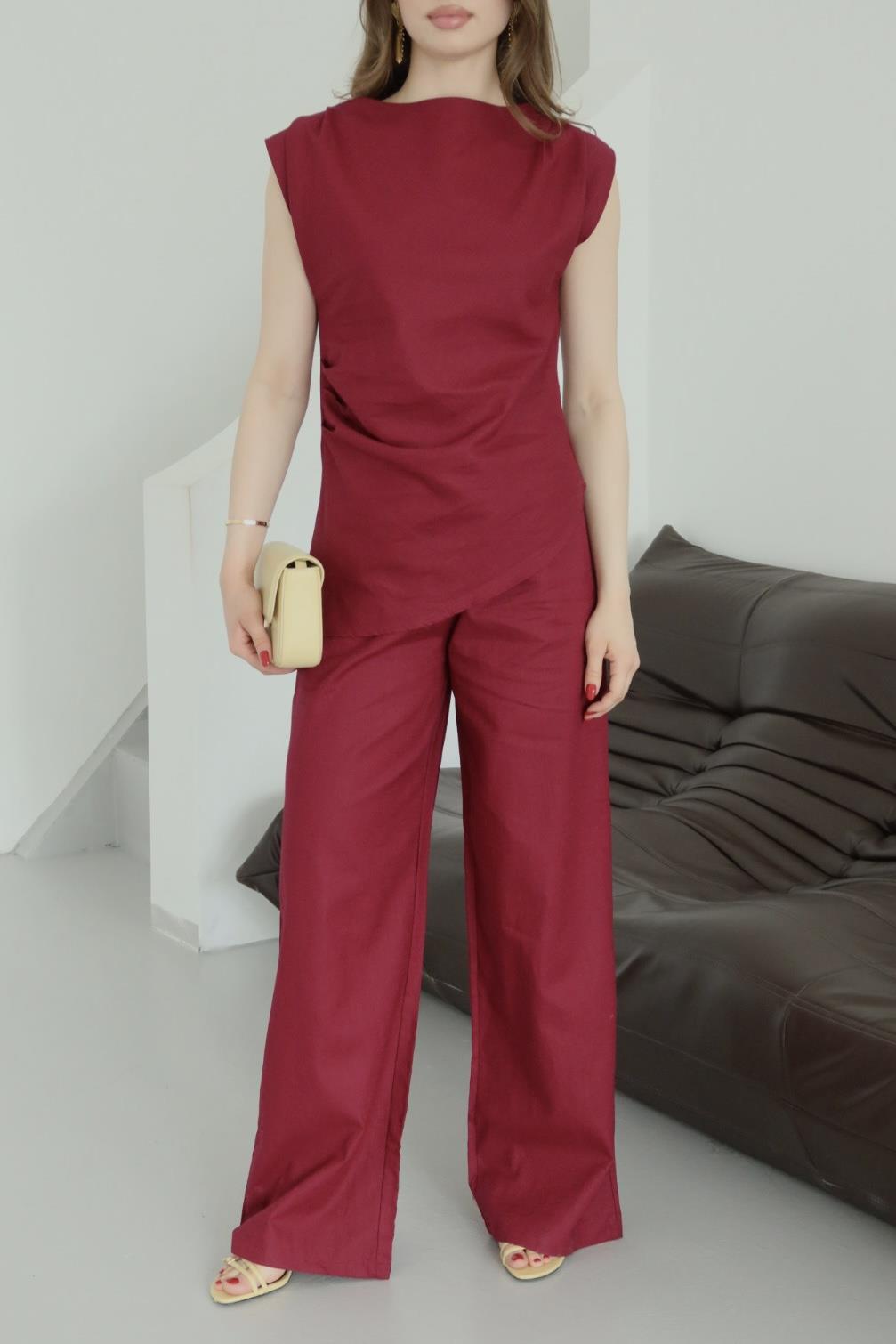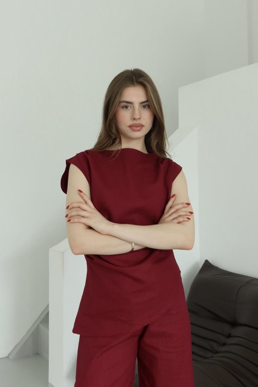 - Bordo Asimetrik Bluz Pantolon Takım