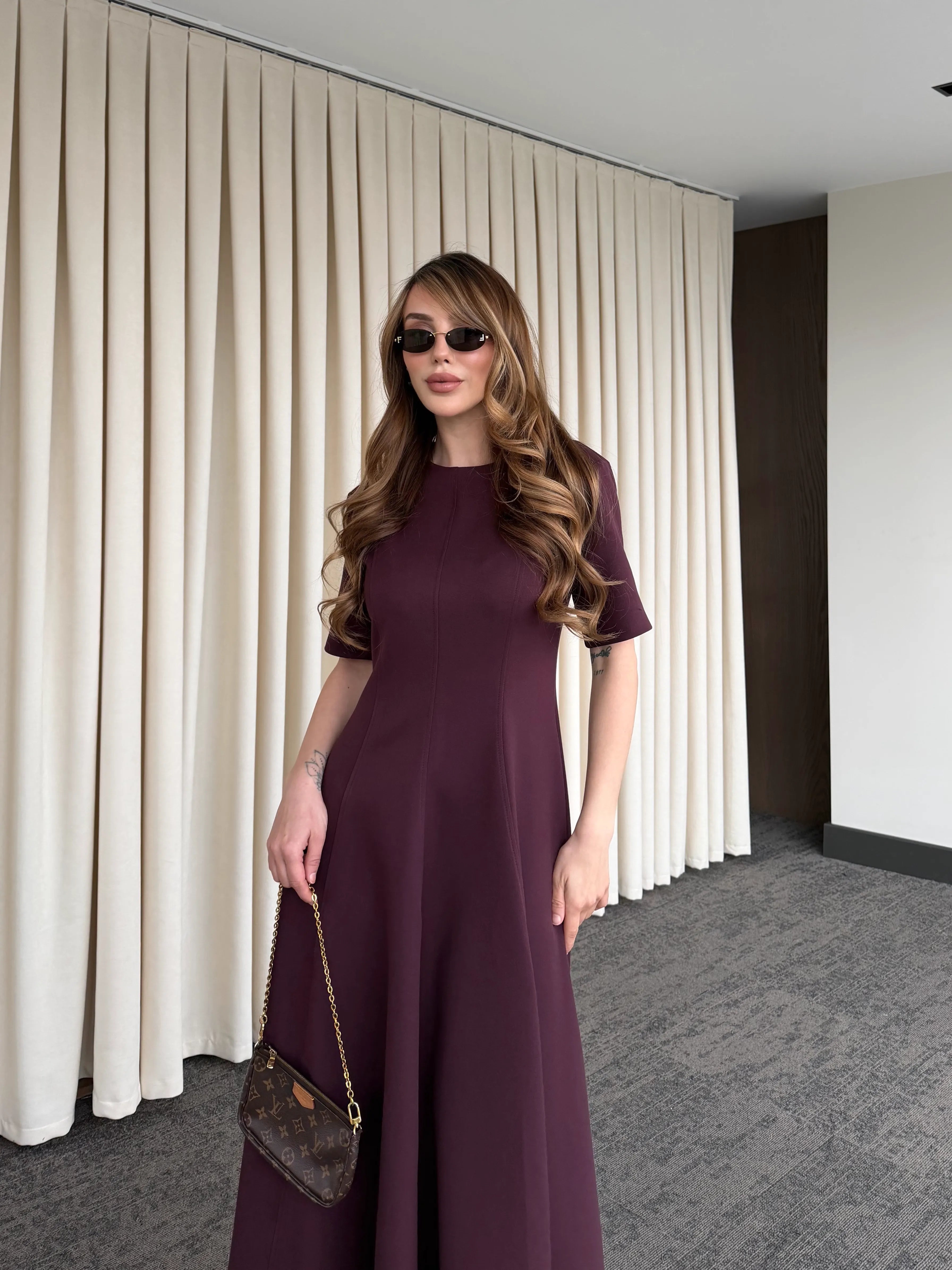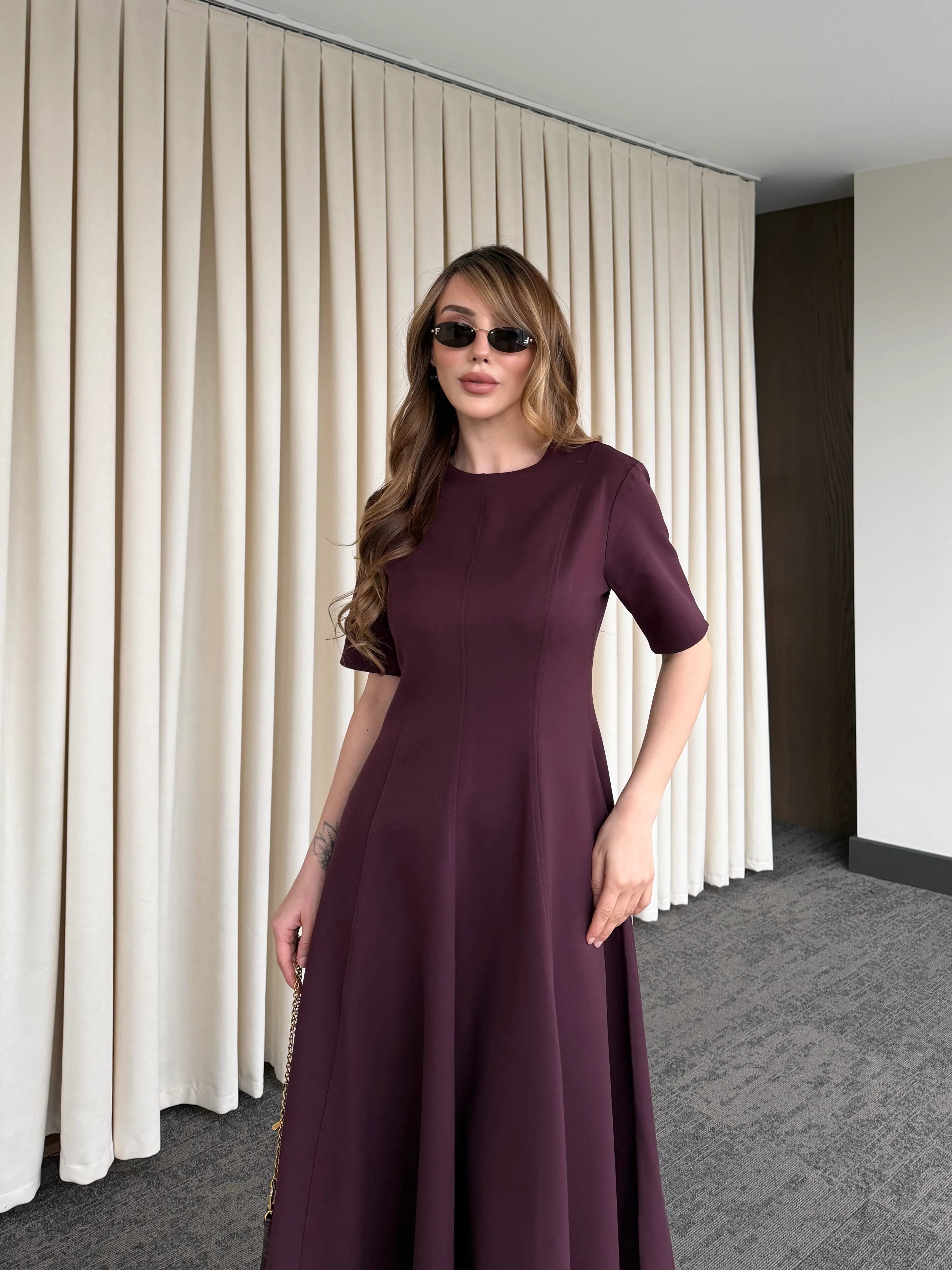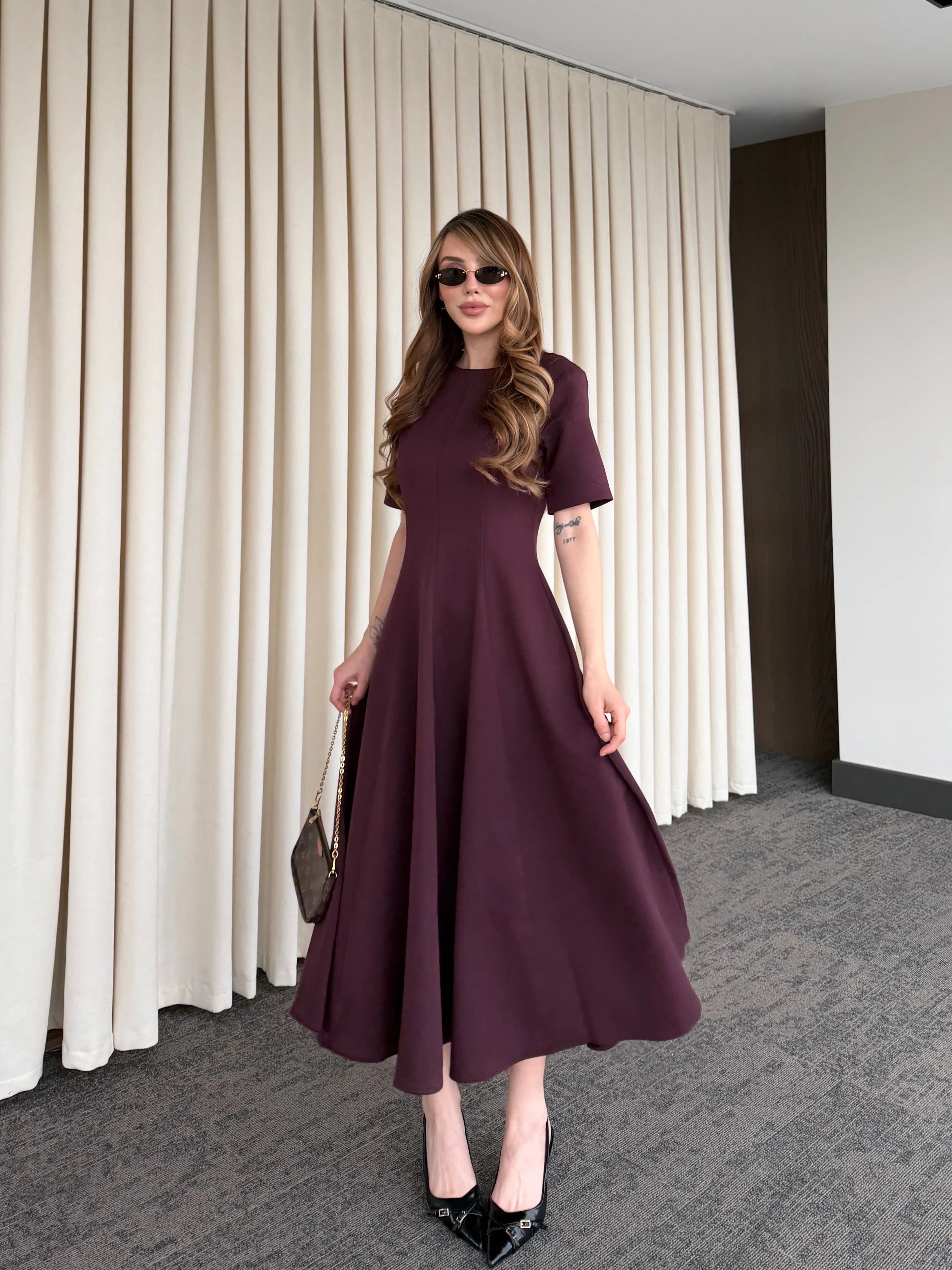 Akıcı formu ve net siluetiyle bu midi elbise, ilk bakışta zarafeti hissettirir. Üst bedeni vücuda oturan yapısı ve aşağı doğru genişleyen eteği sayesinde hareket ettikçe hacimli ve etkileyici bir görünüm sunar.