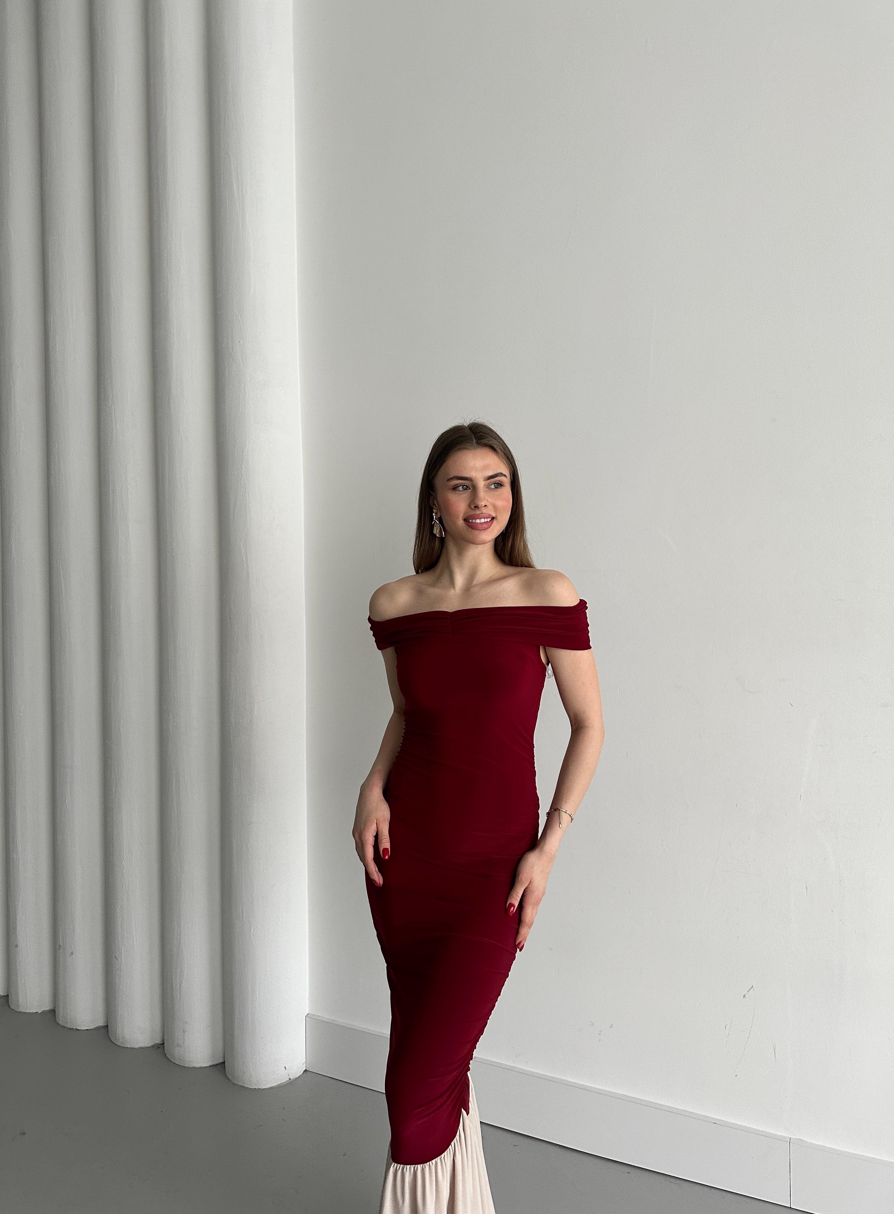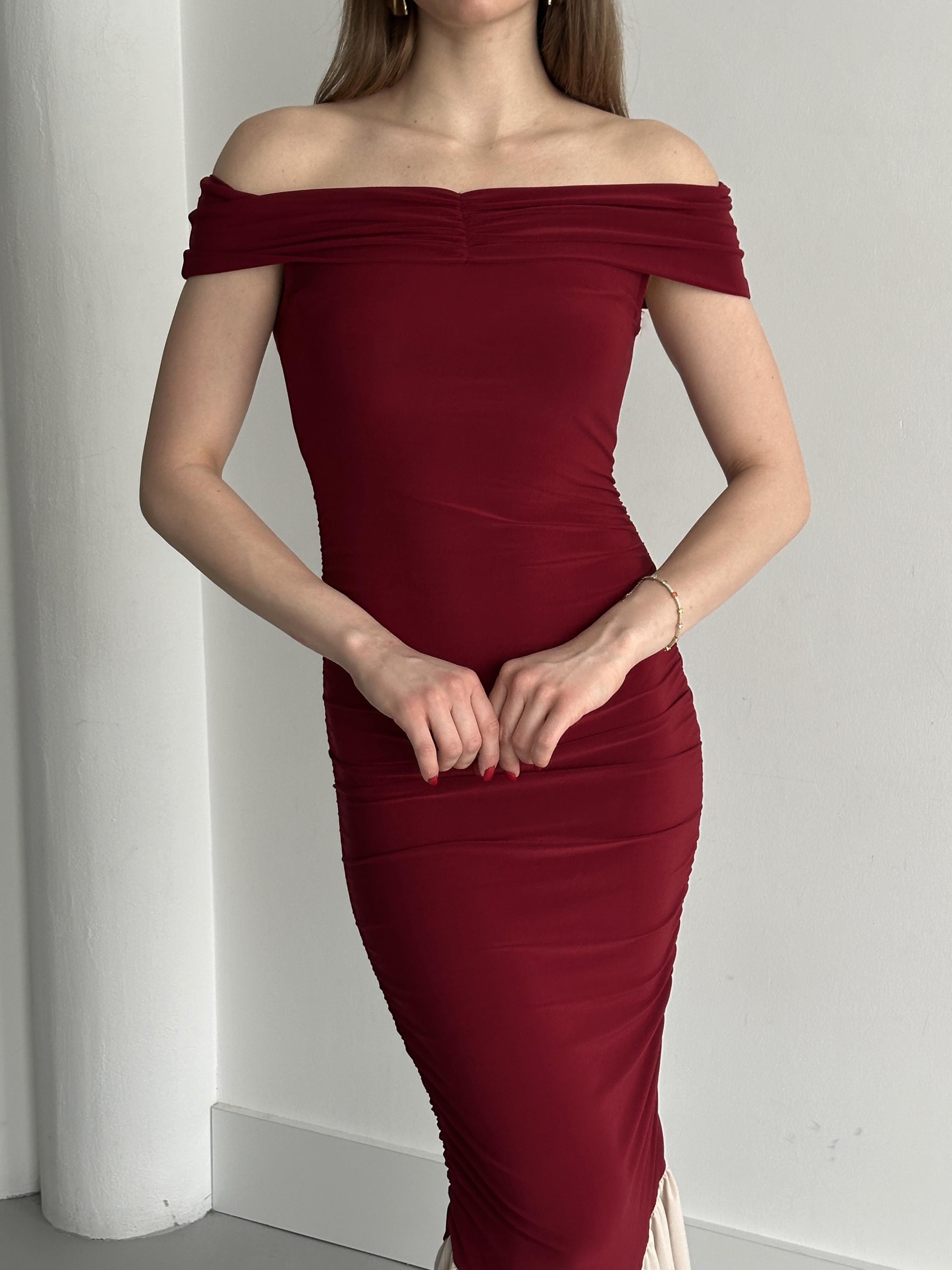 - Bordo Kayık Yaka Fırfırlı Elbise