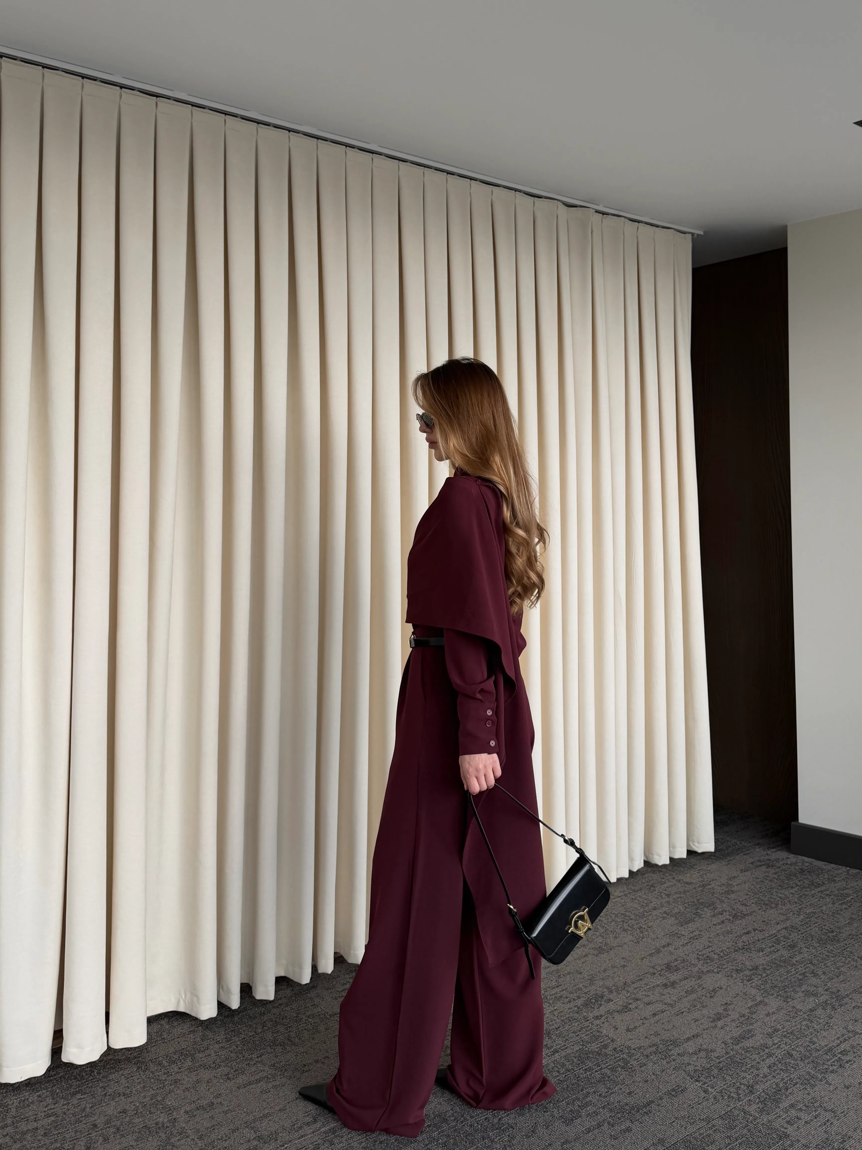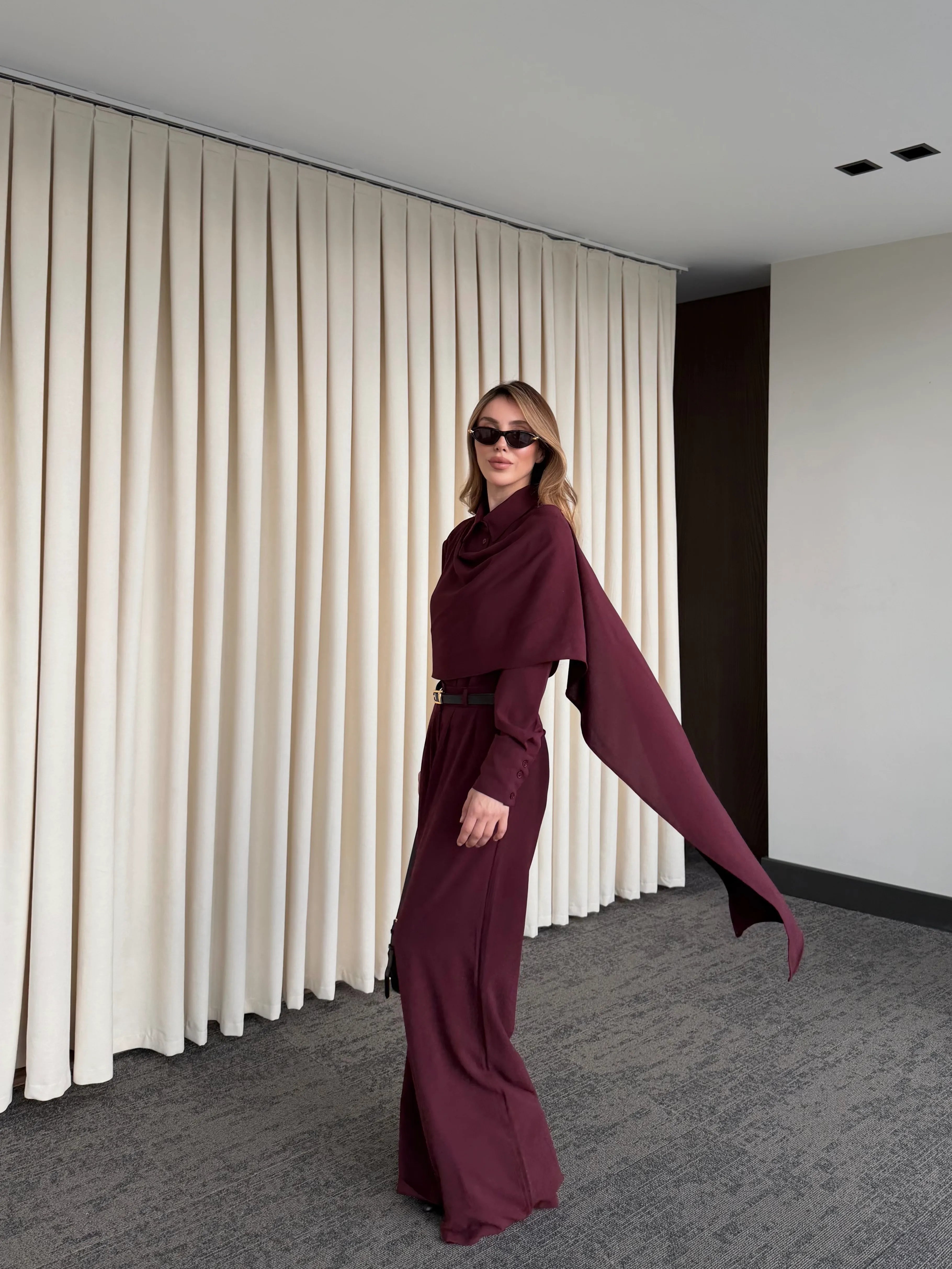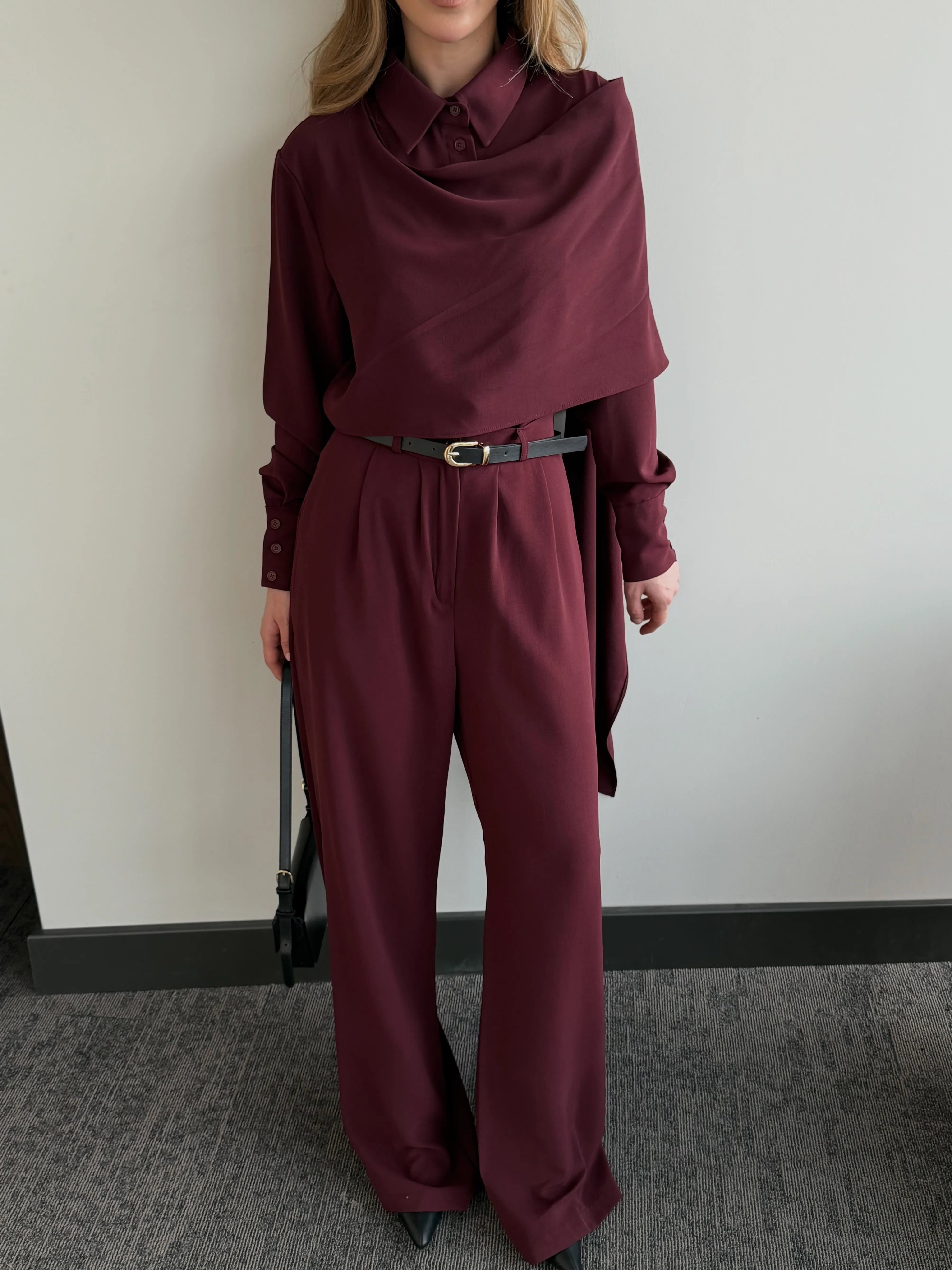 - Bordo Kemerli Şal Yaka Gömlek Pantolon Takım - 8004
