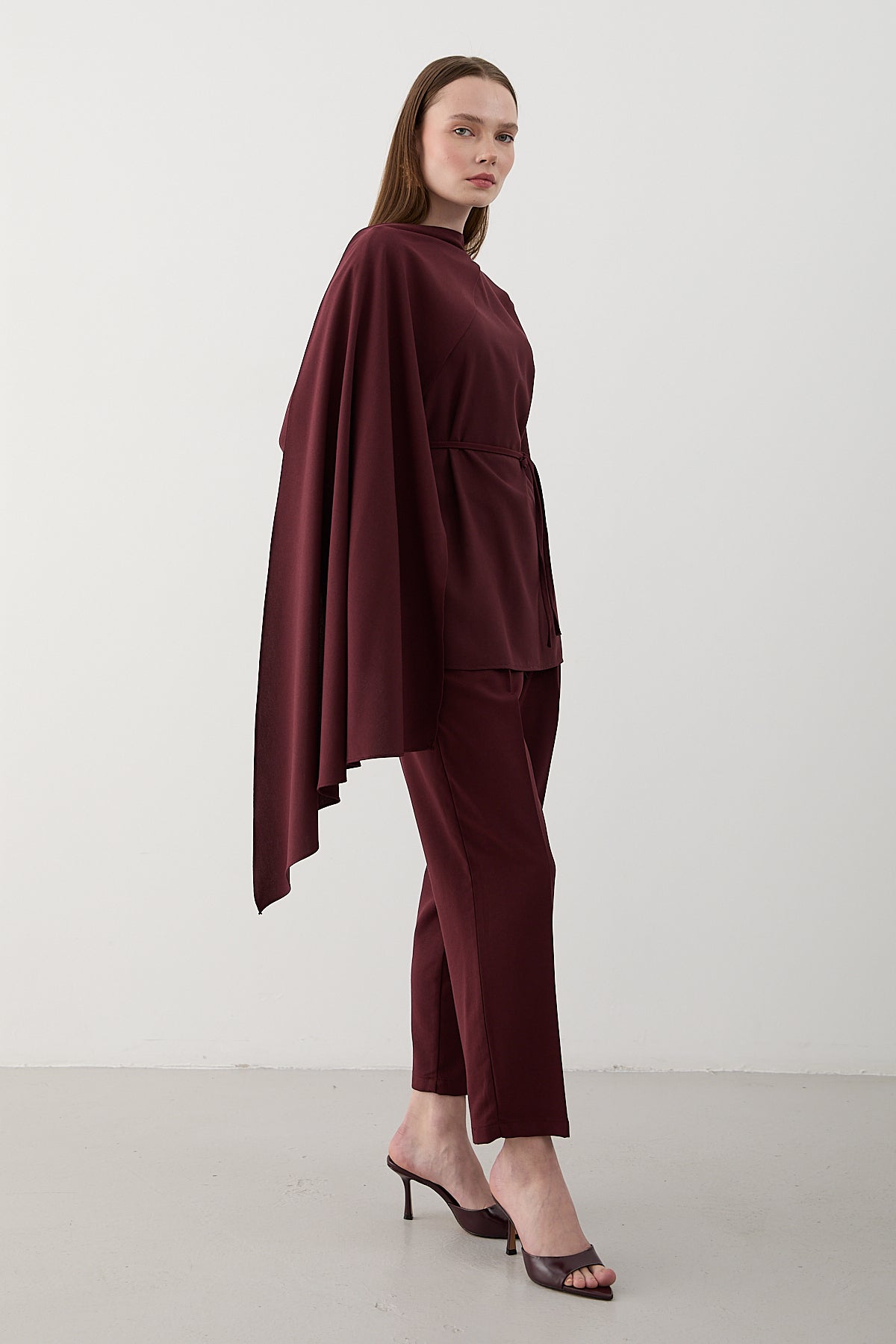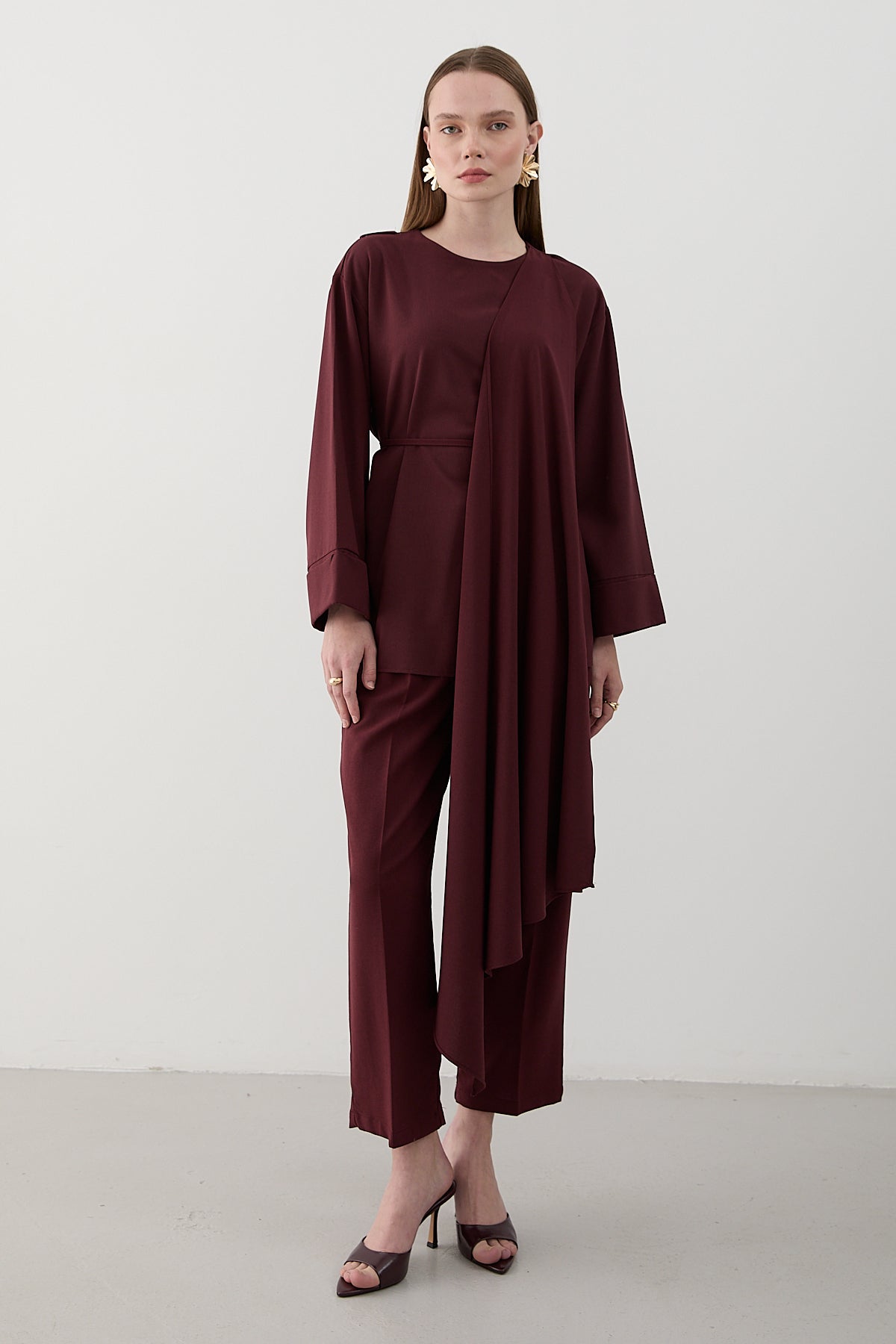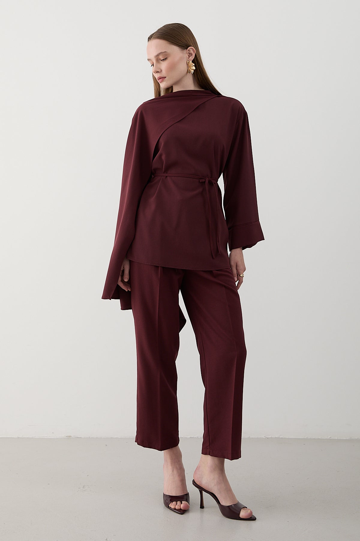Bordo Kendinden Şallı Bluz Pantolon Takım - 8752