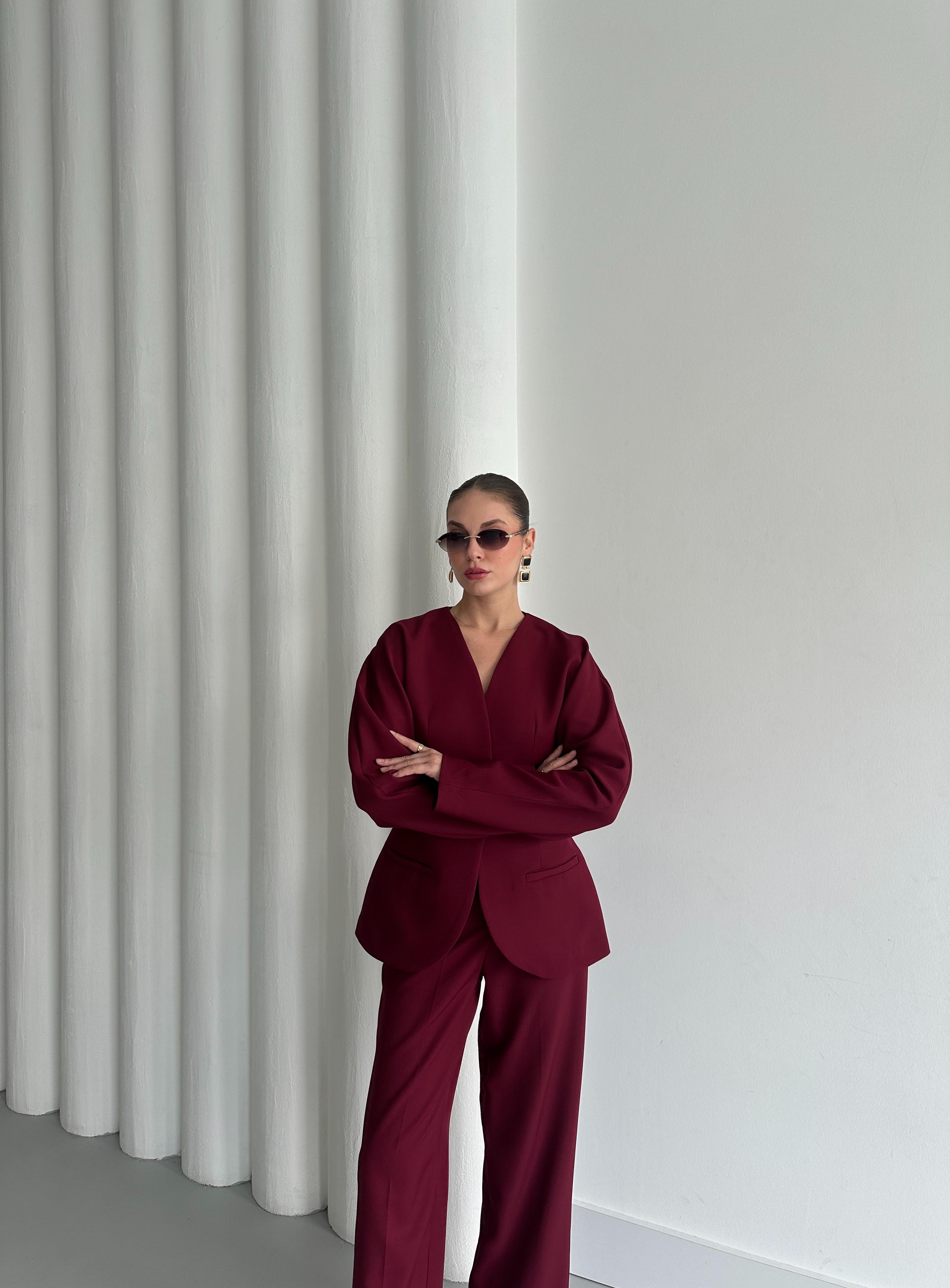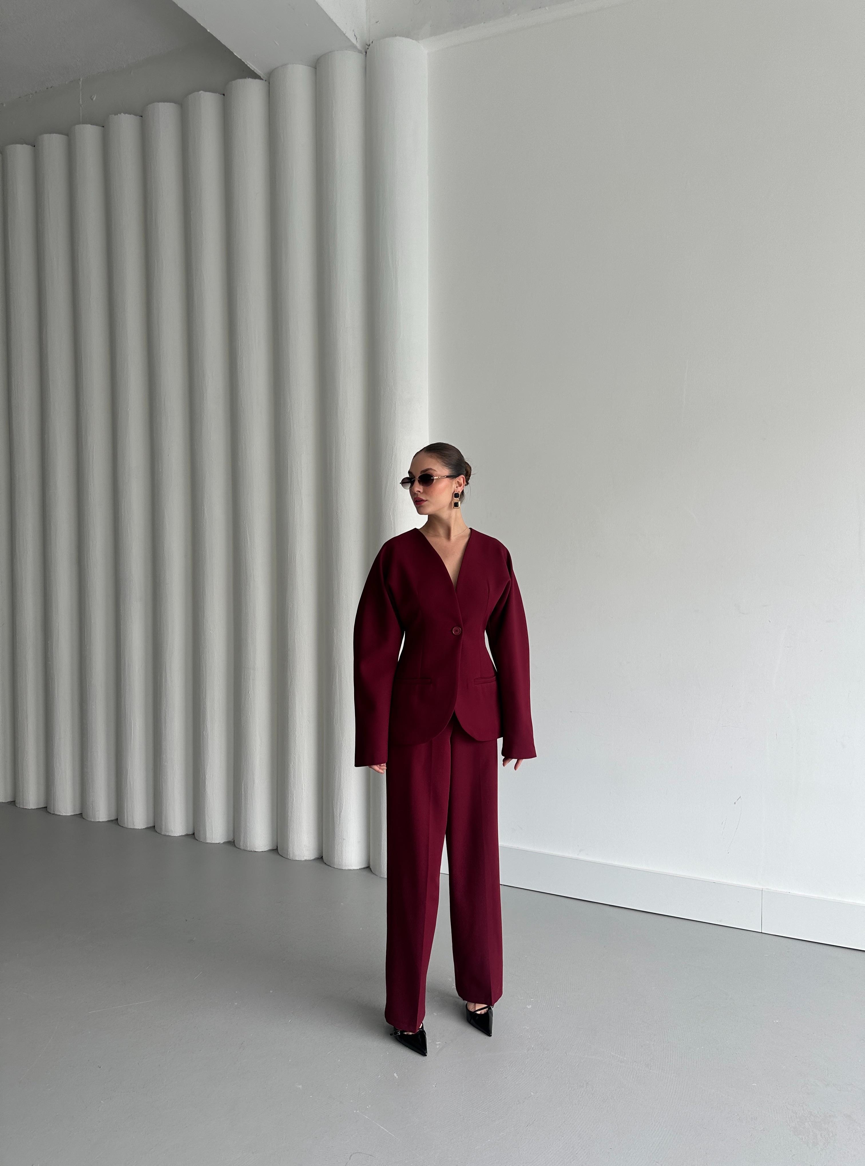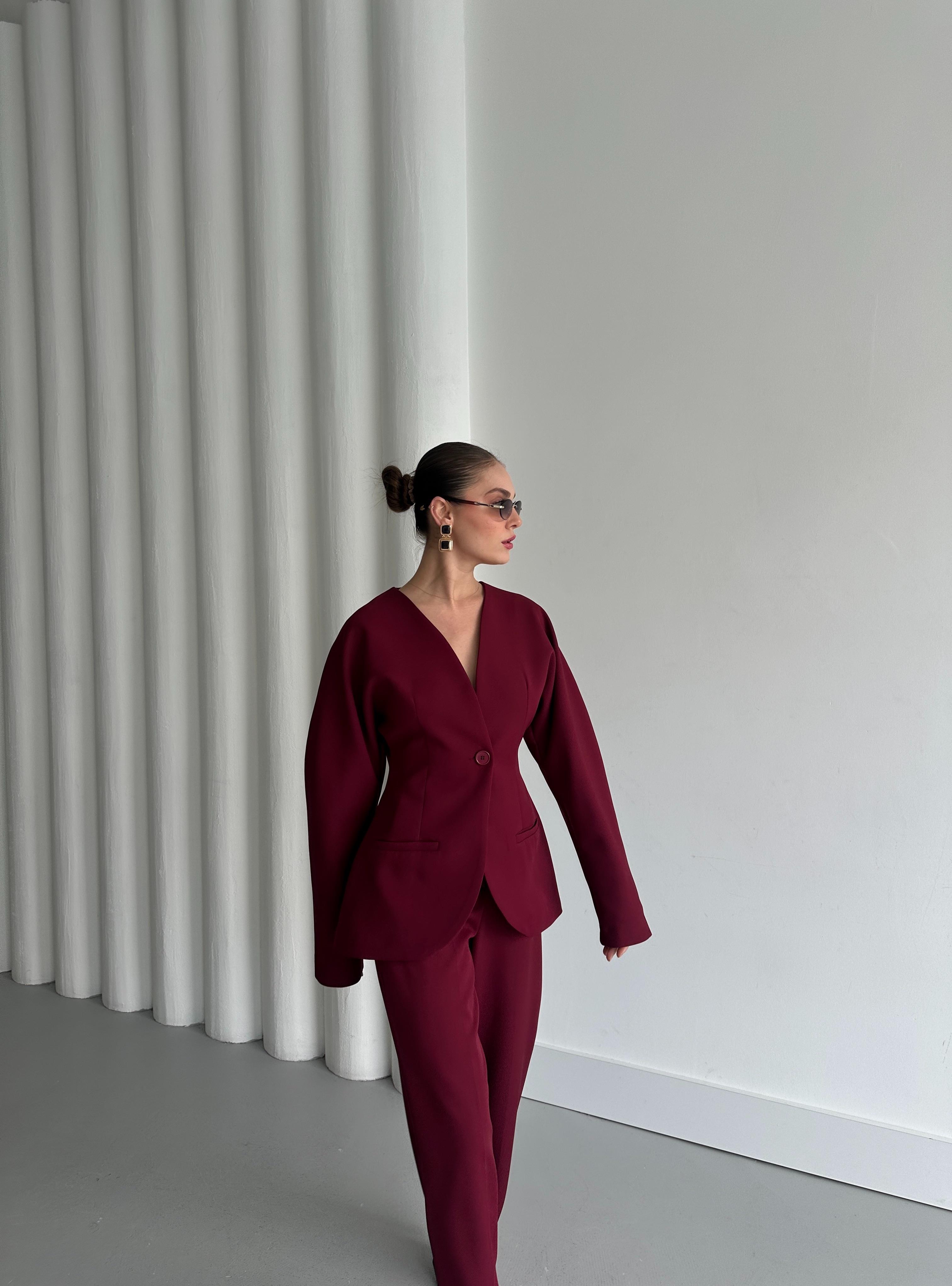 - Bordo Lorah Belden Oturtmalı Ceket Pantolon Takım