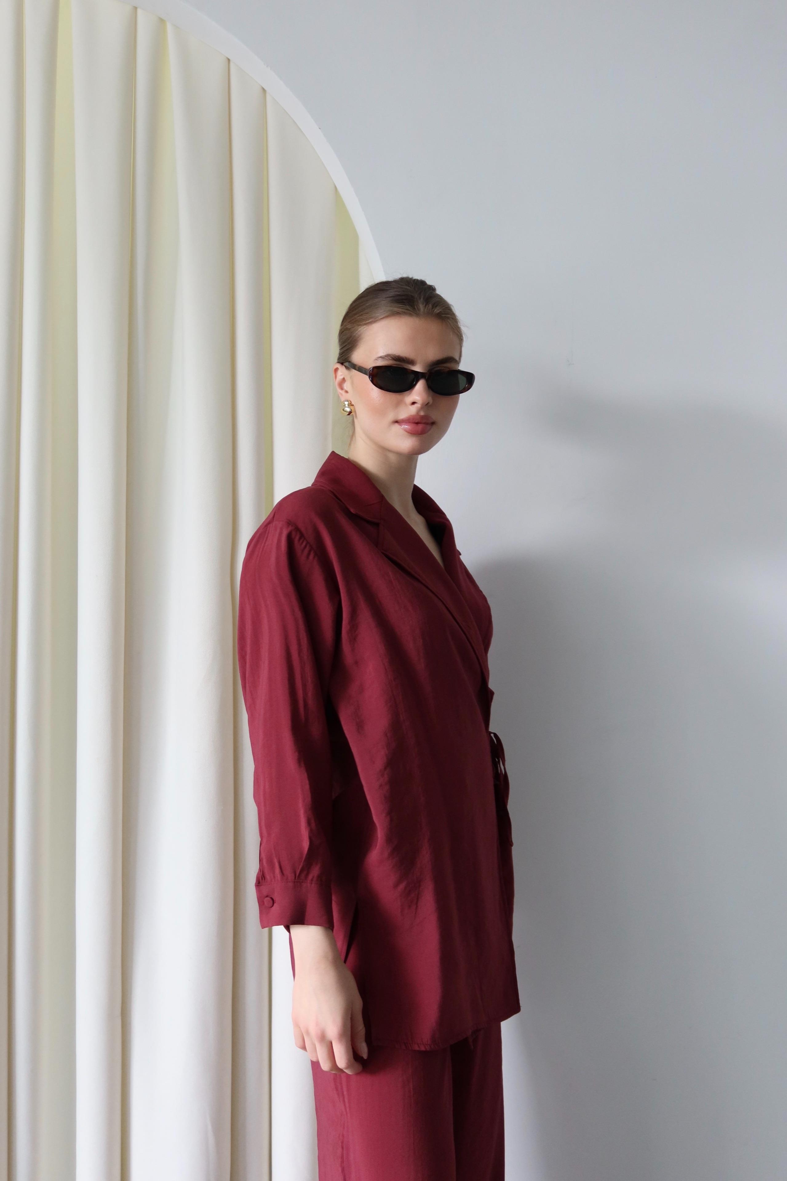 Bordo Yaka Detaylı Bağlamalı Kimono Takım