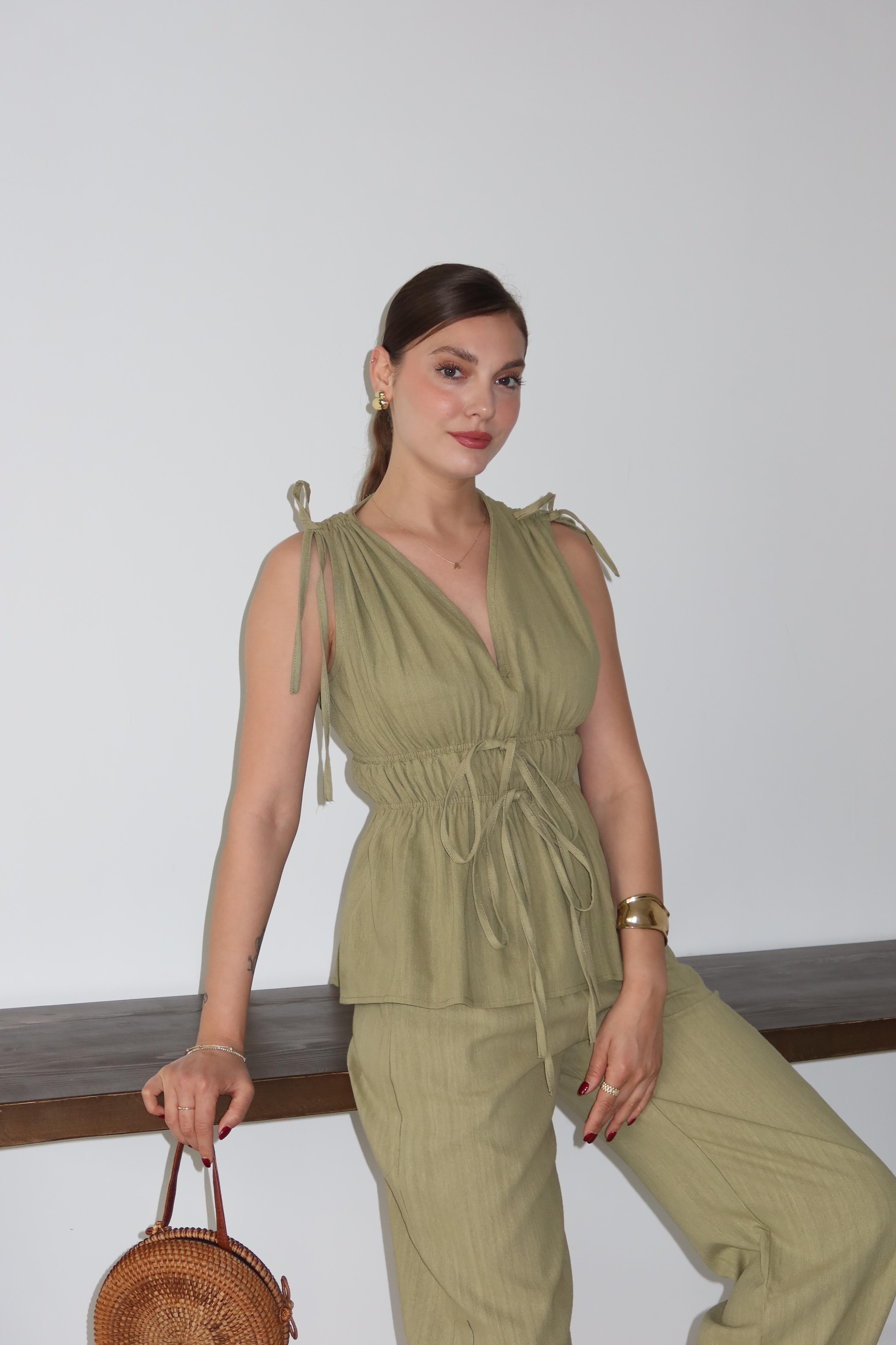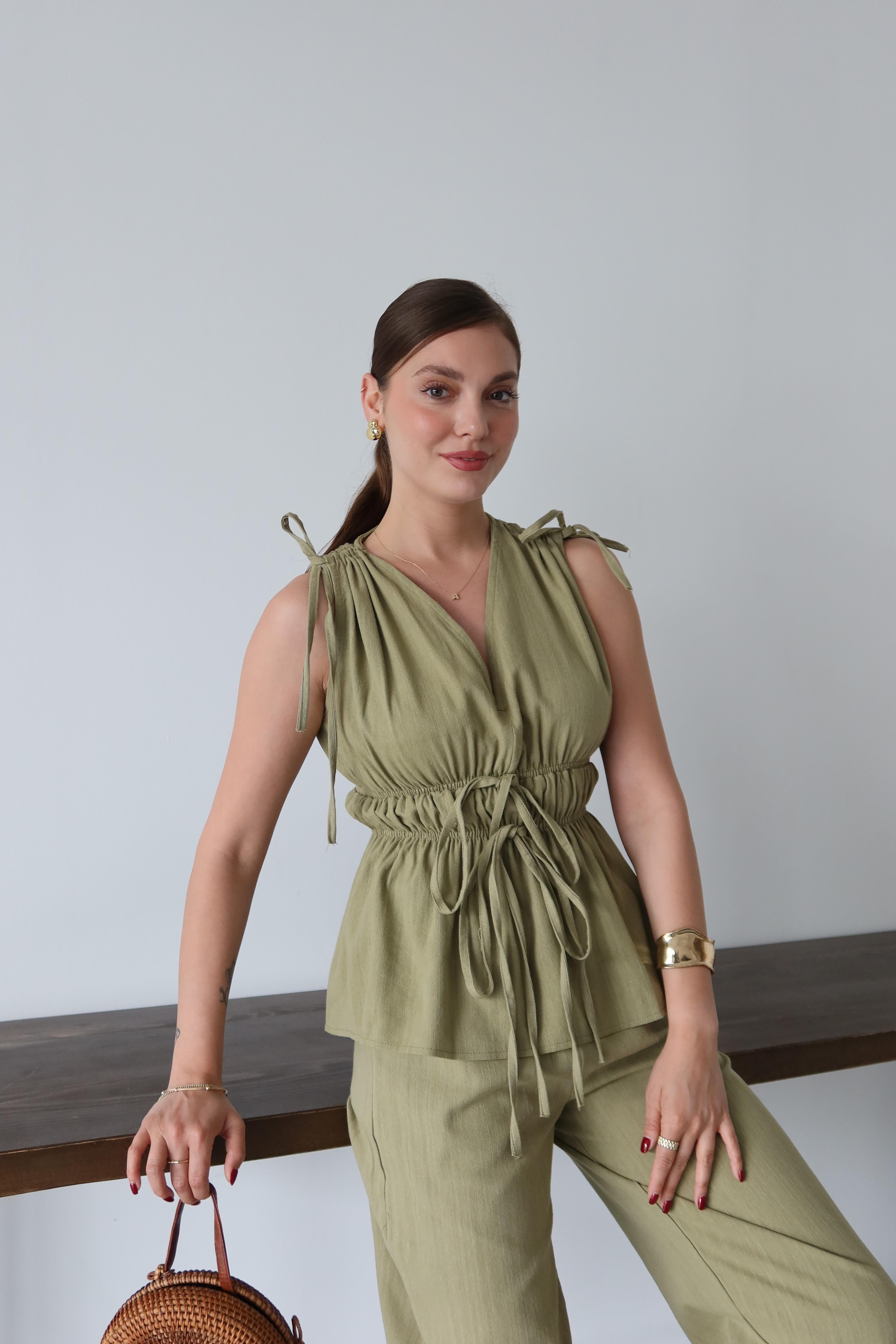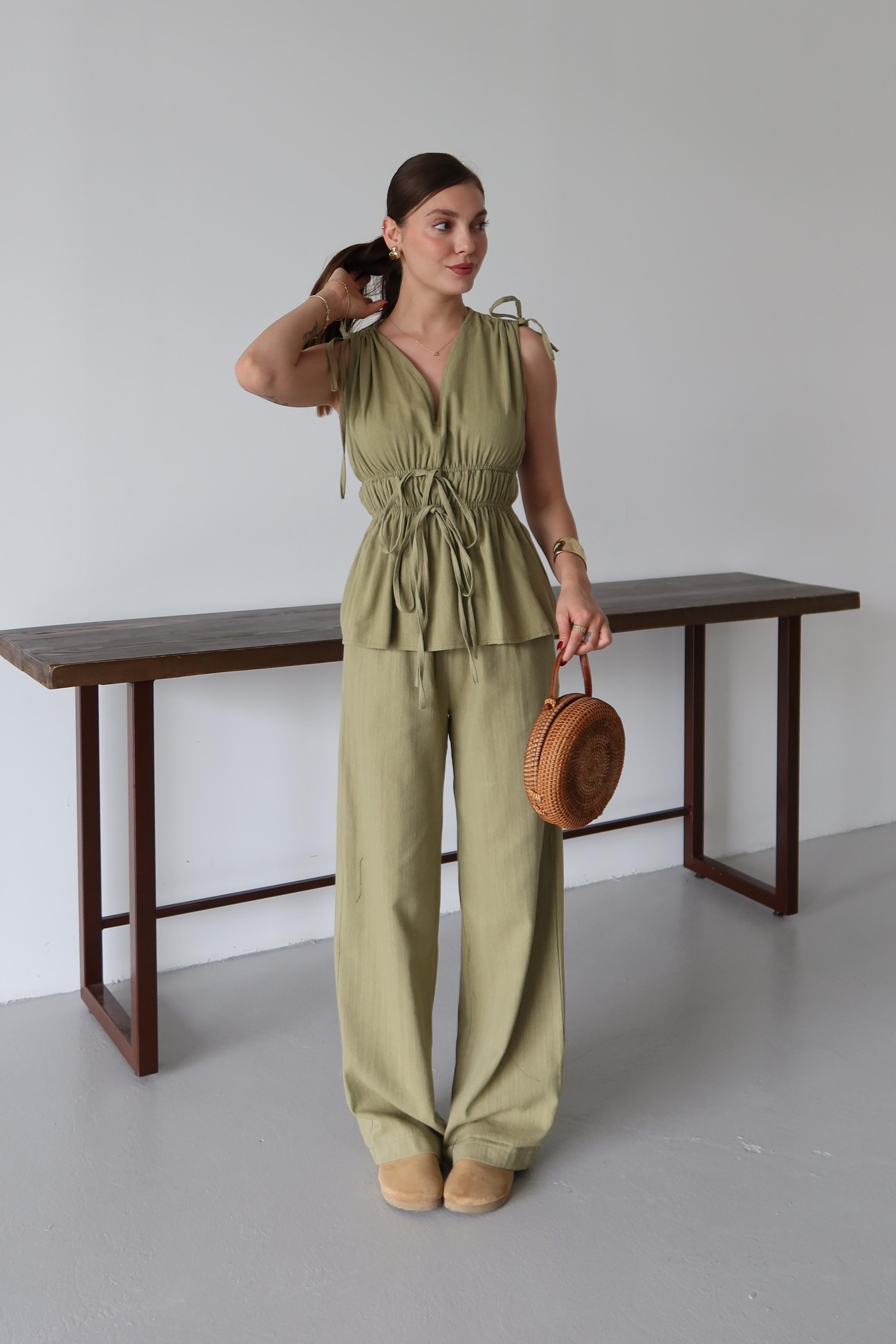 - Çağla %100 Pamuk Omuz Bel Büzgülü Bluz Pantolon Takım