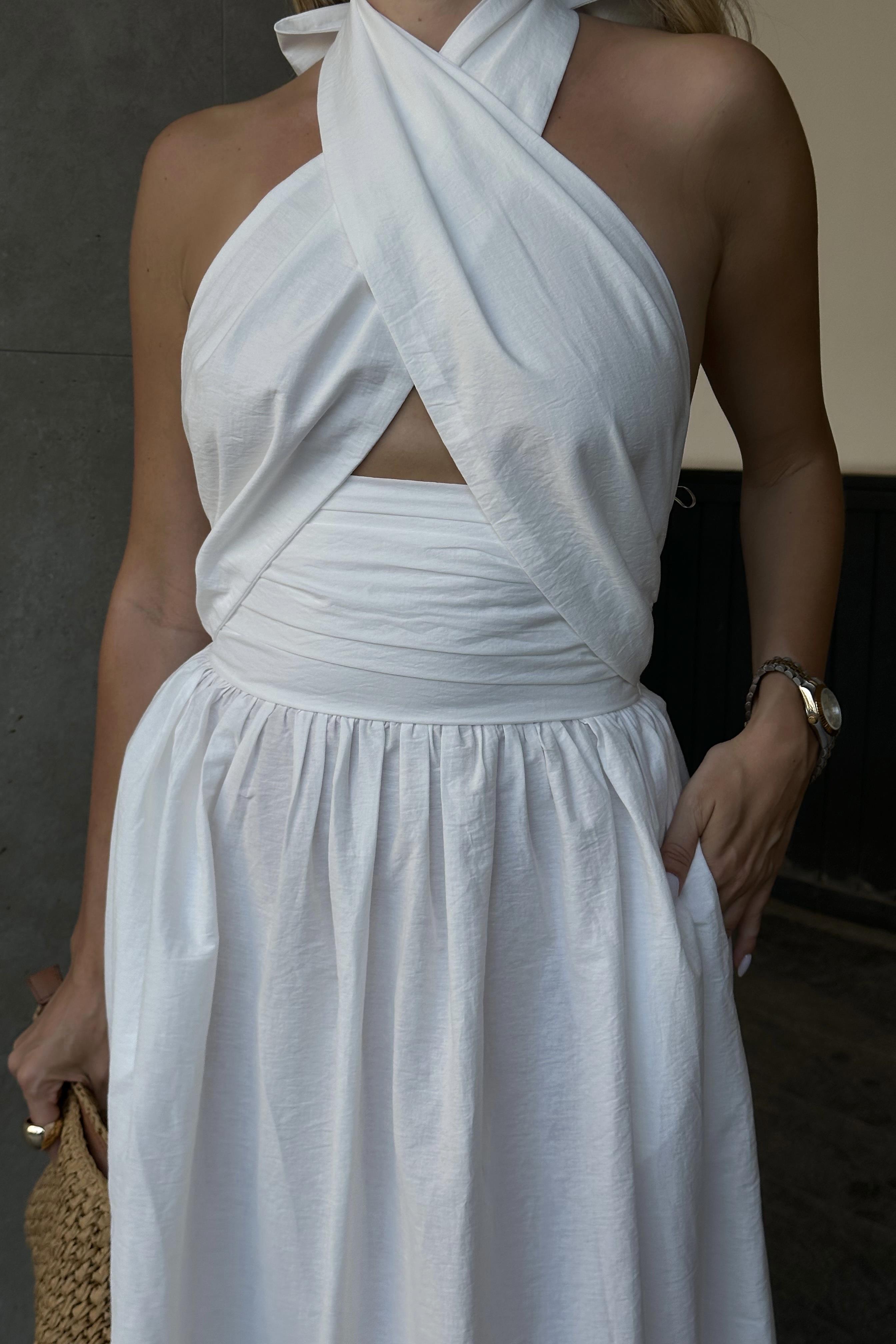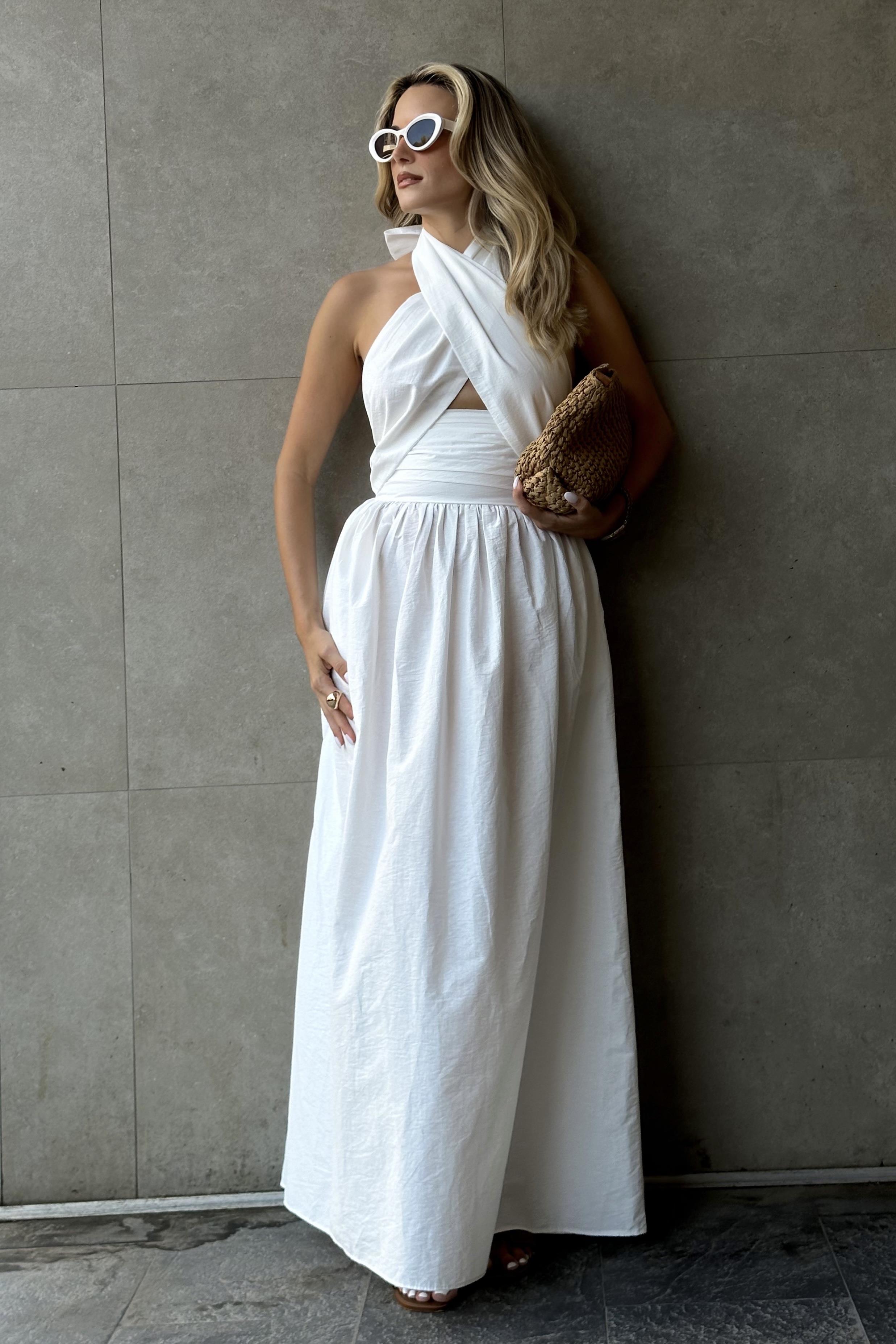 Ekru Boyundan Bağlamalı Tasarım Elbise