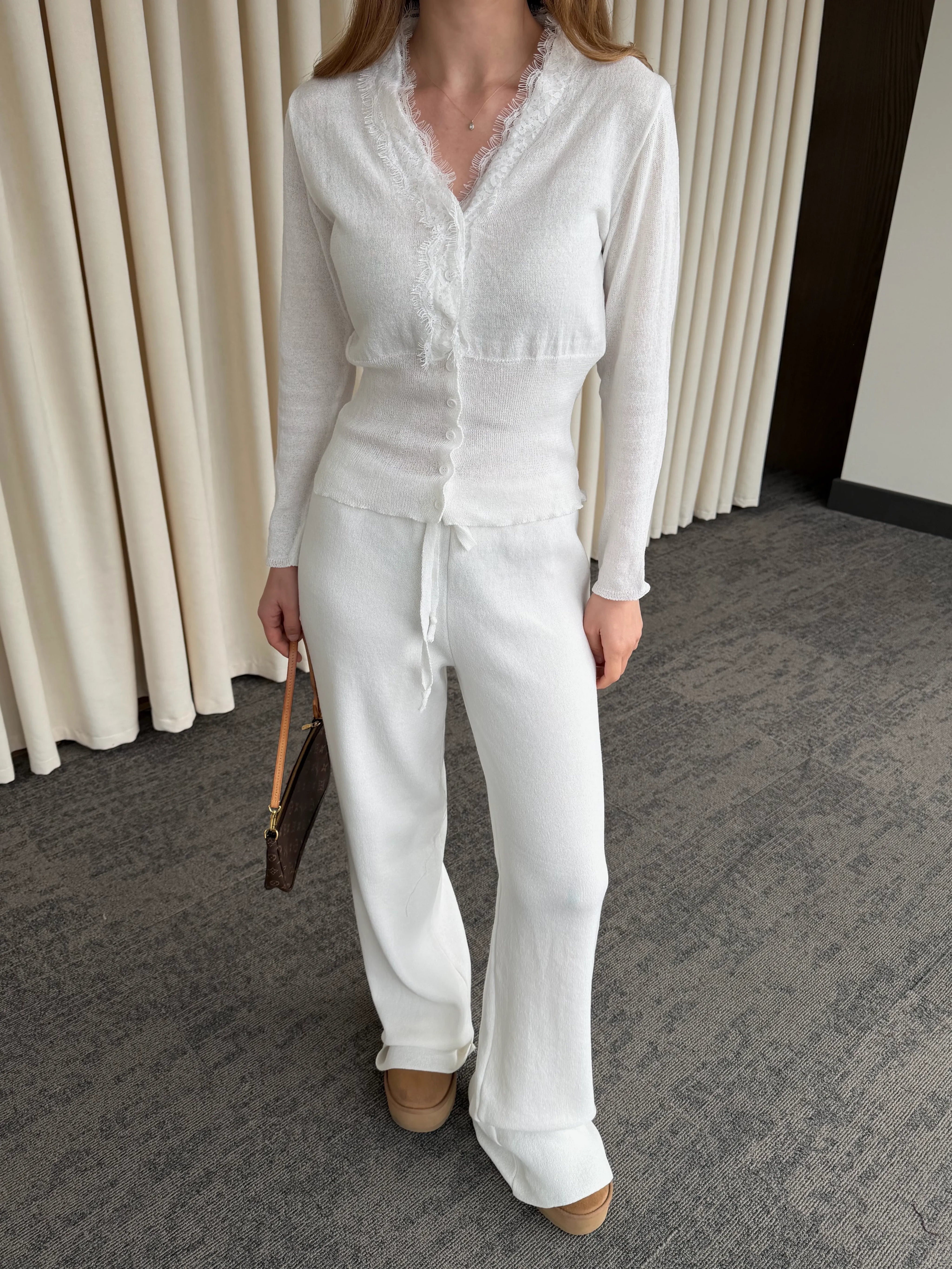 Yumuşak dokusu ve akışkan formuyla gün boyu rahat bir şıklık sunan bu takım, konforu stil ile buluşturuyor. Üst parçadaki zarif dantel detayları ve ince düğme tasarımı feminen bir hava katarken, hafif oturan kalıbı silueti dengeli gösterir.