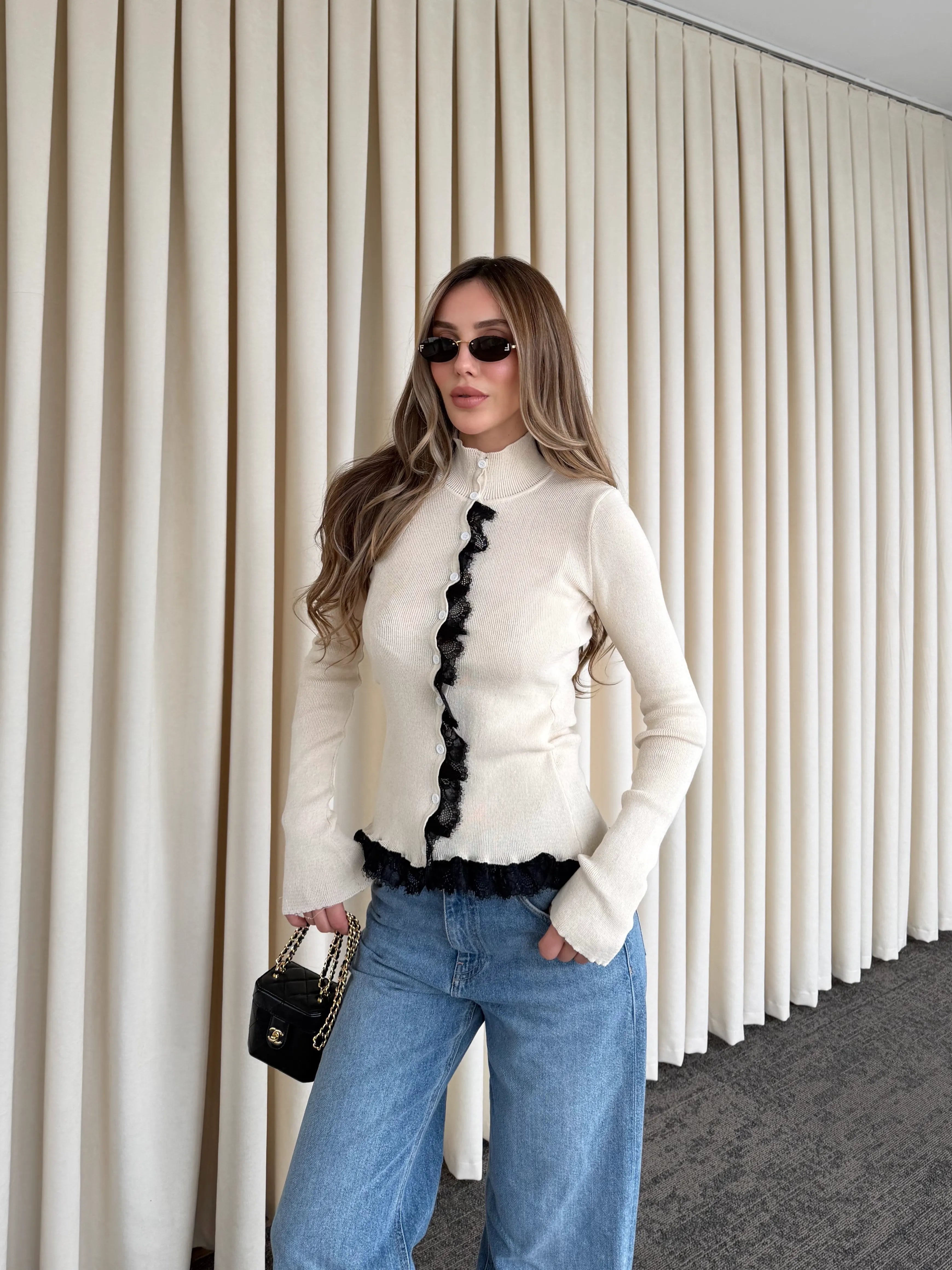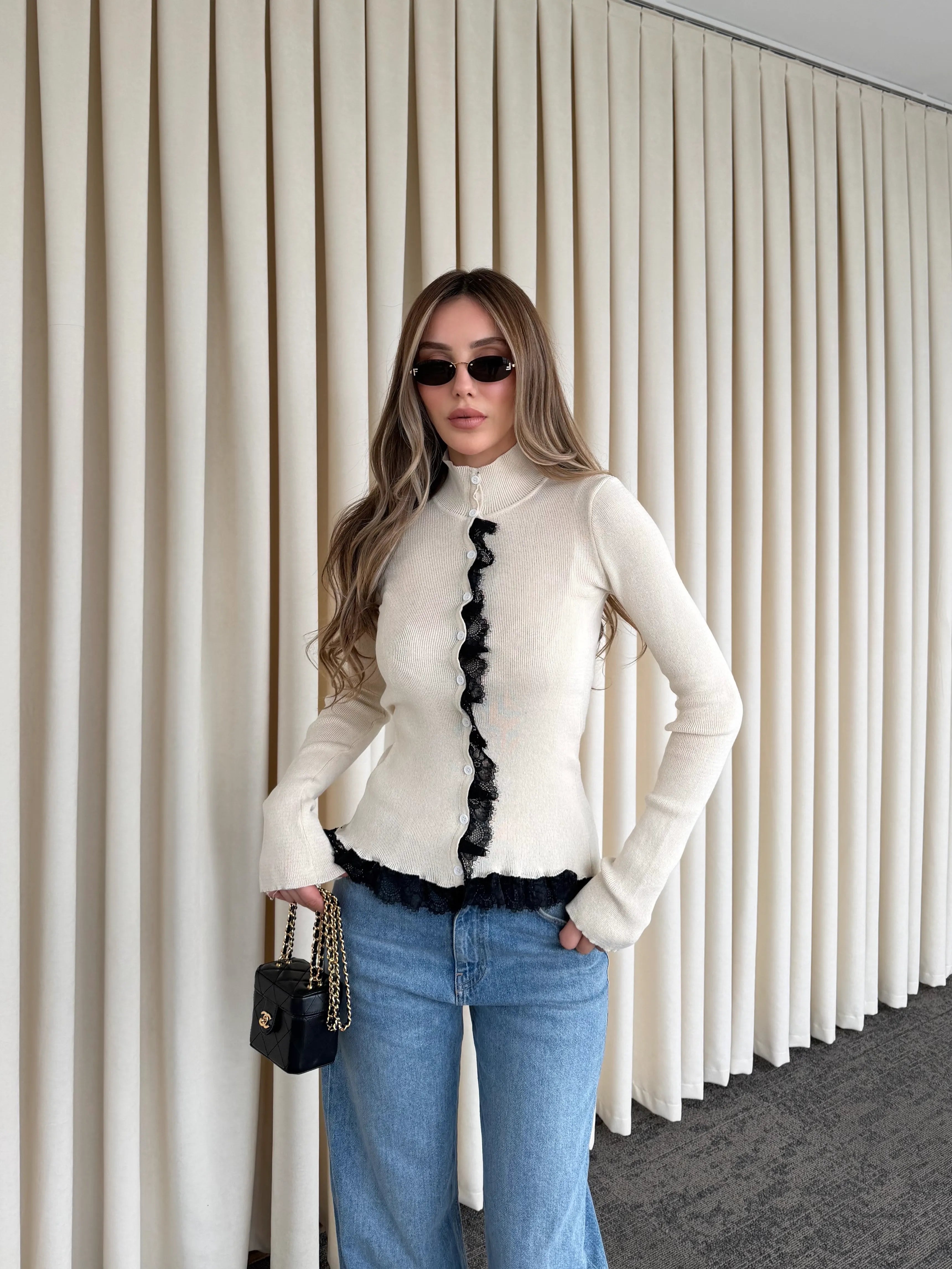 Önden boydan boya uzanan dantel şerit detayı, hırkaya feminen ve iddialı bir karakter kazandırırken klasik triko formuna modern bir dokunuş katıyor. İnce yapısı sayesinde vücuda nazikçe oturur, düğmeli tasarımı ile ister açık ister kapalı kullanım imkânı sunar.