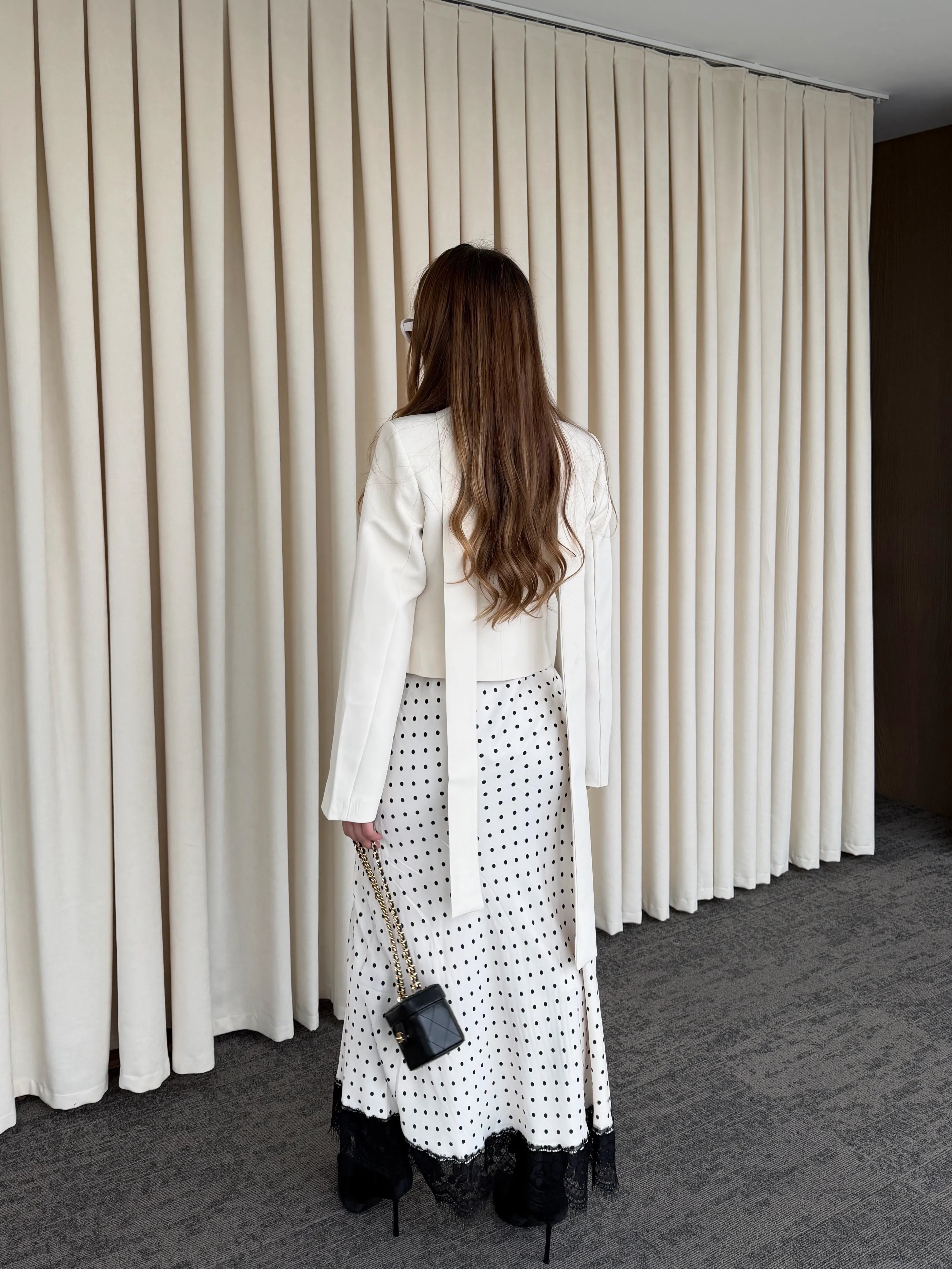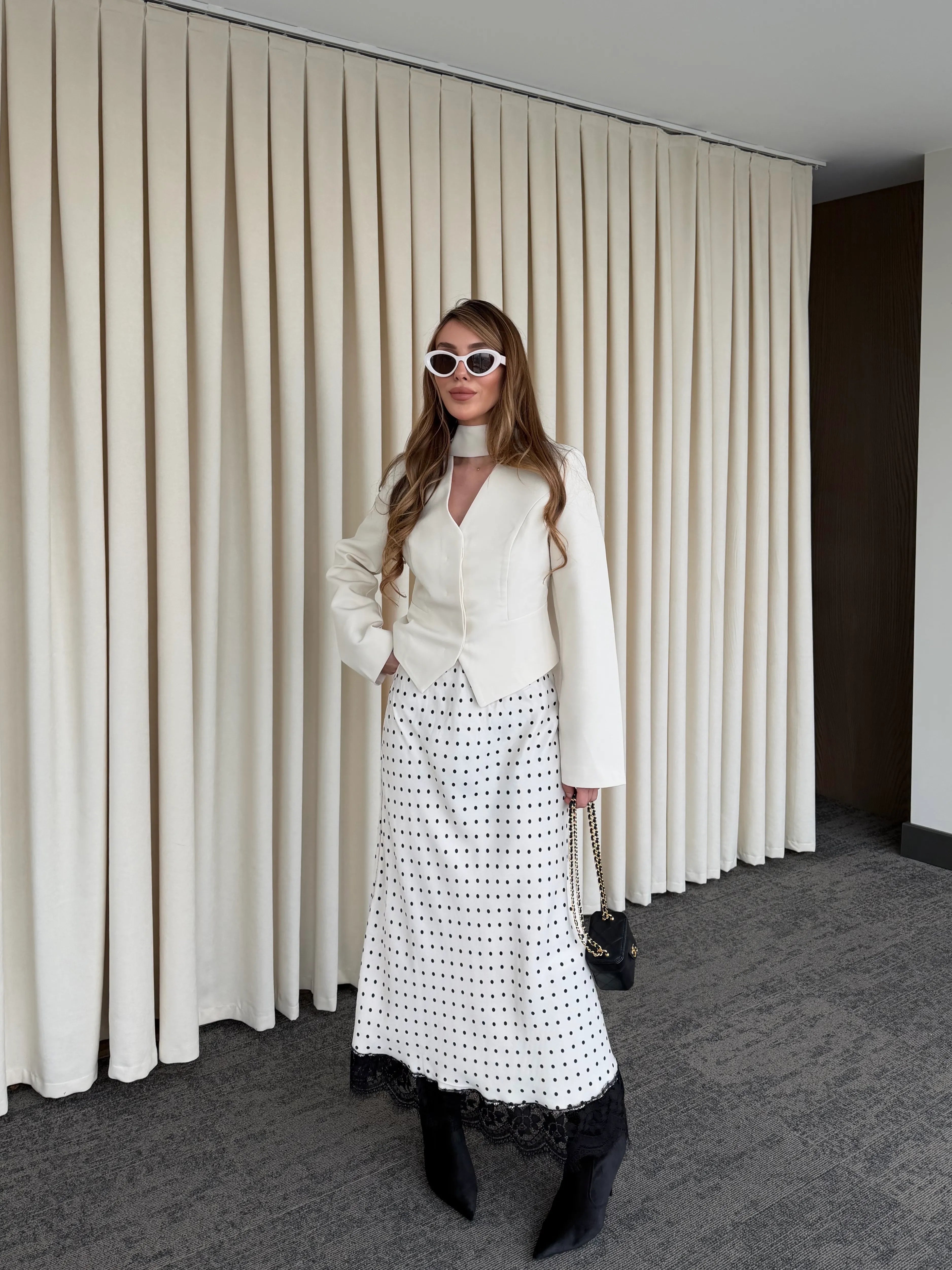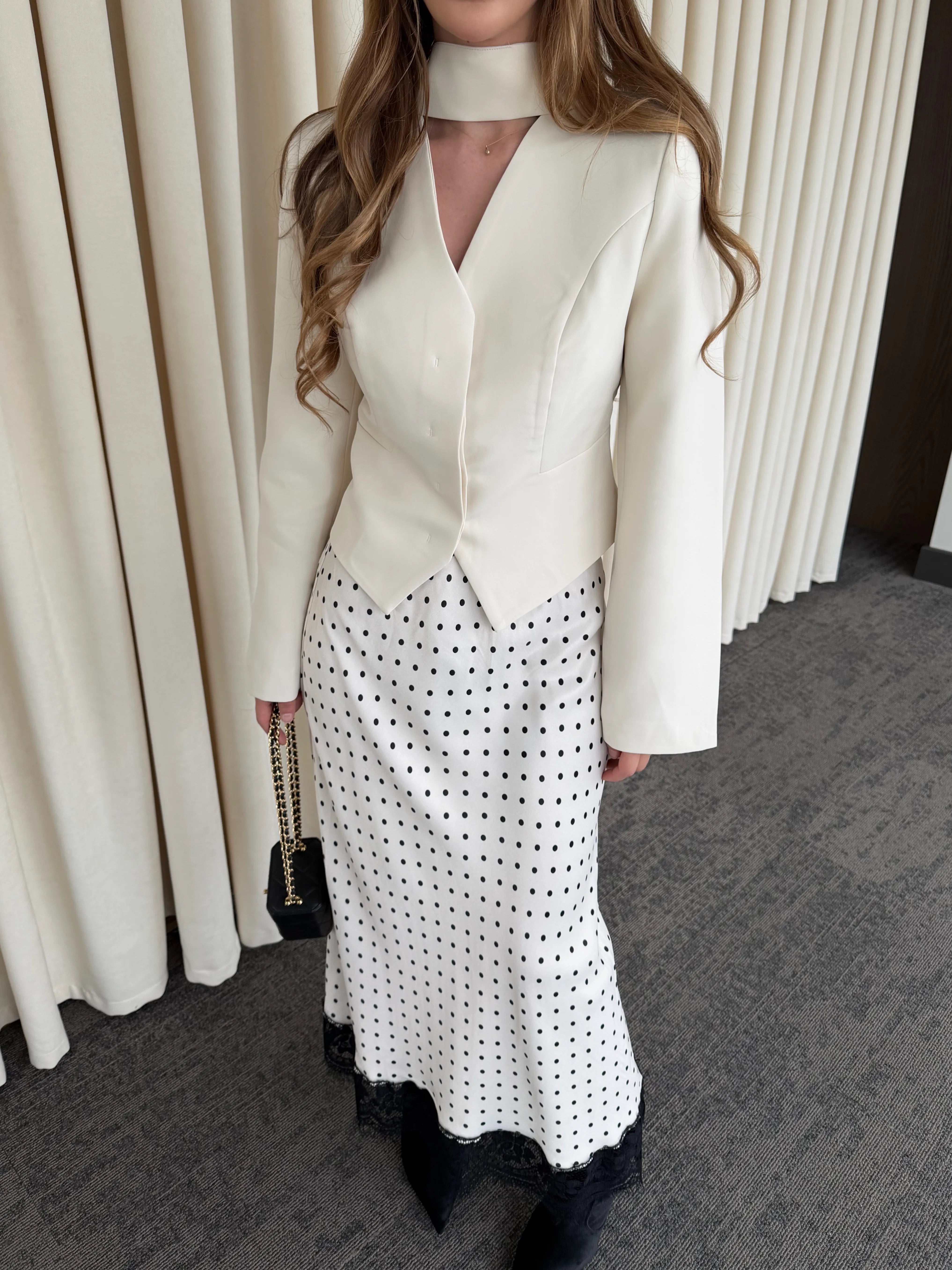 - Ekru Puantiyeli Saten Etek Ucu Dantelli Etek - 50228