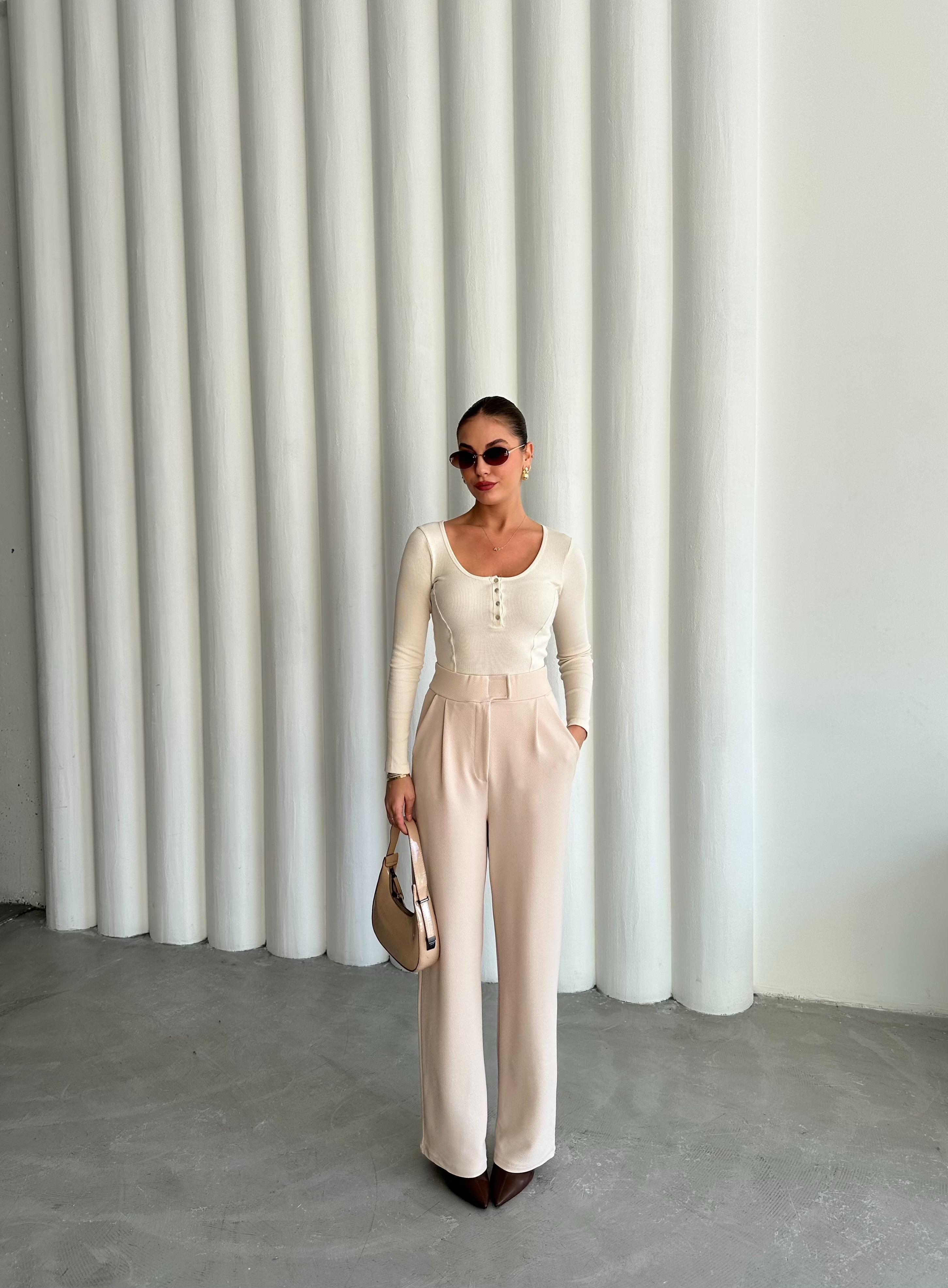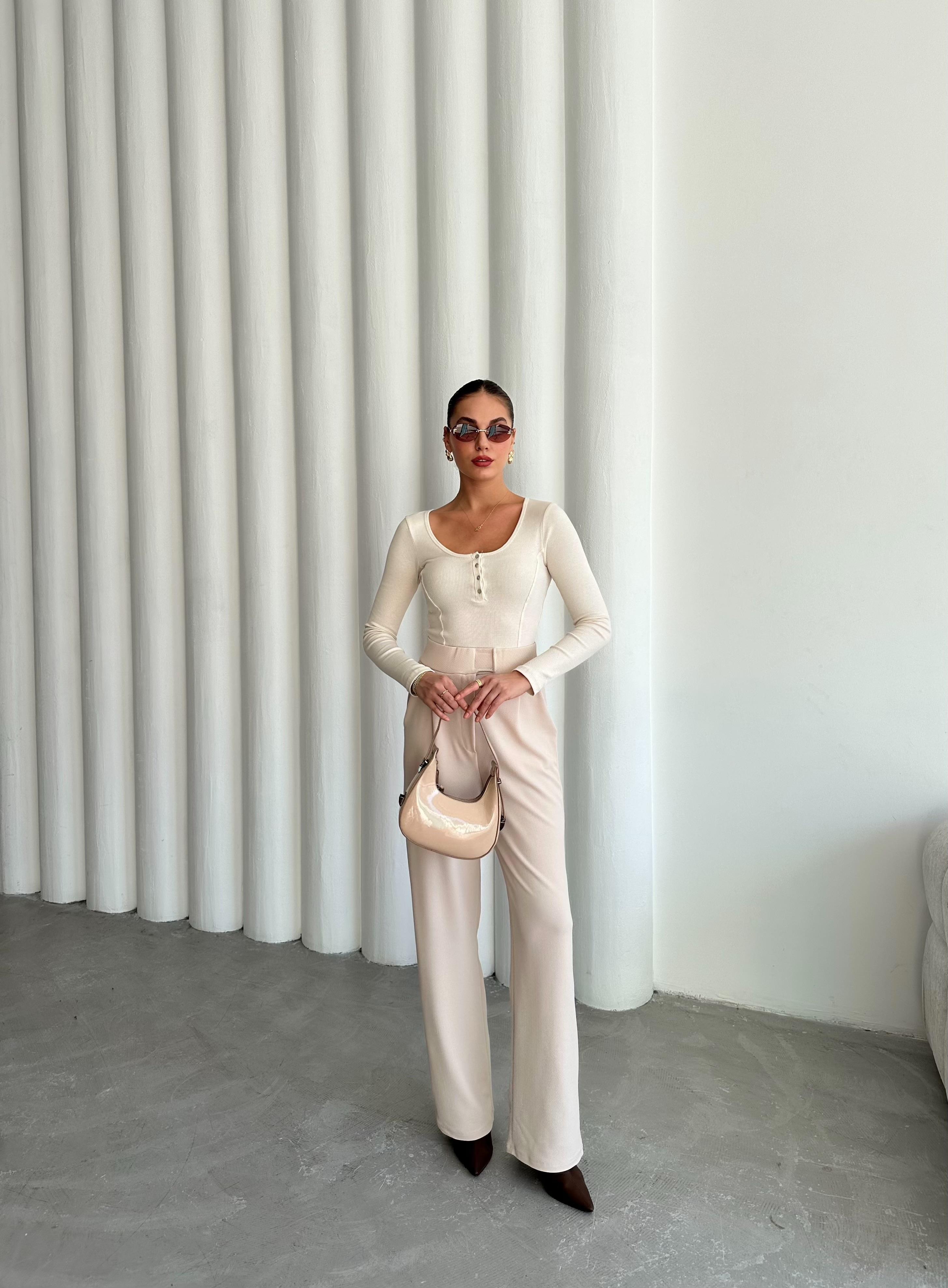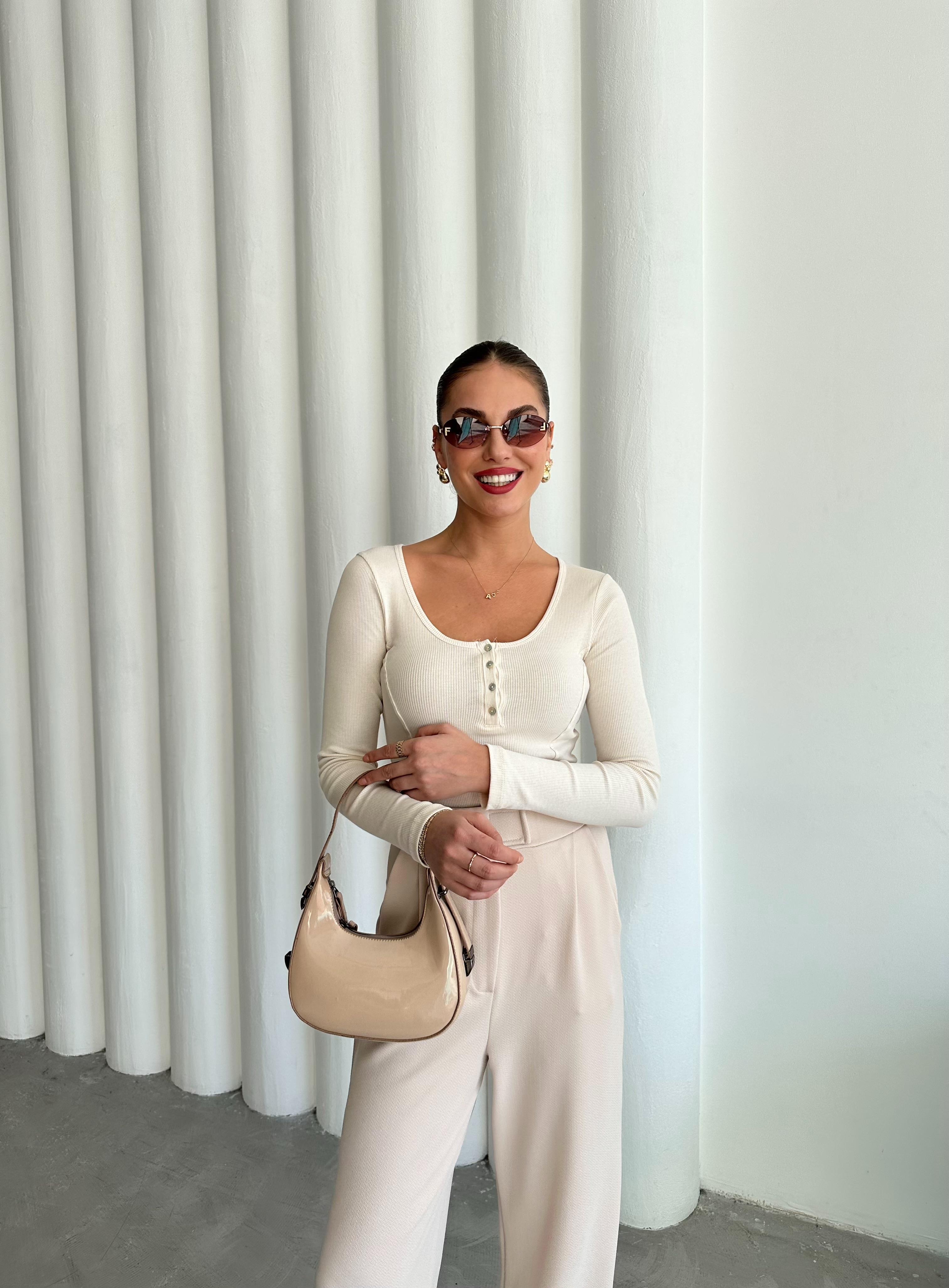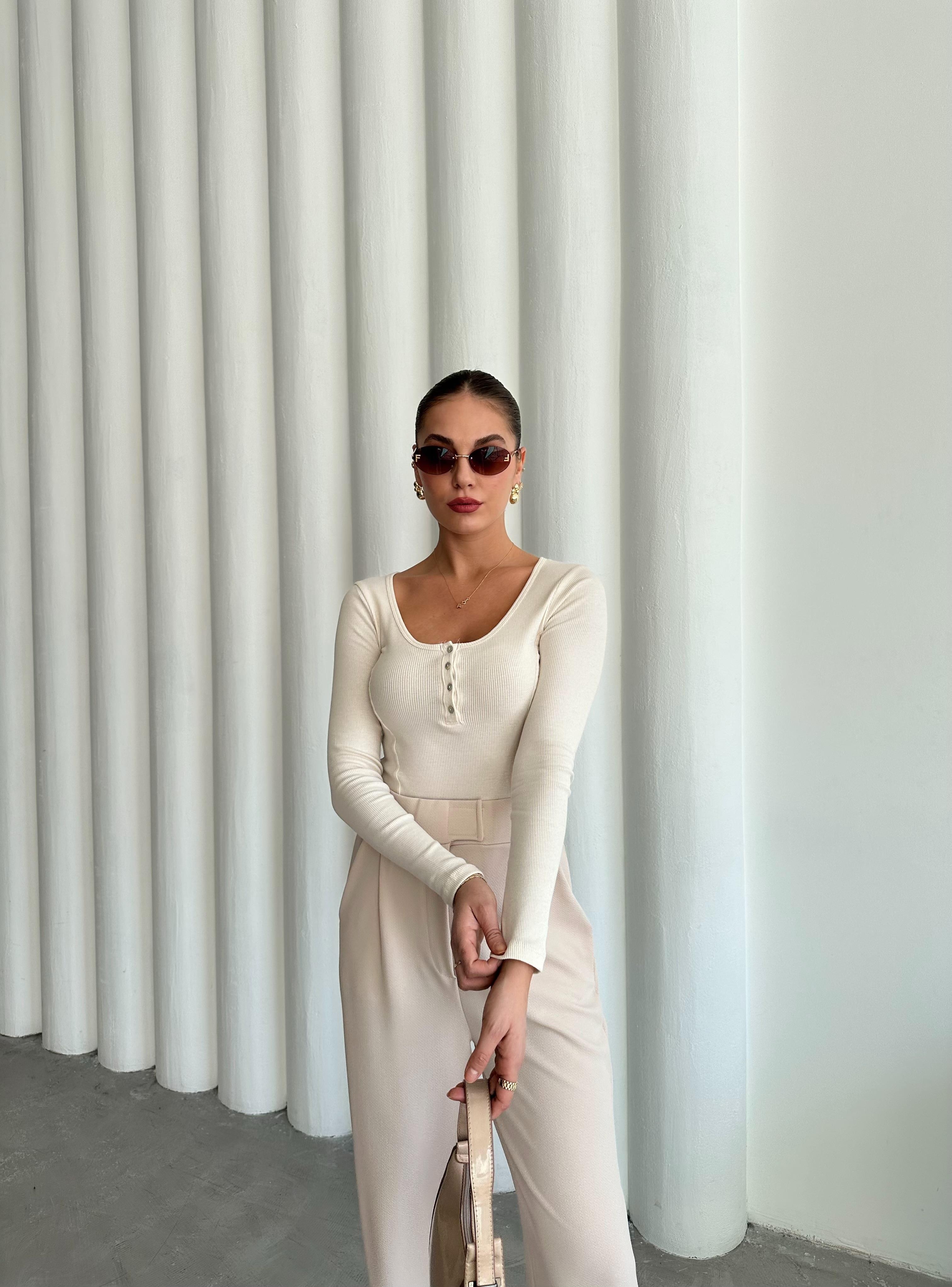 - Ekru Sedef Düğmeli Uzun Tshirt
