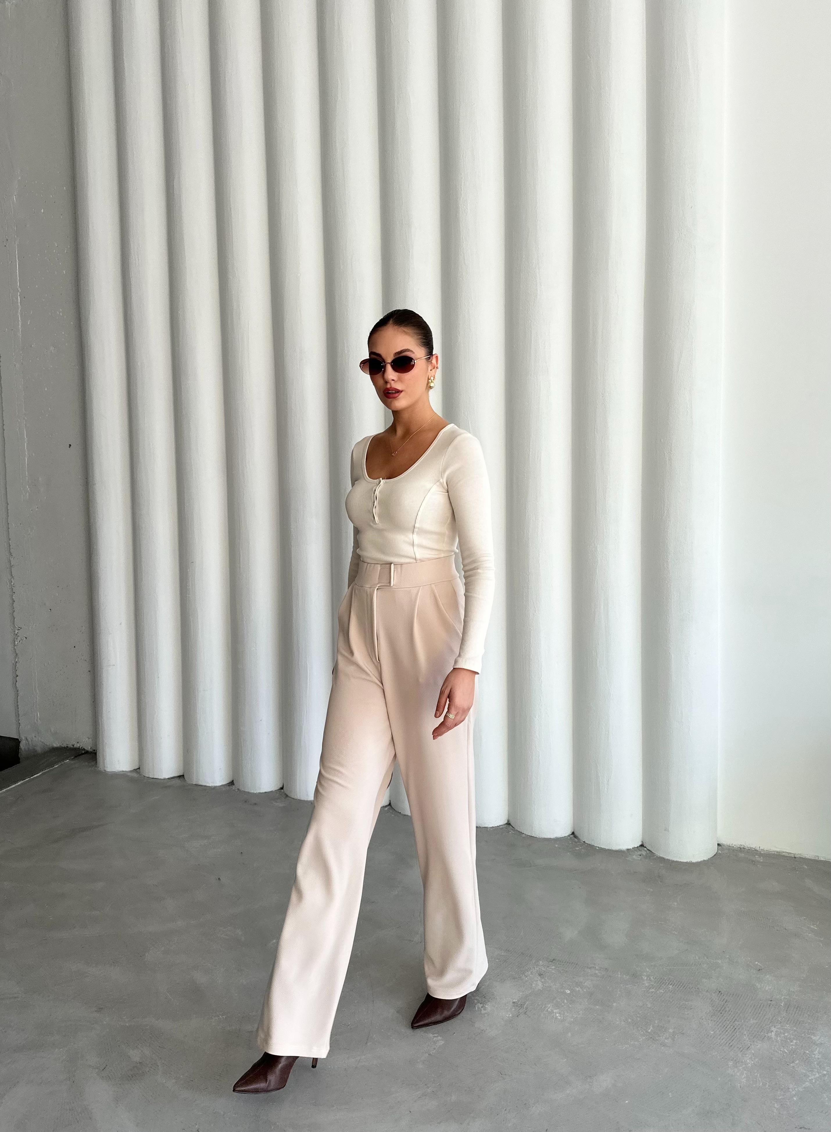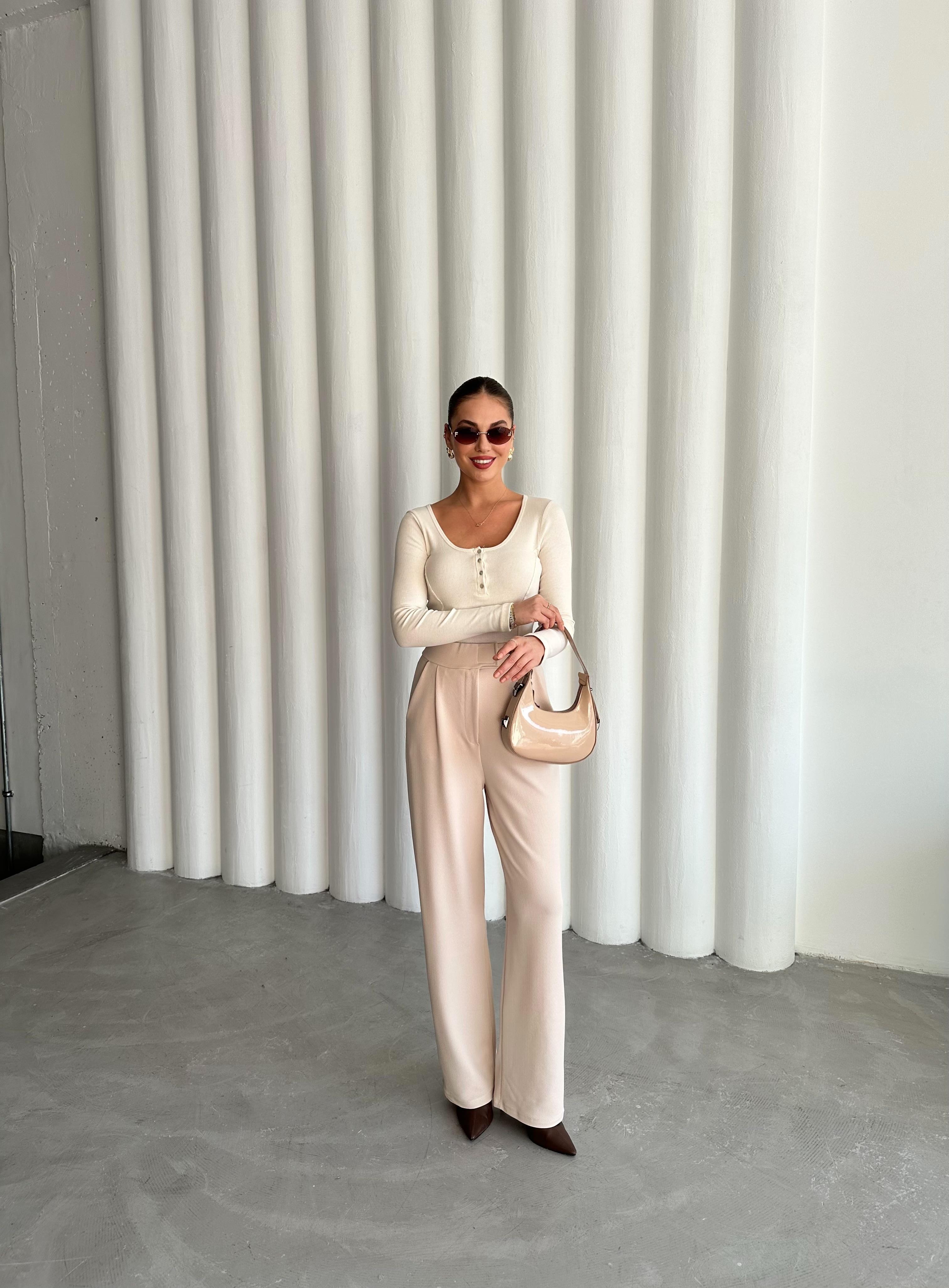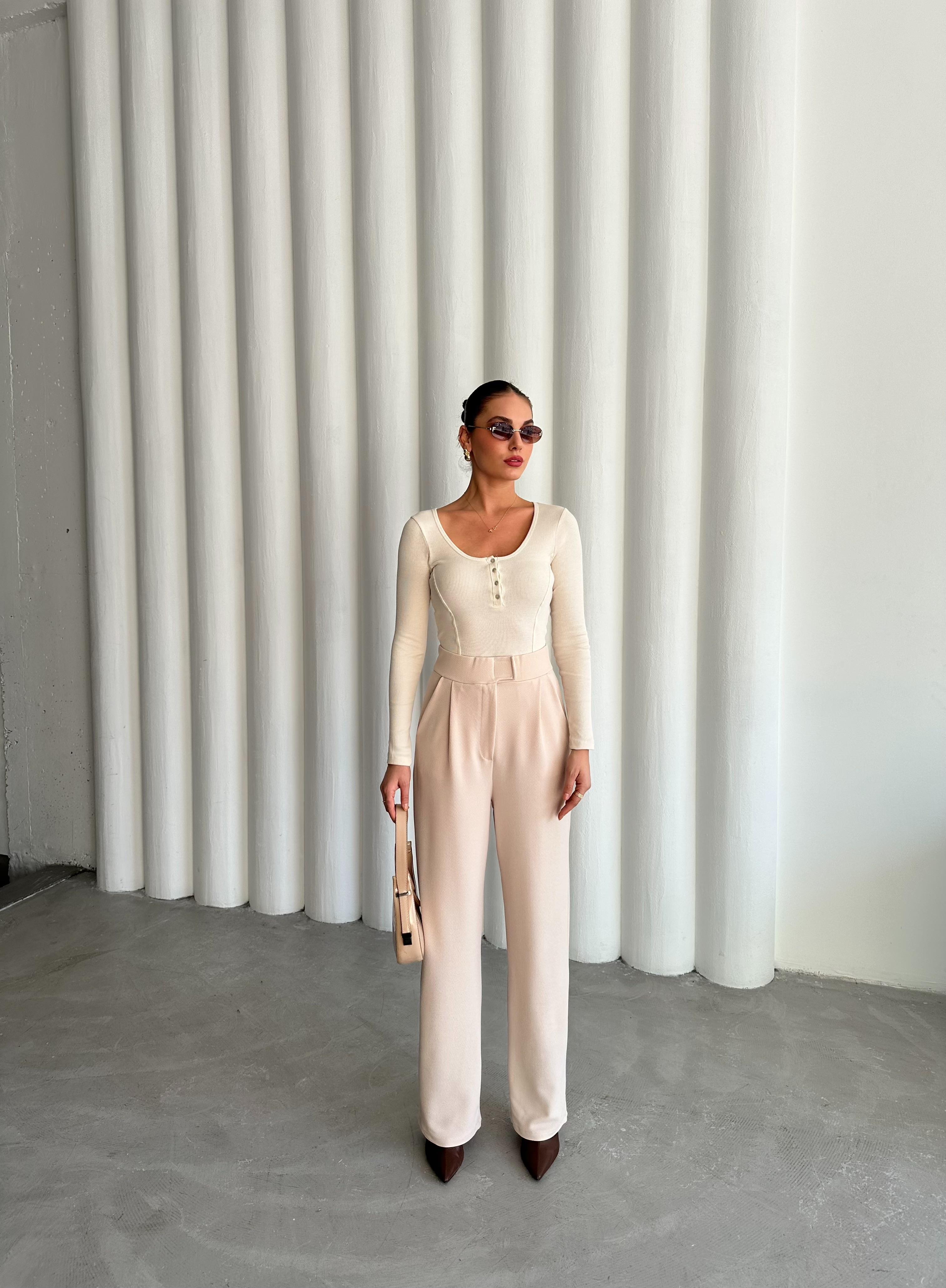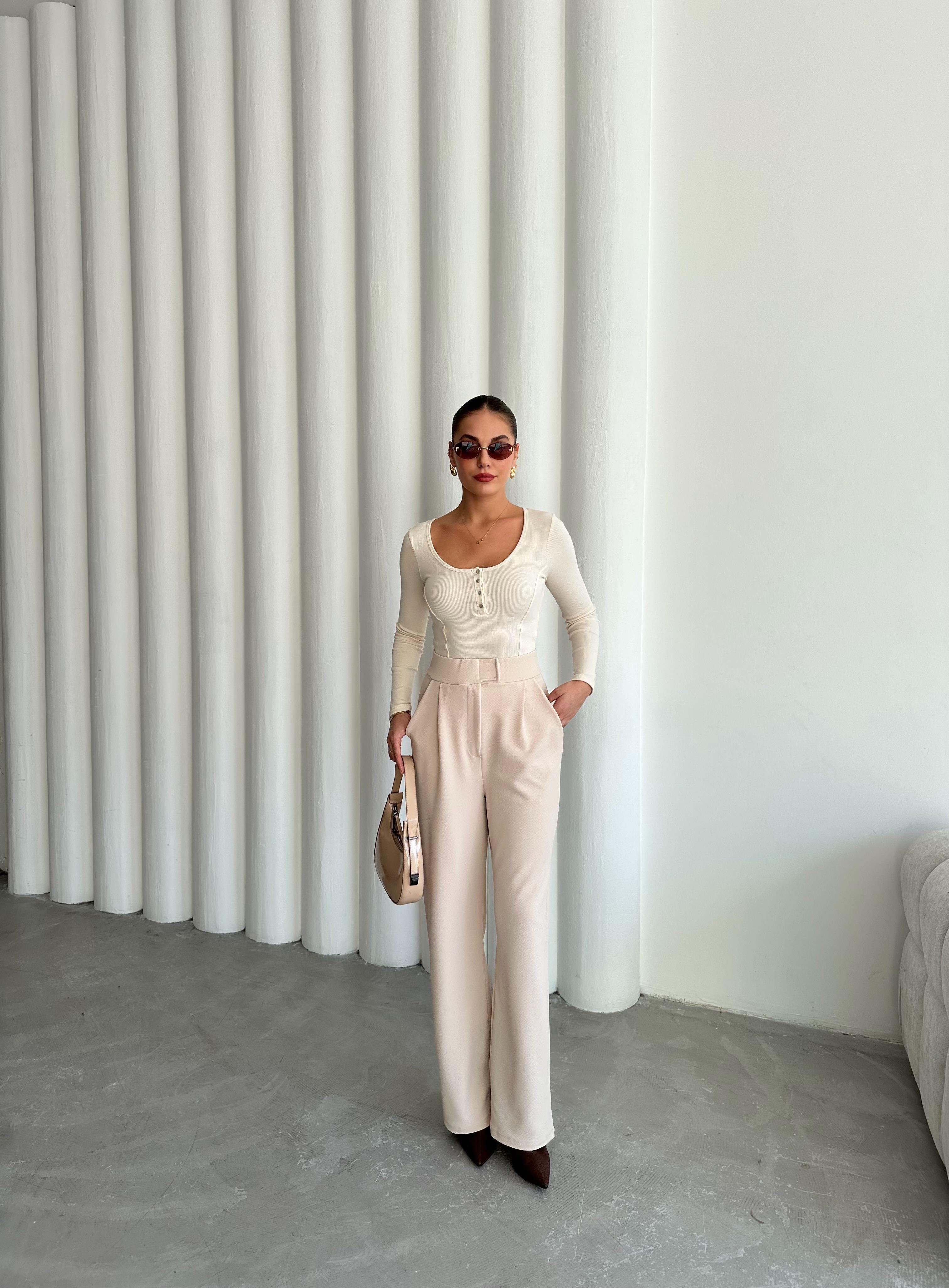 - Ekru Sedef Düğmeli Uzun Tshirt