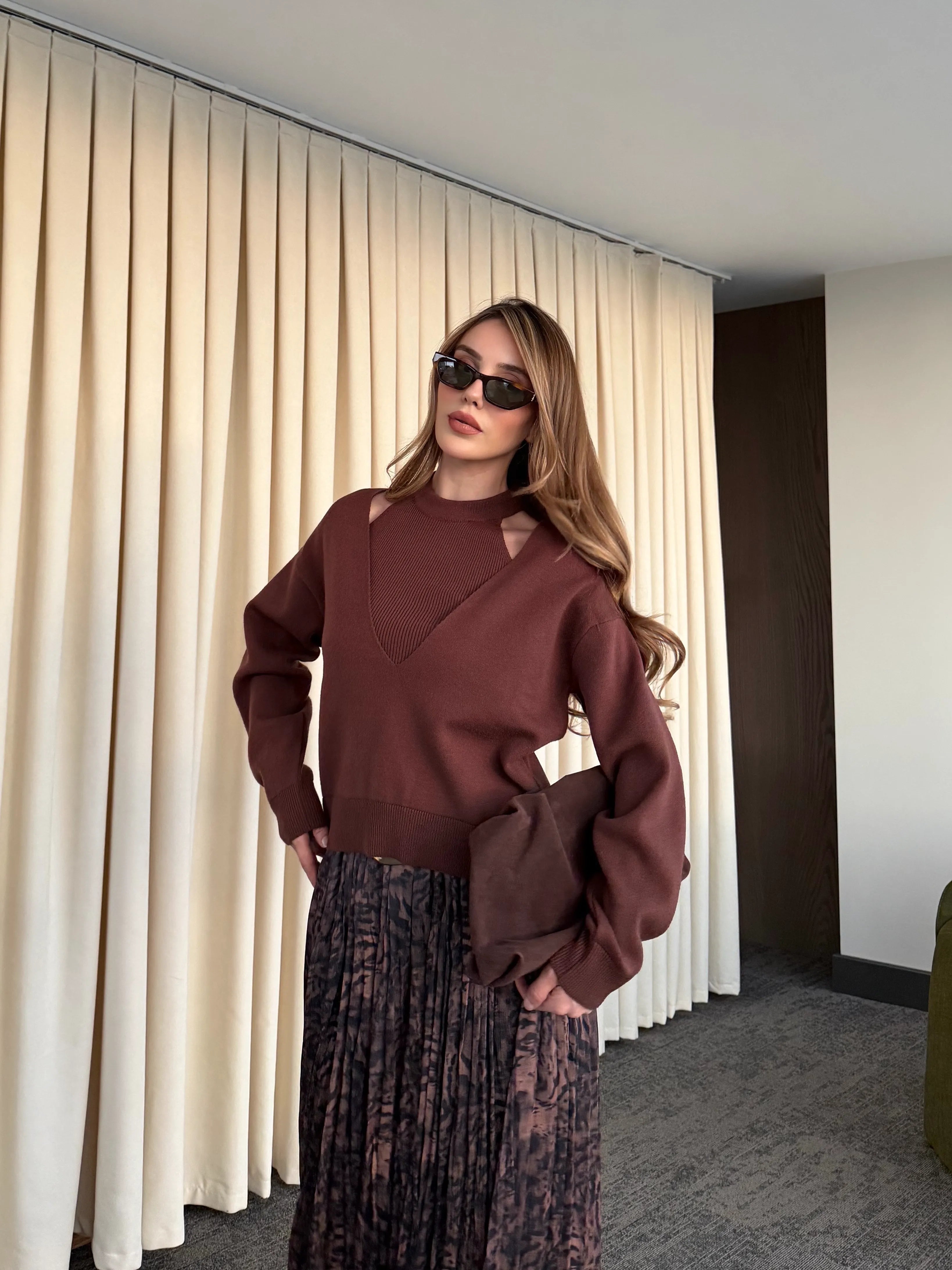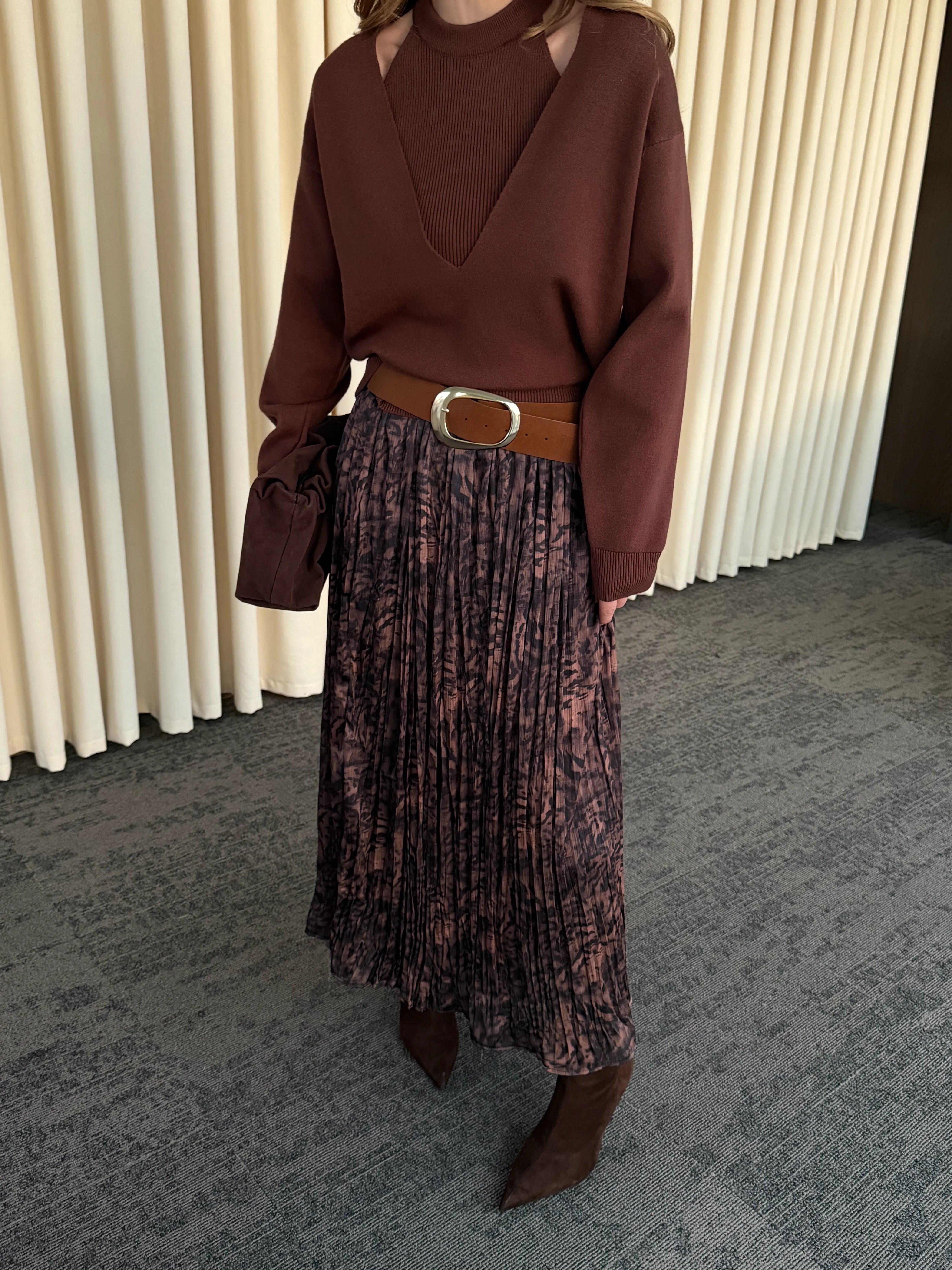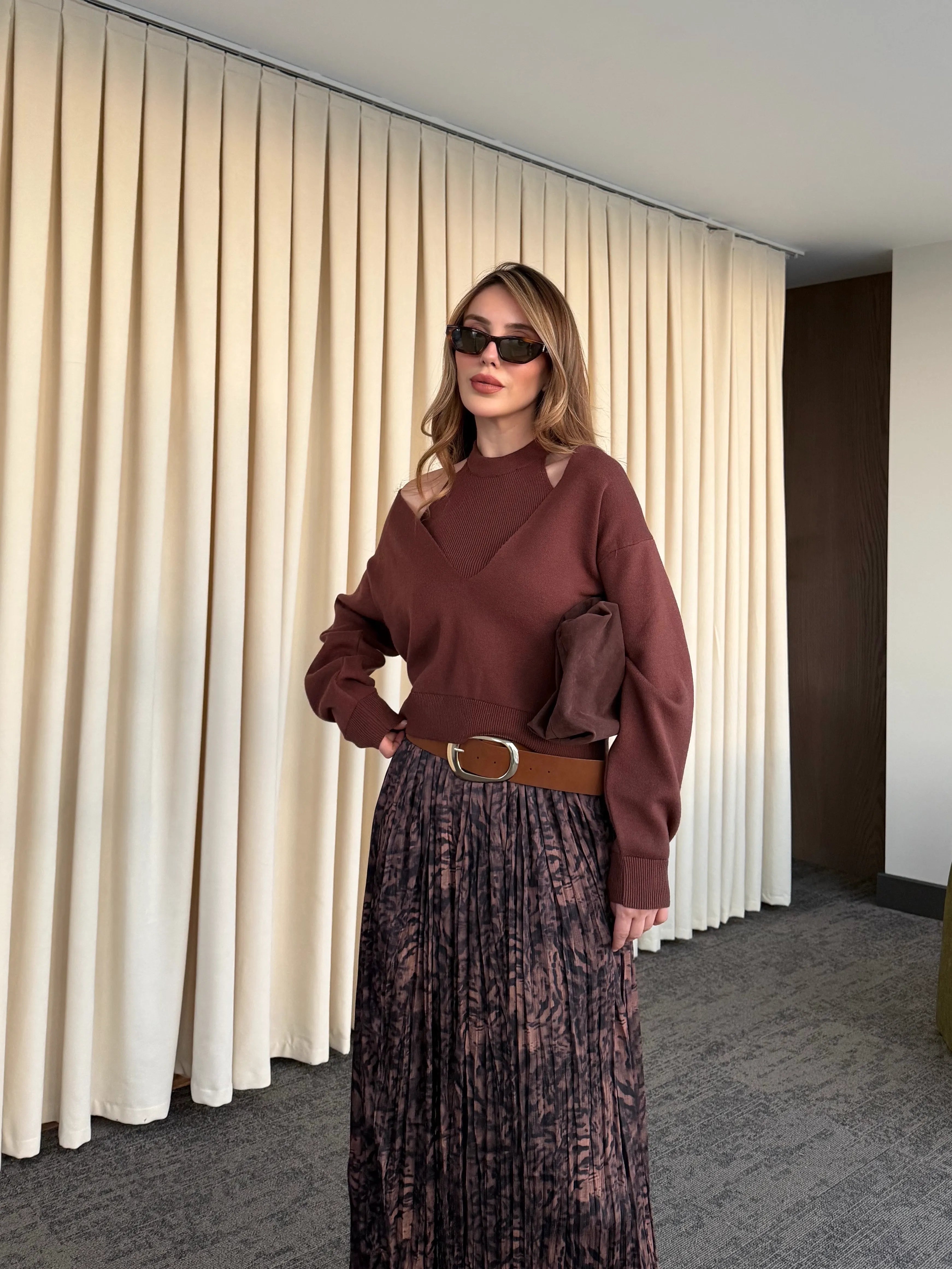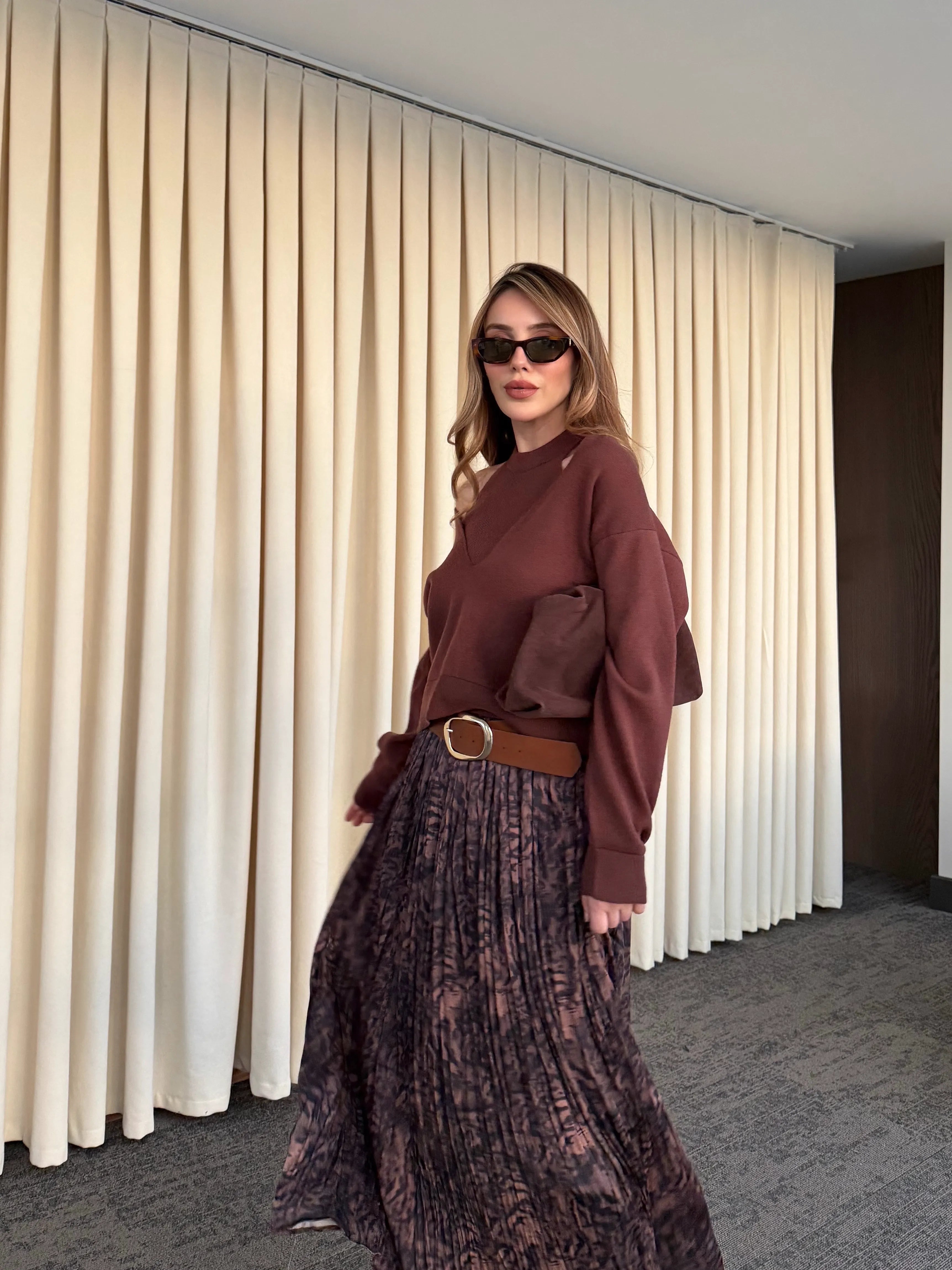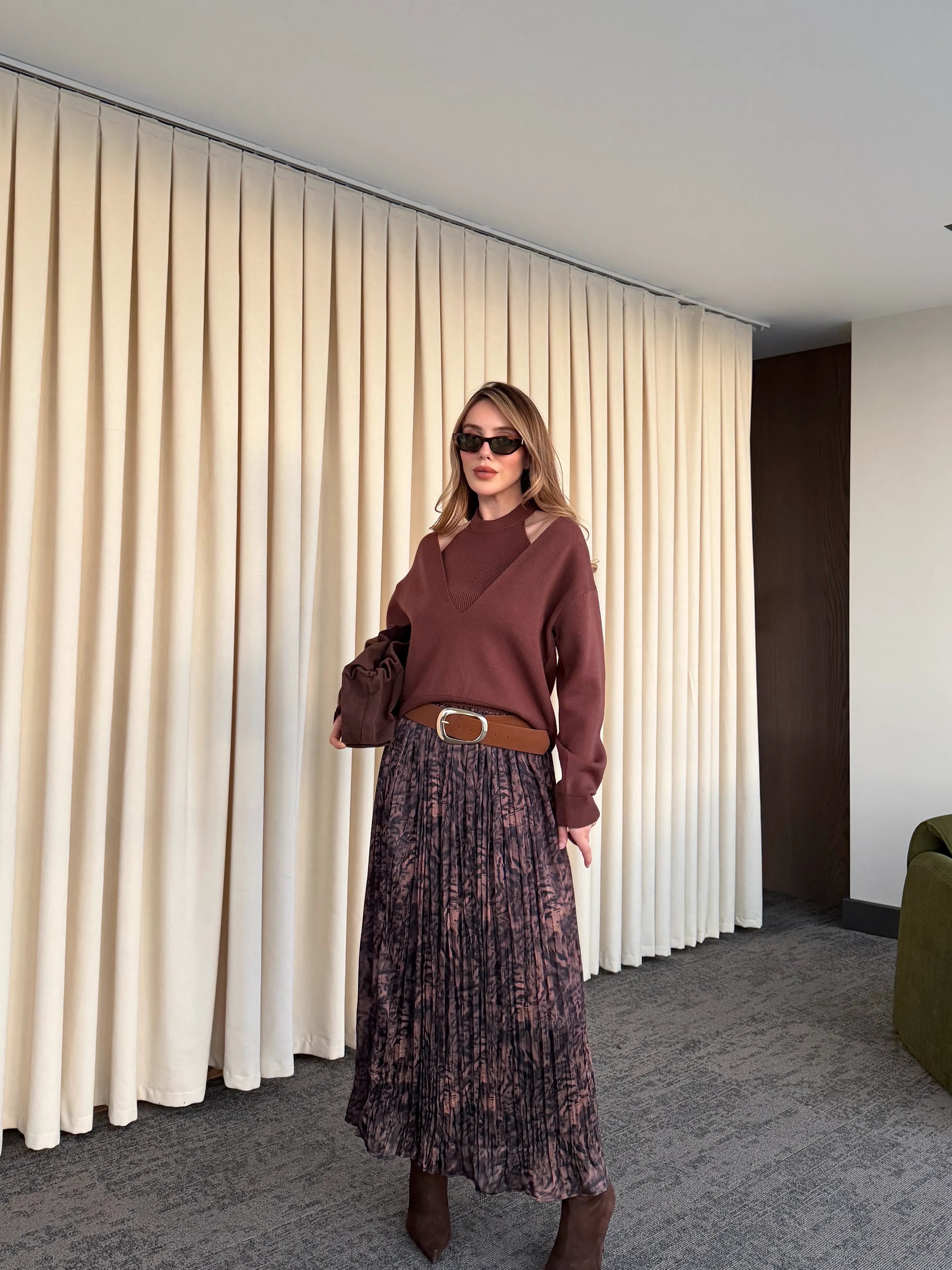- Kahverengi Piliseli Beli Lastikli Kemerli Etek - 3375