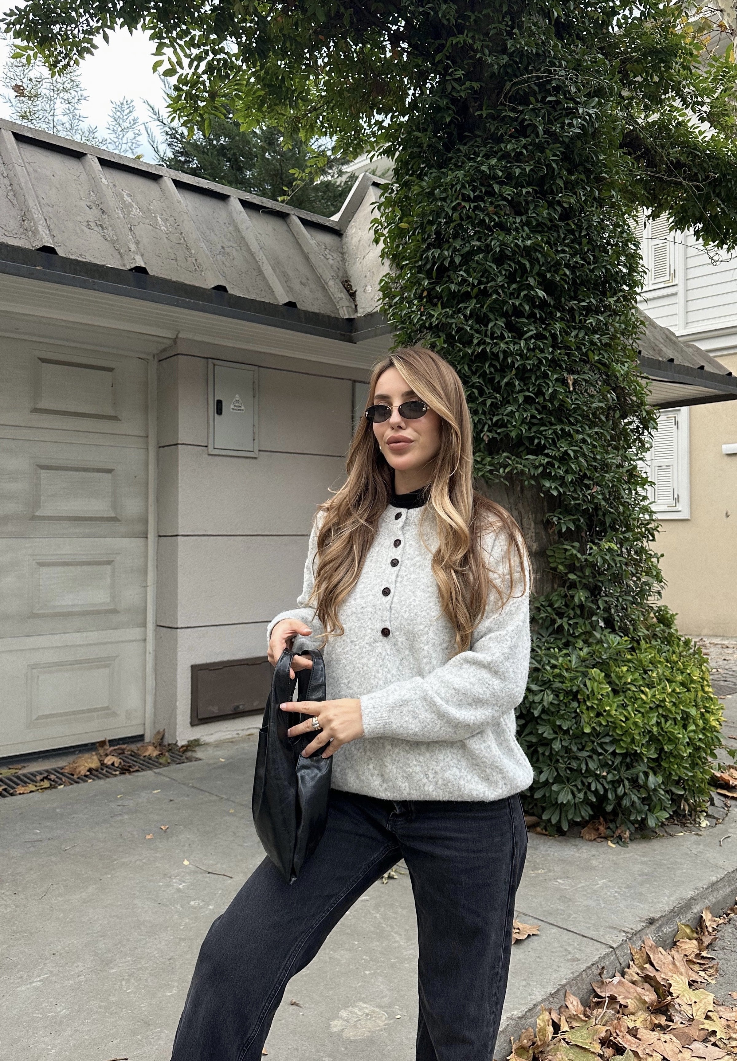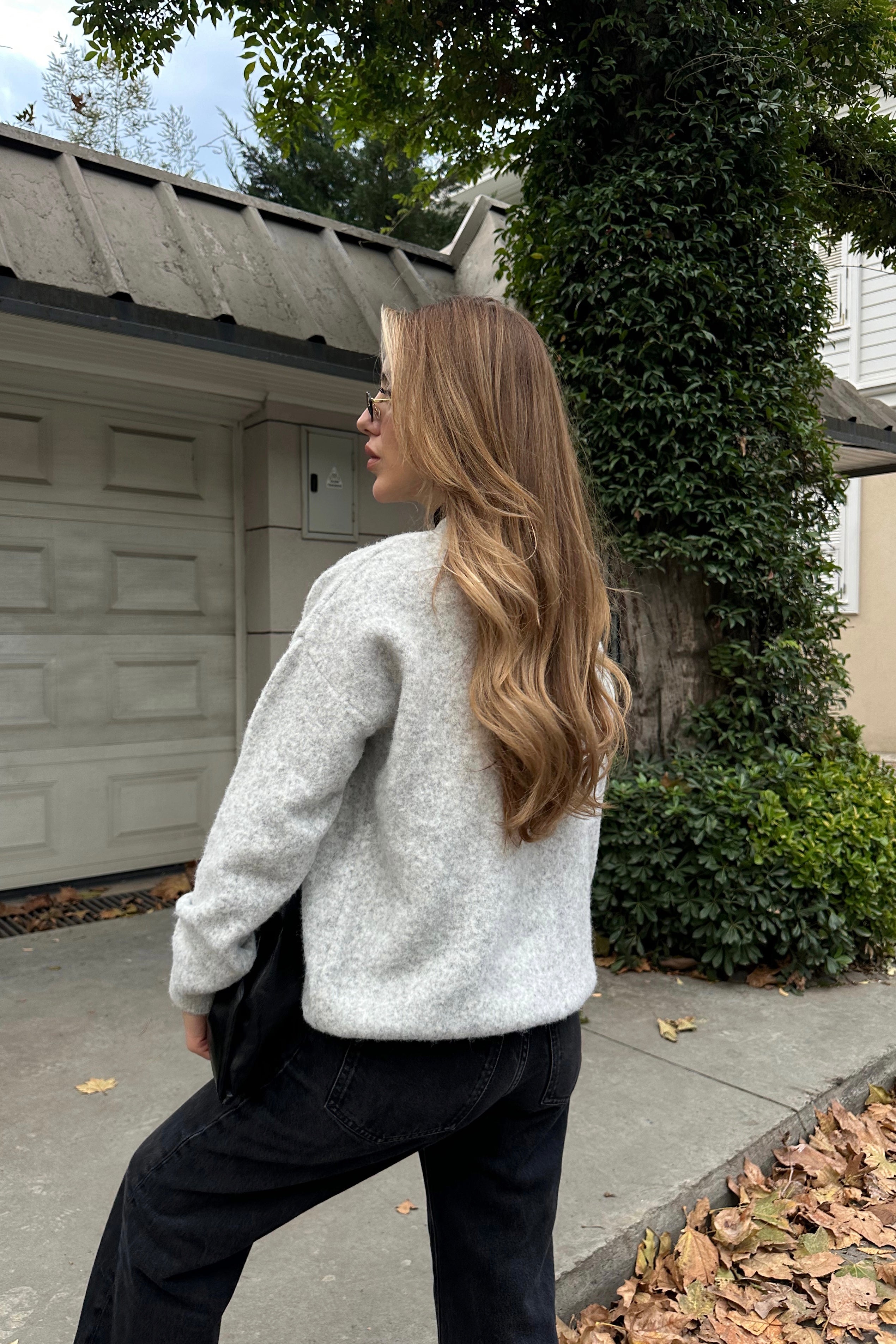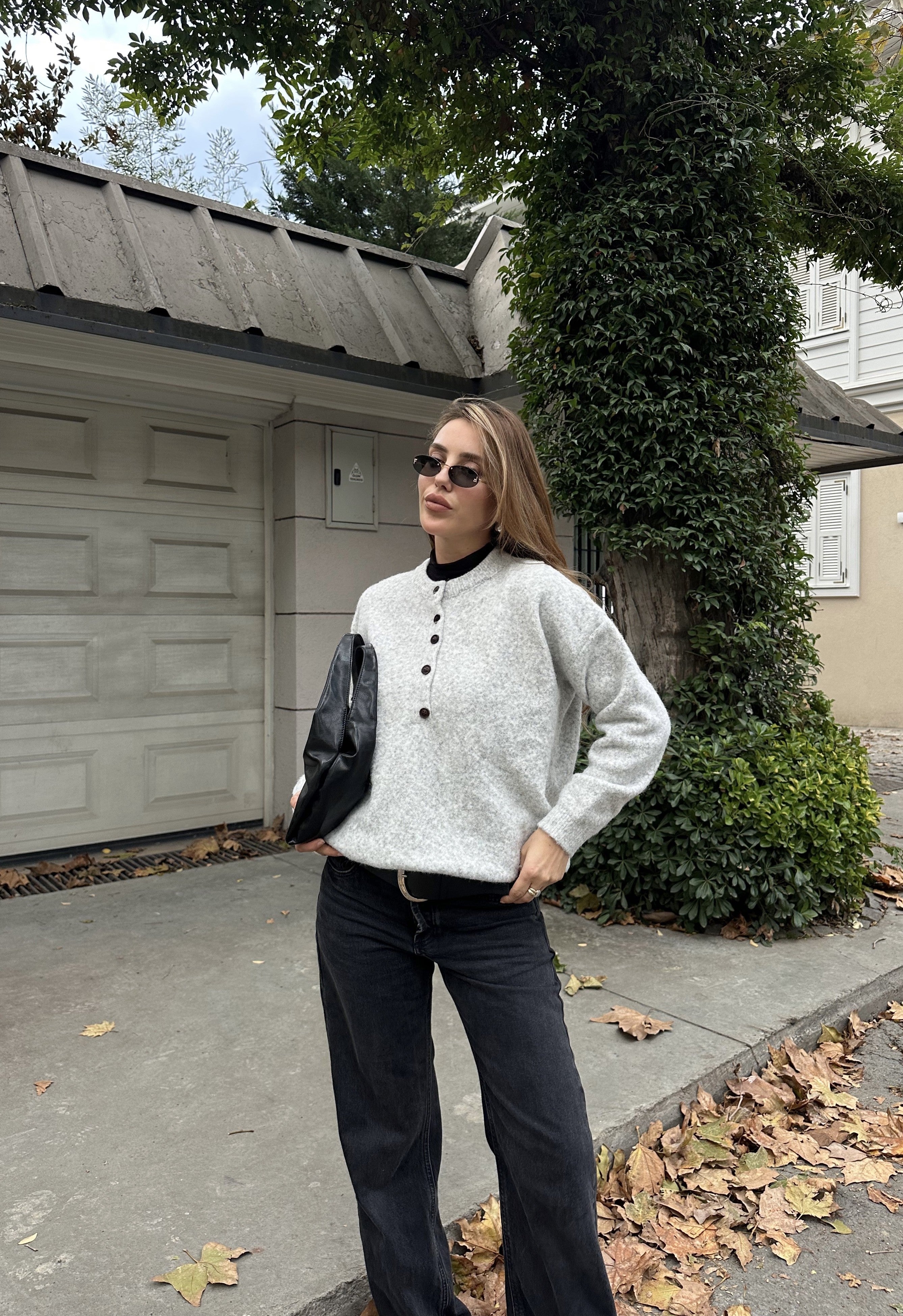 - Gri Düğmeli Bisiklet Yaka Triko Kazak - 2464