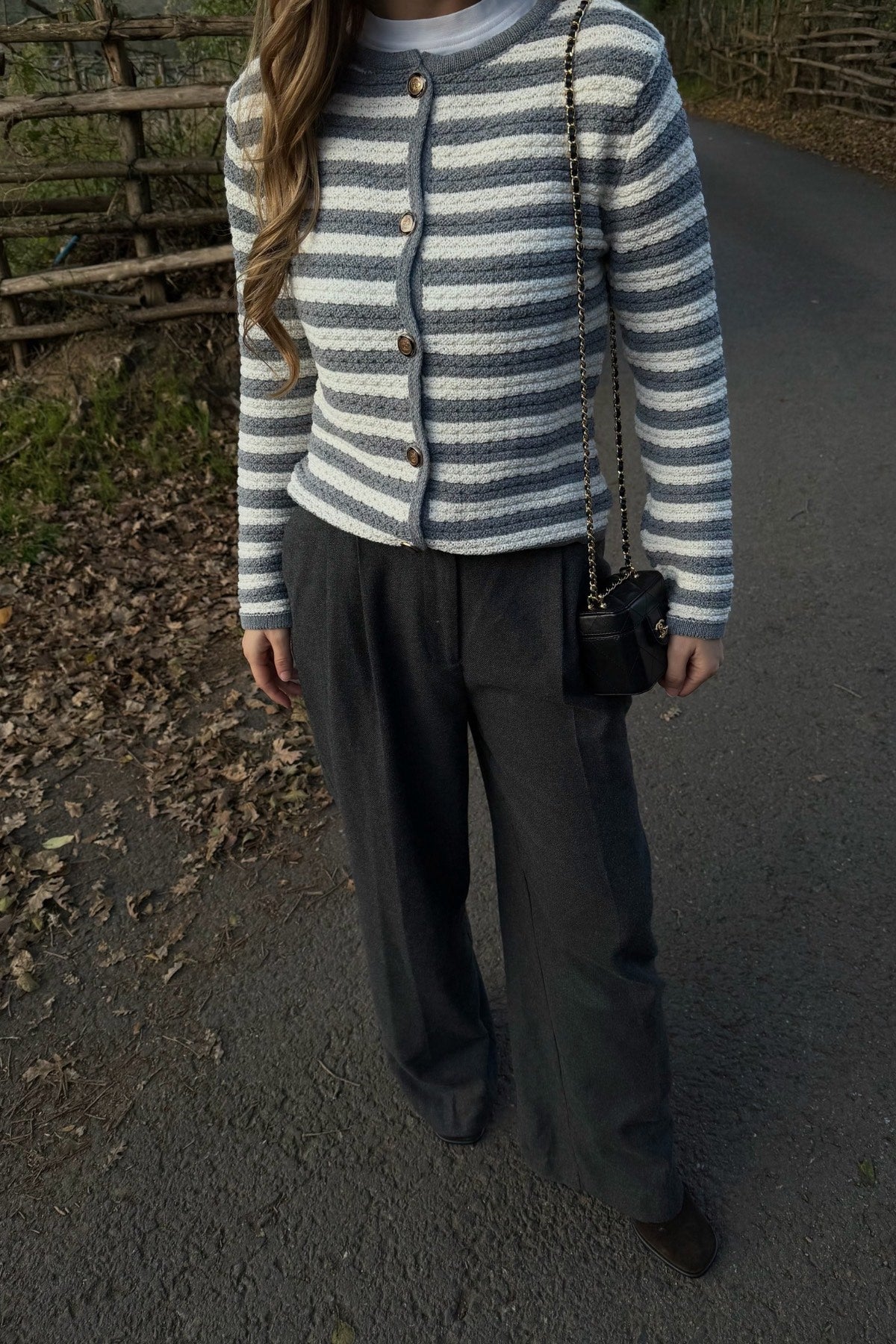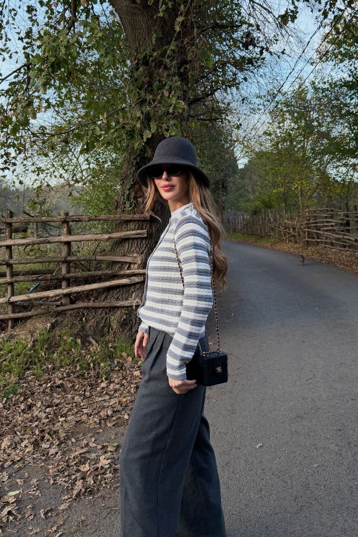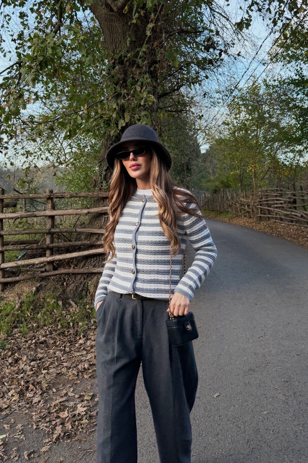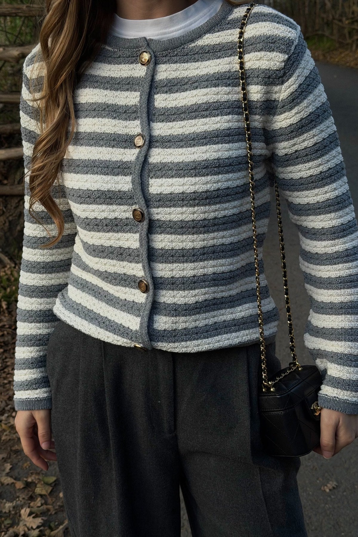 Gri - Ekru Çizgili Örme Hırka - 4390