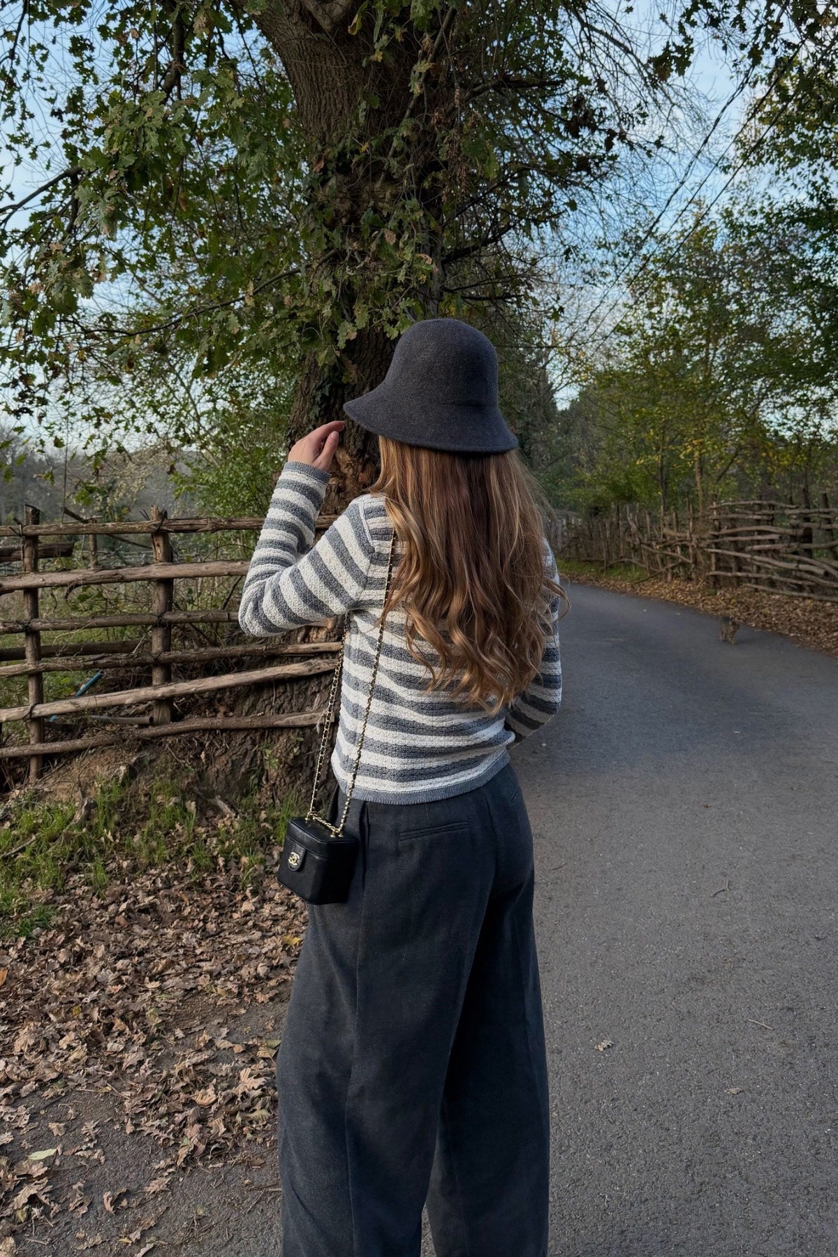 - Gri - Ekru Çizgili Örme Hırka - 4390