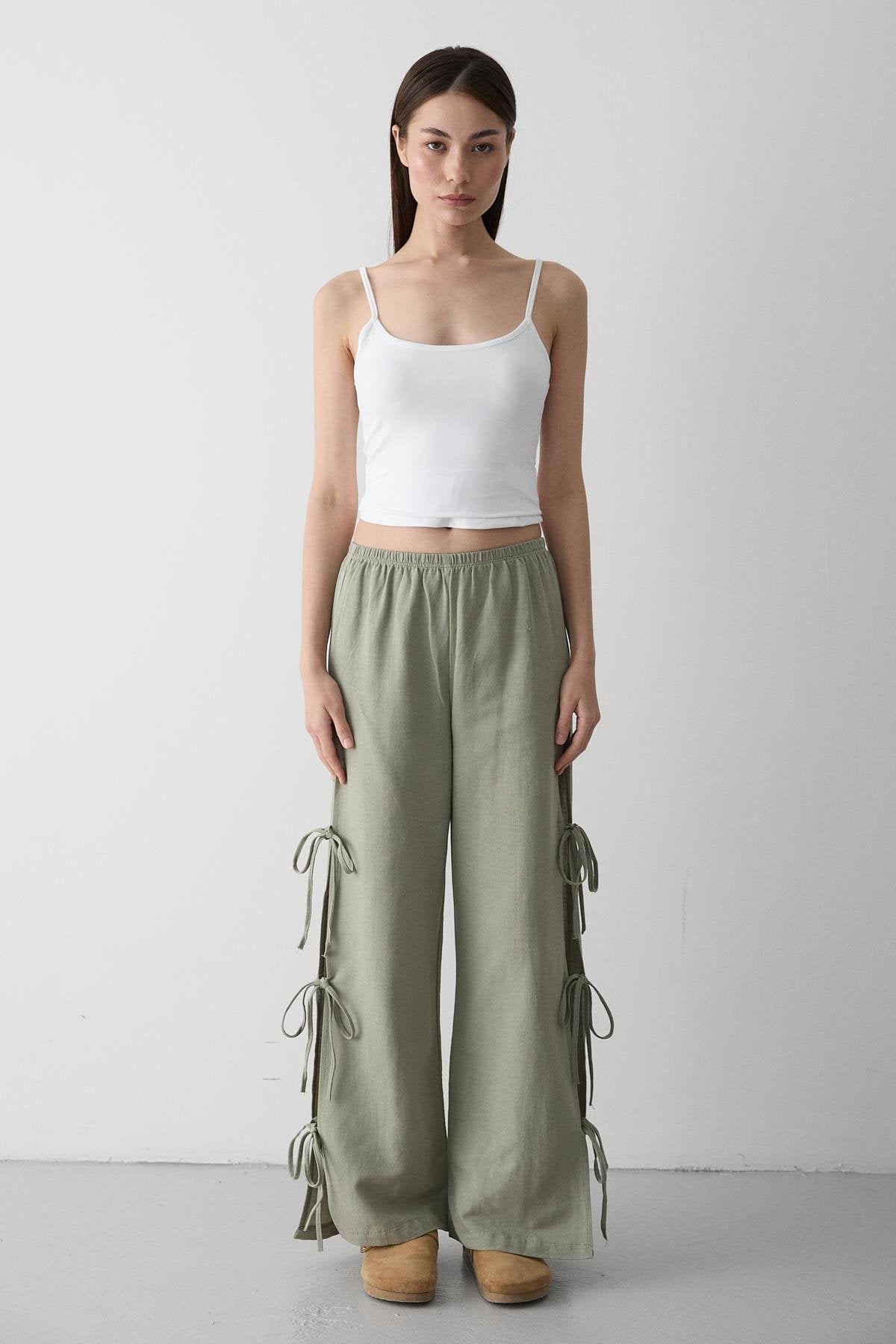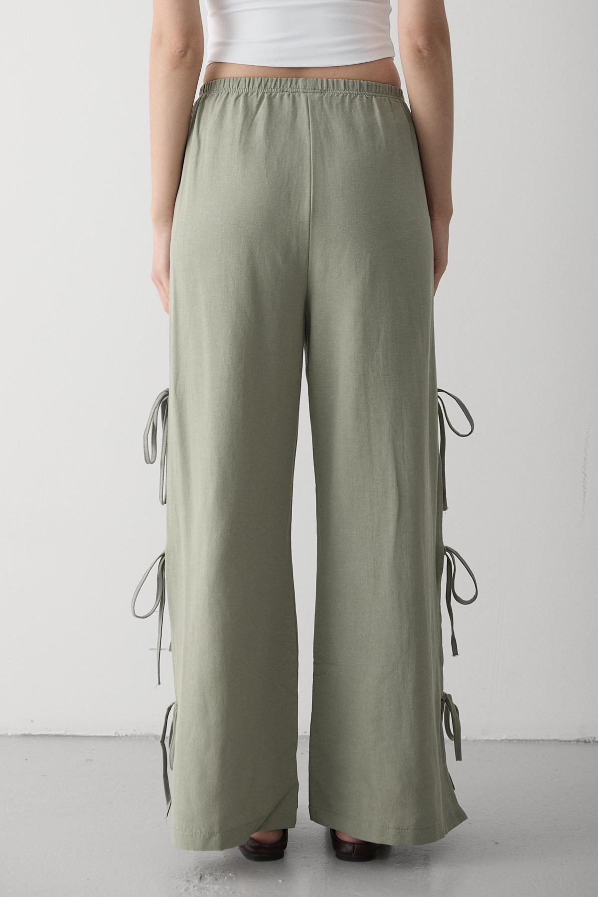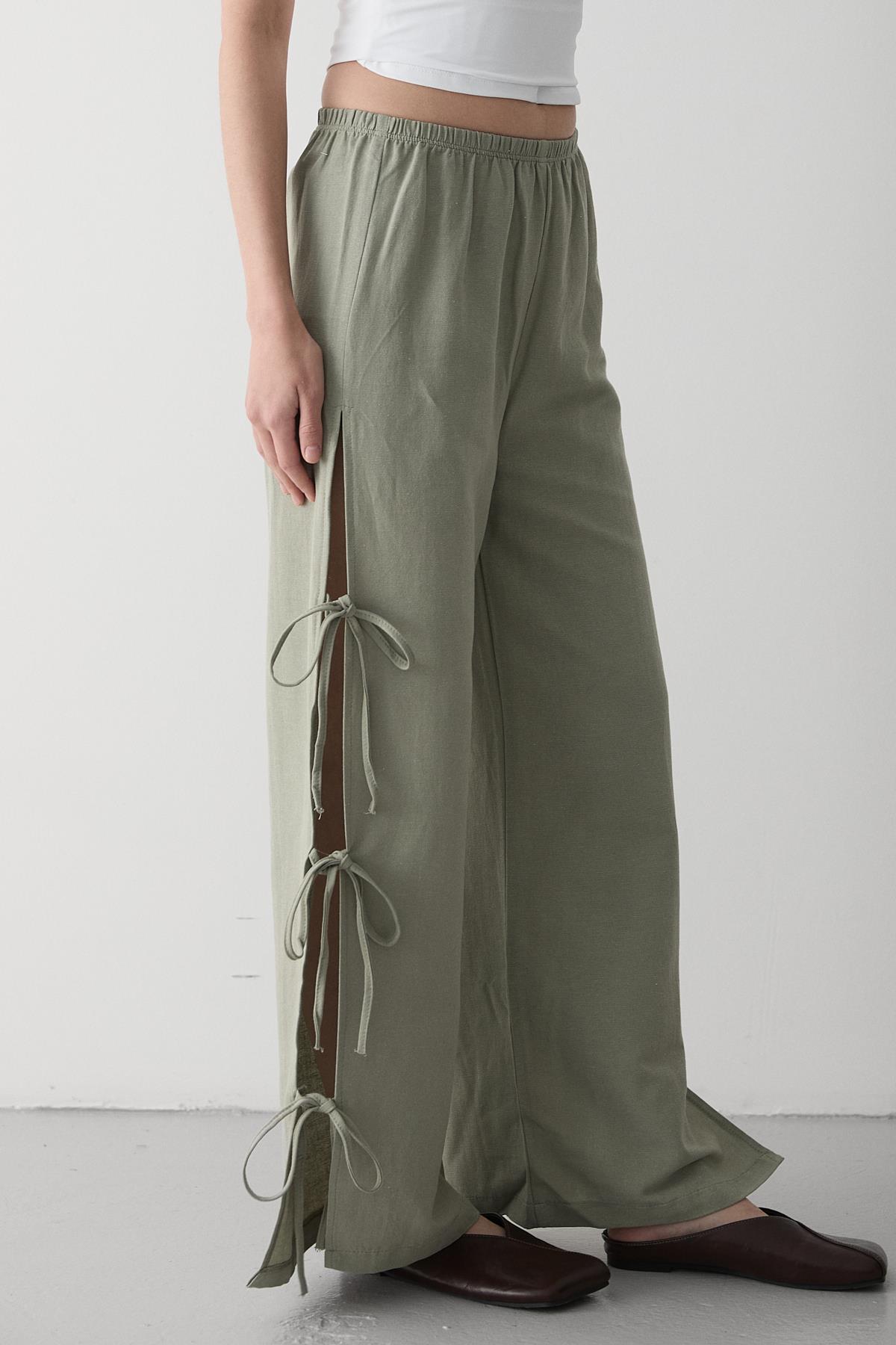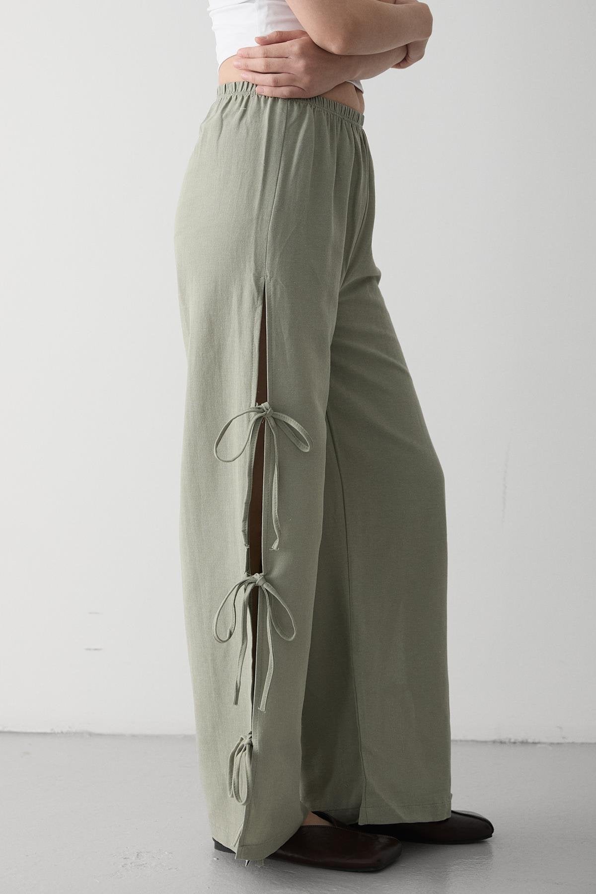 - Haki %100 Pamuk Yan Yırtmaç Ve Bağlama Detaylı Pantolon