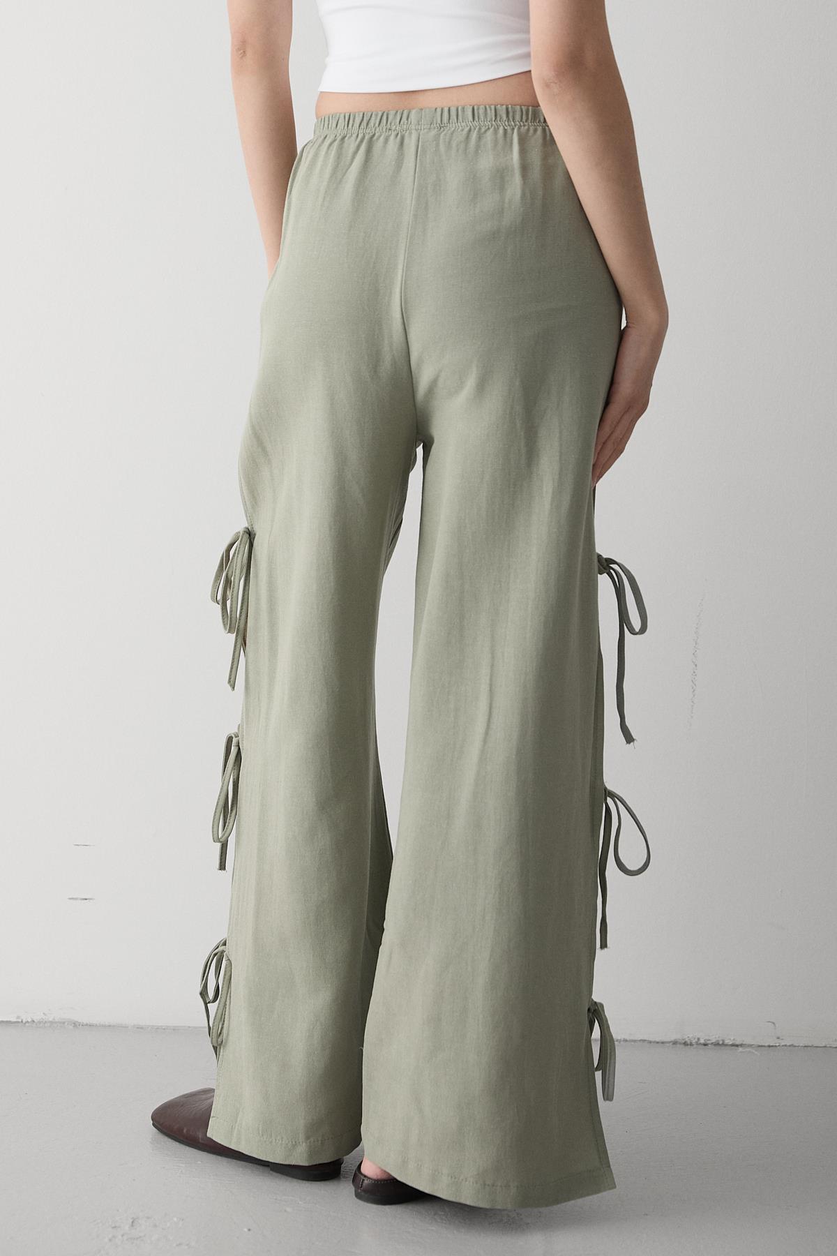 Haki %100 Pamuk Yan Yırtmaç Ve Bağlama Detaylı Pantolon
