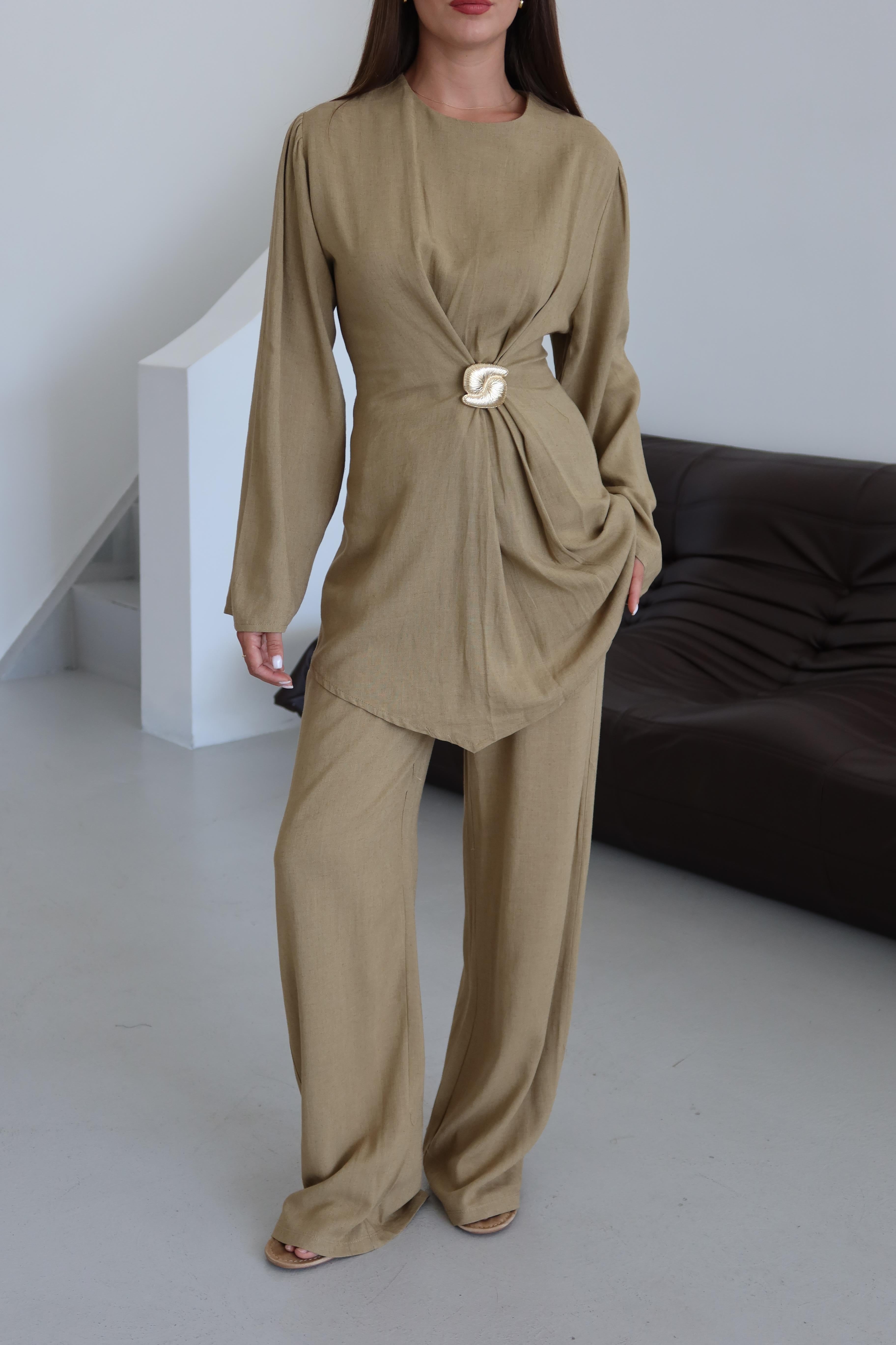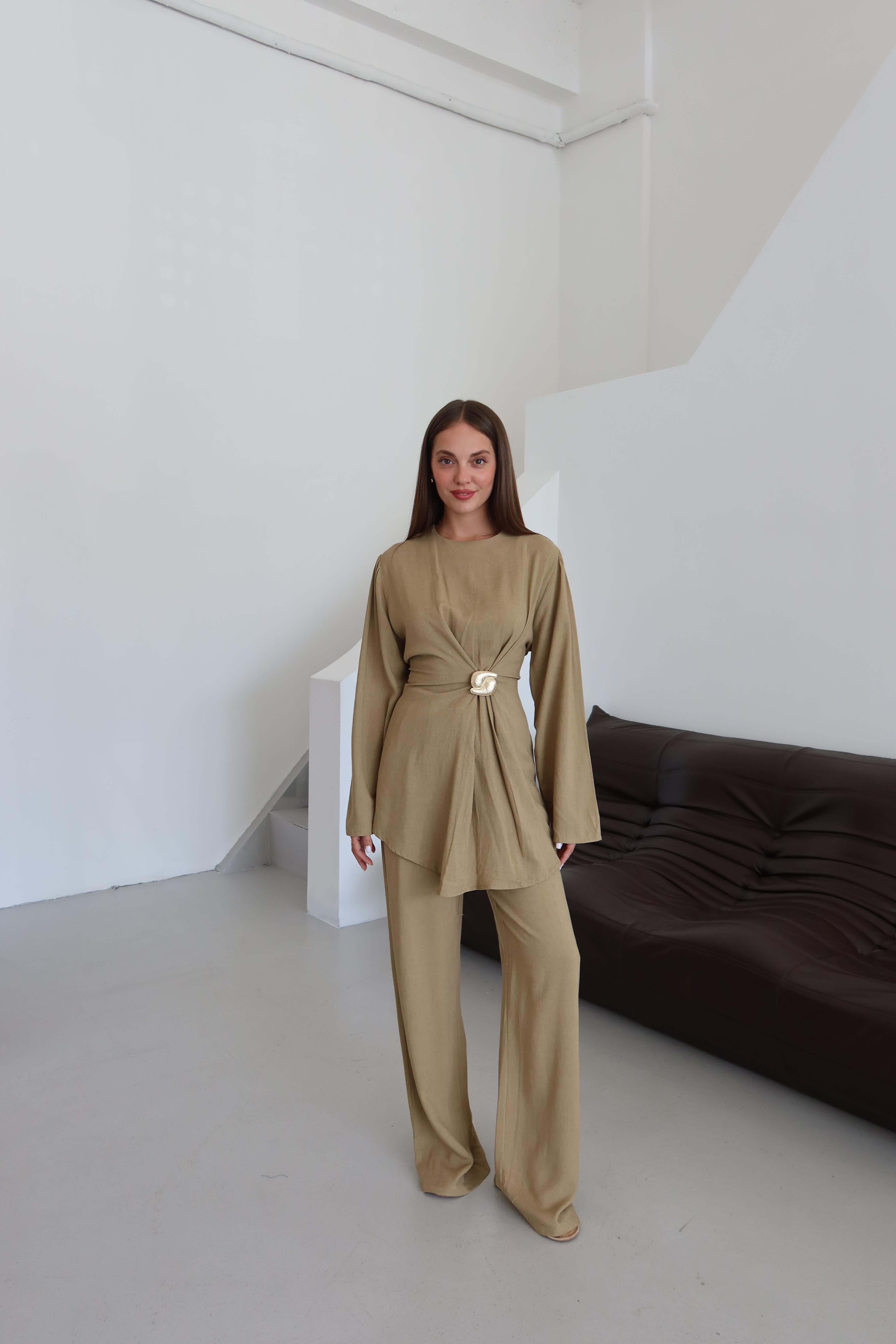 - Haki Gold Broşlu Bluz Pantolon Takım