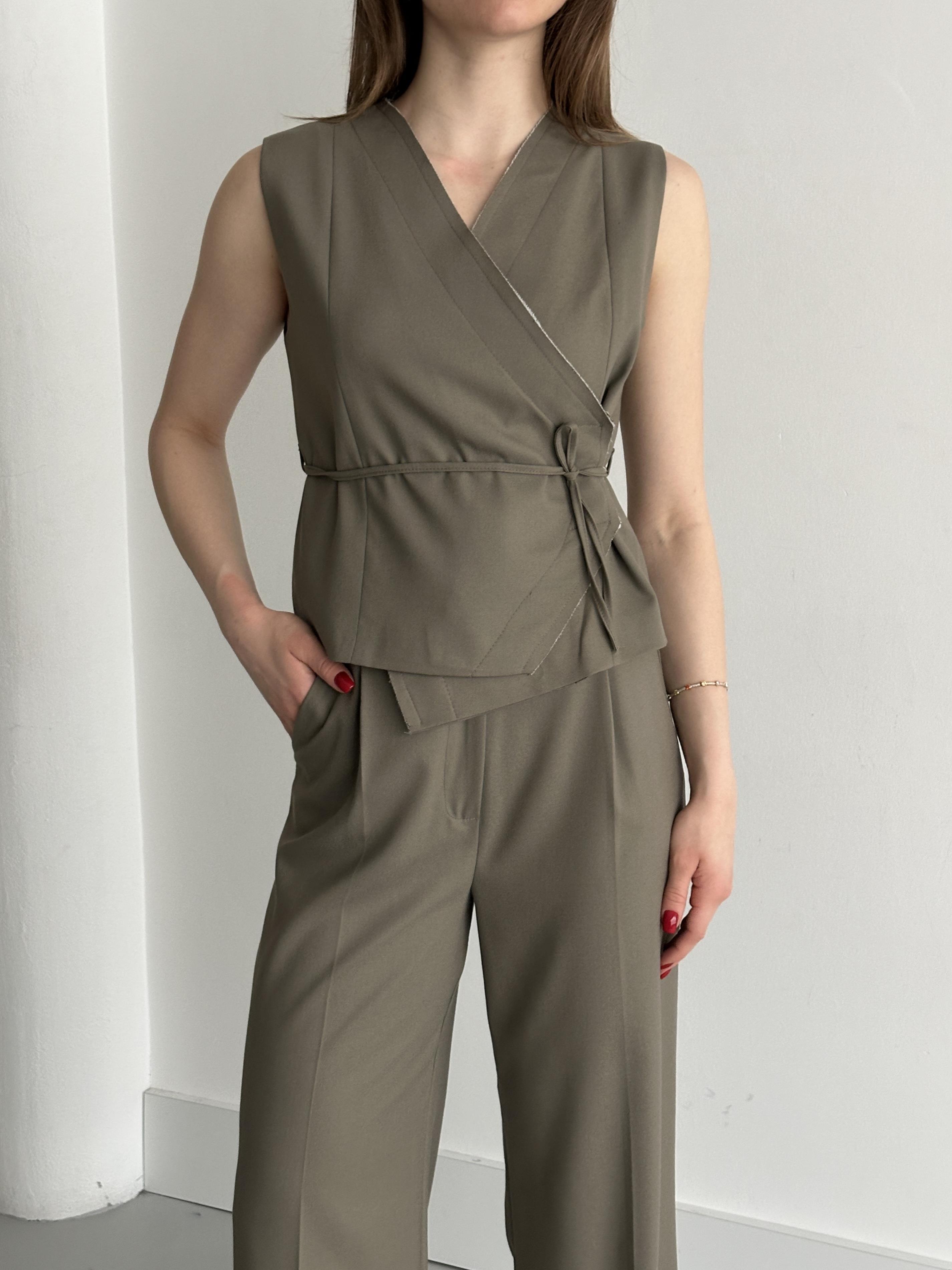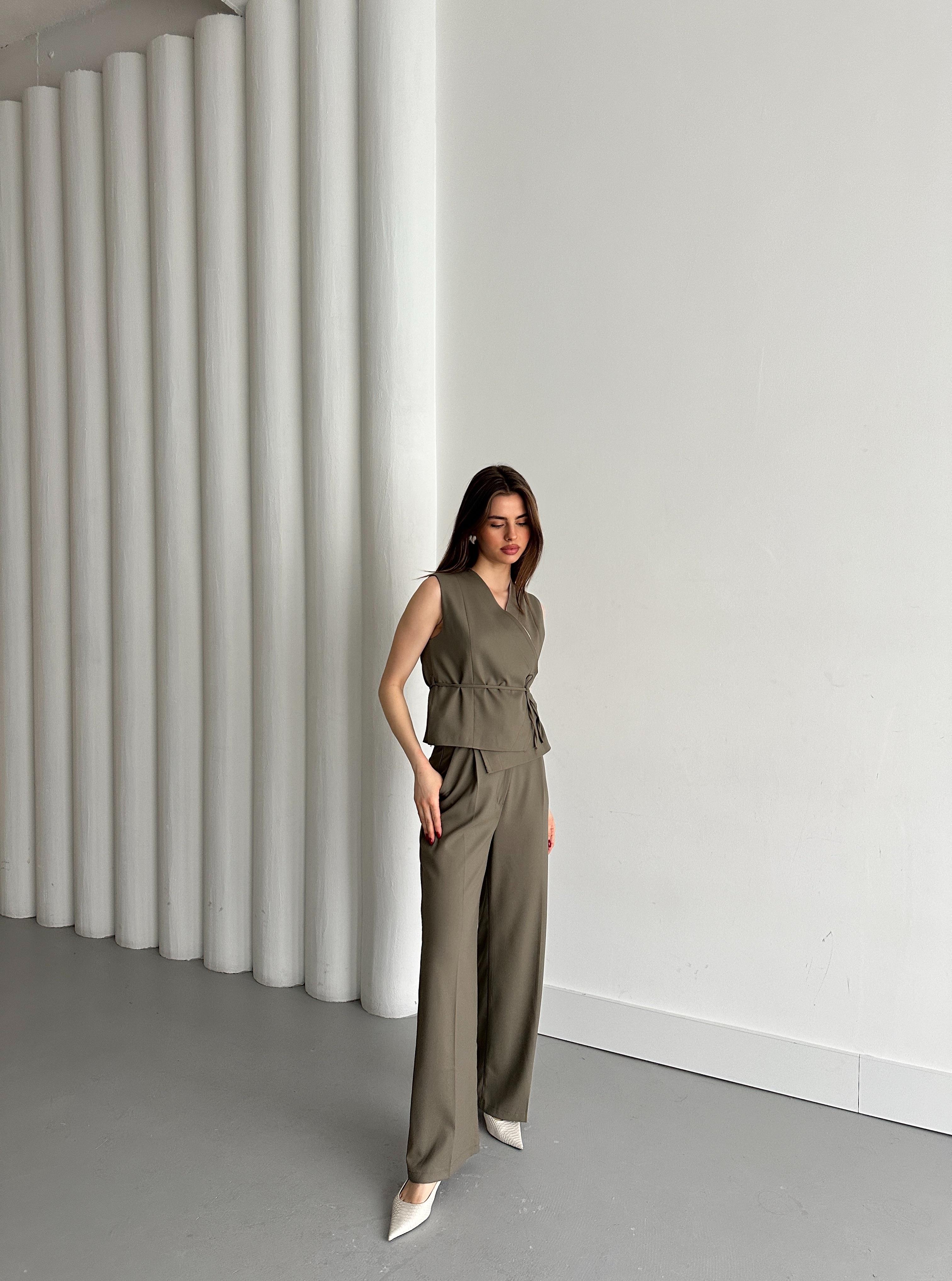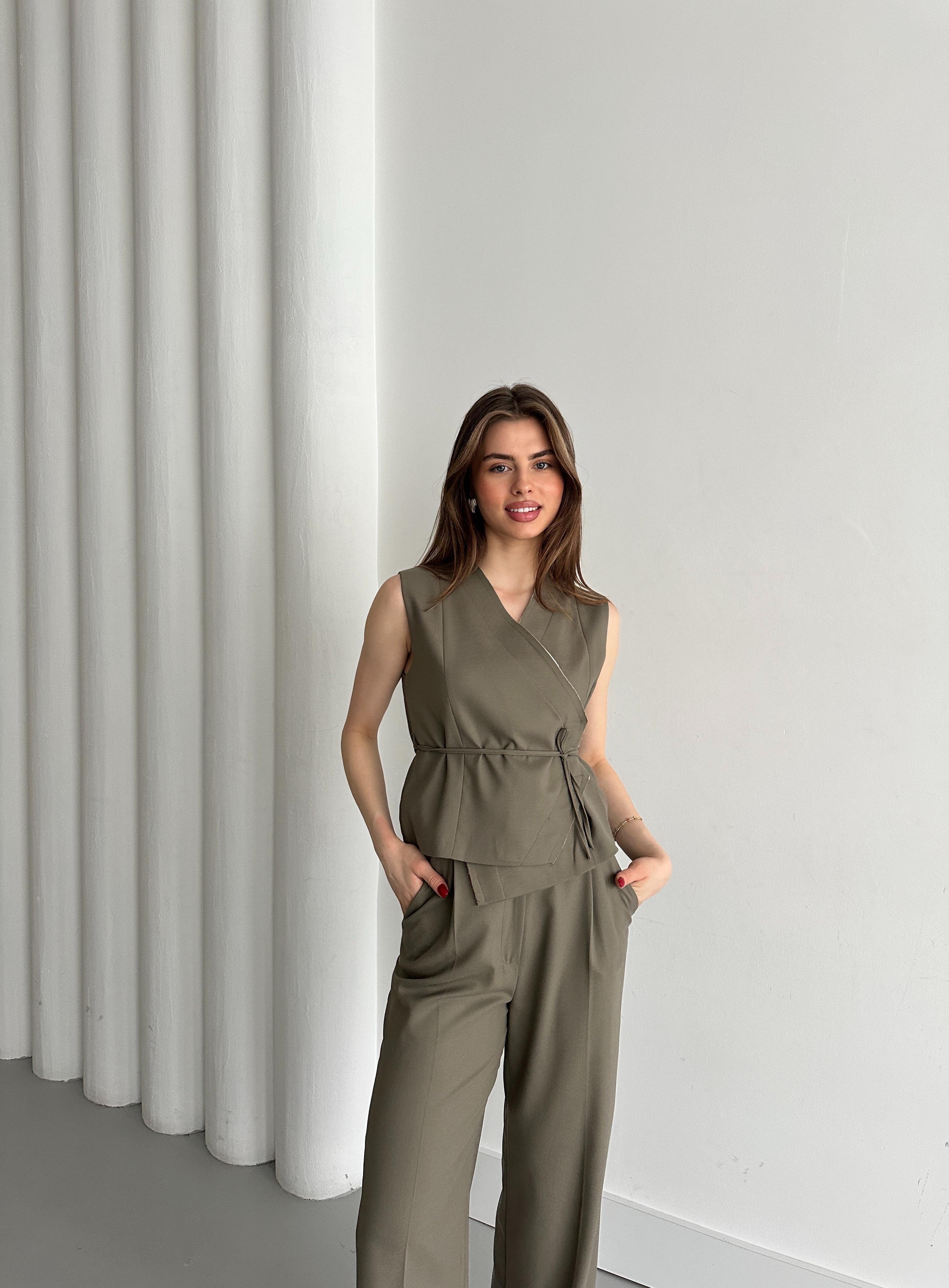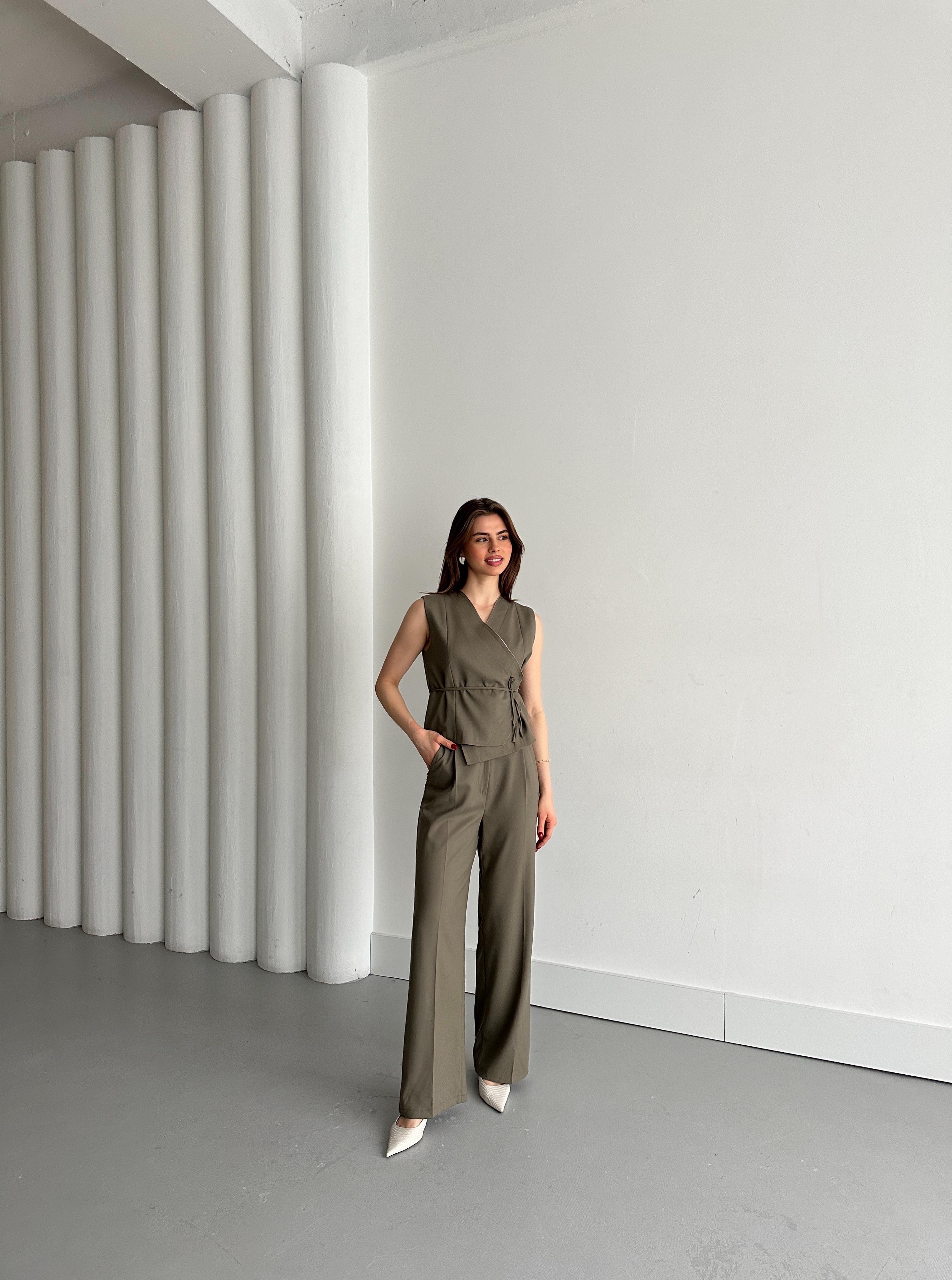 Haki Kruvaze Yaka Yelek Pantolon Takım