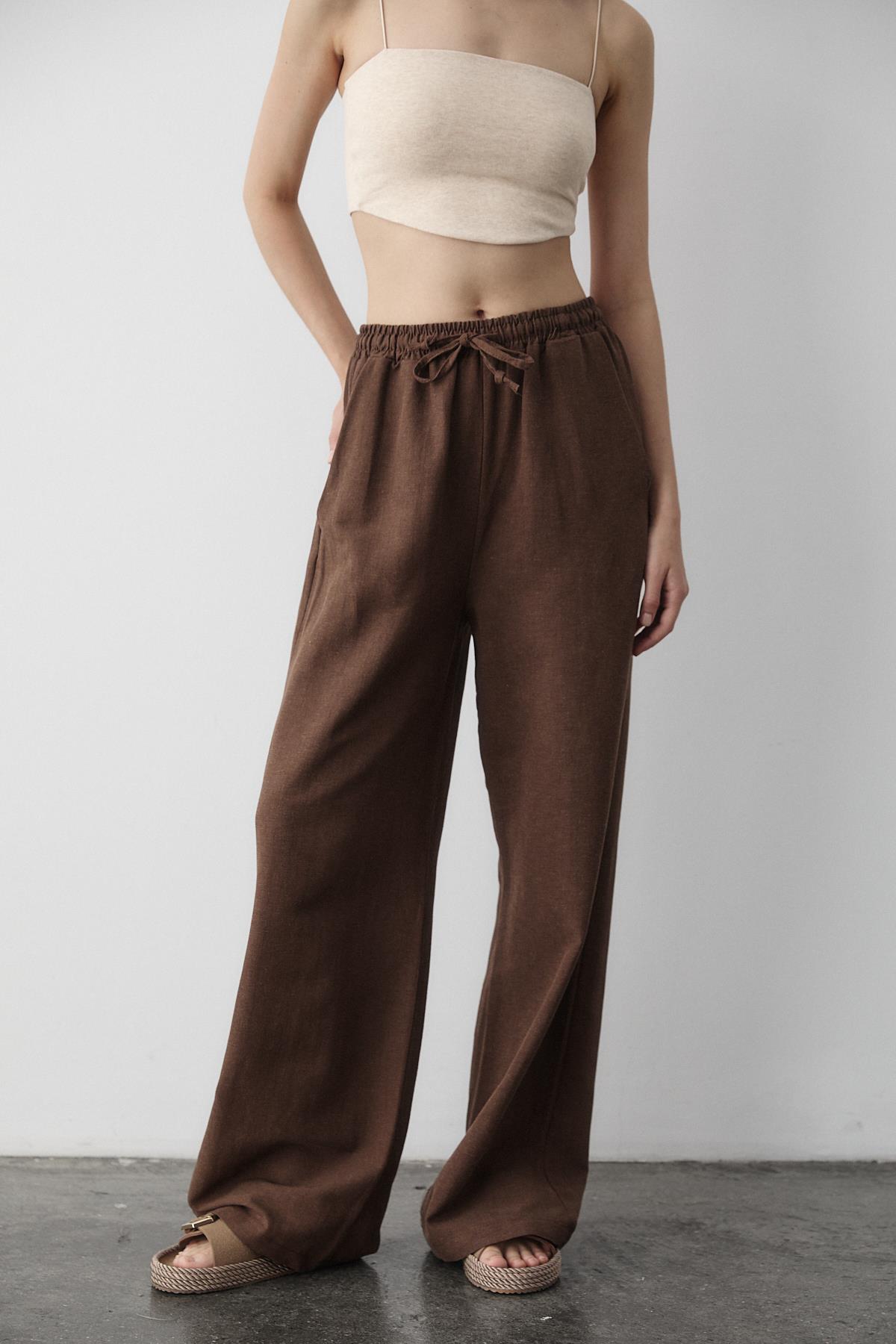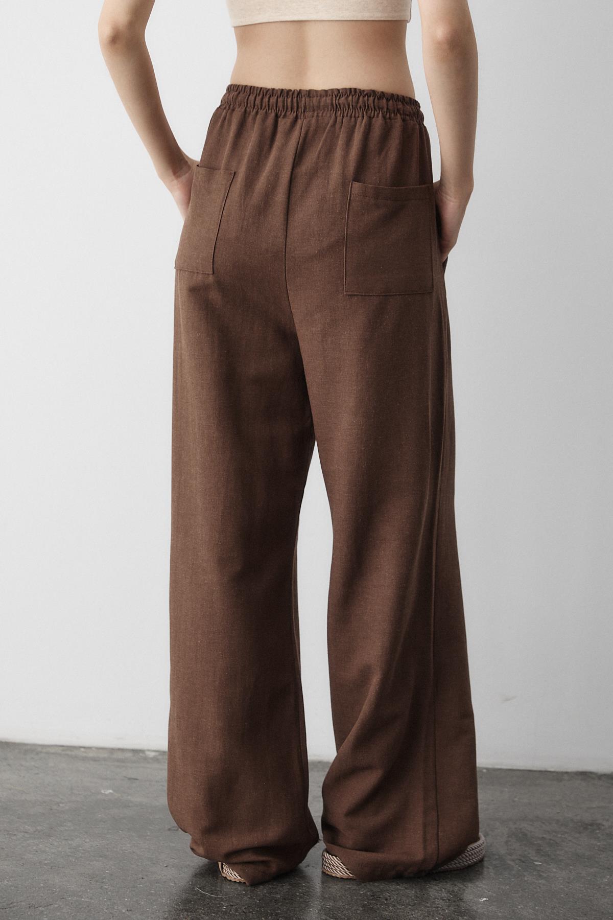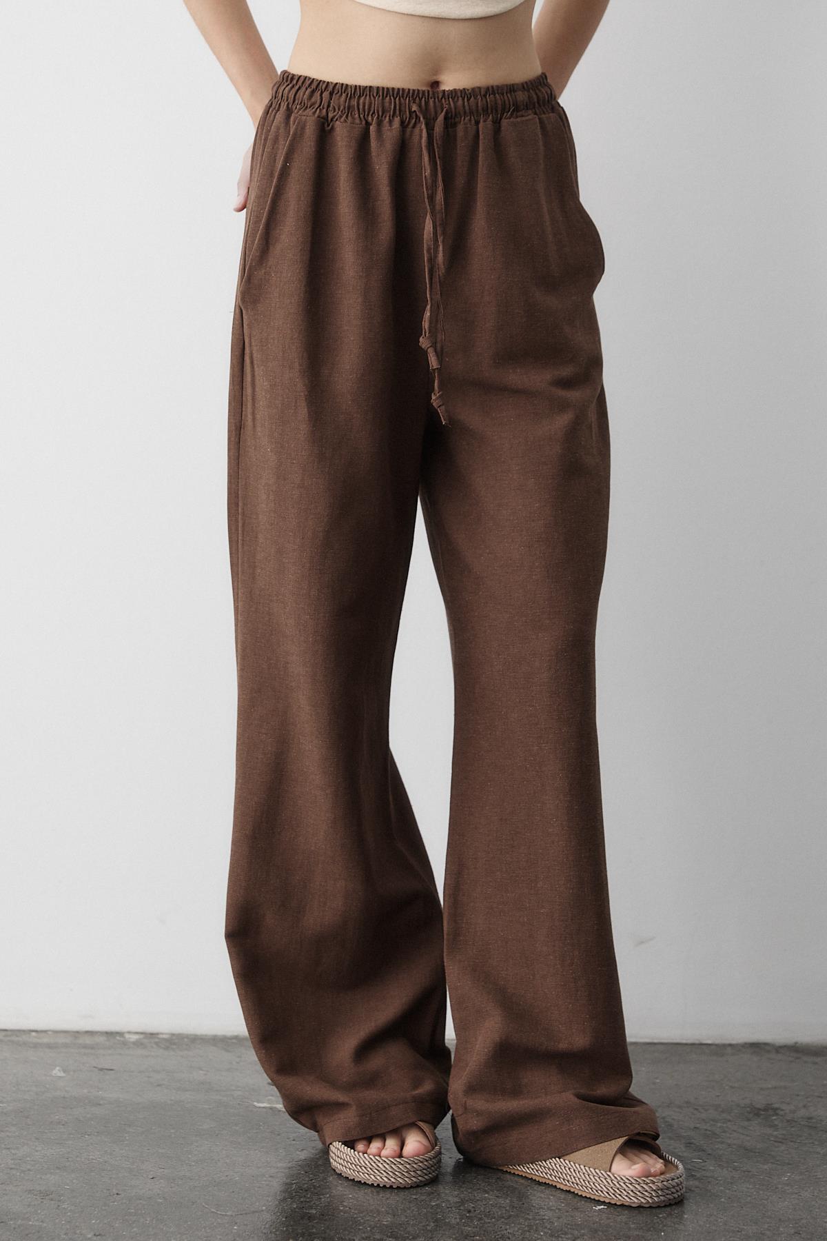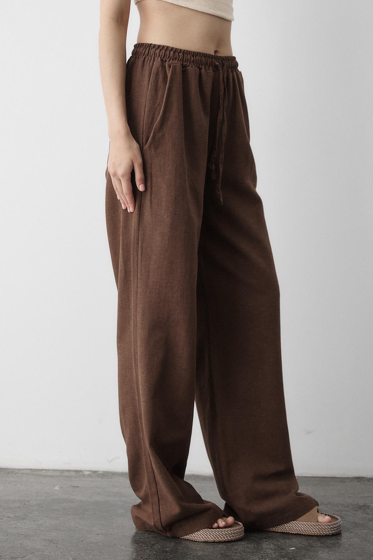 - Kahverengi Beli Lastikli Pamuklu Keten Pantolon