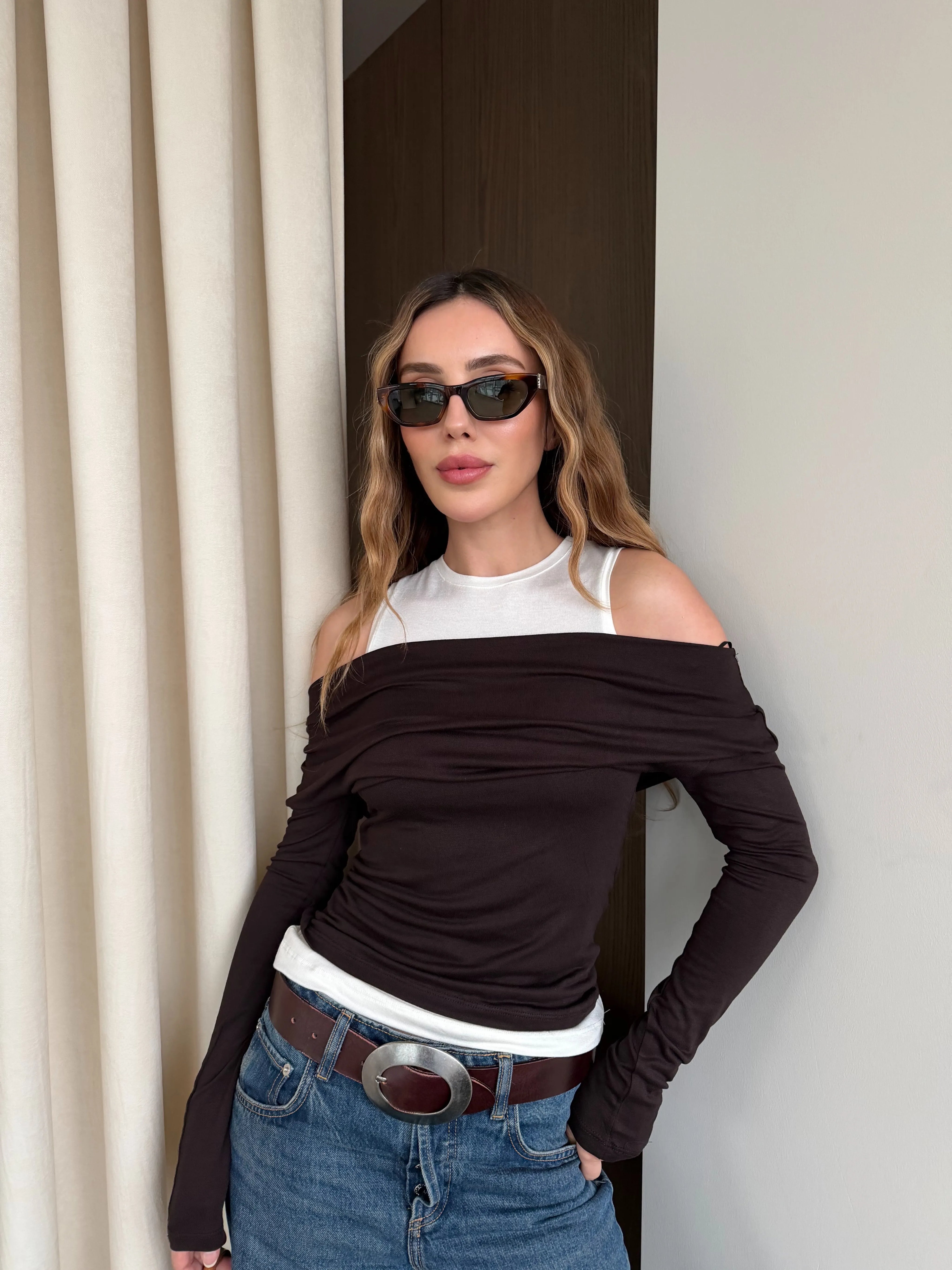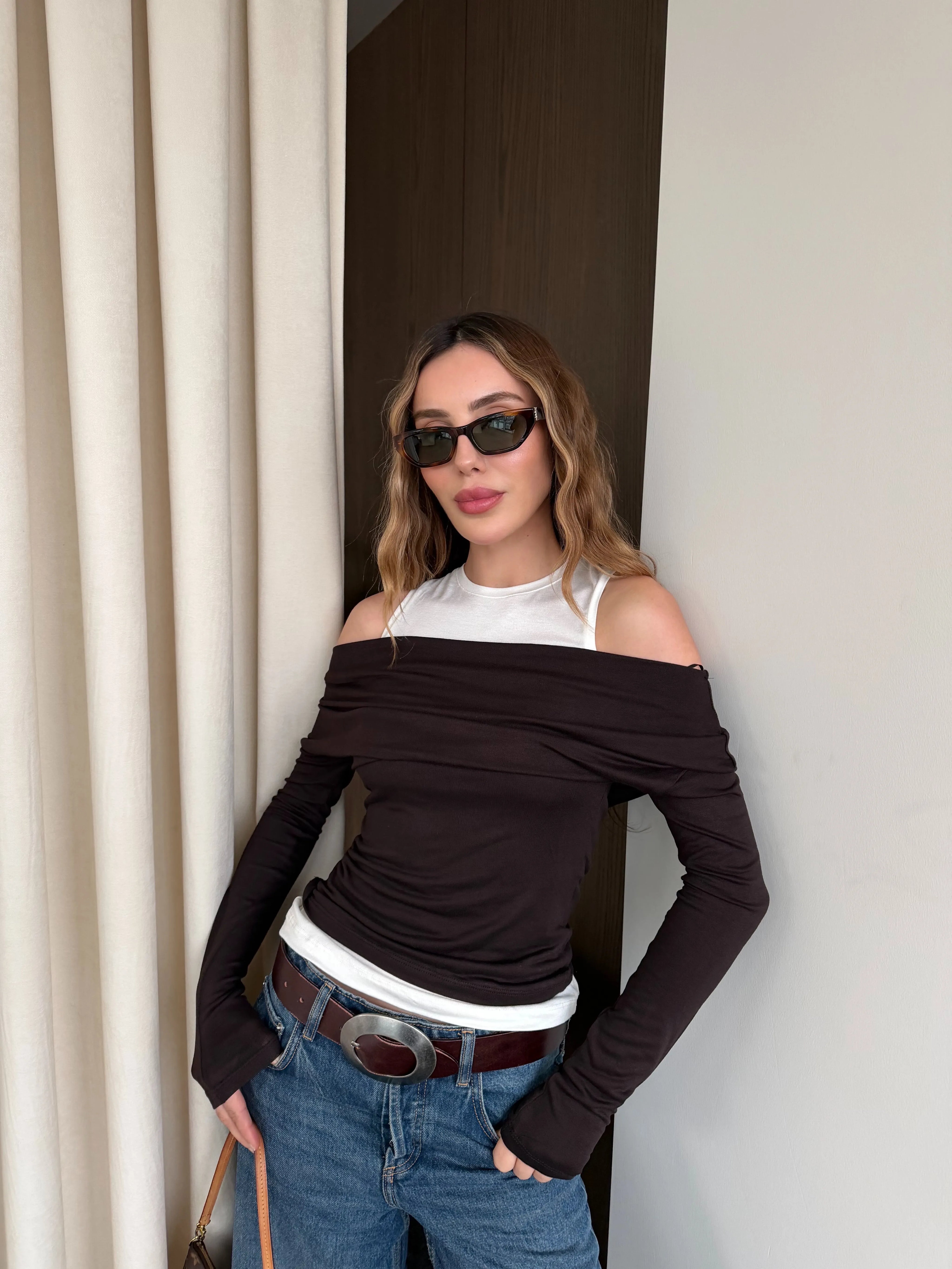 Kahverengi Beyaz Atletli Kayık Yaka Bluz - 0780