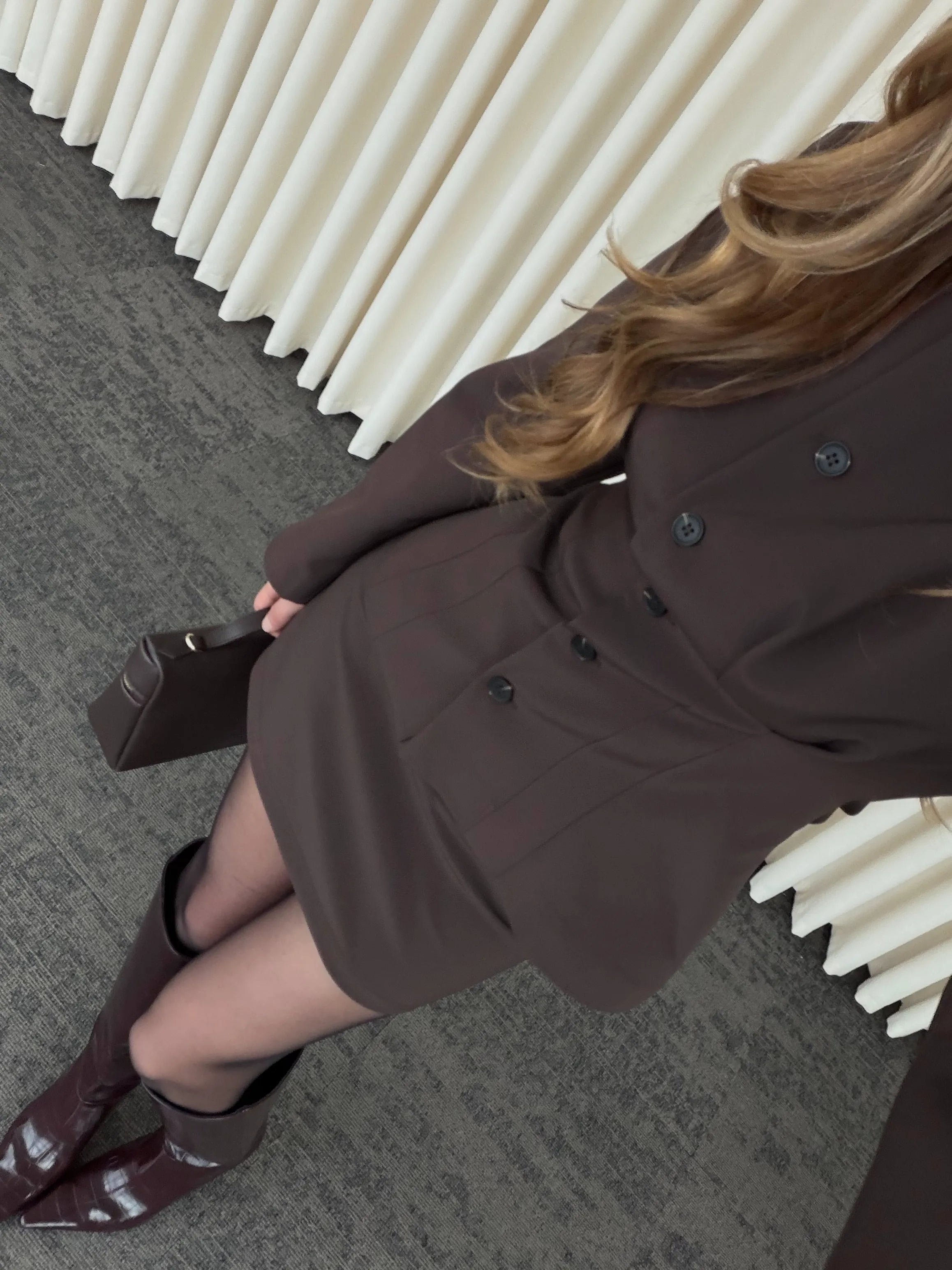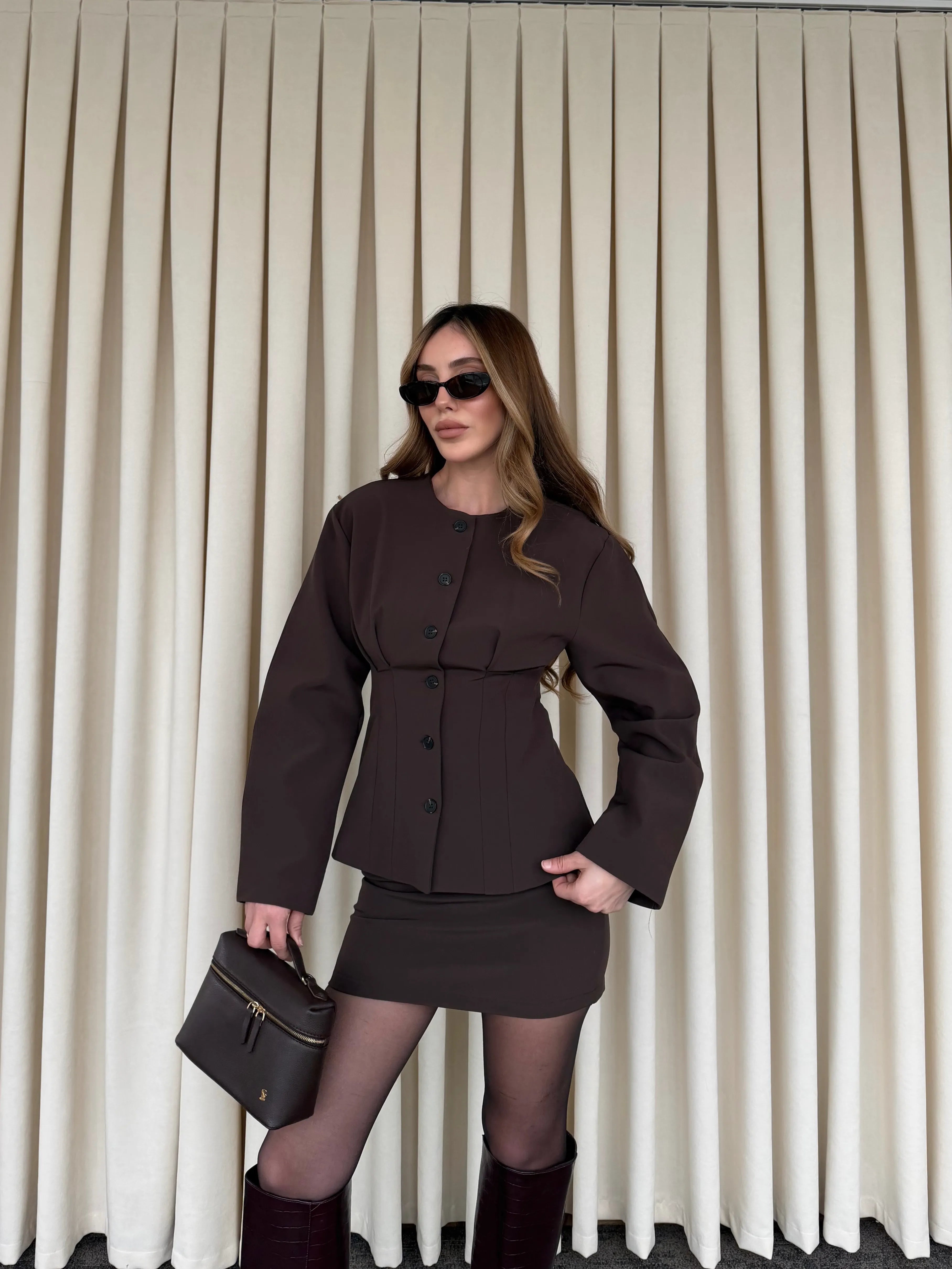 - Kahverengi Düğmeli Pileli Ceket Etek Takım - 30422