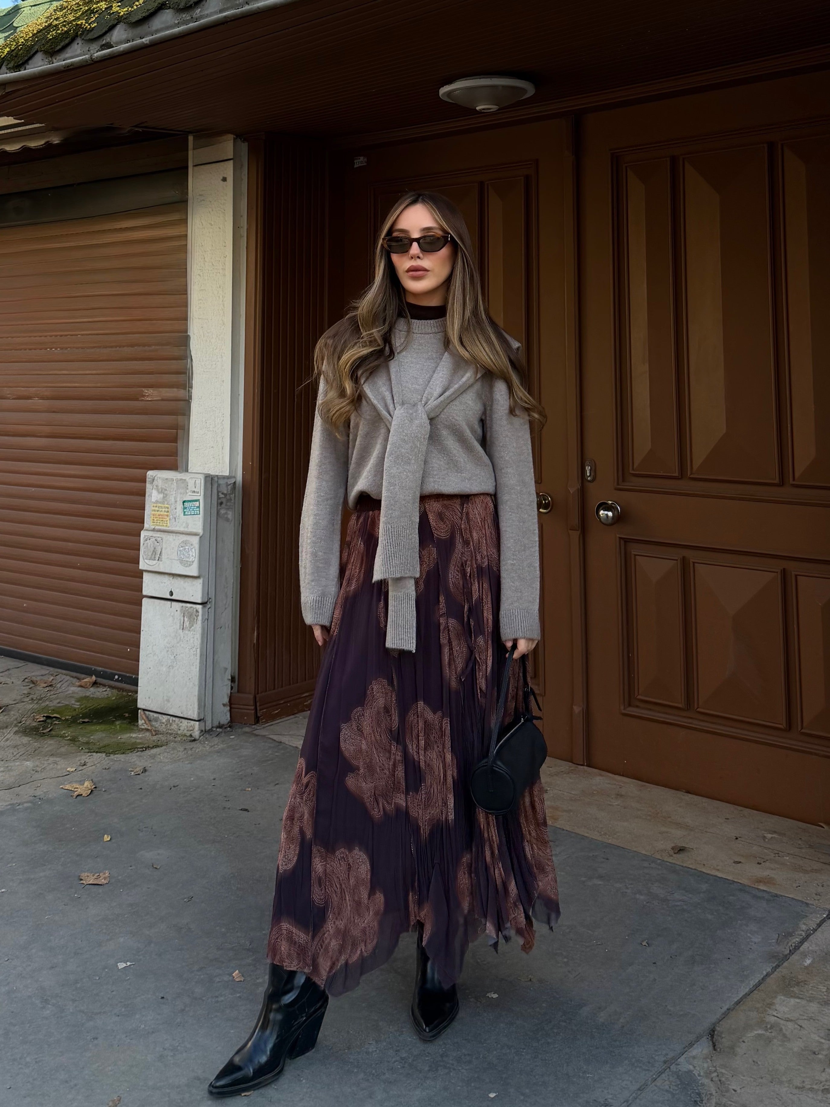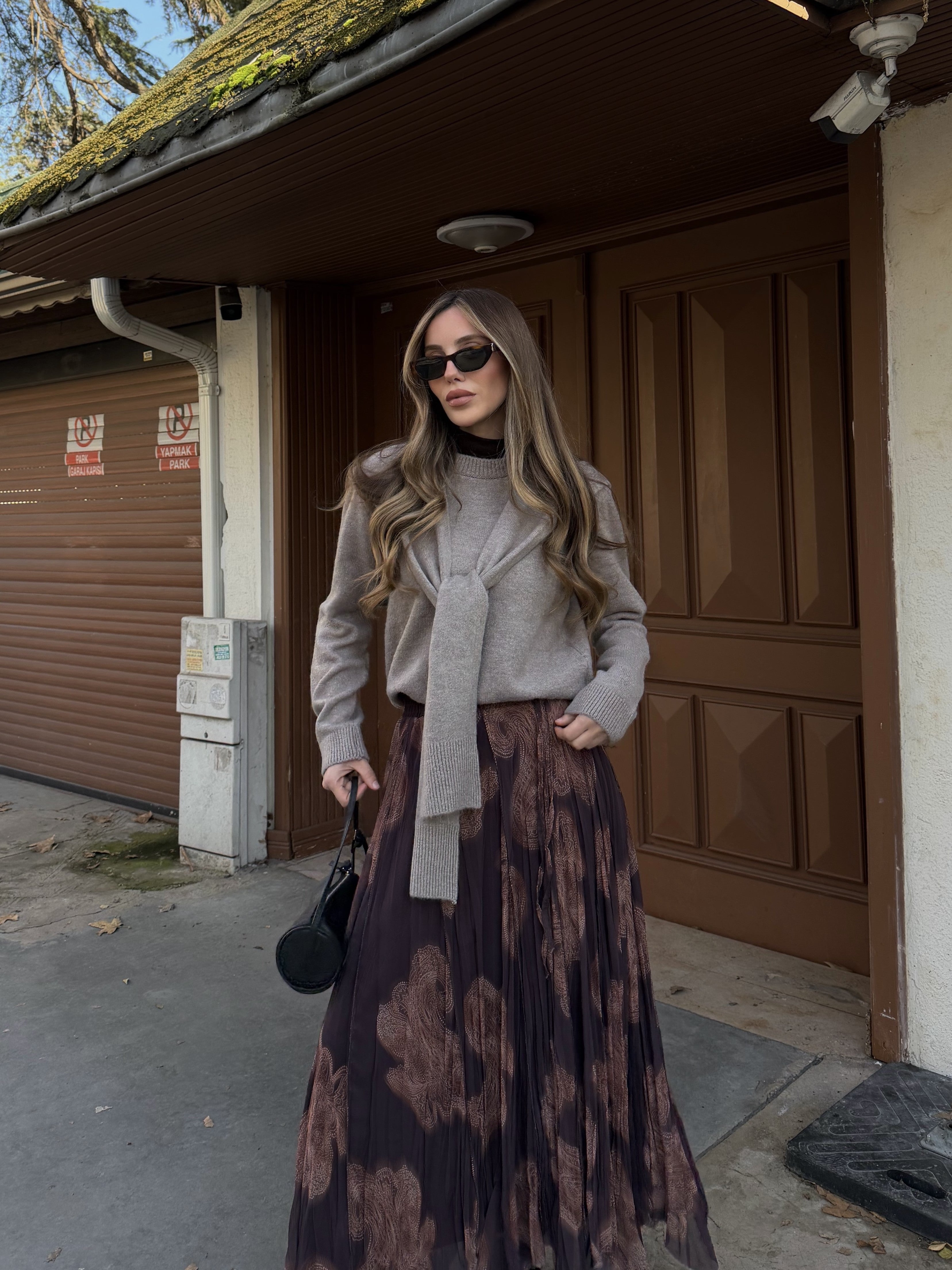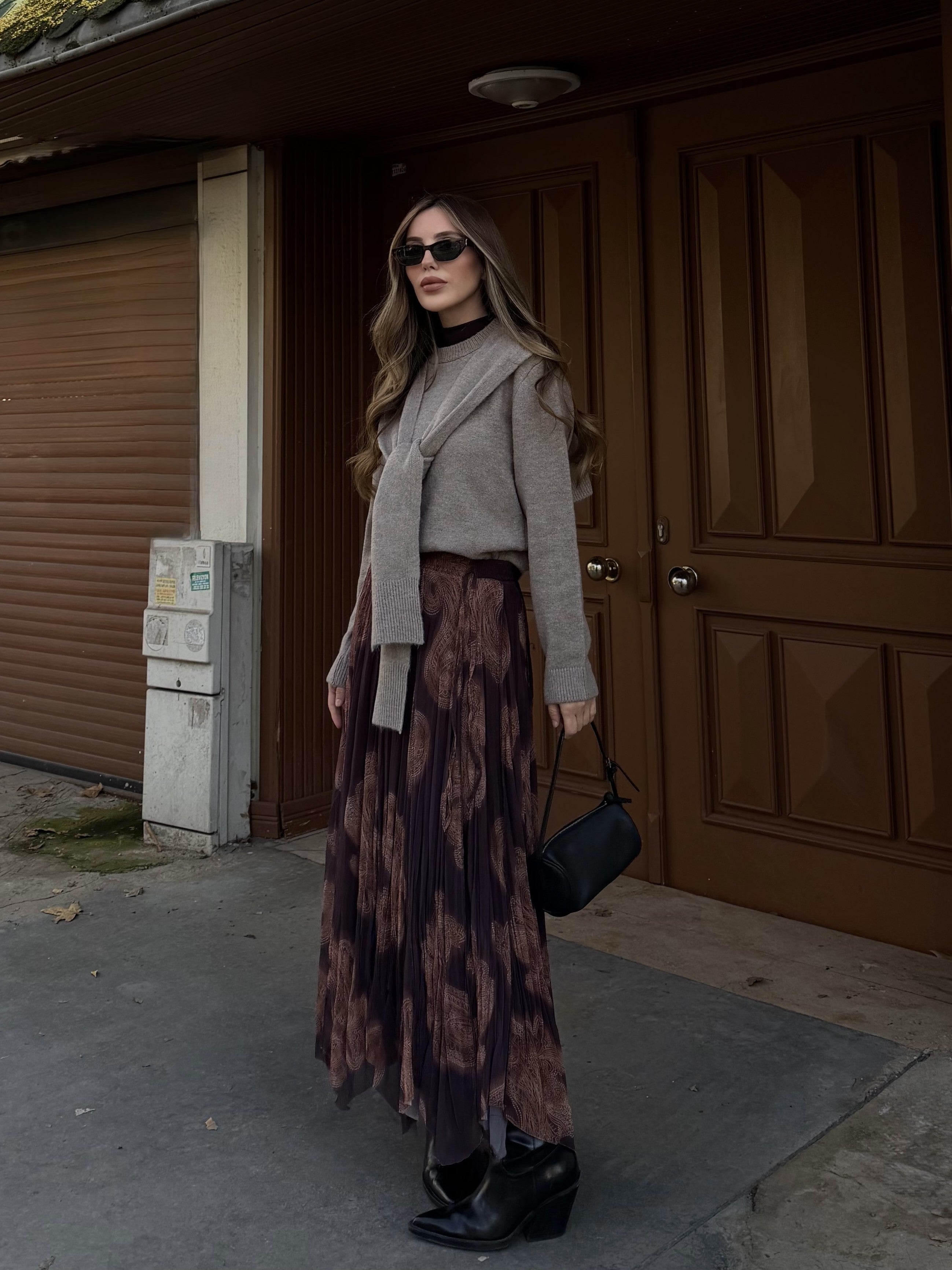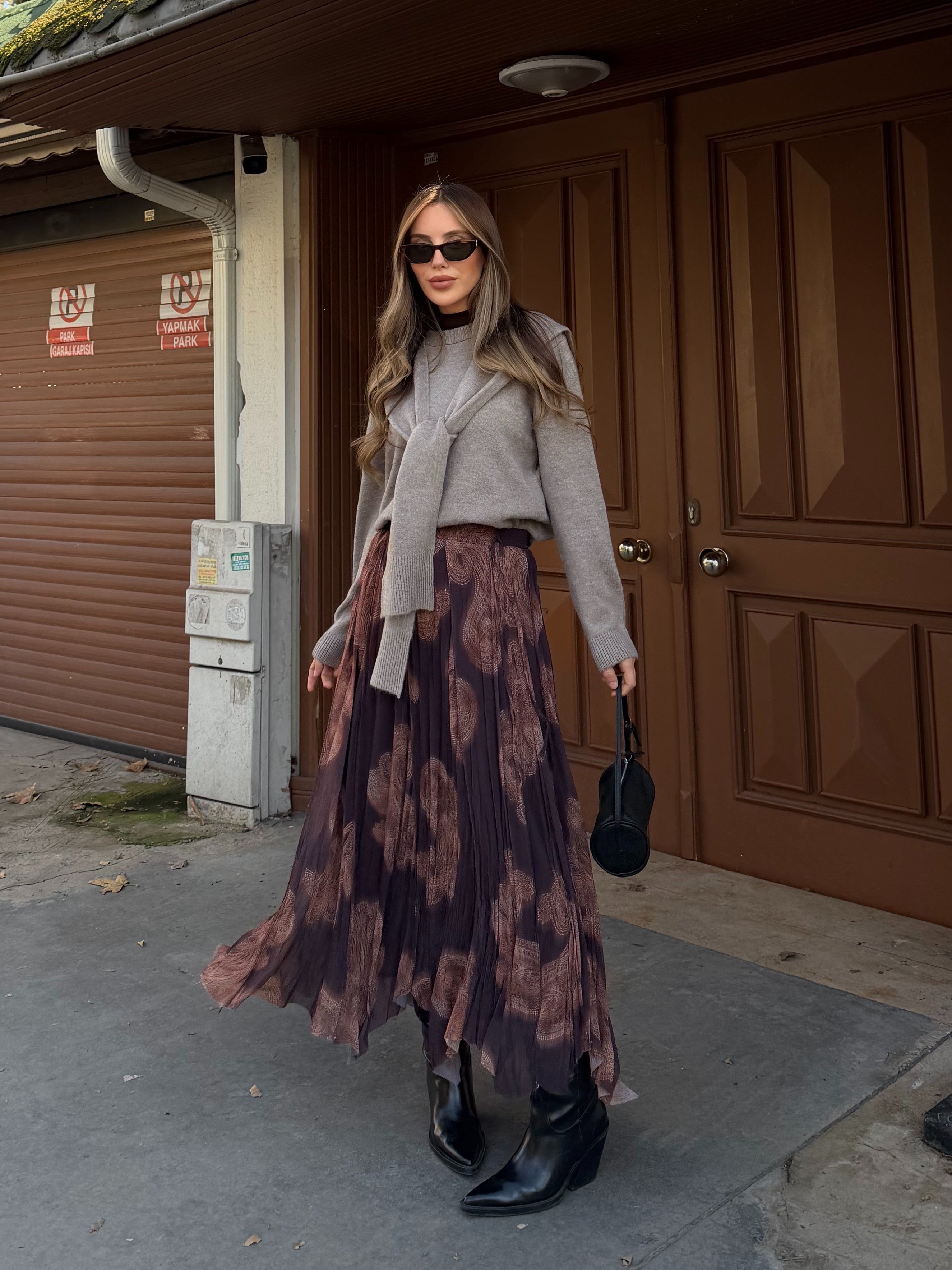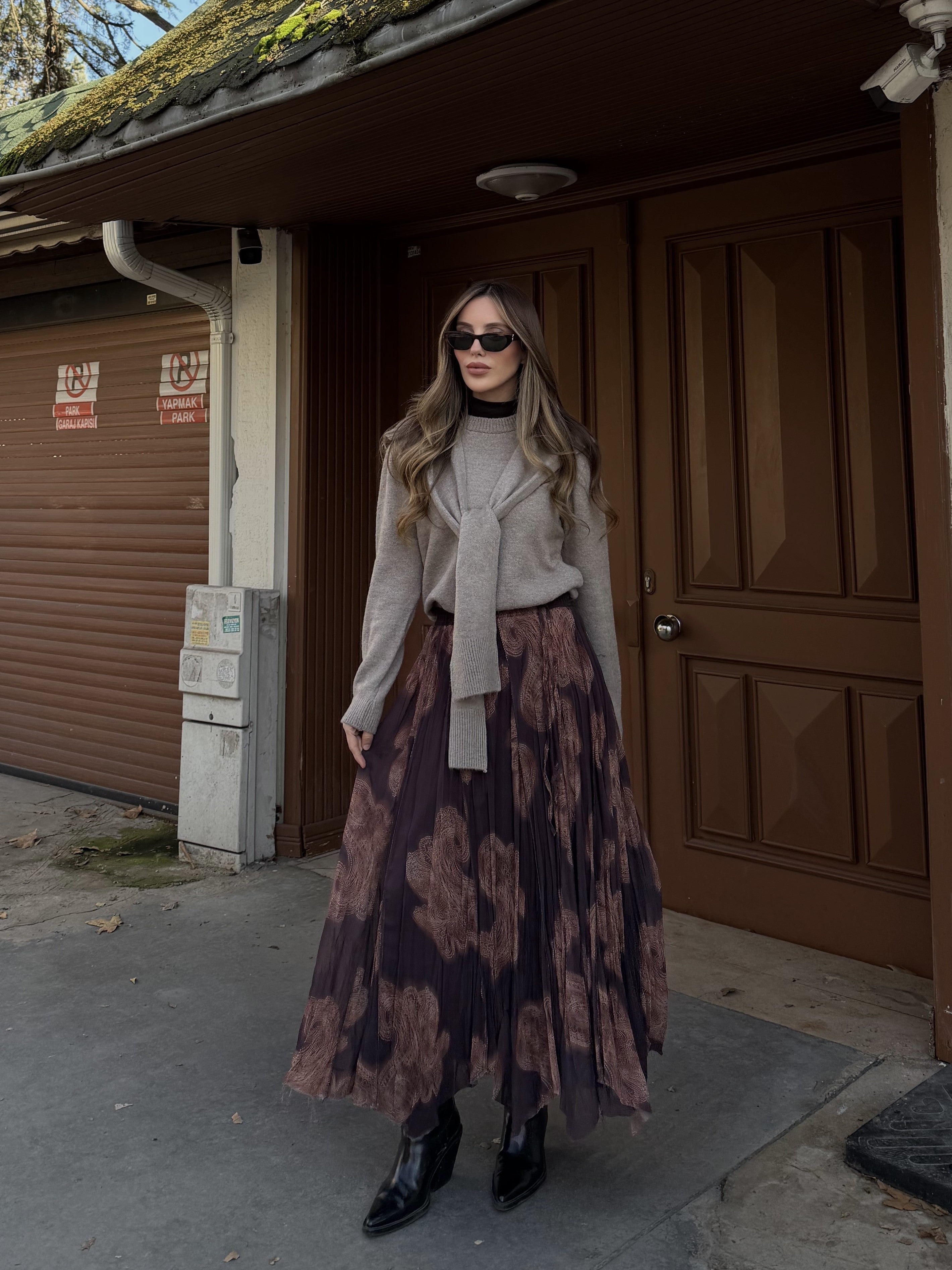 - Kahverengi Etnik Desenli Şifon Etek - 251102