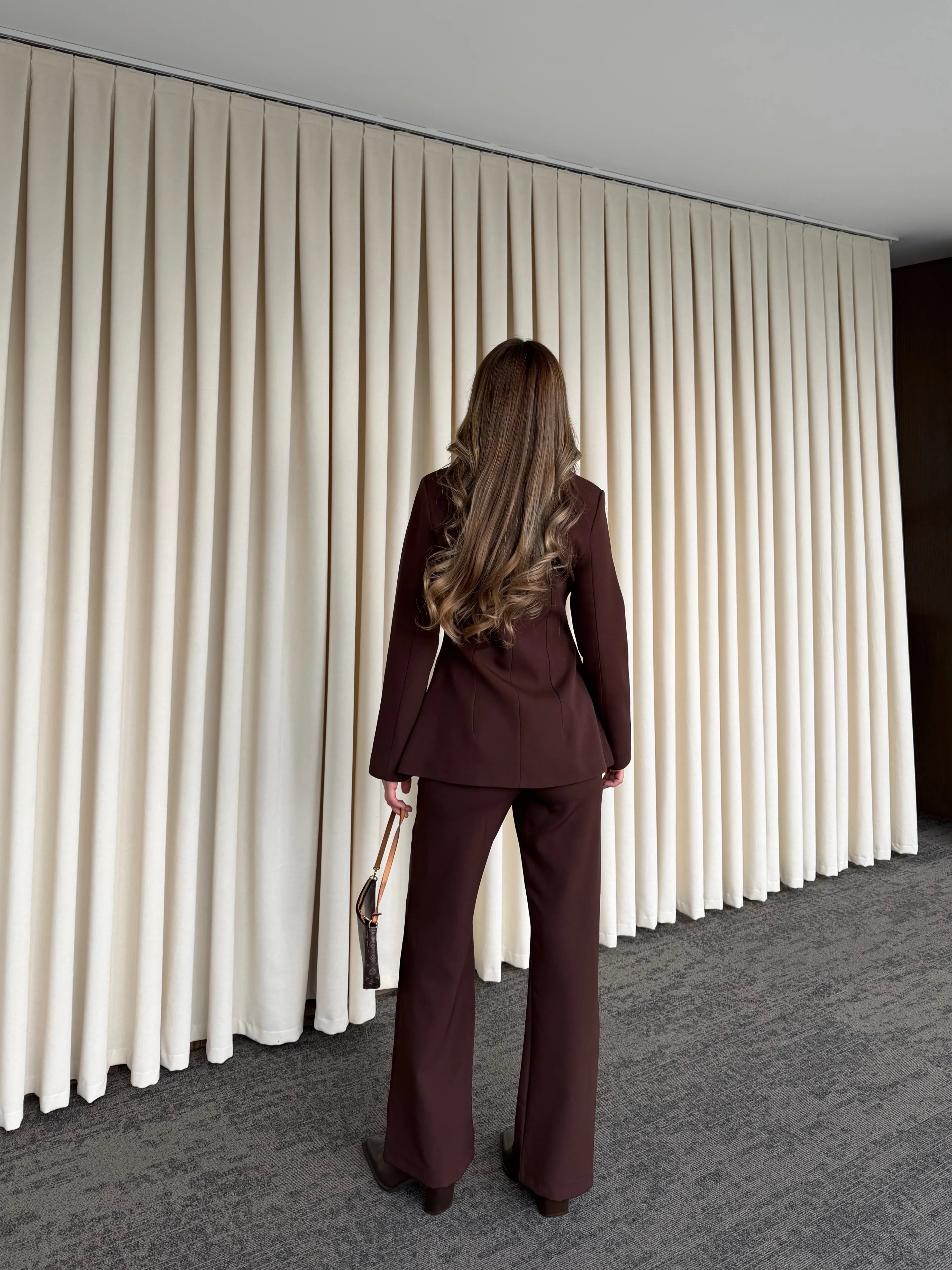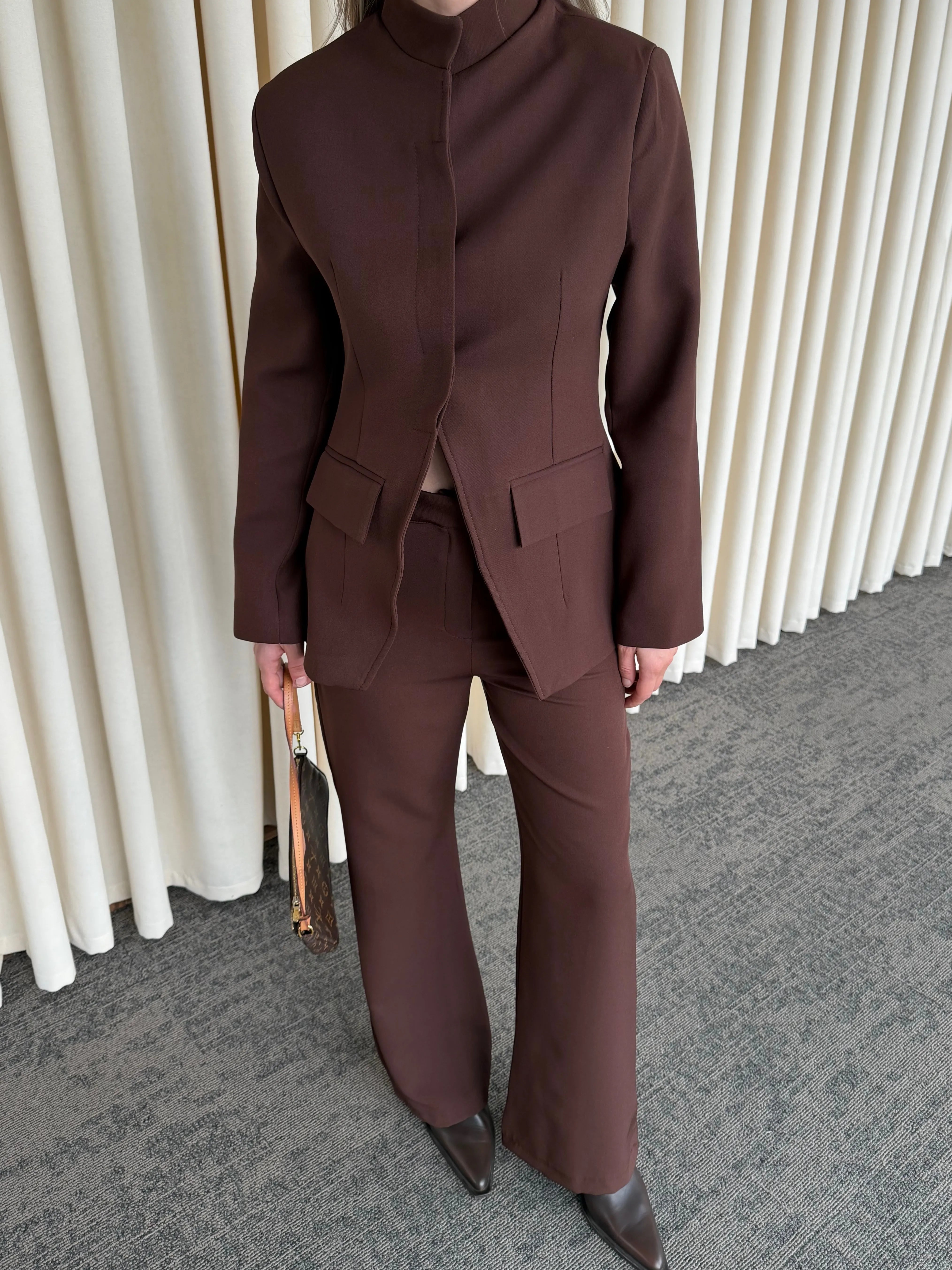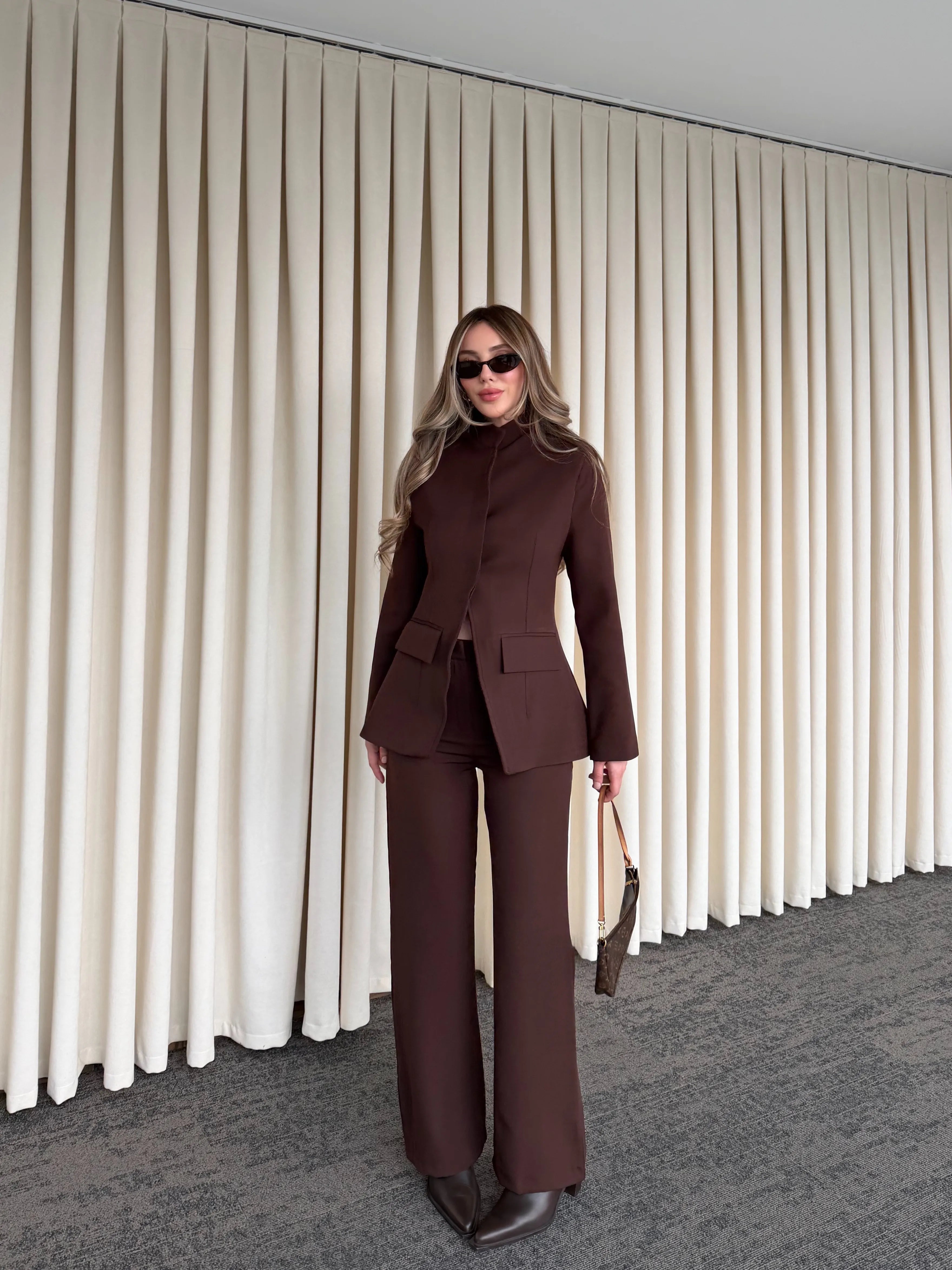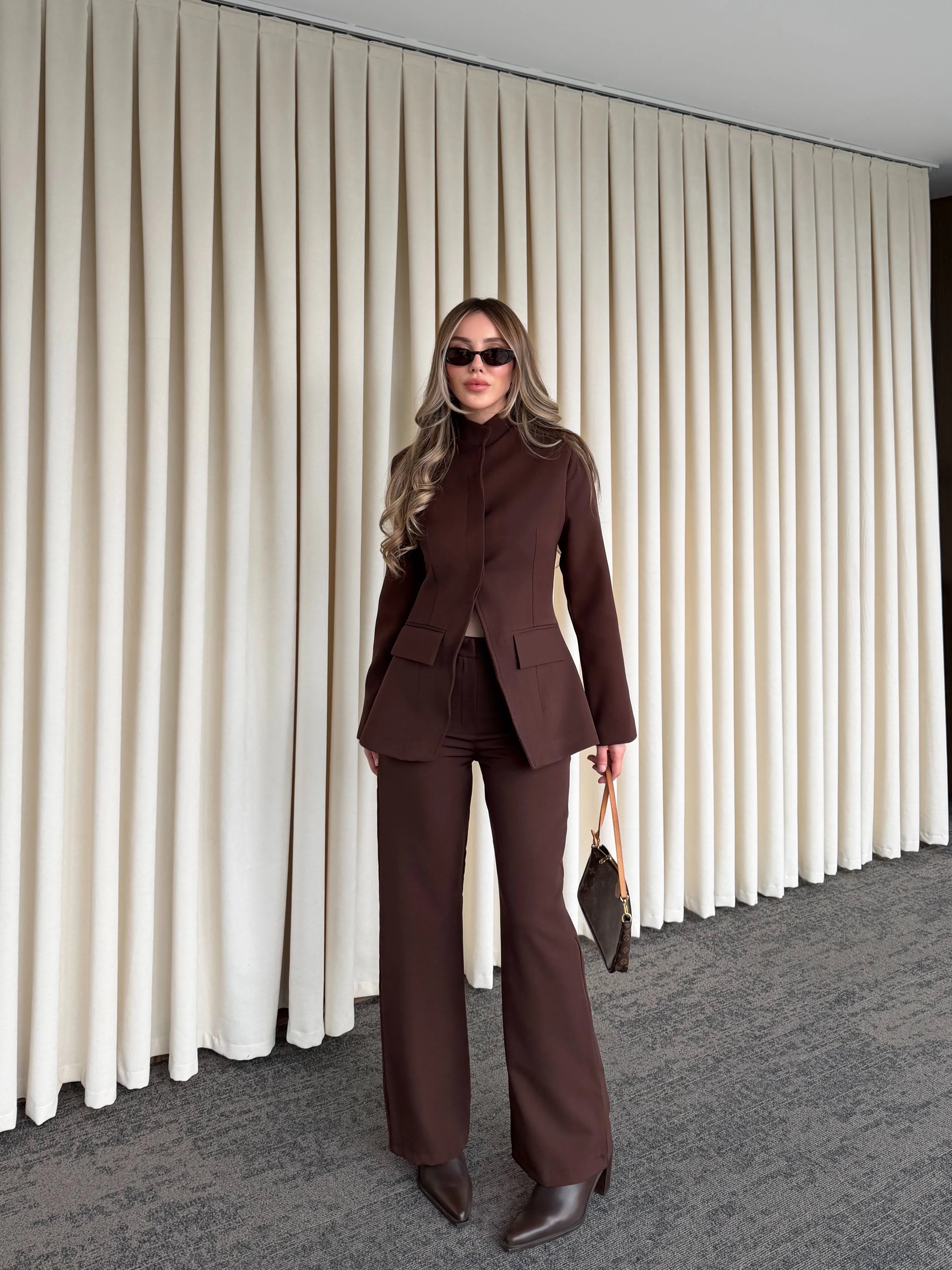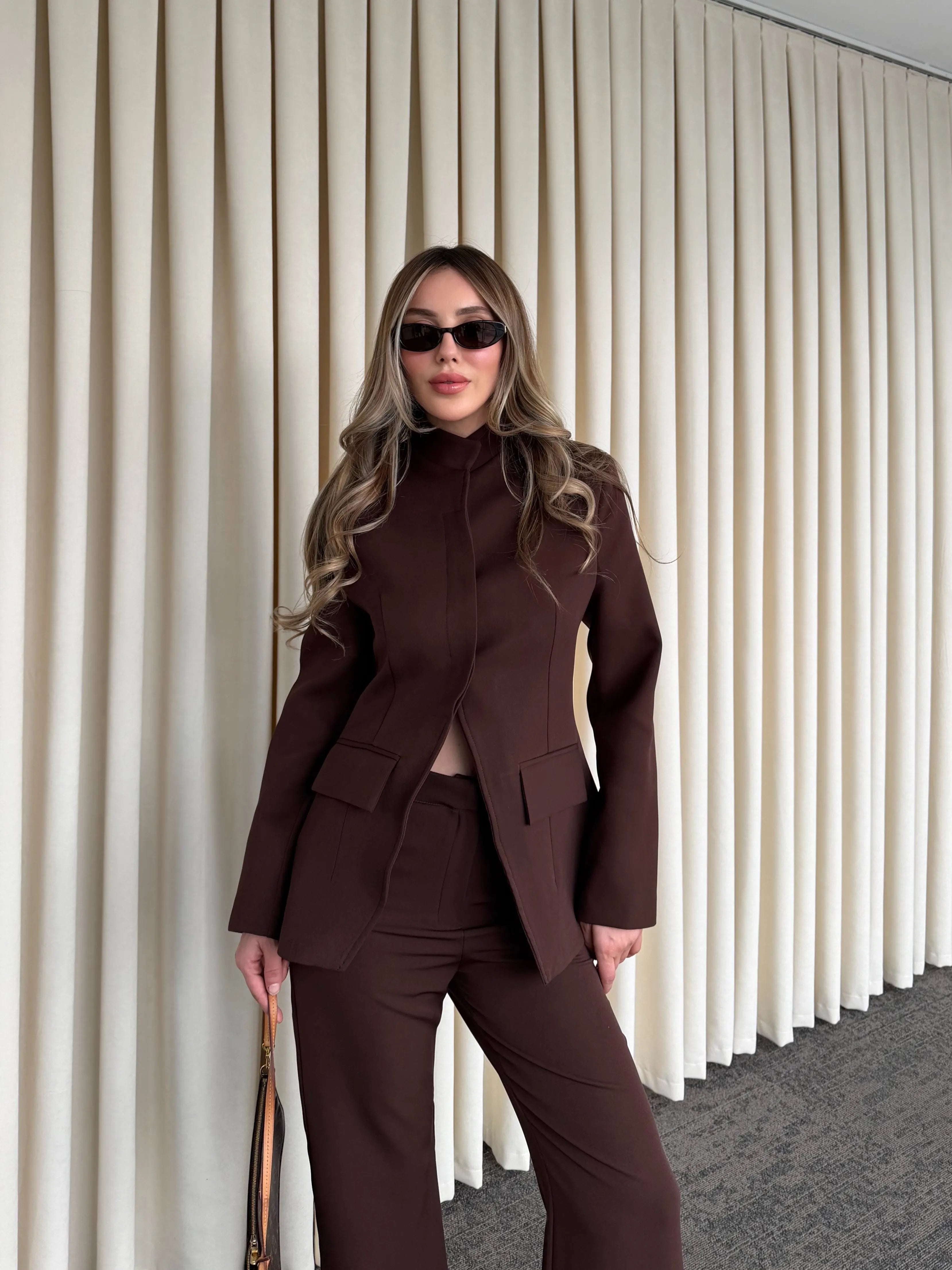 Hakim yaka detayıyla modern ve iddialı bir duruş sunan bu takım, minimal çizgileriyle maksimum etki yaratır. Boynu zarifçe saran yaka formu, tasarıma keskin ve karakterli bir hava katarken; vücuda oturan ceket kesimi feminen hatları kusursuzca ortaya çıkarır.