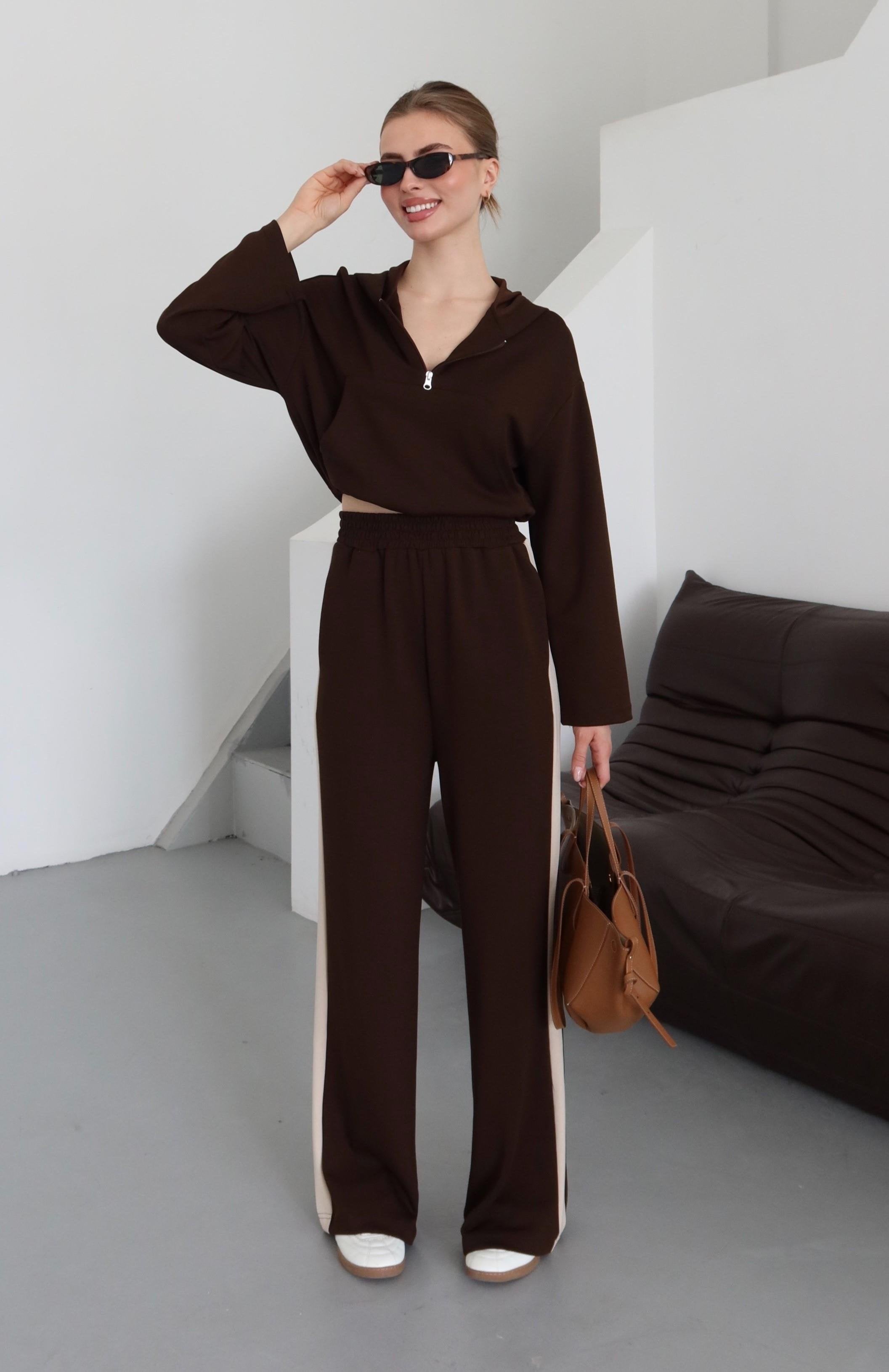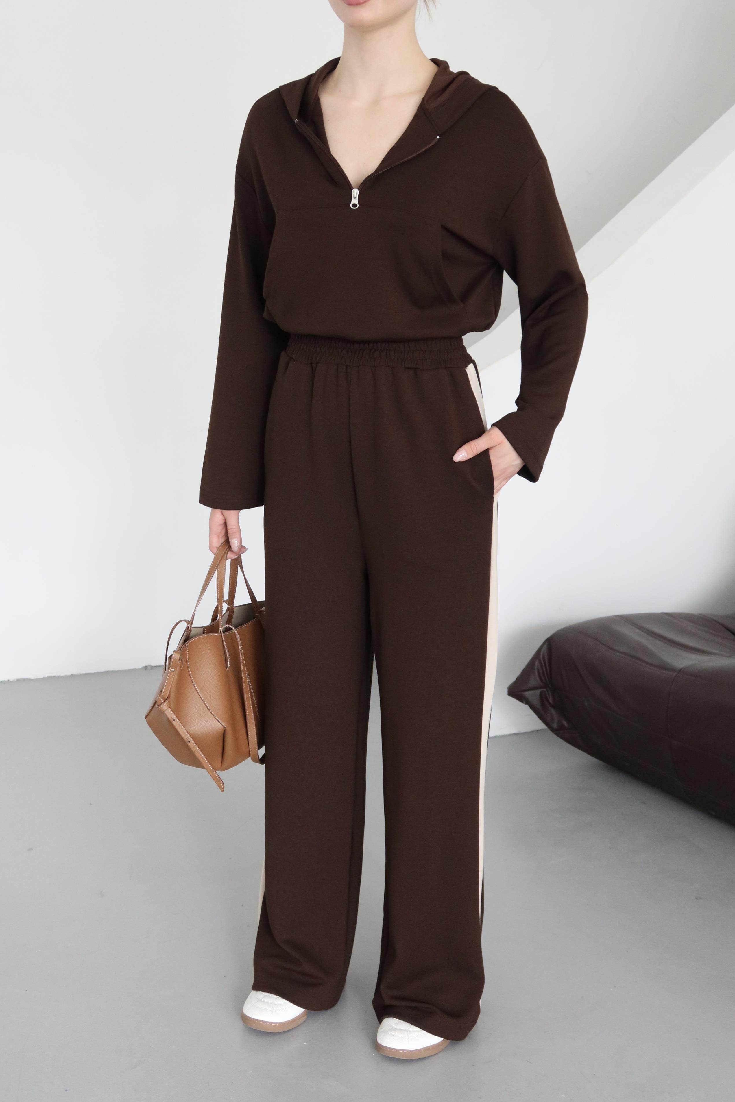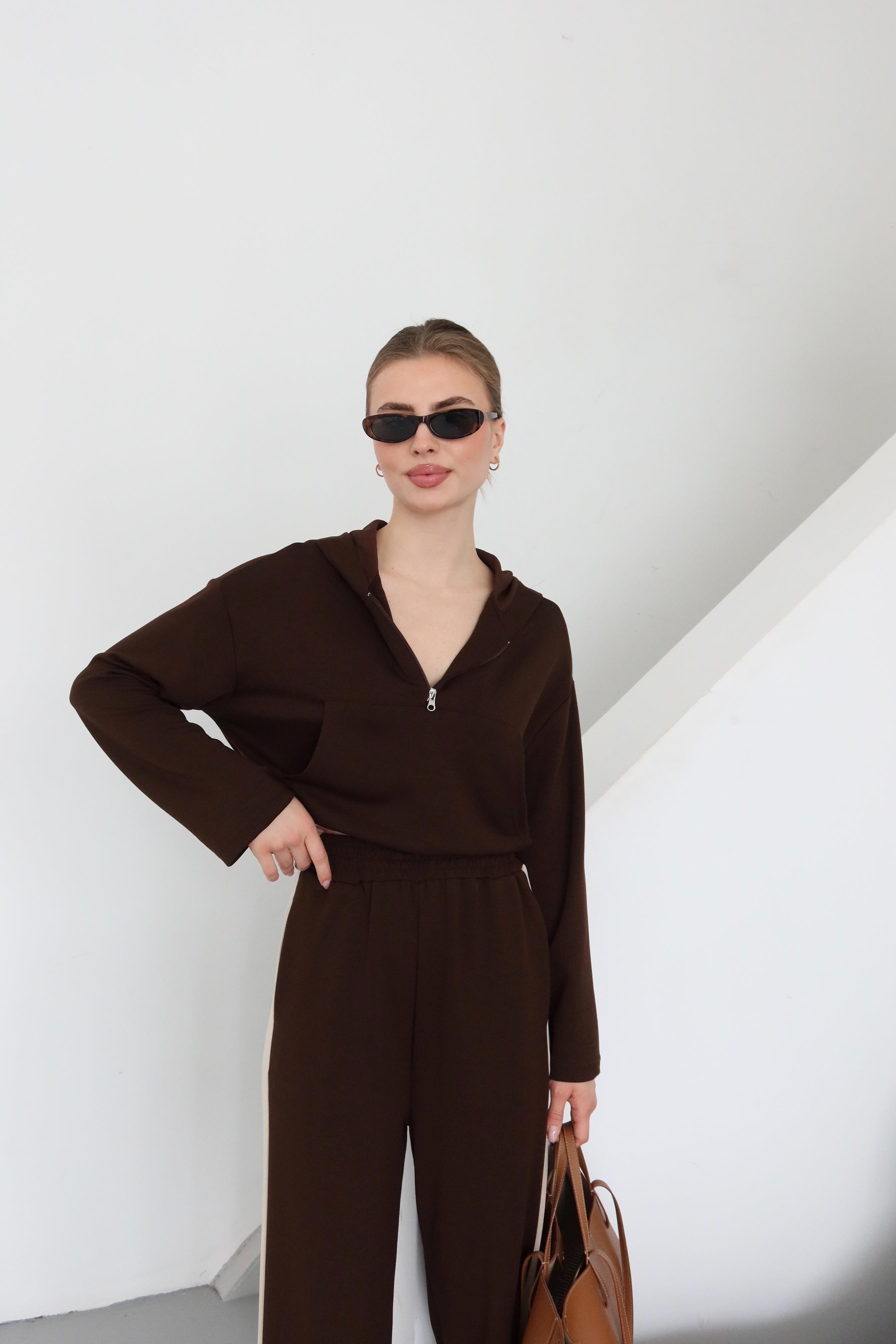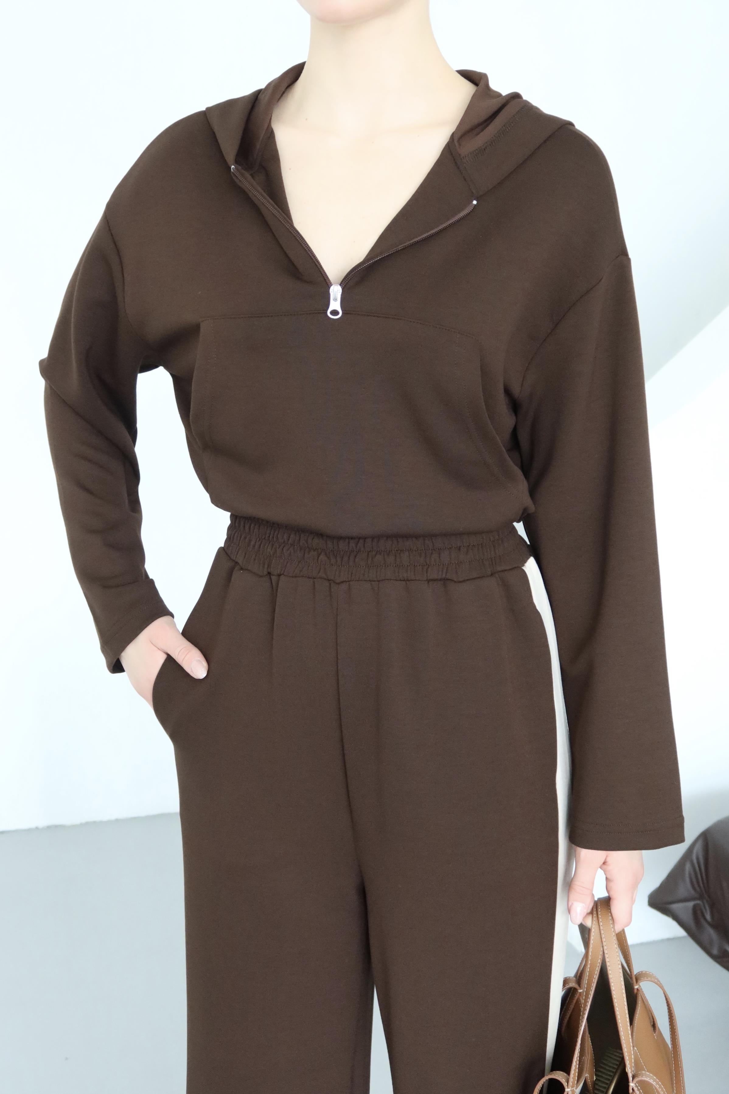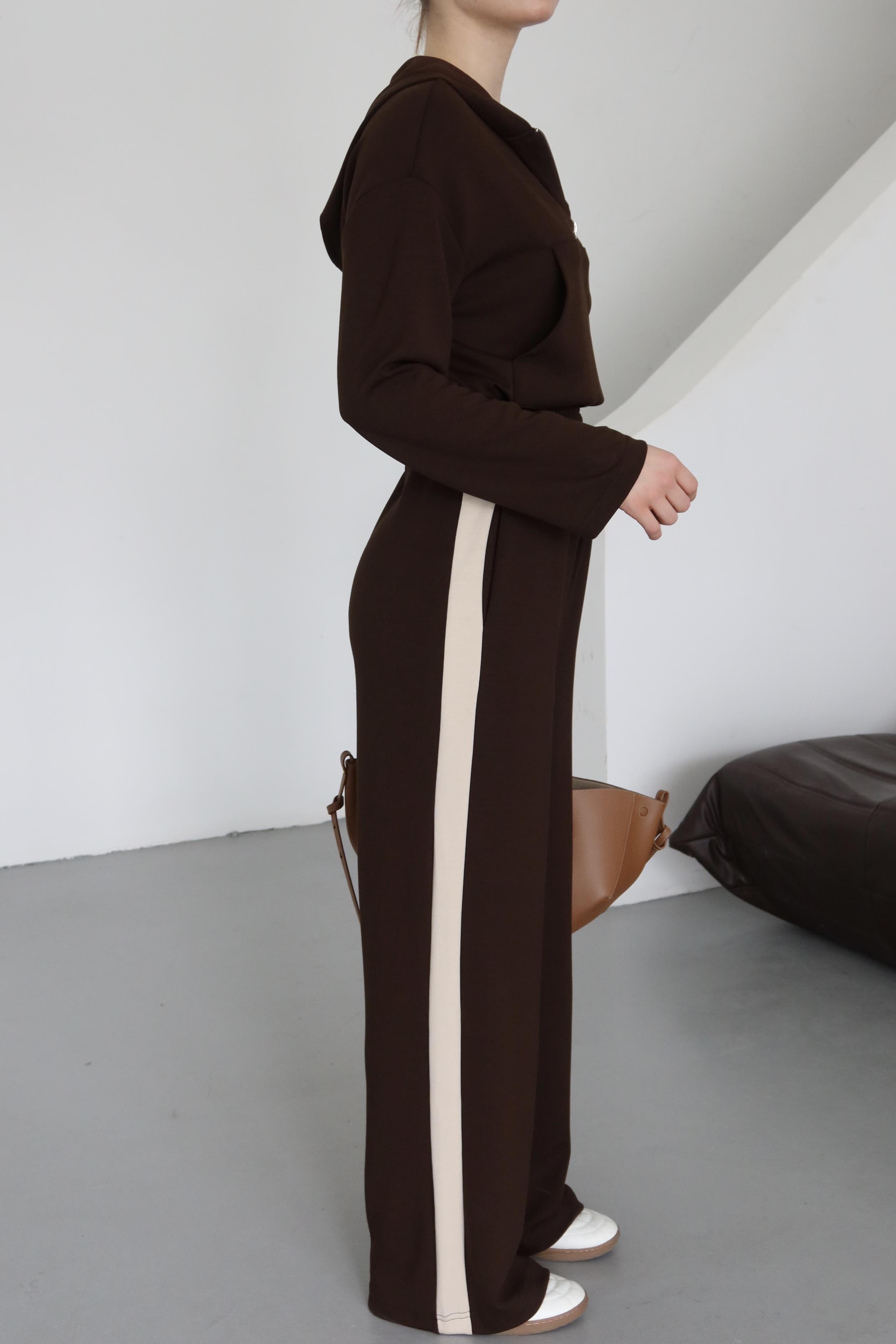 Kahverengi Kapüşonlu Garnili Takım