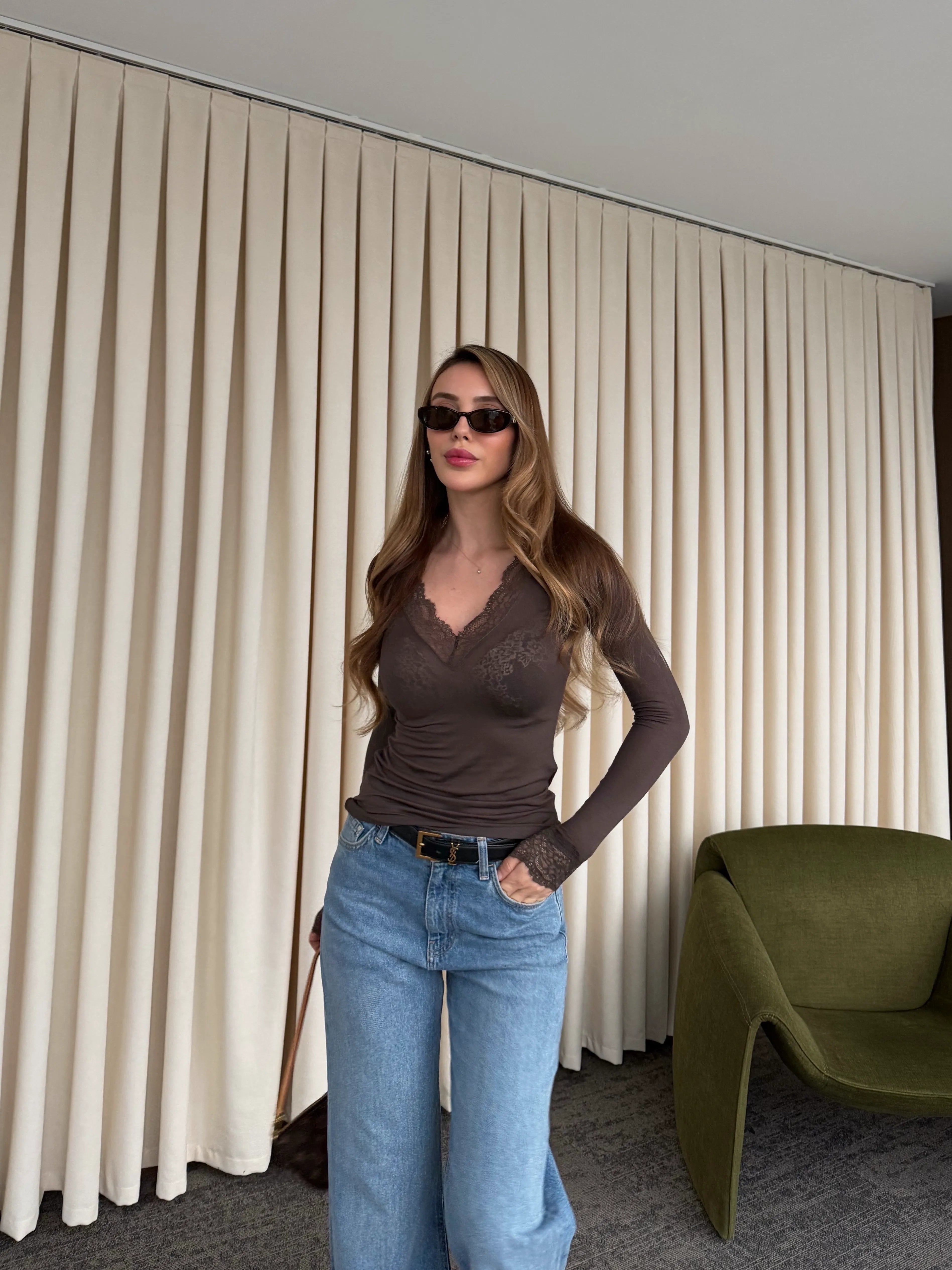 - Kahverengi Kaşmir Dokulu Dantel Detaylı V Yaka Bluz - 1727