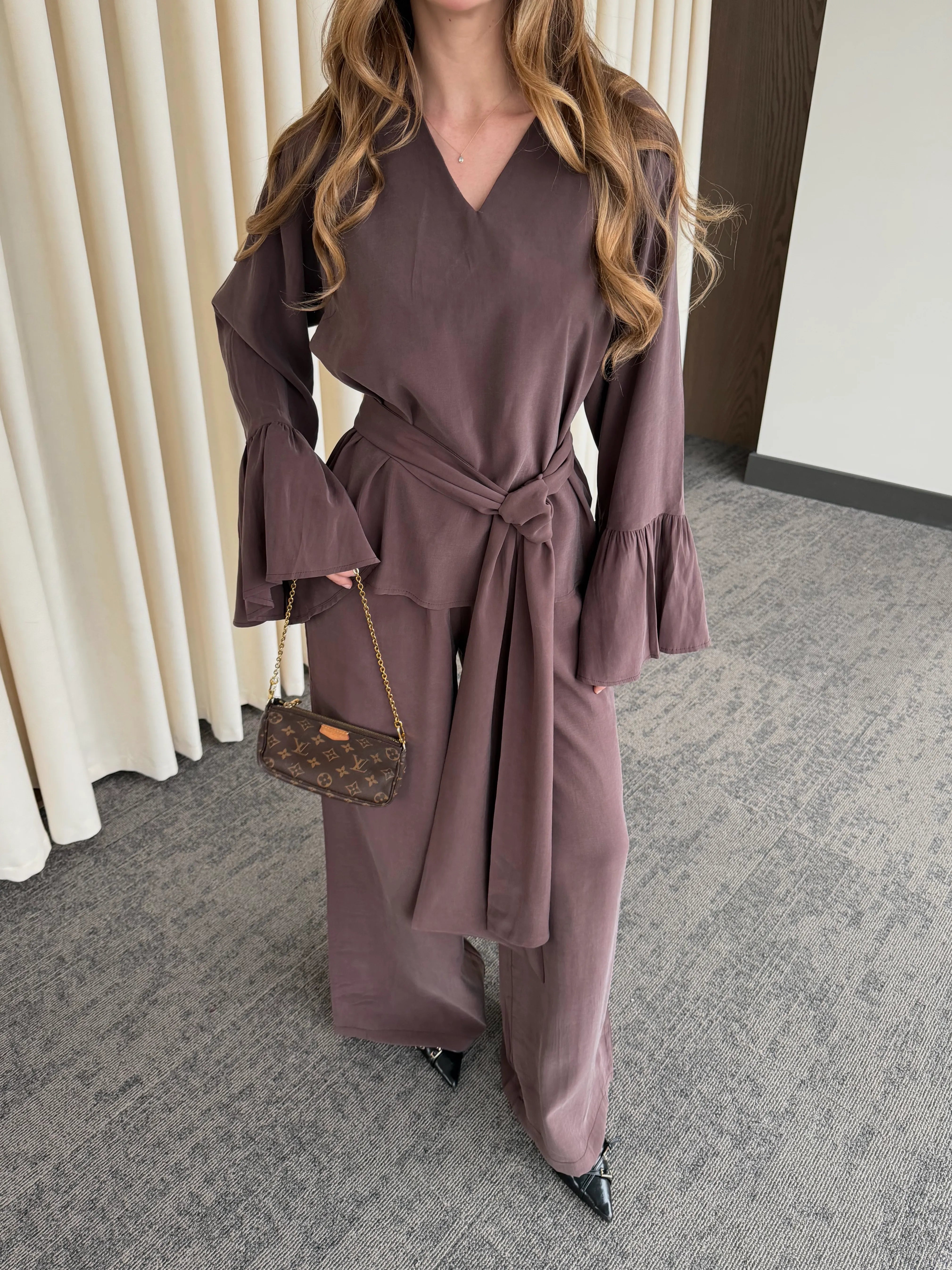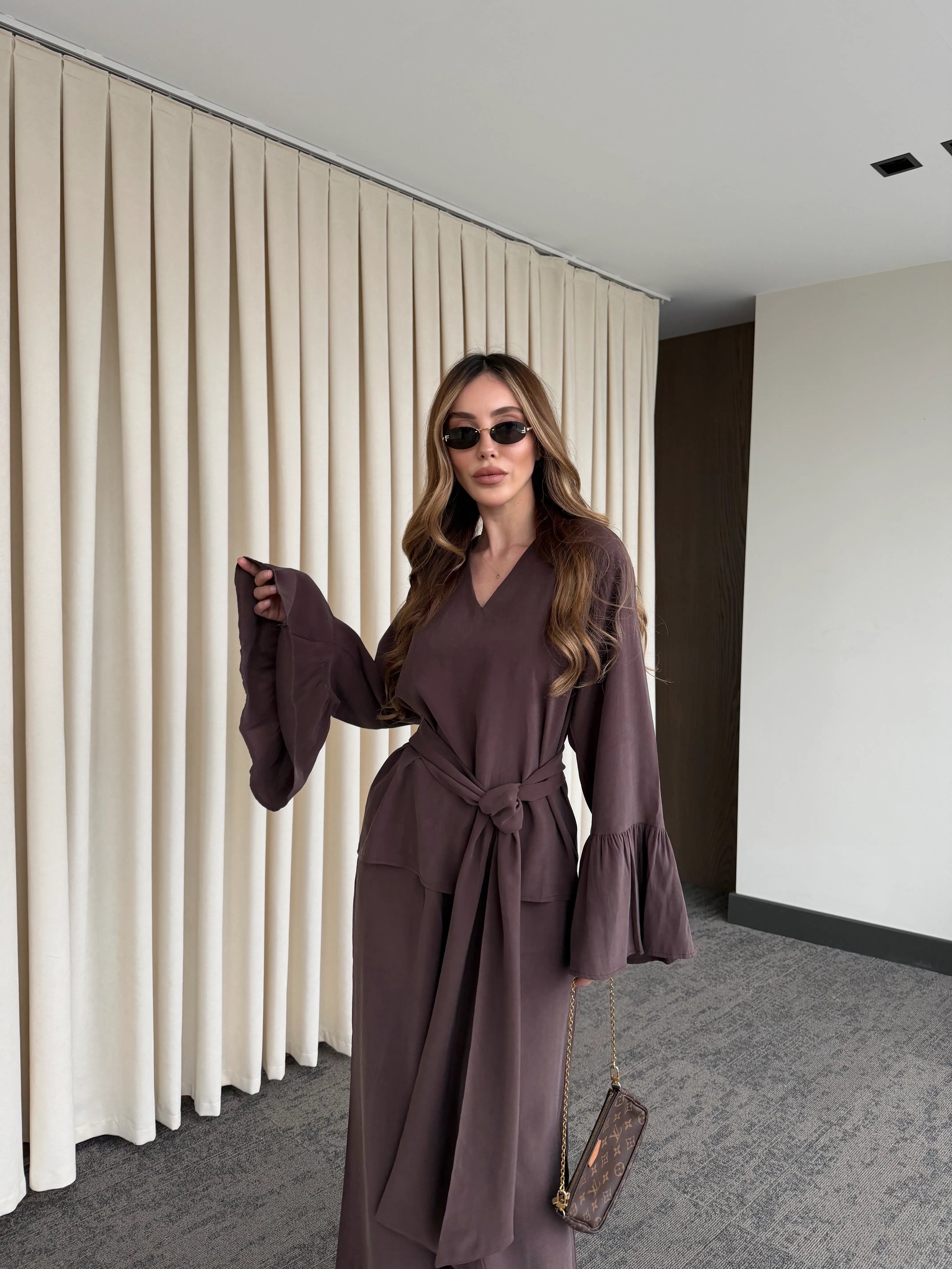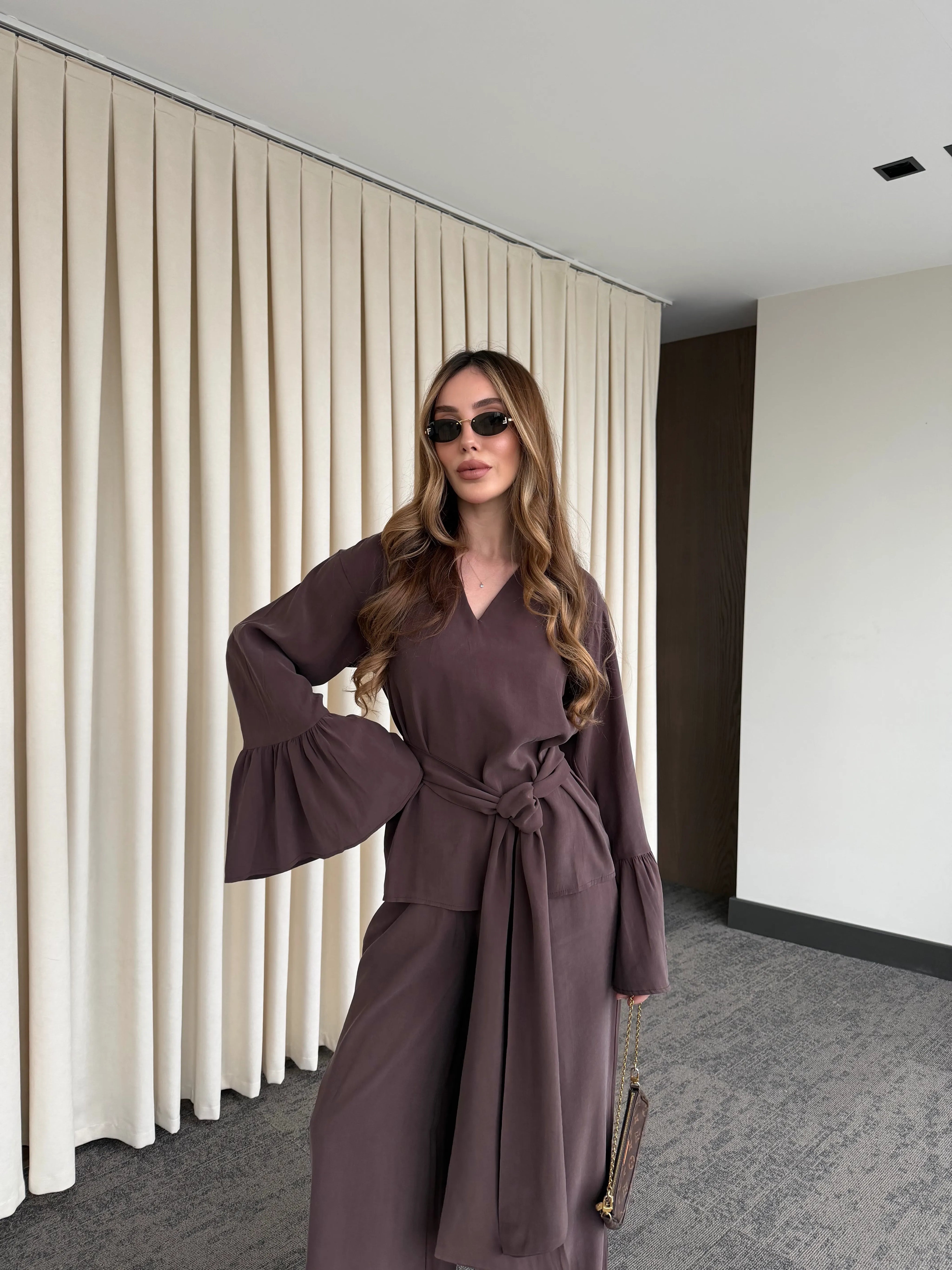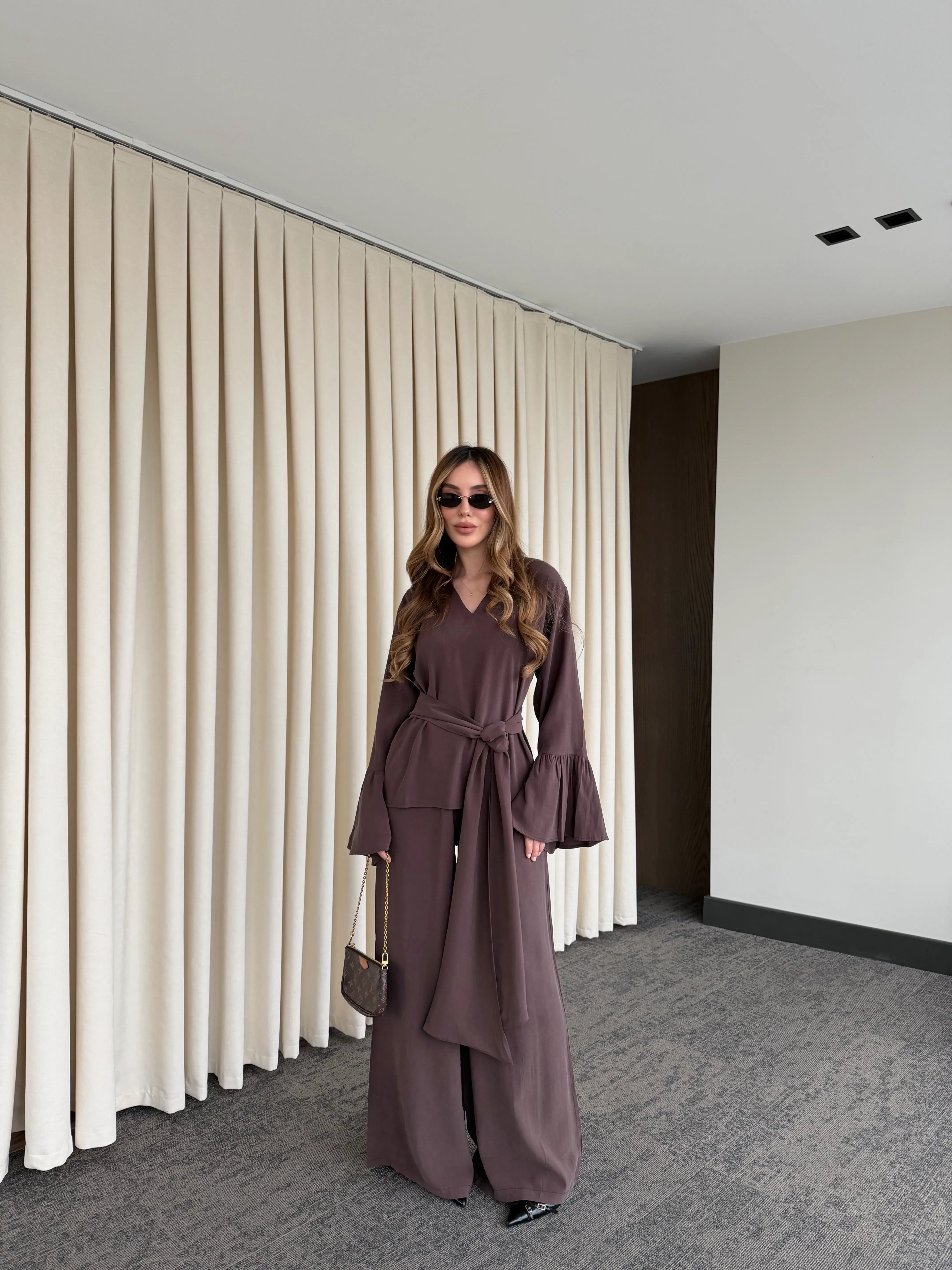 - Kahverengi Kolları Volanlı Bluz Pantolon Takım - 0812