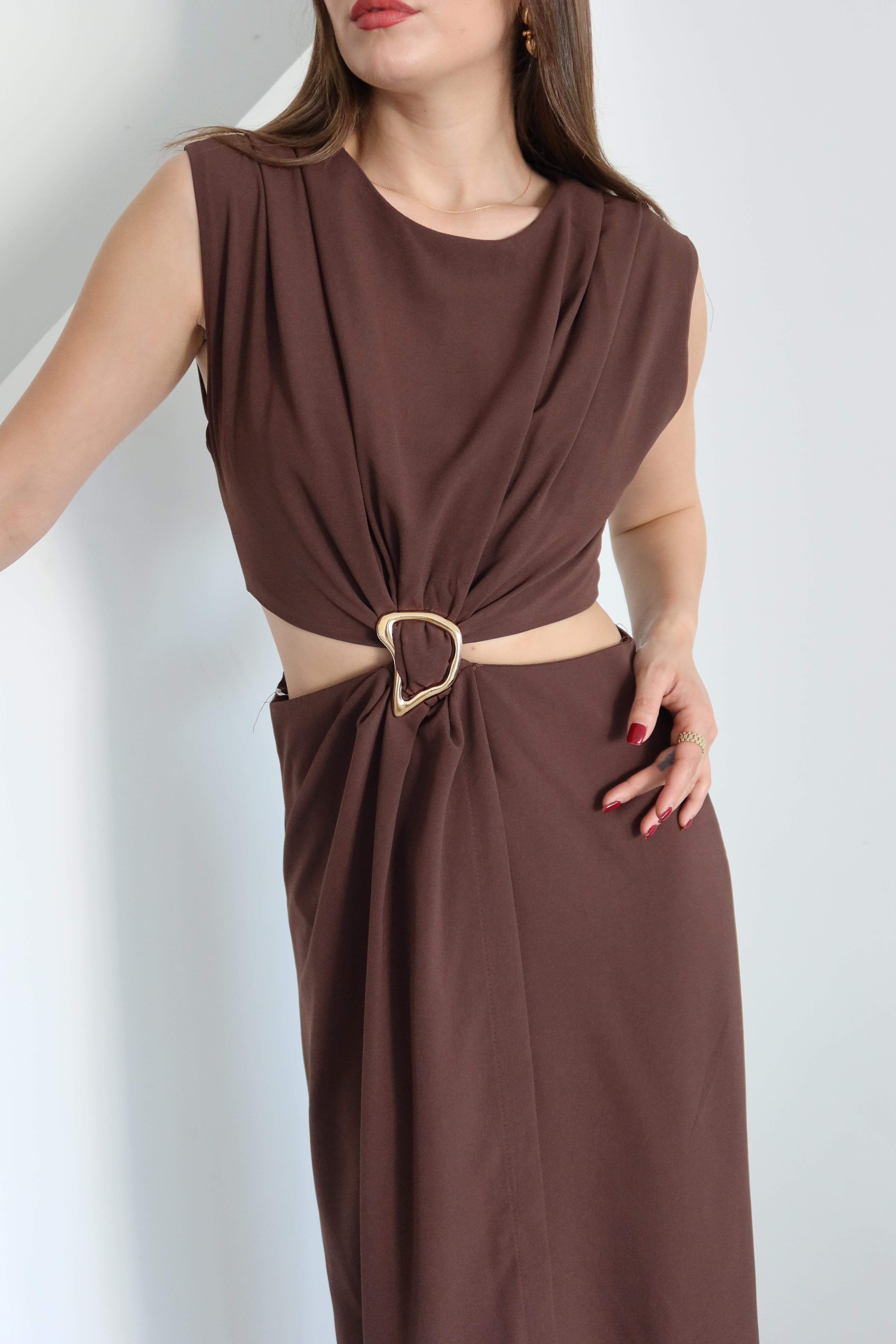 - Kahverengi Önden Tokalı Yan Dekolteli Elbise