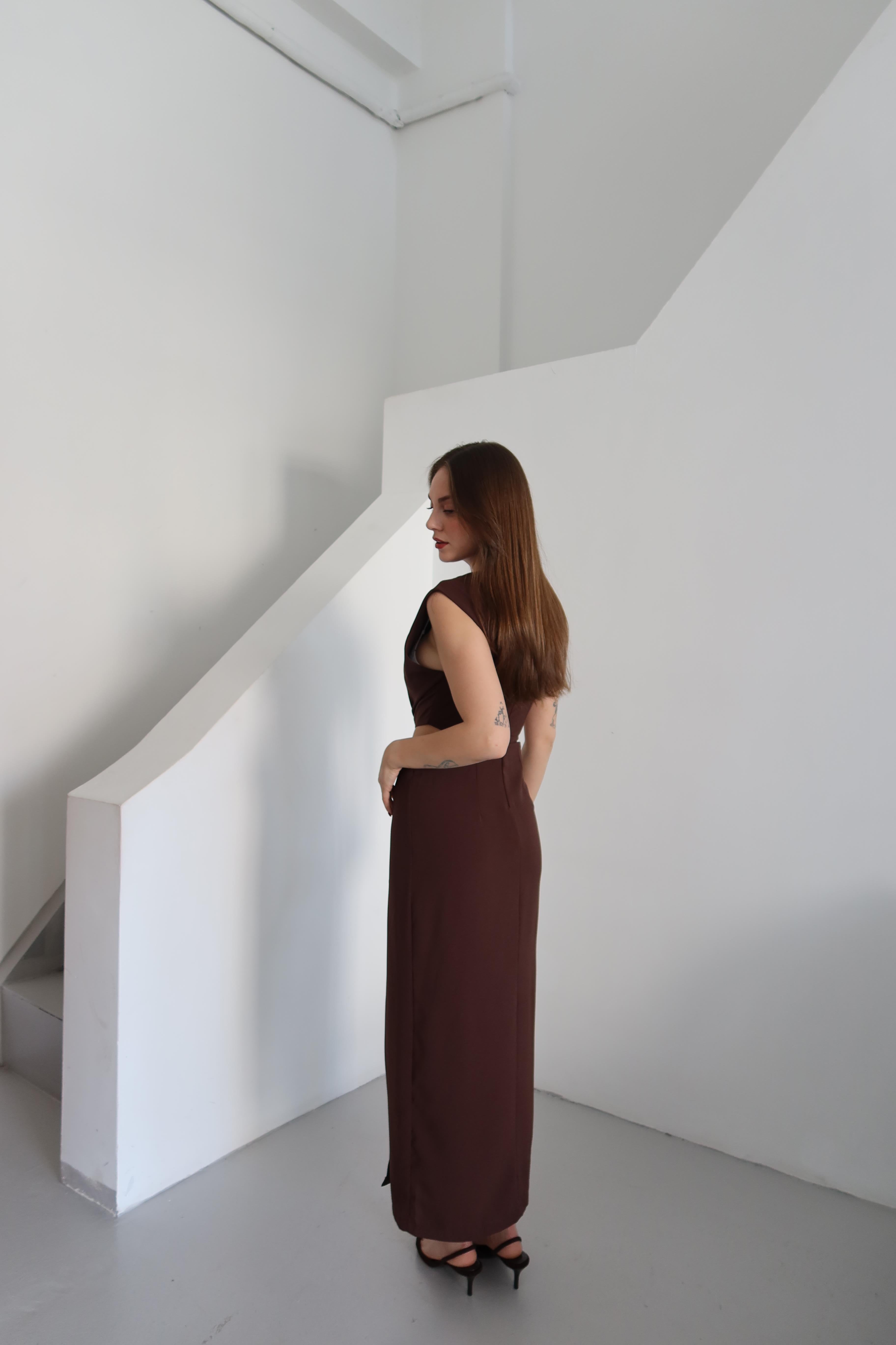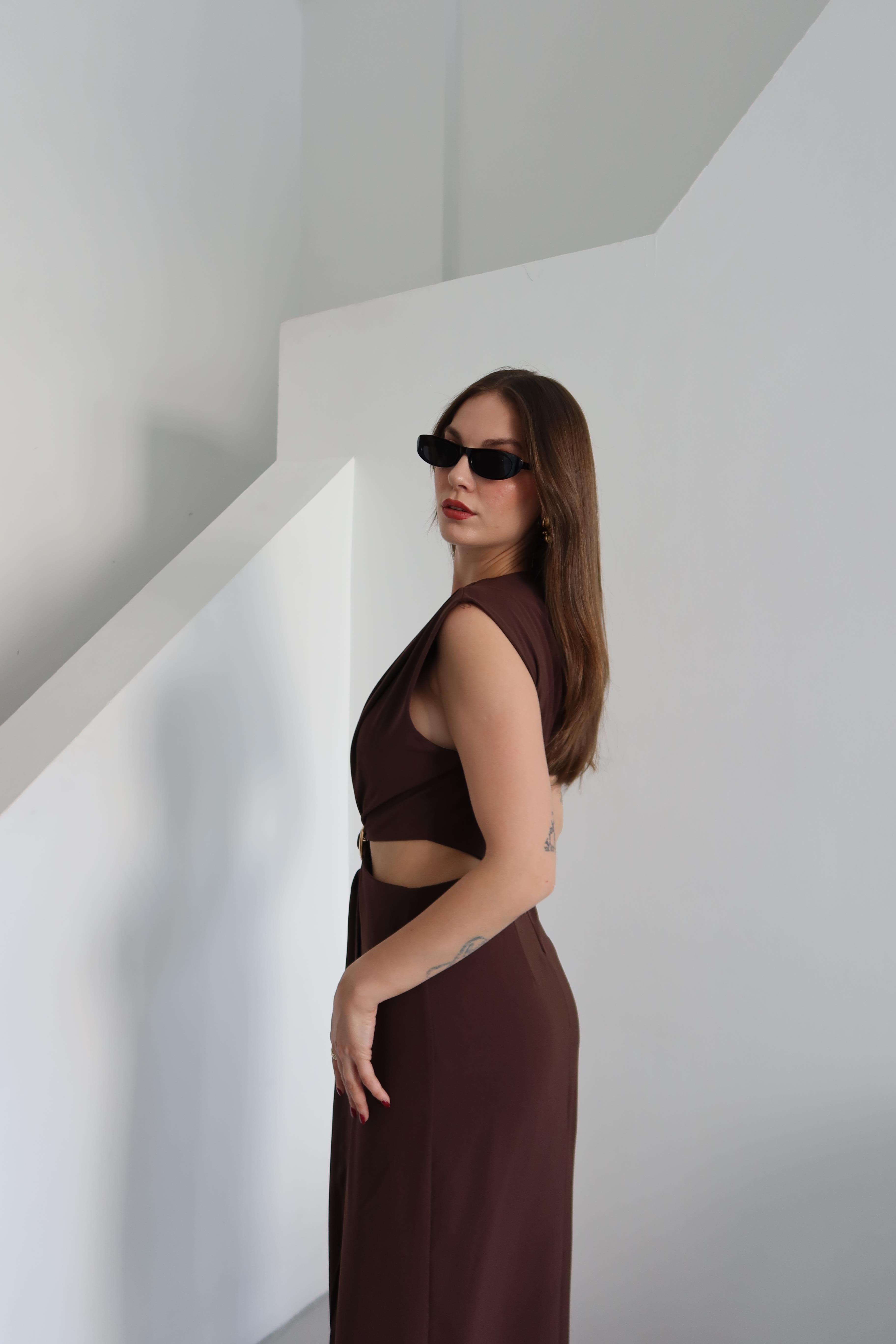 Kahverengi Önden Tokalı Yan Dekolteli Elbise