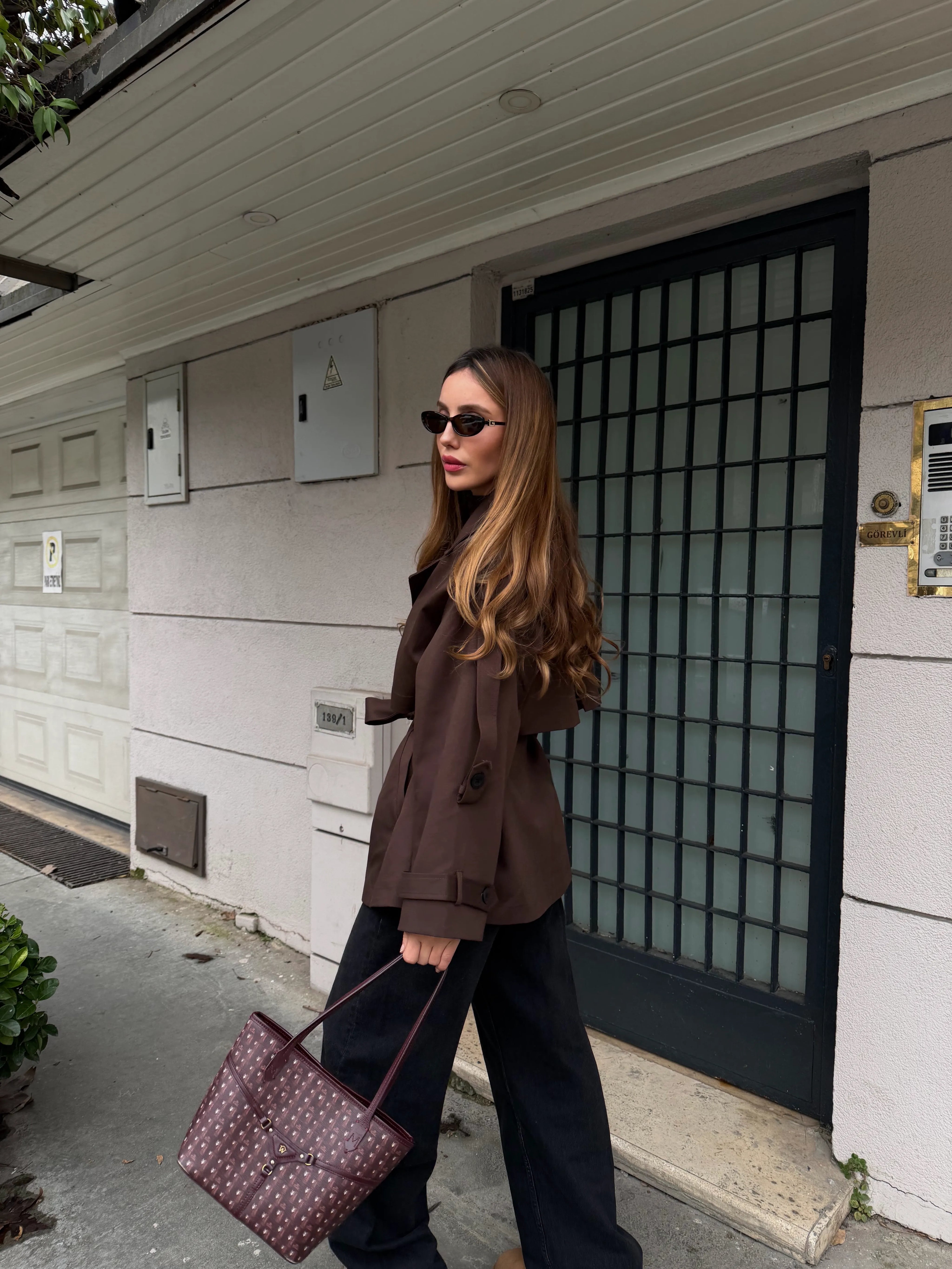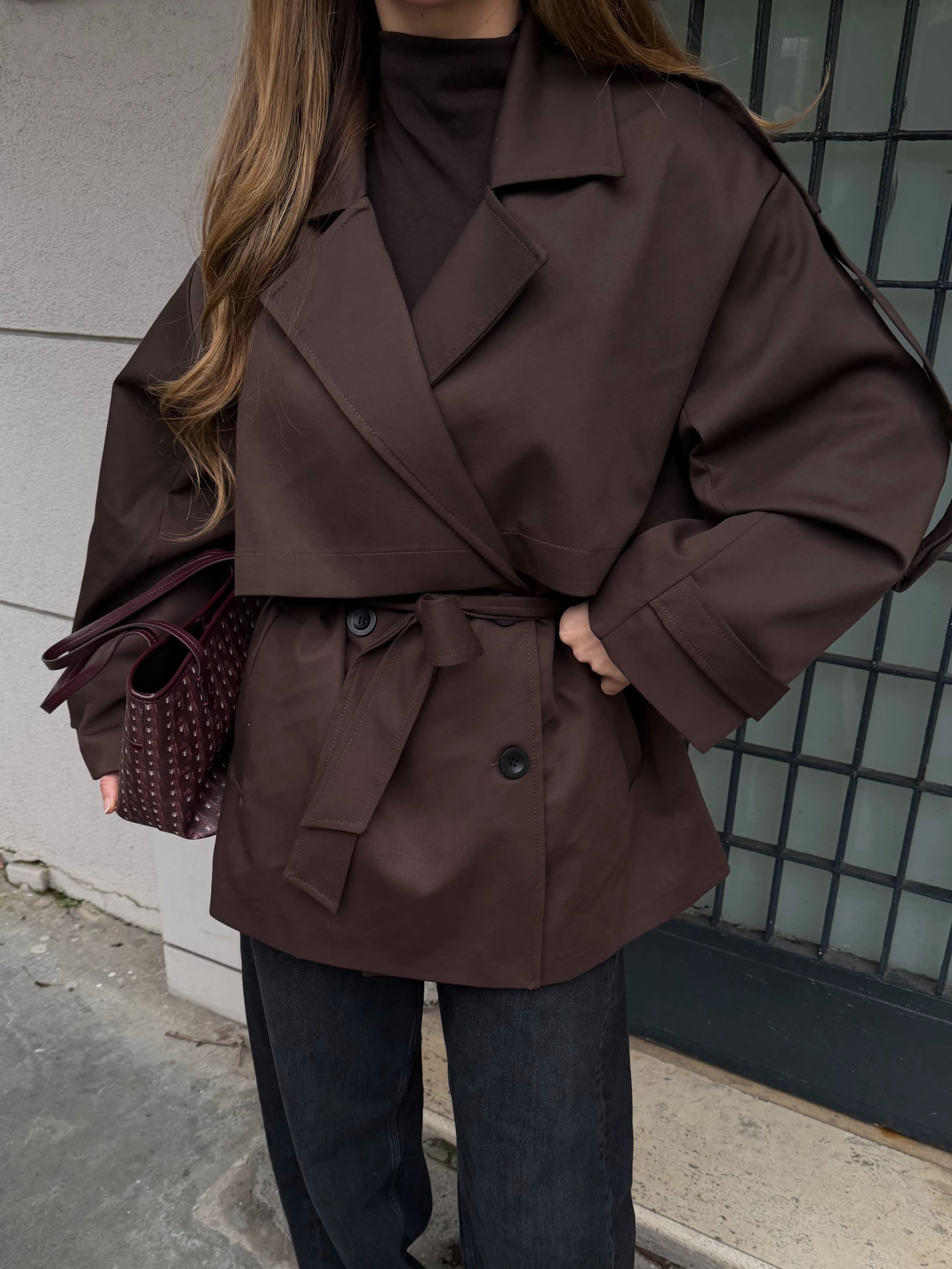 - Kahverengi Oversize Düşük Omuz Kısa Trenç - 9580