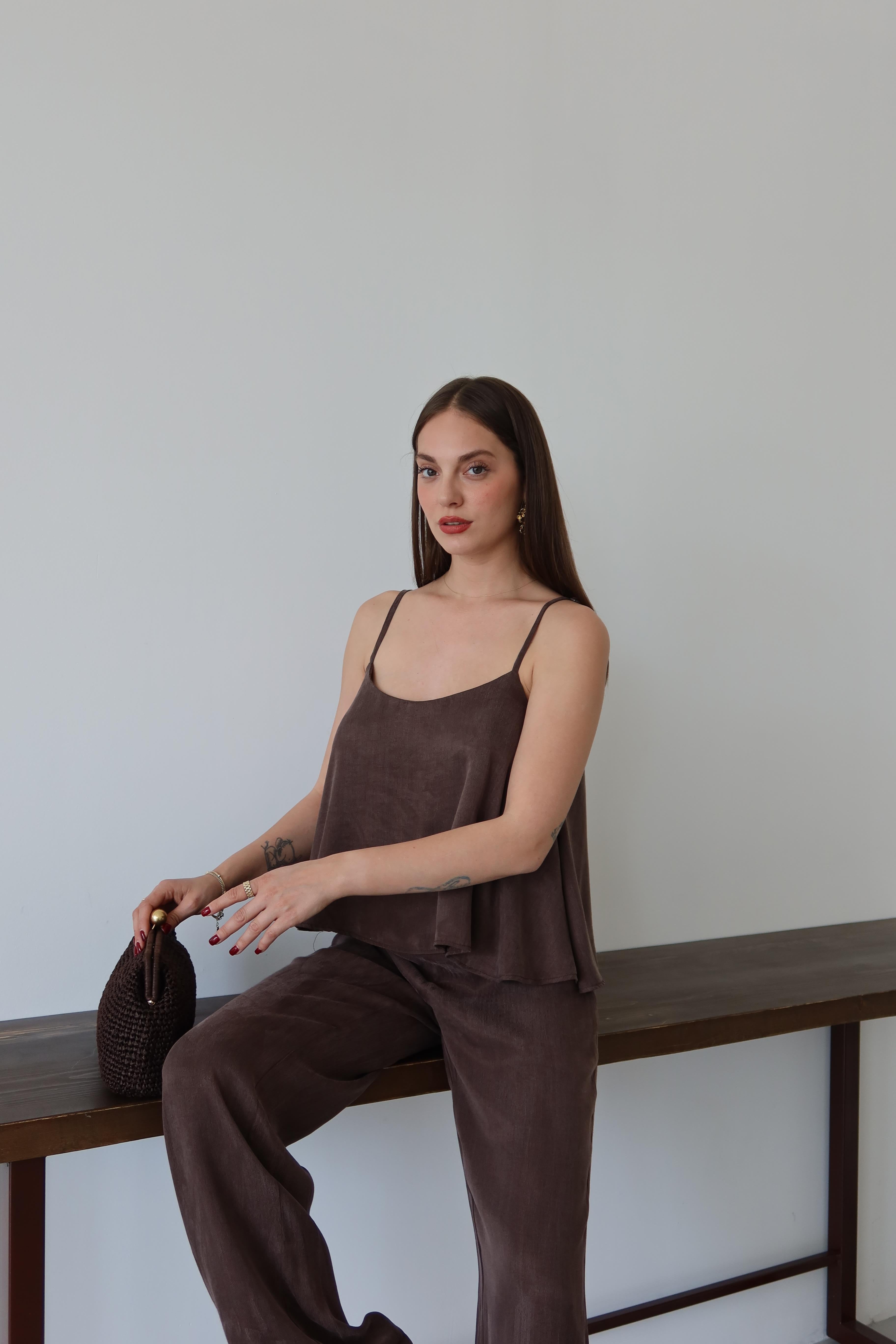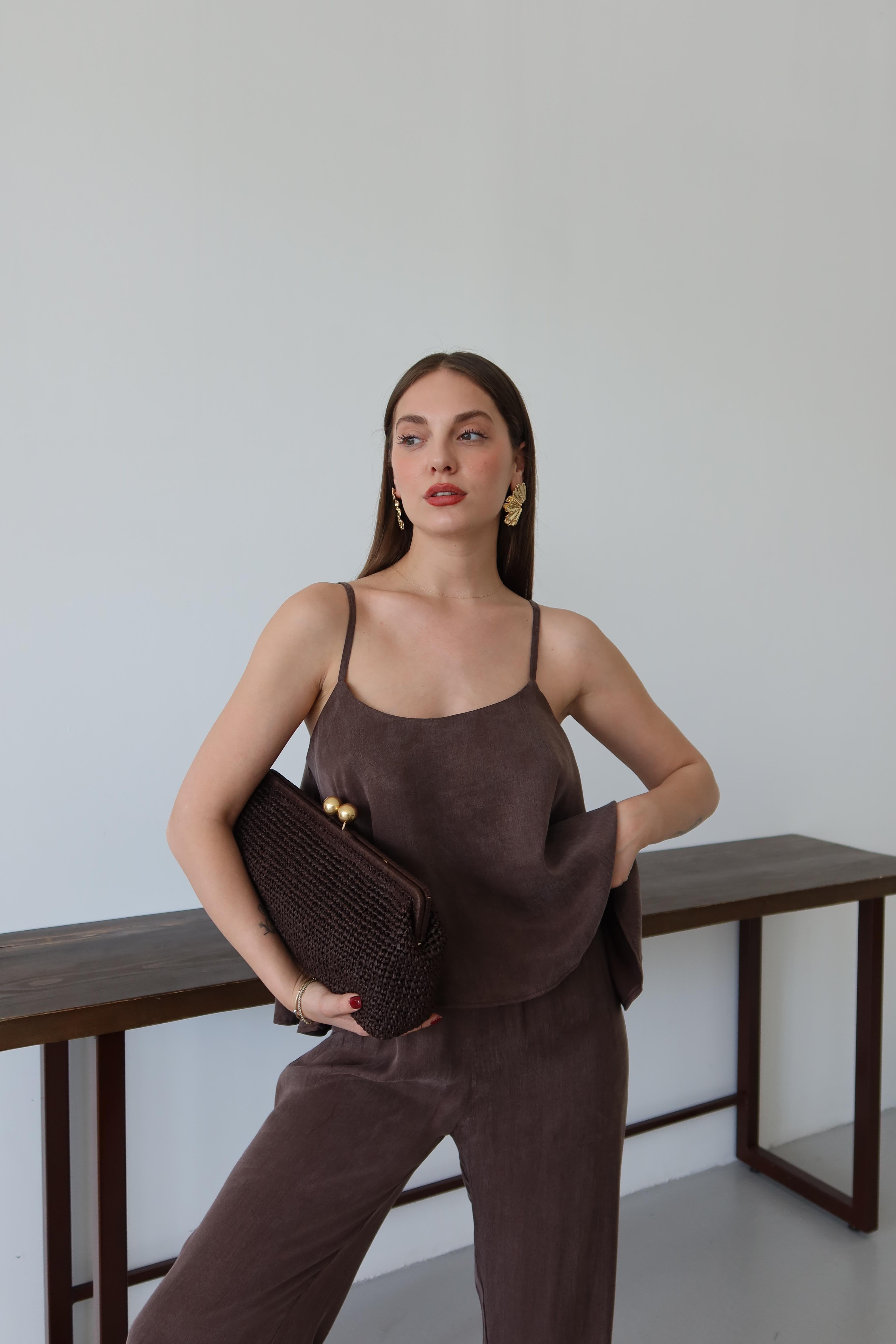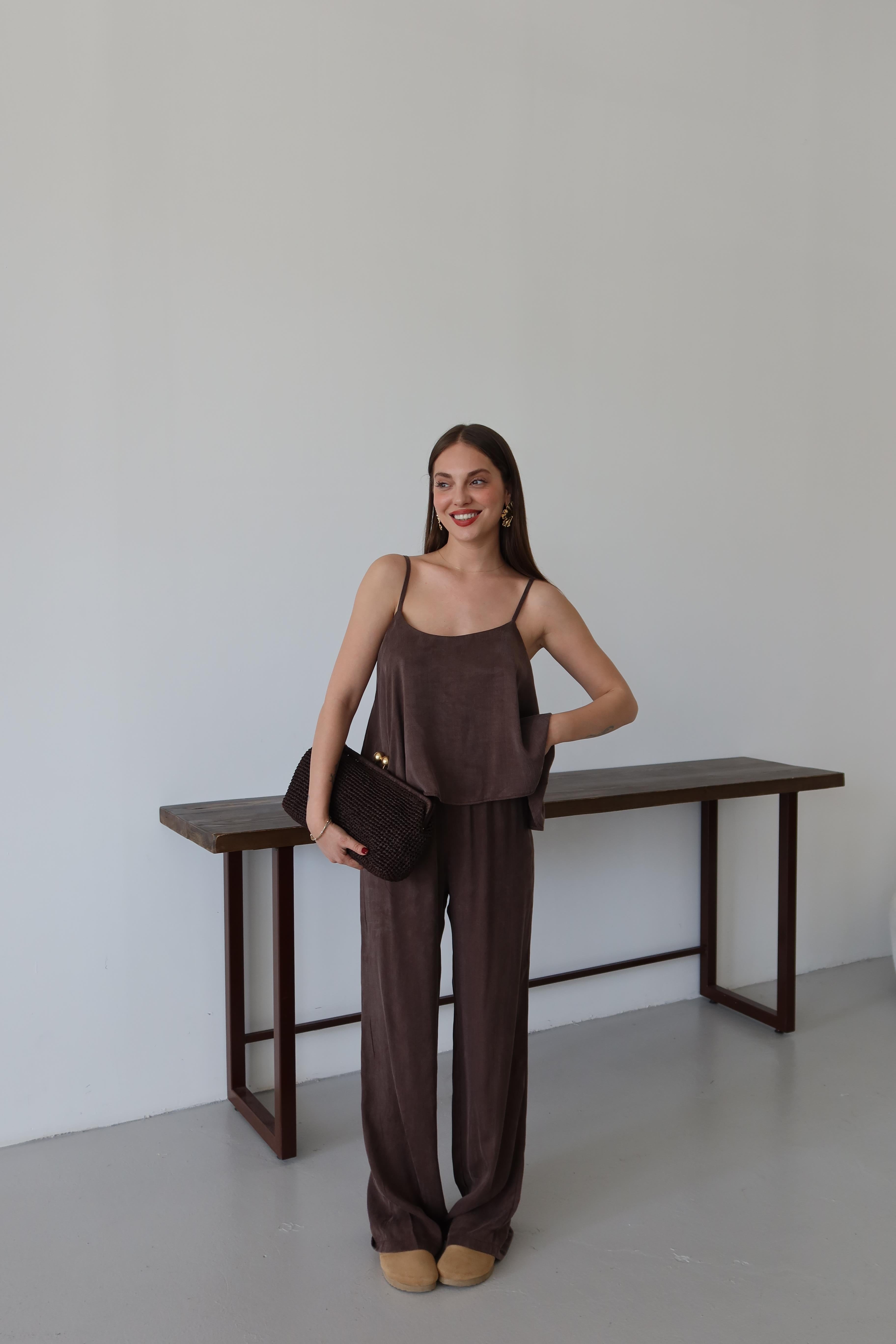 - Kahverengi Saten Görünümlü Askılı Bluz Pantolon Takım