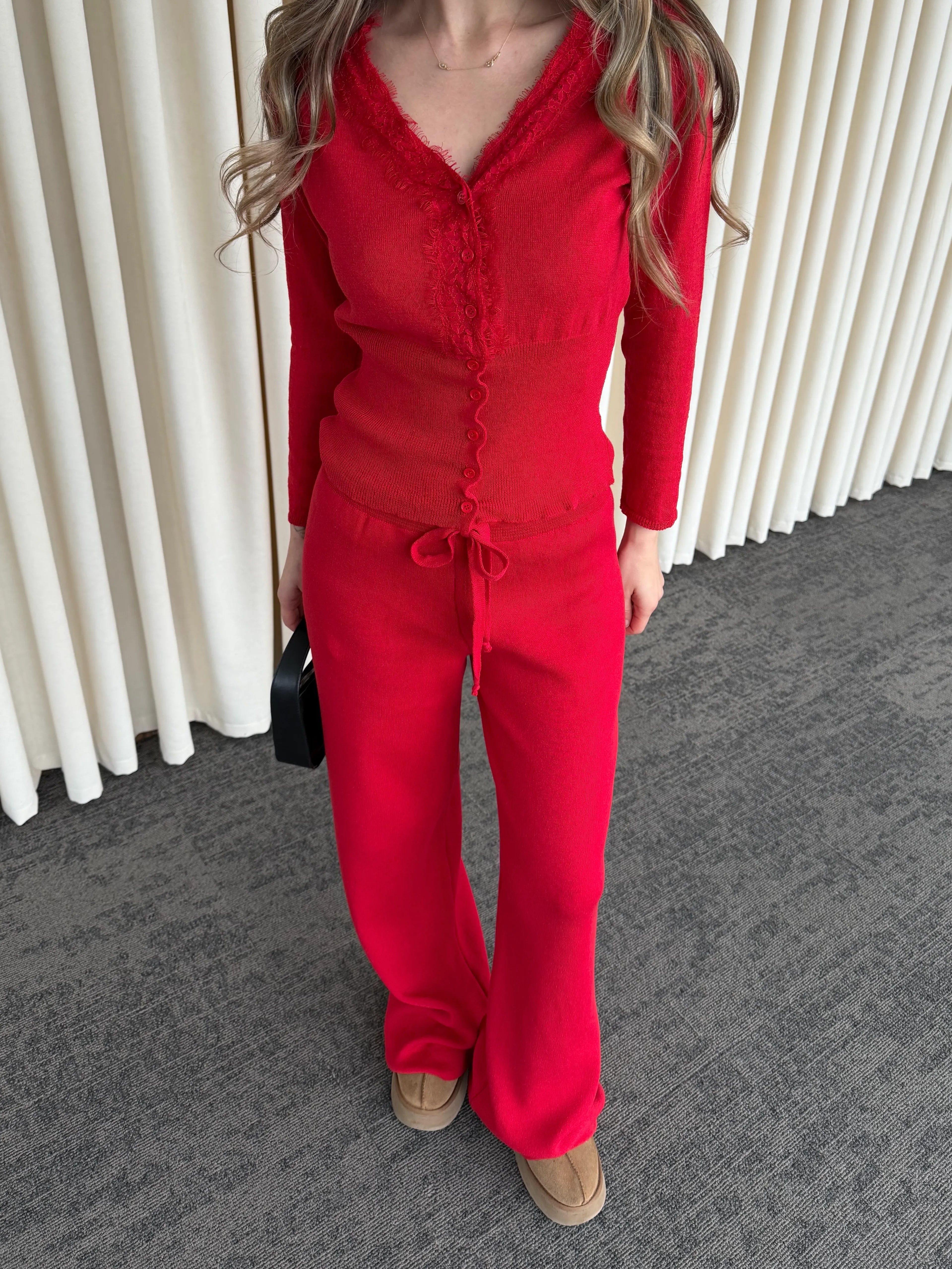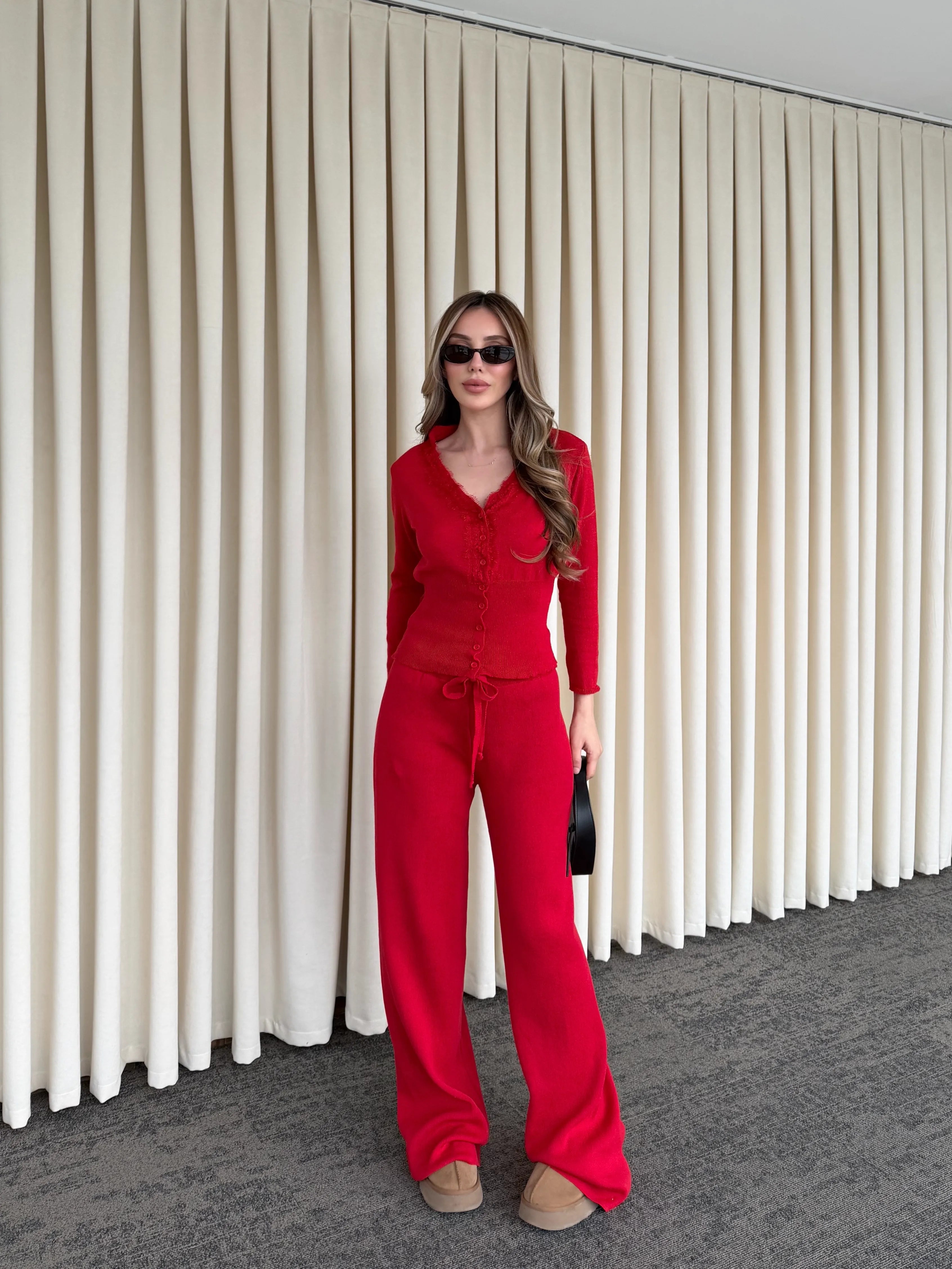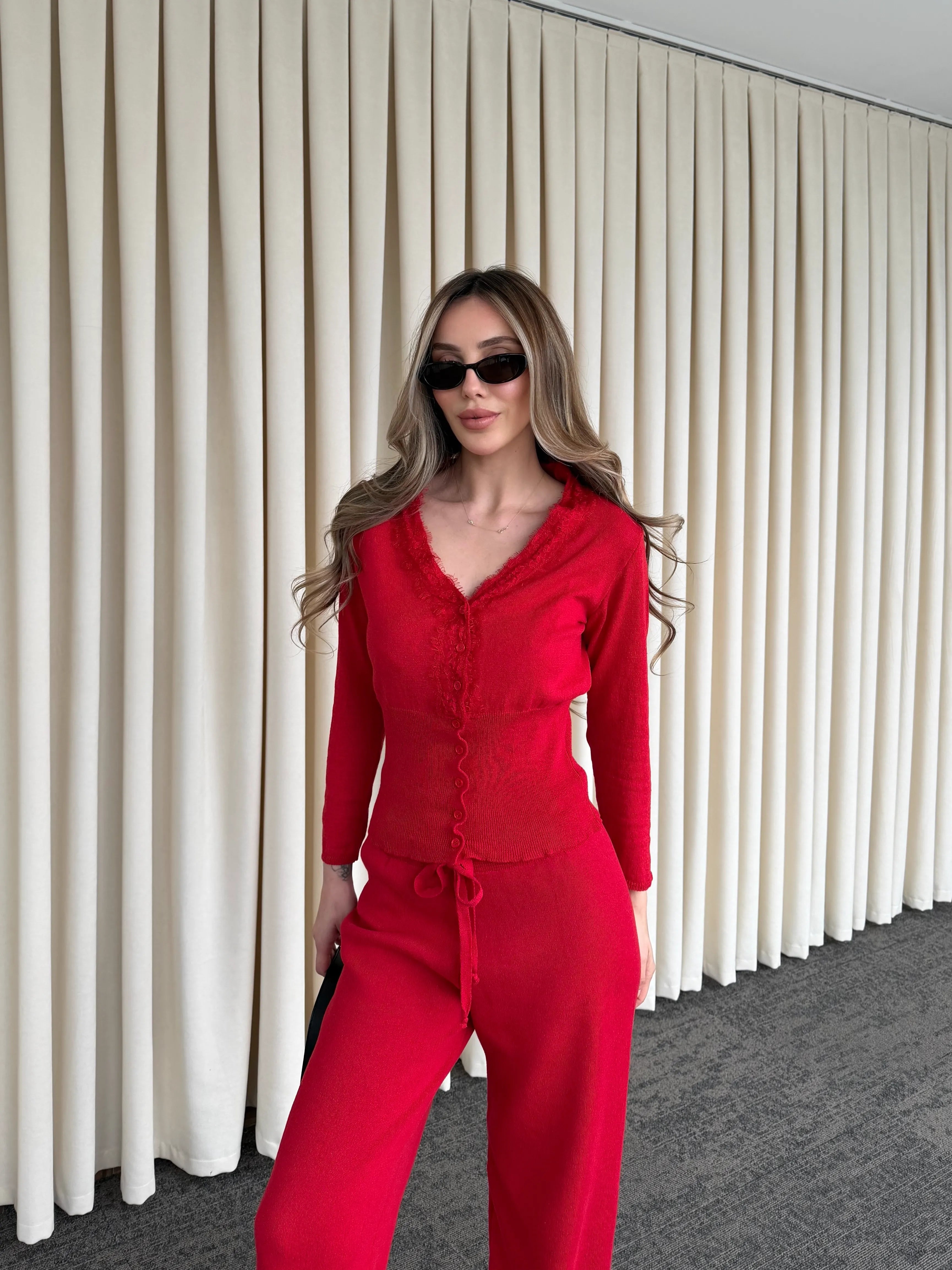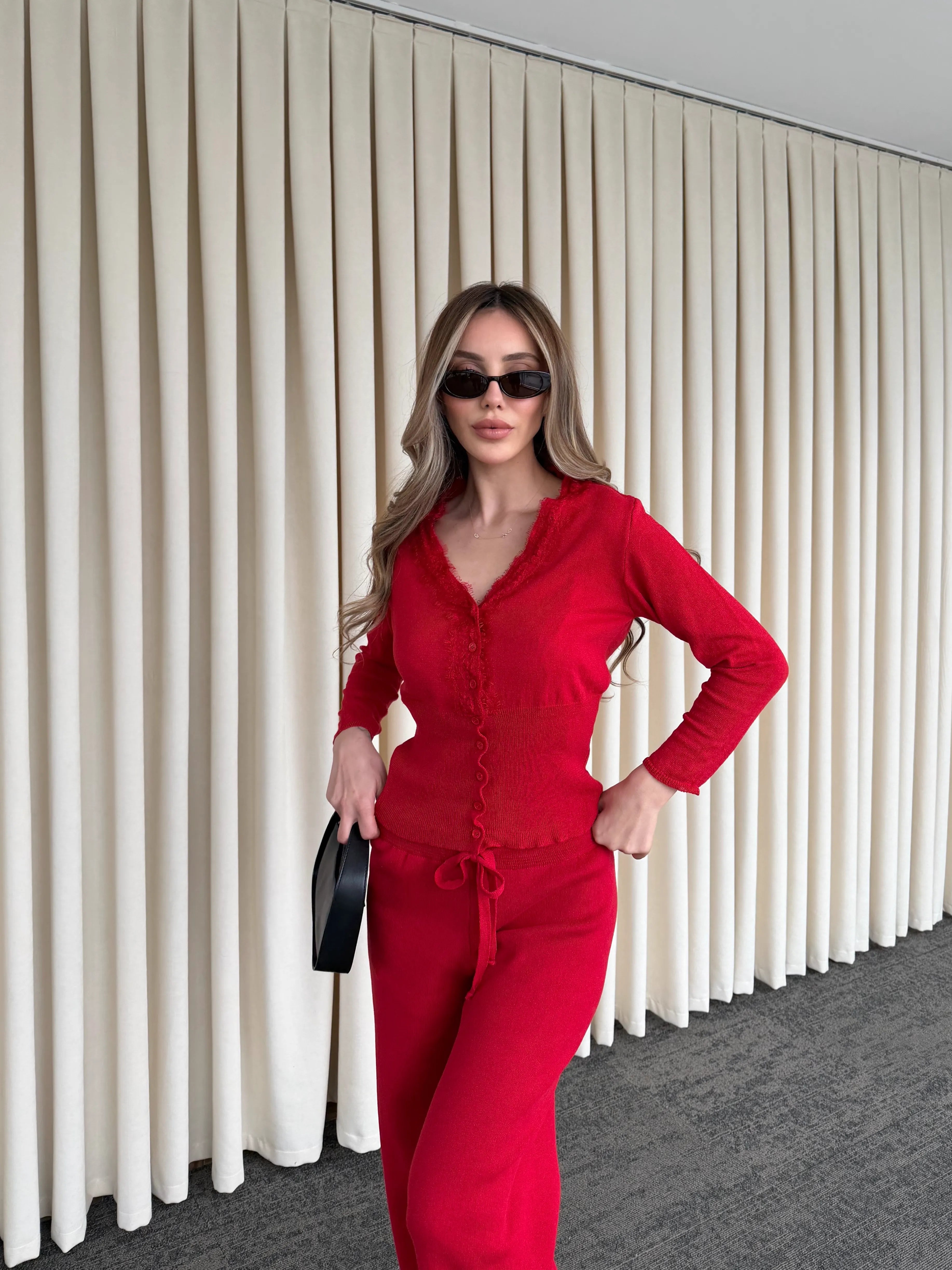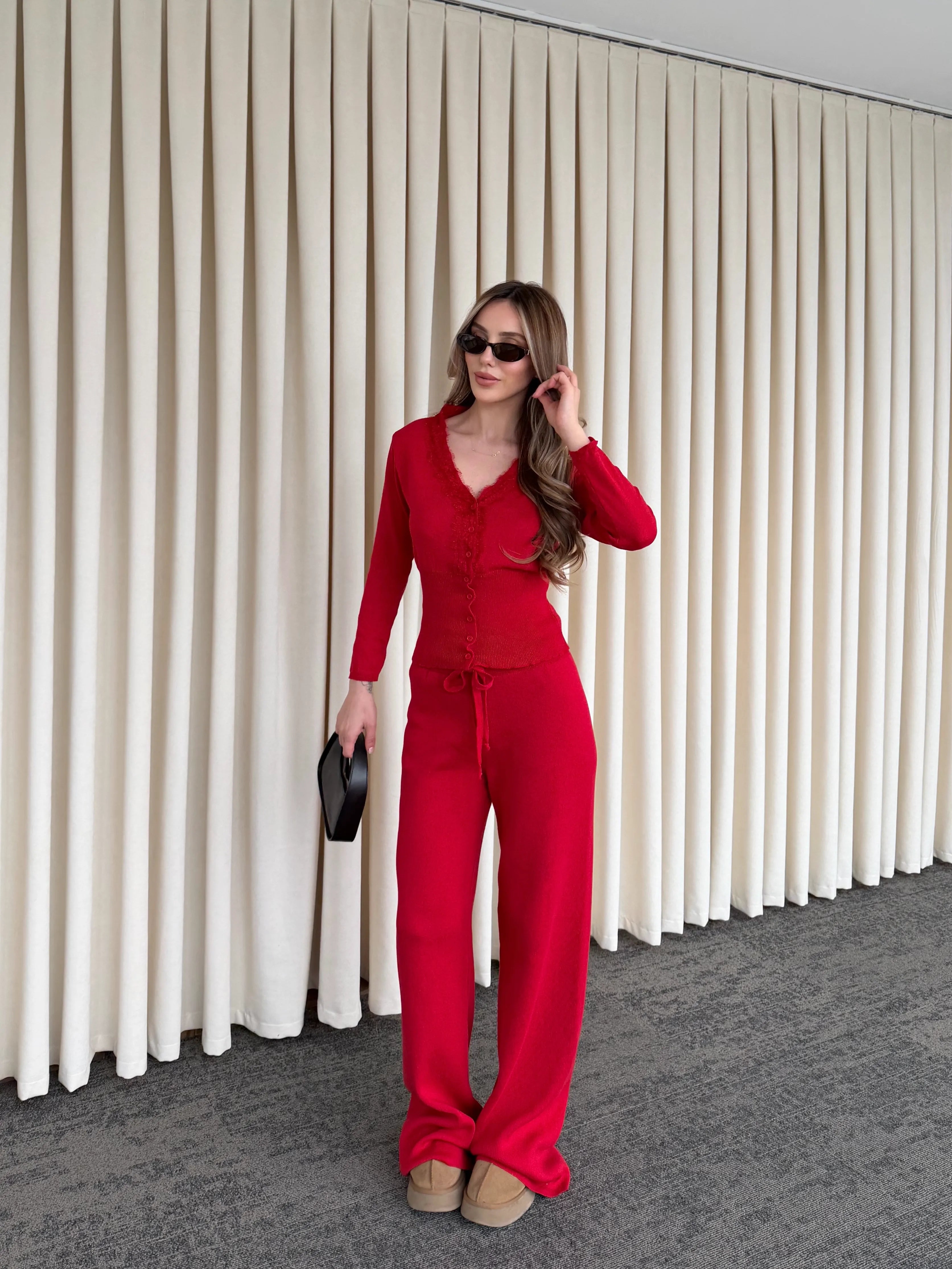 Yumuşak dokusu ve akışkan formuyla gün boyu rahat bir şıklık sunan bu takım, konforu stil ile buluşturuyor. Üst parçadaki zarif dantel detayları ve ince düğme tasarımı feminen bir hava katarken, hafif oturan kalıbı silueti dengeli gösterir.