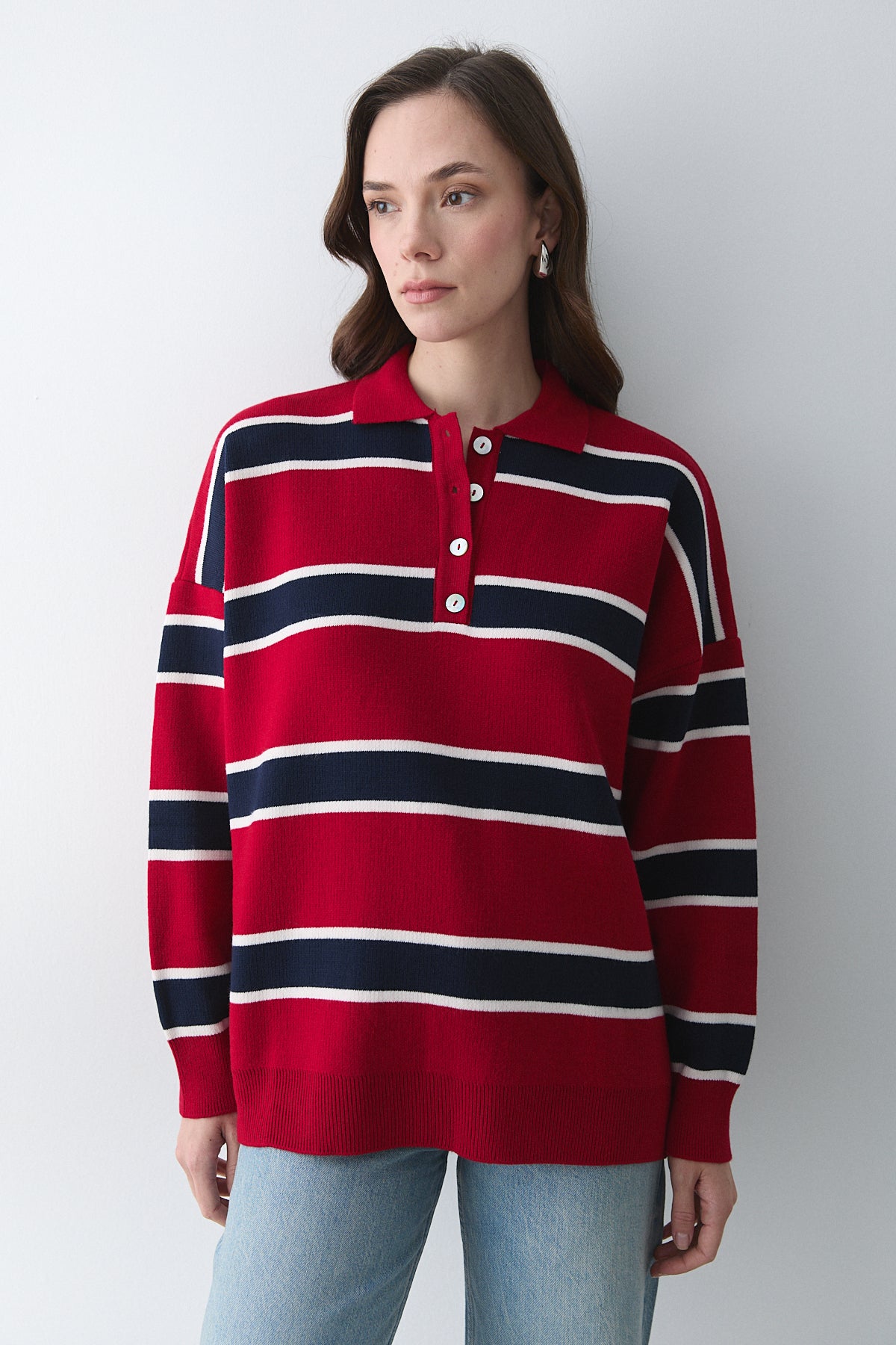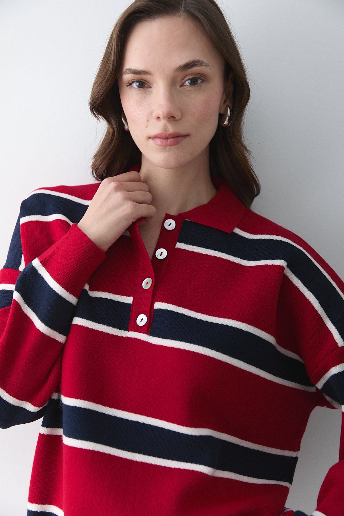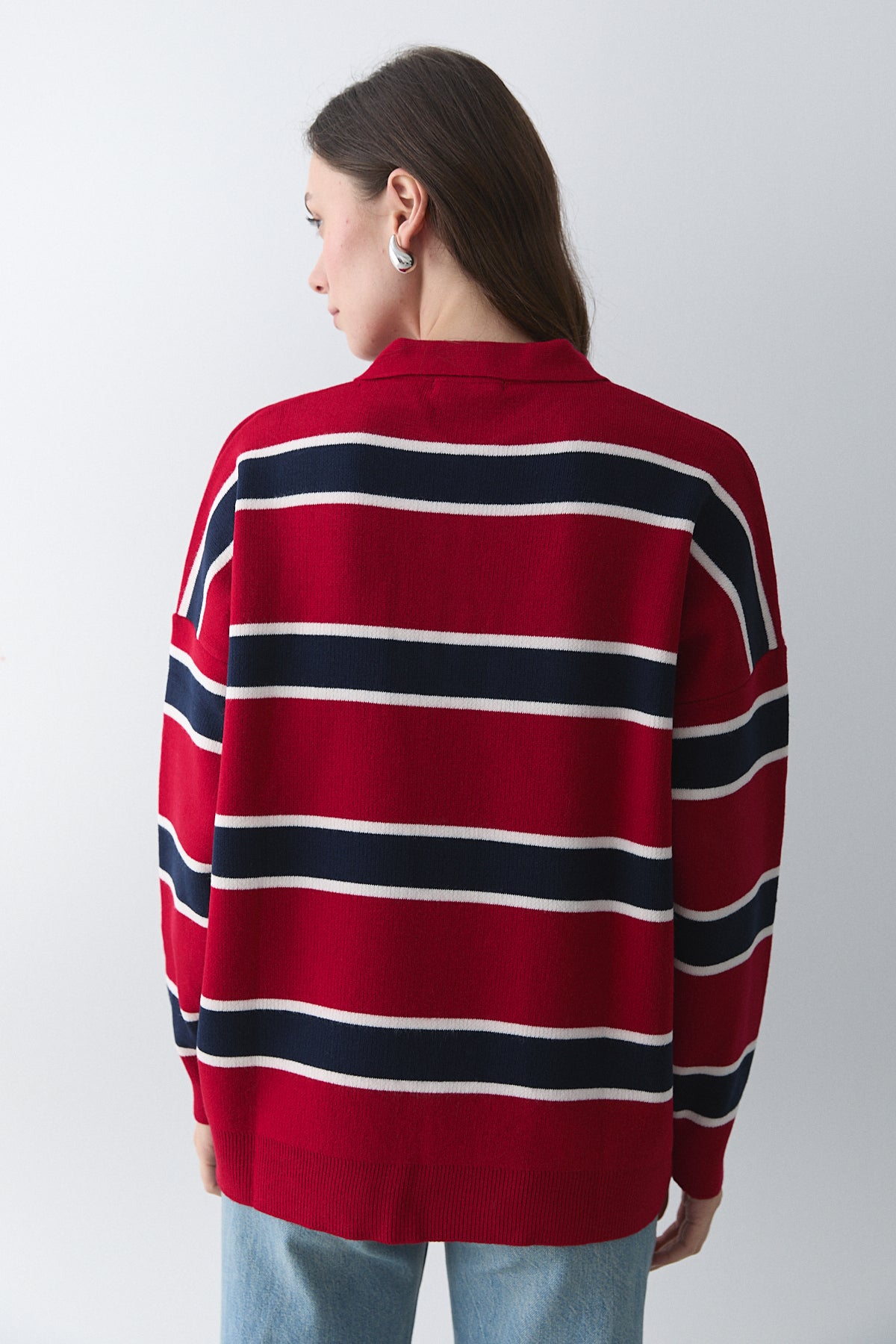 - Kırmızı Lacivert Polo Yaka Şeritli Kazak - 251129