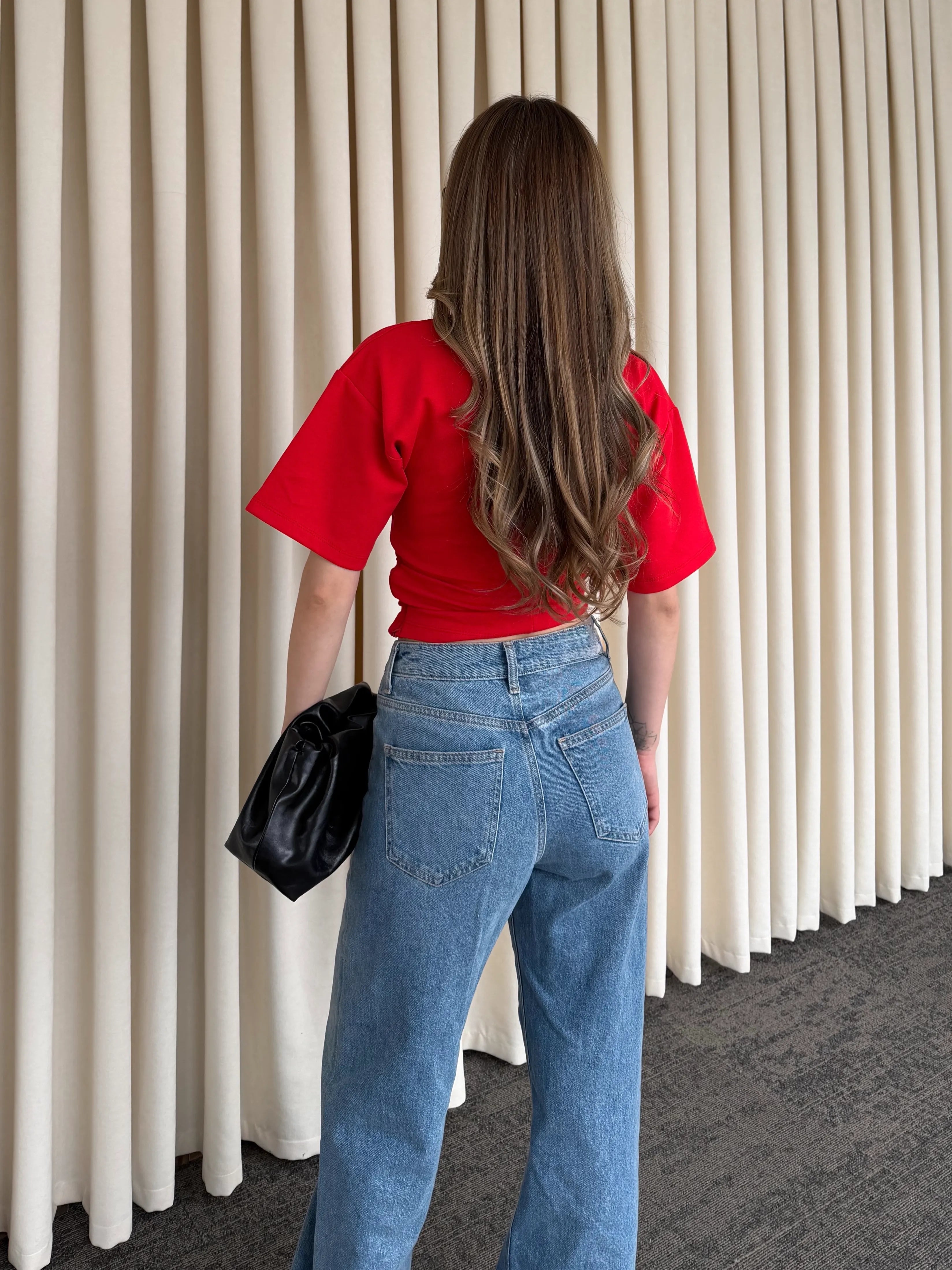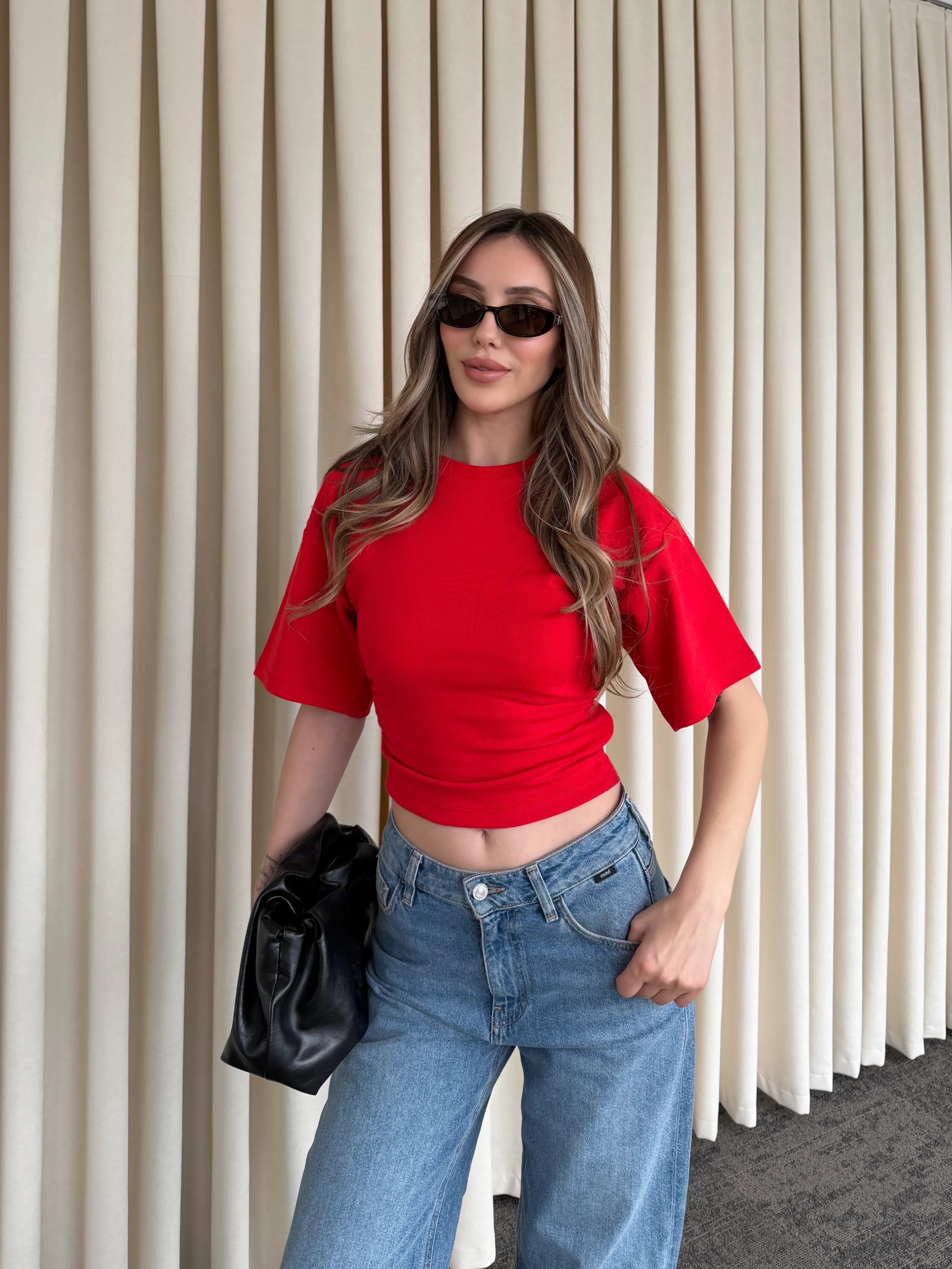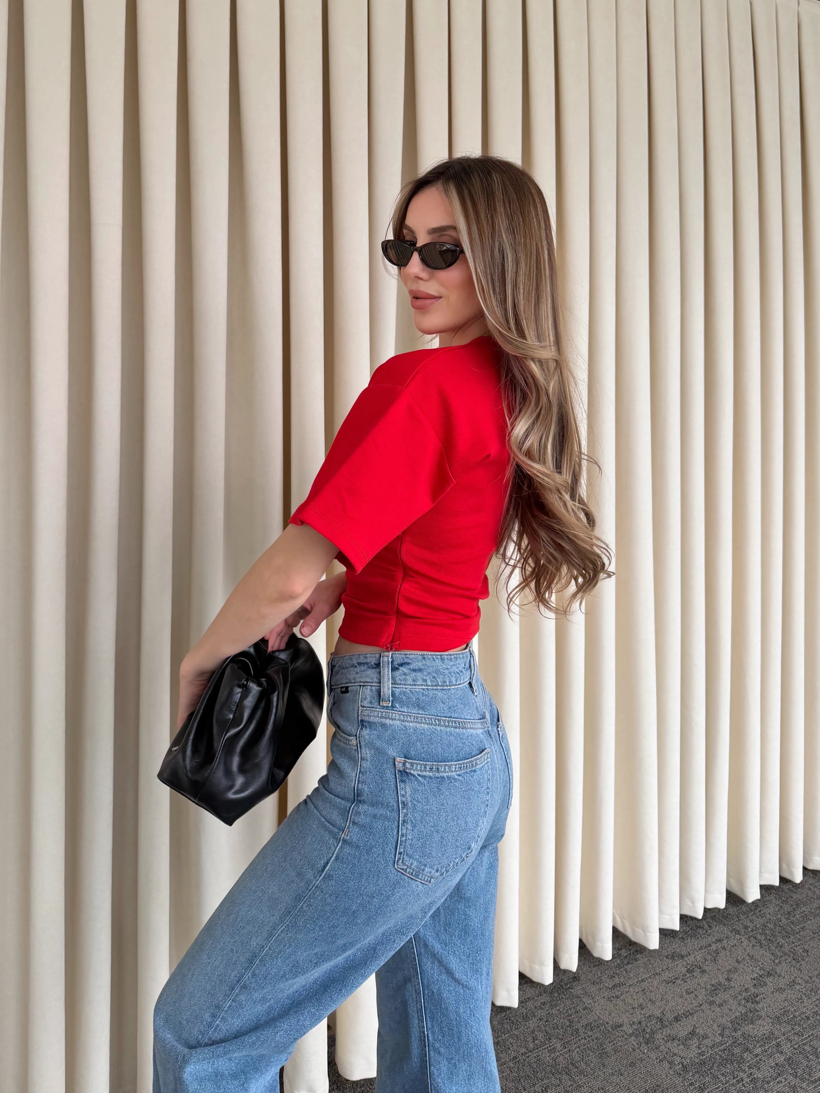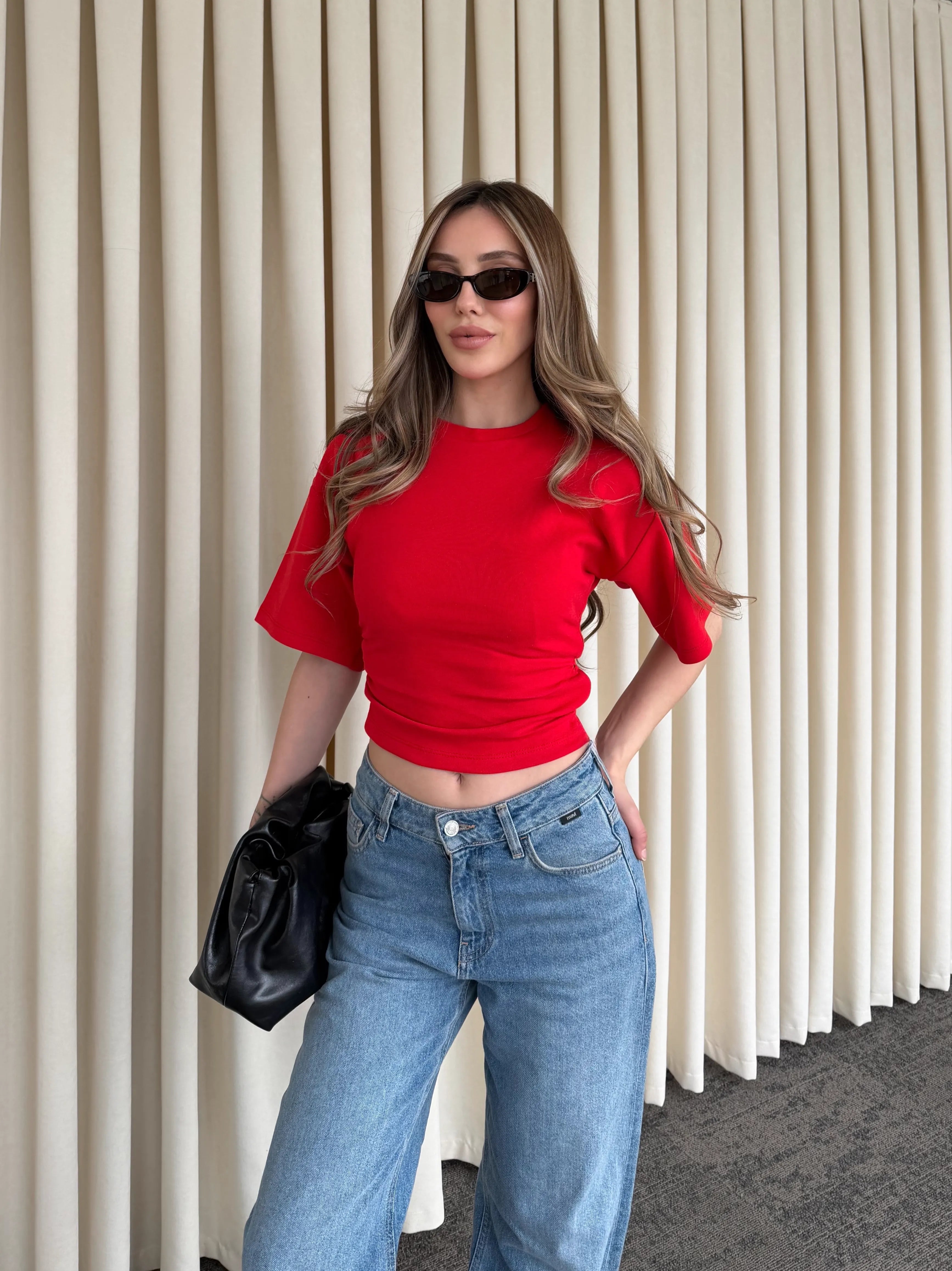 Yan kısımlarındaki drape detayıyla vücut formunu kusursuzca saran bu crop bluz, sade görünümüne hareket kazandırıyor. Bel hattında oluşturduğu yumuşak büzgü efekti sayesinde hem daha fit bir duruş sunar hem de konforlu bir kullanım sağlar.