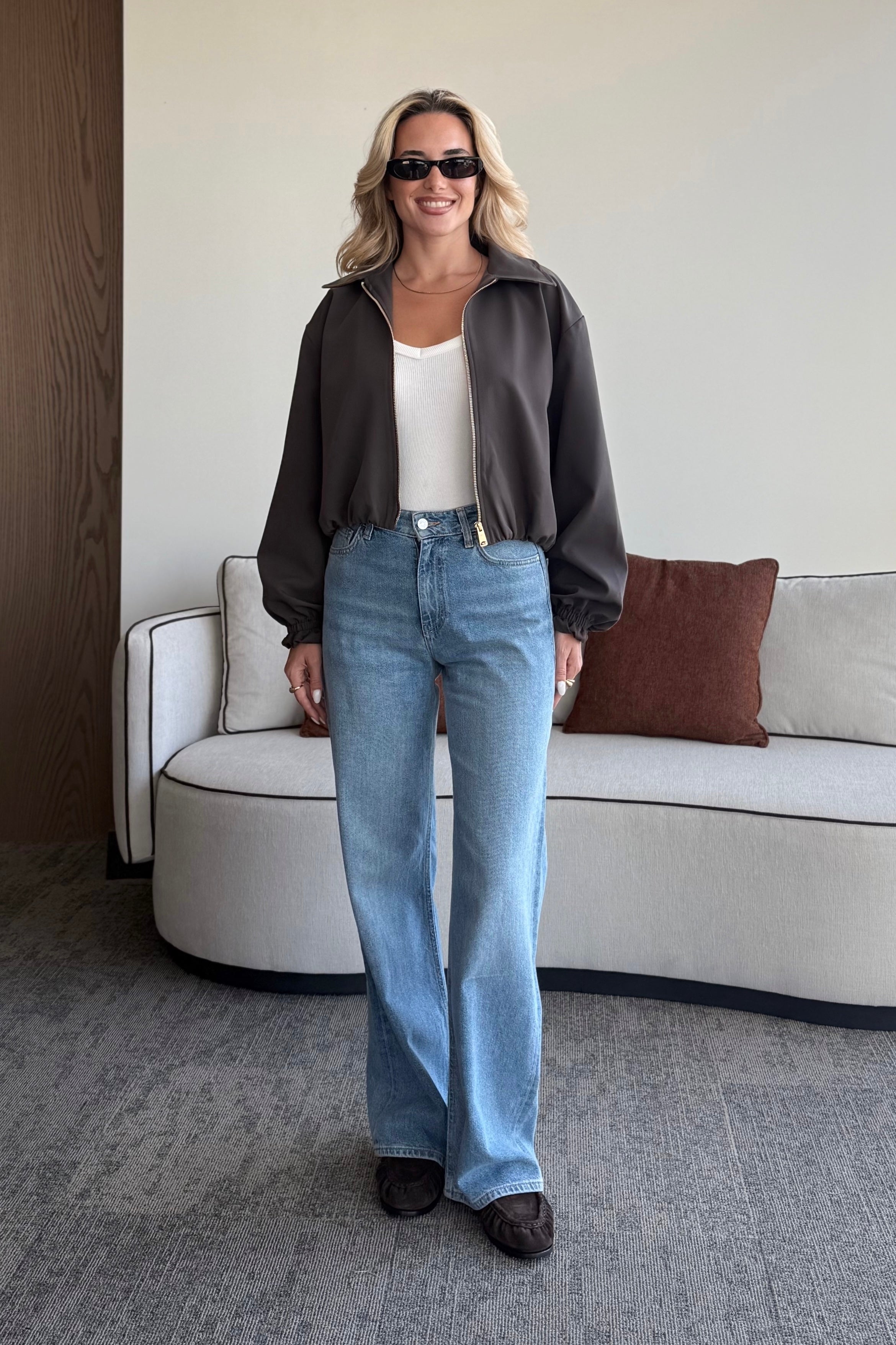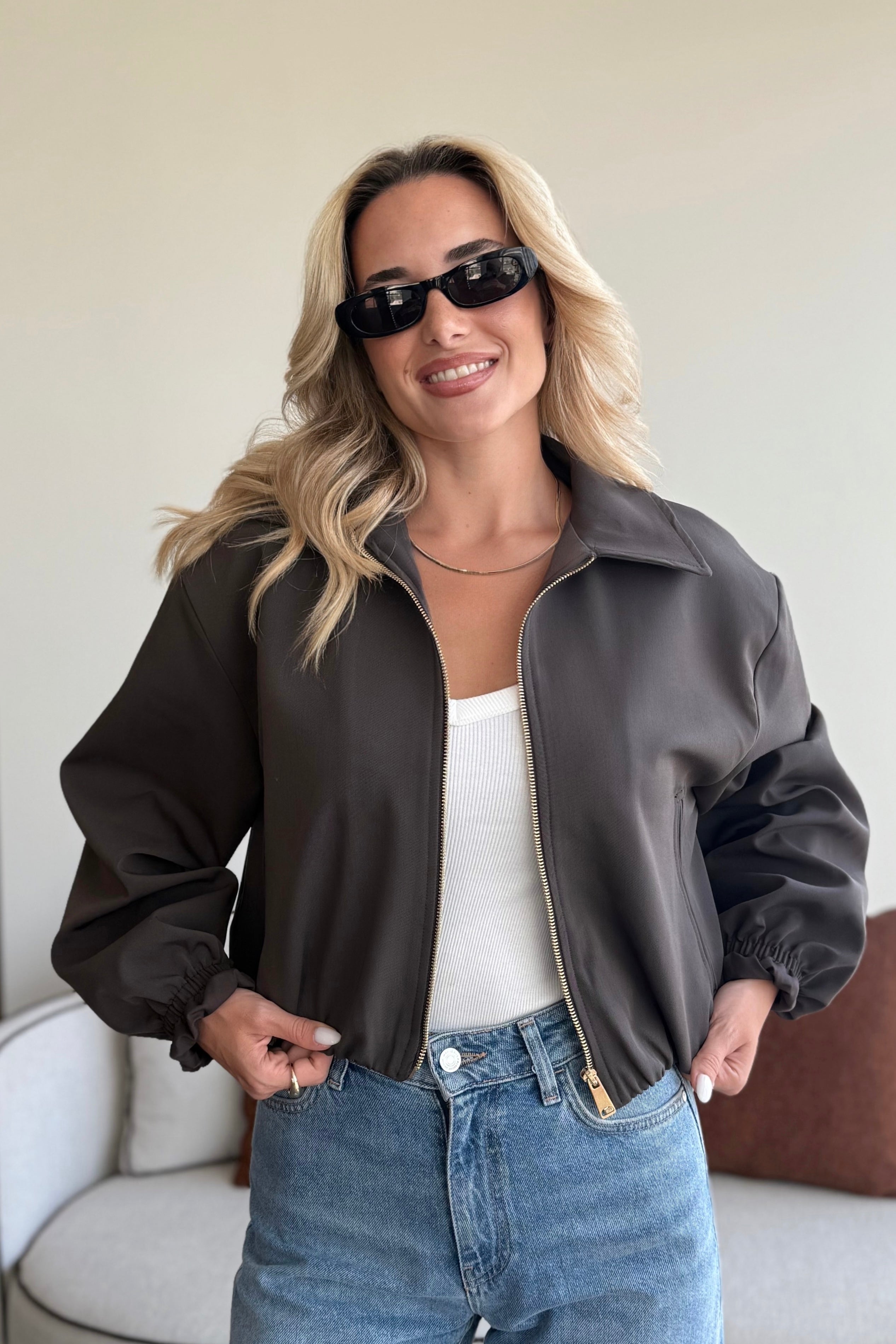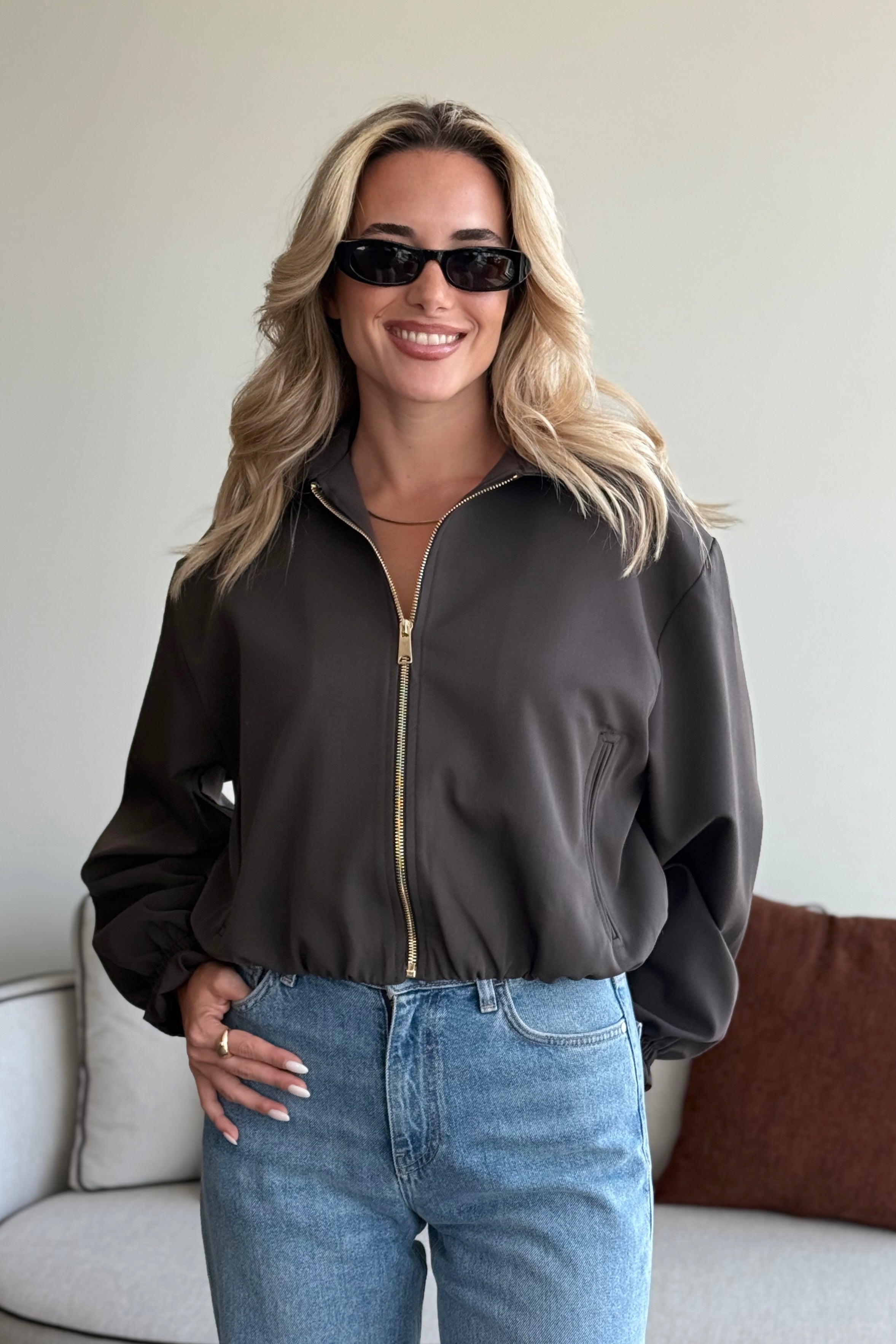 - Koyu Kahverengi Crop Bomber Ceket